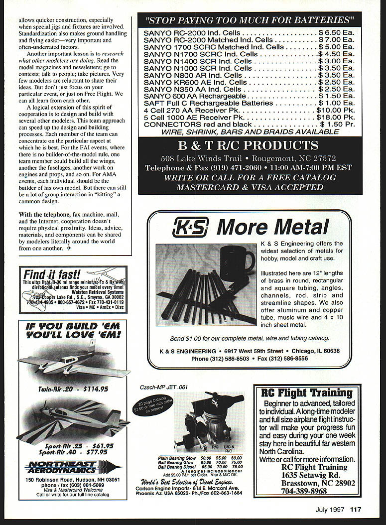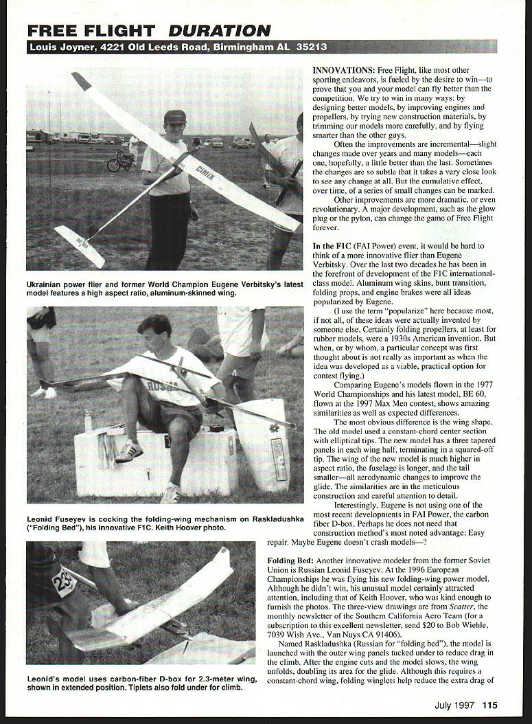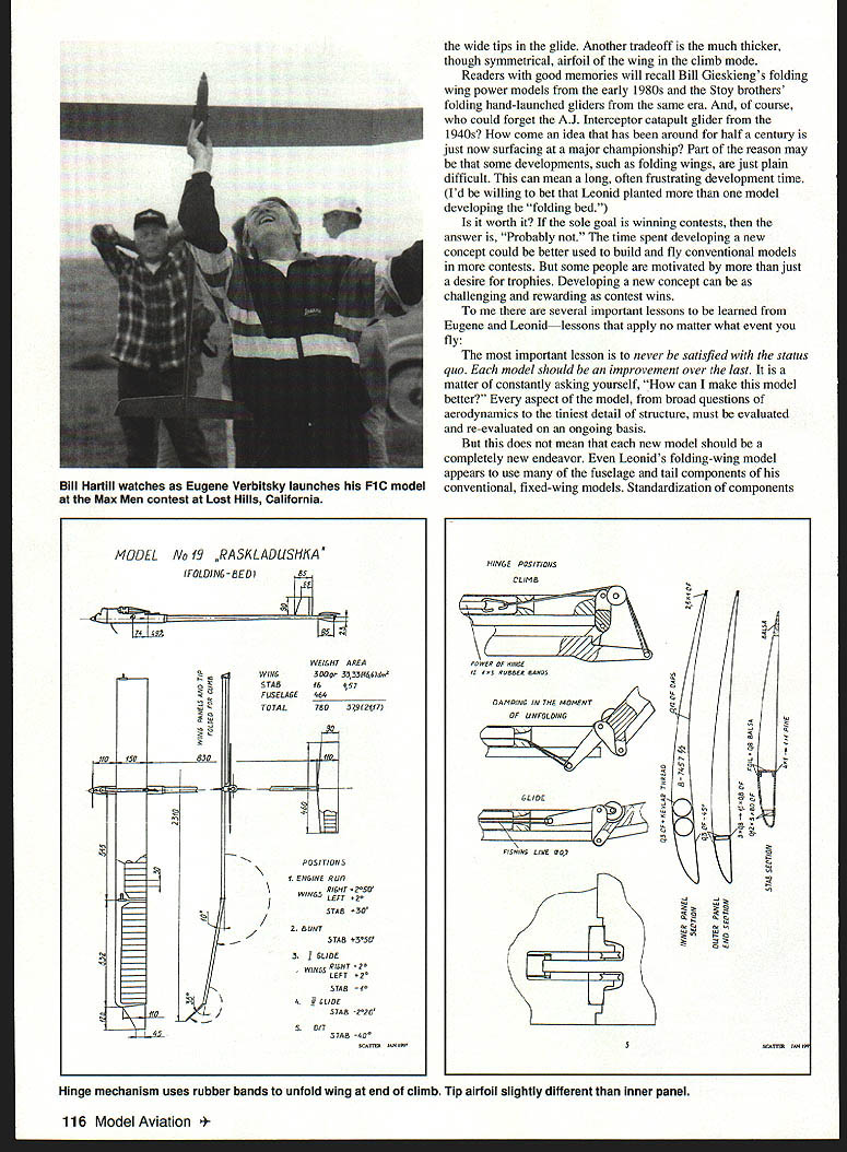 FREE FLIGHT DURATION VATIONS Free Flight like other sporting endeavors fueled desire winto prove model can fly better competition try win ways designing better models improving engines propellers trying new construction materials trimming models carefully flying smarter other guys Often improvements incrementalslight changes made over years modelseach hopefully little better last Sometimes changes subtle takes very close look see change cumulative effect over time series small changes can marked Other improvements dramatic revolutionary major development such glow plug pylon can change game Free Flight forever FiC FAT Power event would hard think innovative flier Eugene Verbitsky Over last two decades has forefront development FiC internationalclass model Aluminum wing skins bunt transition folding props engine brakes ideas popularized Eugene use term popularize because ideas actually invented someone else Certainly folding propellers least rubber models 1930s American invention particular concept first thought about really important idea developed viable practical option contest flying Comparing Eugenes models flown 1977 World Championships latest model BE 60 flown 1997 Max Men contest shows amazing similarities well expected differences obvious difference wing shape old model used constant-chord center section elliptical tips new model has three tapered panels wing half terminating squared-off tip wing new model much higher aspect ratio fuselage longer tail smallerall aerodynamic changes improve glide similarities meticulous construction careful attention detail Interestingly Eugene using recent developments FAI Power carbon fiber D-box Perhaps does need construction methods noted advantage Easy repair Maybe Eugene doesnt crash models Folding Bed Another innovative modeler former Soviet Union Russian Leonid Fuseyev 1996 European Championships flying new folding-wing power model Although didnt win unusual model certainly attracted attention including Keith Hoover kind enough furnish photos three-view drawings Scatter monthly newsletter Southern California Aero Team subscription excellent newsletter send $20 Bob Wiehle 7039 Wish Ave Van Nuys CA 91406 Named Raskladushka Russian folding bed model launched outer wing panels tucked under reduce drag climb After engine cuts model slows wing unfolds doubling its area glide Although requires constant-chord wing folding winglets help reduce extra drag July1997 115 Ukrainian power flier former World Champion Eugene Verbitskys latest model features high aspect ratio aluminum-skinned wing Leonid Fuseyev cocking folding-wing mechanism Raskladushka Folding Bed innovative FiC Keith Hoover photo Leonids model uses carbon-fiber D-box 23-meter wing shown extended position Tiplets also fold under climb wide tips glide Another tradeoff much thicker though symmetrical airfoil wing climb mode Readers good memories will recall Bill Gieskiengs folding wing power models early 1980s Stoy brothers folding hand-launched gliders same era course could forget AJ Interceptor catapult glider 1 940s come idea has around half century just now surfacing major championship Part reason may some developments such folding wings just plain difficult can mean long often frustrating development time Id willing bet Leonid planted model developing folding bed worth sole goal winning contests answer Probably time spent developing new concept could better used build fly conventional models contests some people motivated just desire trophies Developing new concept can challenging rewarding contest wins several important lessons learned Eugene Leonidlessons apply no matter what event fly important lesson never satisfied status quo model should improvement over last matter constantly asking yourself can make model better aspect model broad questions aerodynamics tiniest detail structure must evaluated re-evaluated ongoing basis does mean new model should completely new endeavor Leonids folding-wing model appears use fuselage tail components conventional fixed-wing models Standardization components HNGE P05 TONS POWER OF mt/EL tZ /3 RUt/AER RAt/OS OAIIPINE IN TIlE MOMENT OF UNTOLDINE 0 0 SLIDE 0 F/SRNU LINE 1407 C 4 N 4441It 01C 0t14 Hinge mechanism uses rubber bands unfold wing end climb Tip airfoil slightly different inner panel 116 Model Aviation Hartill watches Eugene Verbitsky launches FiC model Max Men contest Lost Hills California MODEL No 19 RASKLADUSI1IA trOt Nt-BED85 5 74 45U WE/GIlT AREA IWINE3000- flSS446Id4 STAB16457 NO 4FUSELAEE464 Si 1-TO TAG7803791211T U0 44SE NI. 1/0ISO530110 V-NPOSITIONS 1 ENGINE RI/fl STAB -30 BUY SThR W1N15 WIlES 41047 14 0 ELIDE /STAR STAB -IE allows quicker construction especially special jigs fixtures involved Standardization also makes ground handling flying easiervery important often-underrated factors Another important lesson research what other modelers doing Read model magazines newsletters go contests talk people take pictures Very few modelers reluctant share ideas dont just focus particular event just Free Flight can learn other logical extension spirit cooperation design build several other modelers team approach can speed up design building processes member team can concentrate particular aspect best FAJ events no builder-of-the-model rule team member could build wings another fuselages another work engines props AMA events individual should builder own model can still lot group interaction kitting common design telephone fax machine mail Internet cooperation doesnt require physical proximity Ideas advice materials components can shared modelers literally around world another *SANYO RC-2000 md Cells$650 Ea SANYO RC-2000 Matched md Cells$700 Ea SANYO 1700 SCRC Matched lnd Cells$500 Ea SANYO N 1700 SCRC lnd Cells$450 Ea SANYO N 1400 SCR lnd Cells$300 Ea SANYO N1000 SCR Ind Cells$350 Ea SANYO N800 AR Ind Cells$350 Ea SANYO KR600 AE md Cells$250 Ea SANYO N350 AA md Cells$250 Ea SANYO 600 AA Rechargeable$ 150 Ea SAFT Full C Rechargeable Batte