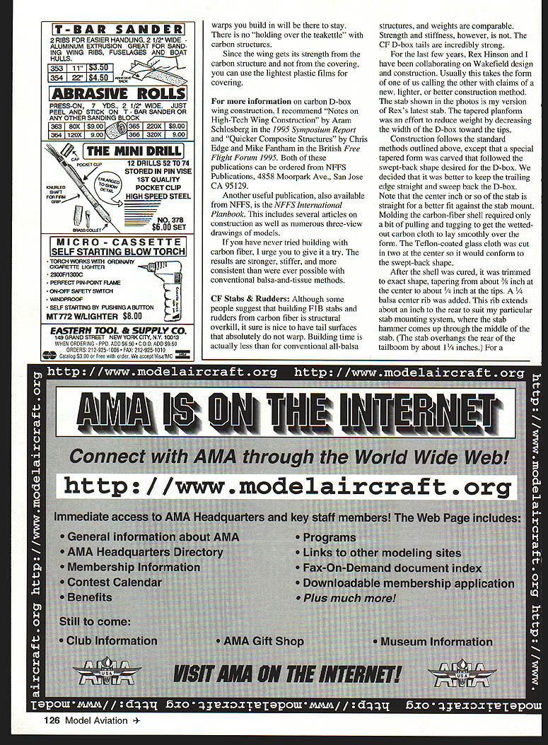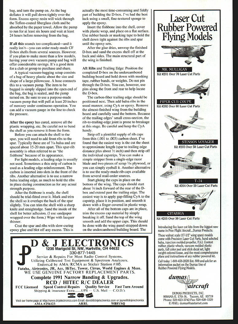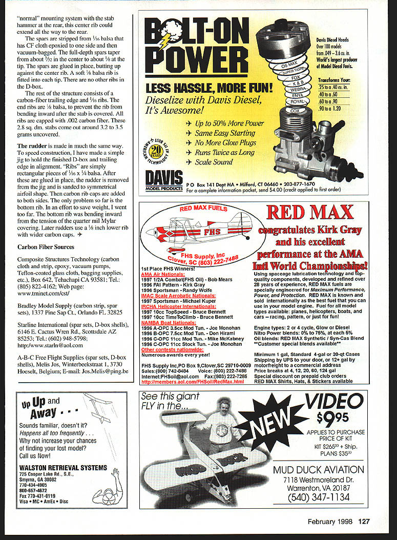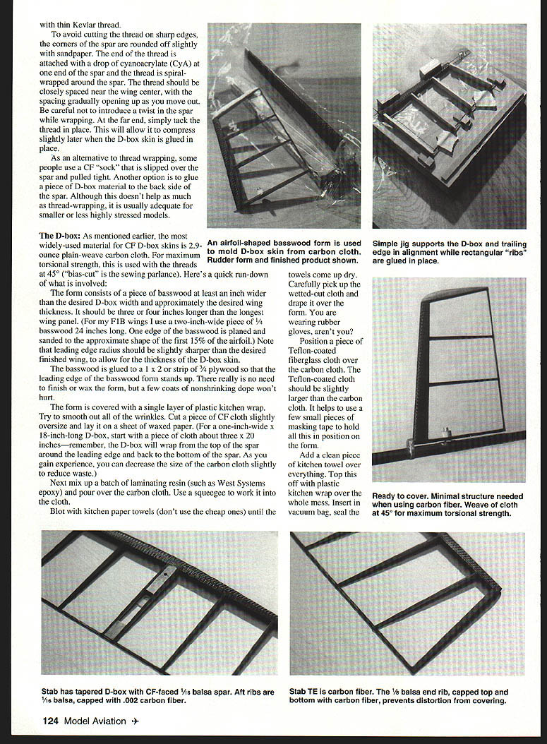 FREE FLIGHT DURATION U LAST MONTH talked about some basics carbon-fiber CF construction time well delve little farther specifics quick recap two main types carbon fiber used wing construction woven cloth unidirectional strip Woven carbon cloth similar fiberglass cloth course black color Unfortunately available weights weaves carbon fiber cloth much limited Perhaps useful Free Flight purposes 29-ounce plain-weave cloth Lighter carbon cloths available can very very expensive Like fiberglass cloth carbon-fiber cloth limp pliable always used combination epoxy resin form produce rigid molded shell such D-box cloth can cut easily sharp scissors Unidirectional strip rigid sheet strip carbon fiber Carbon-fiber strip available like balsa various thicknesses widths lengths Thicknesses range 00l-060 inch thinner strips 001-003 used primarily rib capstrips Thicker strips 007-042 used spar caps thickest strips 030060 used trailing edges Carbon strip up about 014 can cut easily sharp knife single-edge razor blade much like stripping balsa Thicker carbon best cut Dremel cutoff wheel other abrasive-type saw blade Since suitable saw ripping carbon strips can bit trouble expense set up easier use ready-cut carbonfiber spar trailing edge pieces strip own Often spar sets sold four matching tapered carbon-fiber pieces upper lower spar cap wing half Unidirectional carbon strip requires some surface preparation assure good glue bond Sand surface lightly fine sandpaper remove gloss wipe surface lacquer thinner remove fine dust much easier to whole sheet individual strips typical carbon-fiber D-box wing structure consists spar carries bending load D-box shell carries torsional load aft ribs little support covering back trailing edge Lets look Spar CF D-box structure spar full-depth usually located about 25% chord lightly-loaded structure small model main tip spar medium-size stab spar could consist simple 1/16 inch sheet balsa spar highly stressed models pair carbon spar caps added top bottom balsa Rohacell foam web between help reduce weight tips spar caps indeed entire spar usually tapered plan view Wakefield F1J wing spar might taper about wide wing center less A6 inch tip coincides reduction bending load wing center tip spar typically made gluing lower CF spar cap slightly wider sheet balsa foam will form web web sanded desired thickness upper CF spar cap glued place making sure lines up exactly lower cap After glue hardens excess web carved sanded away leaving rectangular cross-section spar Note thickness finished spar will need somewhat less total desired wing thickness allow thickness D-box skins wing covering thread spar wrap Under high flight loads tendency CF spar cap inside bend separate web good glue joint will help maximum strength entire spar often wrapped TYPICAL MODERN Fl B WING 15mm Balsa Ribs D-Box Rear Section Typical Rear Rib Spacing 25mm 40mm Pitch 03 x 15mm Carbon Cap Strips Top Bottompar Wrapped Overlapped 25mm over D-Box KTrailing Kevlar Thread 35mm x 5mm Tapering 35mm x 3mm carbon 7mm x 25mm Carbon Trailing EdgeMolded Carbon Epoxy & Micro Machined Aluminum Socket Joiner l Carbon 6mm Balsa Root Rib 2mm x 35mm Carbon Leading Edge Molded Carbon Fiber Kevlar D-Box February 1998 123 thin Keviar thread avoid cutting thread sharp edges corners spar rounded off slightly sandpaper end thread attached drop cyanoacrylate CyA end spar thread spiralwrapped around spar thread should closely spaced near wing center spacing gradually opening up move out careful introduce twist spar wrapping far end simply tack thread place will allow compress slightly later D-box skin glued place As alternative thread wrapping some people use CF sock slipped over spar pulled tight Another option glue piece D-box material back side spar Although doesnt help much thread-wrapping usually adequate smaller less highly stressed models D-box As mentioned earlier widely-used material CF D-box skins 29ounce plain-weave carbon cloth maximum torsional strength used threads 450 bias-cut sewing parlance Heres quick run-down what involved form consists piece basswood least inch wider desired D-box width approximately desired wing thickness should three four inches longer longest wing panel FlB wings use two-inch-wide piece basswood 24 inches long edge basswood planed sanded approximate shape first 15% airfoil Note leading edge radius should slightly sharper desired finished wing allow thickness D-box skin basswood glued 1 x 2 strip ood leading edge basswood form stands up really no need finish wax form few coats nonshrinking dope wont hurt form covered single layer plastic kitchen wrap Try smooth out wrinkles Cut piece CF cloth slightly oversize lay sheet waxed paper one-inch-wide x 18-inch-long D-box start piece cloth about three x 20 inchesremember D-box will wrap top spar around leading edge back bottom spar As gain experience can decrease size carbon cloth slightly reduce waste Next mix up batch laminating resin such West Systems epoxy pour over carbon cloth Use squeegee work cloth Blot kitchen paper towels dont use cheap ones until towels come up dry Carefully pick up wetted-out cloth drape over form wearing rubber gloves arent Position piece Teflon-coated fiberglass cloth over carbon cloth Teflon-coated cloth should slightly larger carbon cloth helps use few small pieces masking tape hold position form Add clean piece kitchen towel over everything Top off plastic kitchen wrap over whole mess Insert vacuum bag seal 124 Model Aviation irfoil-shaped basswood form used Simple jig supports D-box trailing mold D-box skin carbon cloth edge alignment rectangular ribs Rudder form finished product shown glued place Ready cover Minimal structure needed using carbon fiber Weave cloth 450 maximum torsional strength Stab has tapered D-box CF-faced Vie balsa spar Aft ribs areStab TE carbon fiber 1A balsa end rib capped top Vie balsa capped 002 carbon fiberbottom carbon fiber prevents distortion covering bag turn pump As bag deflates will pull