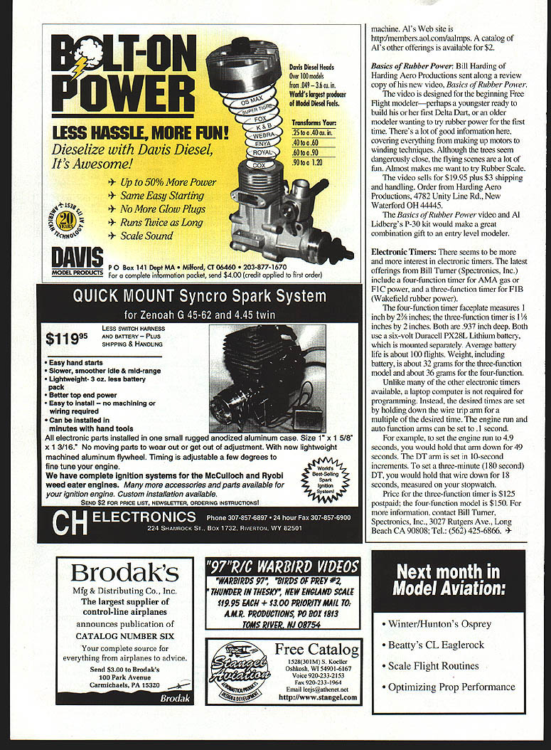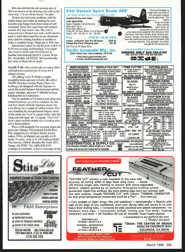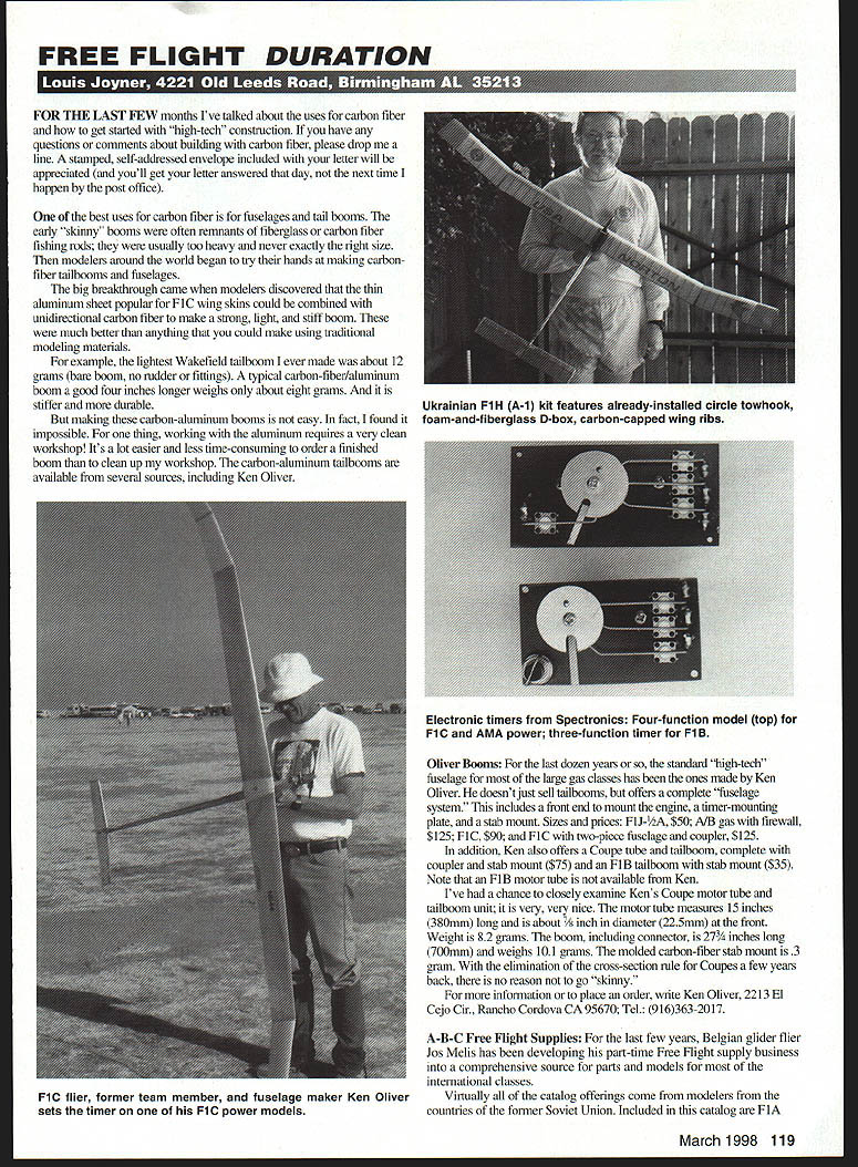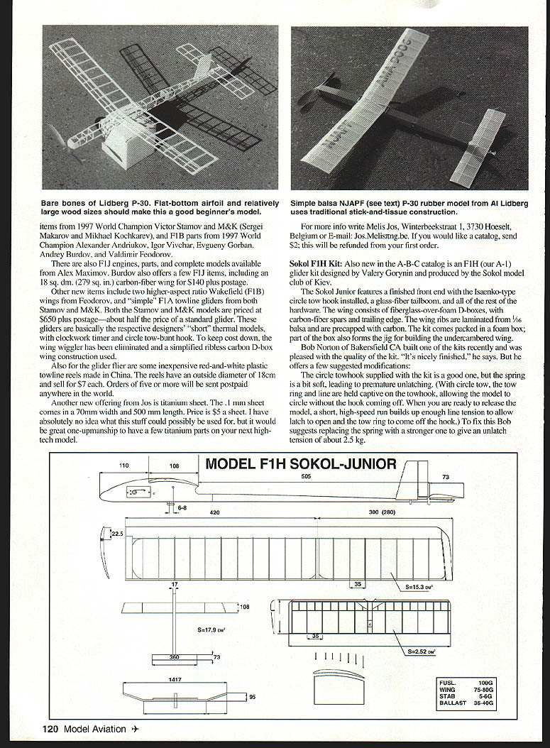 FREE FLIGHT DURATION SFOR THE LAST FEW months Ive talked about uses carbon fiber get started high-tech construction have questions comments about building carbon fiber please drop line stamped self-addressed envelope included letter will appreciated youll get letter answered day next time happen post office best uses carbon fiber fuselages tail booms early skinny booms often remnants fiberglass carbon fiber fishing rods usually too heavy never exactly right size modelers around world began try hands maldng carbonfiber tailbooms fuselages big breakthrough came modelers discovered thin aluminum sheet popular FIC wing skins could combined unidirectional carbon fiber make strong light stiff boom much better anything could make using traditional modeling materials example lightest Wakefield tailboom ever made about 12 grams bare boom no rudder fittings typical carbon-fiber/aluminum boom good four inches longer weighs about eight grams stiffer durable making carbon-aluminum booms easy fact found impossible thing working aluminum requires very clean workshop Its lot easier less time-consuming order finished boom clean up workshop carbon-aluminum tailbooms available several sources including Ken Oliver Oliver Booms last dozen years standard high-tech fuselage large gas classes has ones made Ken Oliver doesnt just sell tailbooms offers complete fuselage system includes front end mount engine timer-mounting plate stab mount Sizes prices FlJ-A $50 A/B gas firewall $125 FIC $90 FlC two-piece fuselage coupler $125 addition Ken also offers Coupe tube tailboom complete coupler stab mount $75 FlB tailboom stab mount $35 Note FiB motor tube available Ken Ive chance closely examine Kens Coupe motor tube tailboom unit very very nice motor tube measures 15 inches 380mm long about 7A inch diameter 225mm front Weight 82 grams boom including connector 27h inches long 700mm weighs 101 grams molded carbon-fiber stab mount 3 gram elimination cross-section rule Coupes few years back no reason go skinny information place order write Ken Oliver 2213 El Cejo Cir Rancho Cordova CA 95670 Tel 916363-2017 A-B-C Free Flight Supplies last few years Belgian glider flier los Melis has developing part-time Free Flight supply business comprehensive source parts models international classes Virtually catalog offerings come modelers countries former Soviet Union Included catalog FlA March1998 119 Ukrainian F1H A-i kit features already-installed circle towhook foam-and-fiberglass D-box carbon-capped wing ribs Electronic timers Spectronics Four-function model top Fl C AMA power three-function timer Fl B FiC flier former team member fuselage maker Ken Oliver sets timer FiC power models items 1997 World Champion Victor Stamov M&K Sergei Makarov Mikhael Kochkarev FiB parts 1997 World Champion Alexander Andriukov Igor Vivchar Evgueny Gorban Andrey Burdov Valdimir Feodorov also FIJ engines parts complete models available Alex Maximov Burdov also offers few FlJ items including 18 sq din 279 sq carbon-fiber wing $140 plus postage Other new items include two higher-aspect ratio Wakefield FlB wings Feodorov simple FlA towline gliders both Stamov M&K Both Stamov M&K models priced $650 plus postageabout half price standard glider gliders basically respective designers short thermal models clockwork timer circle tow-bunt hook keep cost down wing wiggler has eliminated simplified ribless carbon D-box wing construction used Also glider flier some inexpensive red-and-white plastic towline reels made China reels have outside diameter 8cm sell $7 Orders five will sent postpaid anywhere world Another new offering Jos titanium sheet 1 mm sheet comes 70mm width 500 mm length Price $5 sheet have absolutely no idea what stuff could possibly used would great one-upmanship have few titanium parts next hightech model info write Melis Jos Winterbeekstraat 1 3730 Hoeselt Belgium E-mail JosMelisitngbe would like catalog send $2 will refunded first order Sokol F1H Kit Also new A-B-C catalog FlH A-l glider kit designed Valery Gorynin produced Sokol model club Kiev Sokol Junior features finished front end Isaenko-type circle tow hook installed glass-fiber tailboom rest hardware wing consists fiberglass-over-foam D-boxes carbon-fiber spars trailing edge wing ribs laminated /16 balsa precapped carbon kit comes packed foam box part box also forms jig building undercambered wing Bob Norton Bakersfield CA built kits recently pleased quality kit Its nicely finished says offers few suggested modifications circle towbook supplied kit good spring bit soft leading premature unlatching circle tow tow ring line held captive towhook allowing model circle hook coming off ready release model short high-speed run builds up enough line tension allow latch open tow ring come off hook fix Bob suggests replacing spring stronger give unlatch tension about 25 kg 110 V 108MODEL Fl H SOKOL-JUNIOR /17 50573 1 68300 280 420 225 35 IS1 53 OM WI108 H 35 S252 OM ~II 73 1111111 FToo WING75-80G STAB5-6G BALLAST35-400 120 Model Aviation S179 OM 95 Bare bones Lidberg P-30 Flat-bottom airfoil relatively large wood sizes should make good beginners model Simple balsa NJAPF see text P-30 rubber model Al Lidberg uses traditional stick-and-tissue construction Bob also felt tail moment arm 505 mm shown drawing bit short side Id use boom adds Norton also some problems rudder hinge ended up making own knuckle-type hinges 6mm strips soft aluminum beer cans bent crimped around 015 inch music wire wire removed Dremel tool cutoff wheel used notch three knuckles aluminum piece two mating knuckles another make complete hinge Hinge pin 010 wire Introductory price kit A-B-C $179 plus postage handling might also want check Sal Fruciano Starline International 6146 E Cactus Wren Rd Scottsdale AZ 85253 Sal occasionally has some kits stock NJAPF P-30 After talk carbon fiber high-tech construction its time change pace Al Lidbergs new P-30 kit simple straightforward easy build calls NJAPF Just Another Pretty Face As 