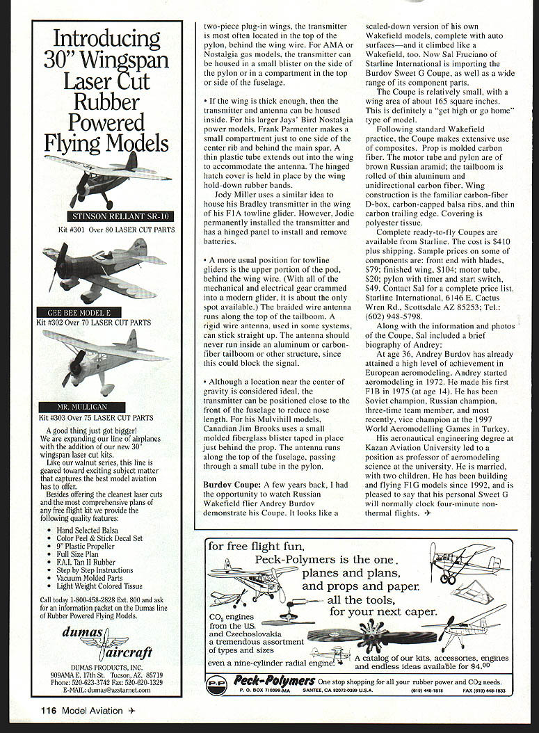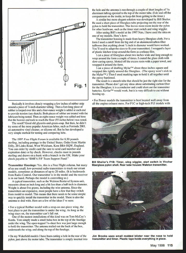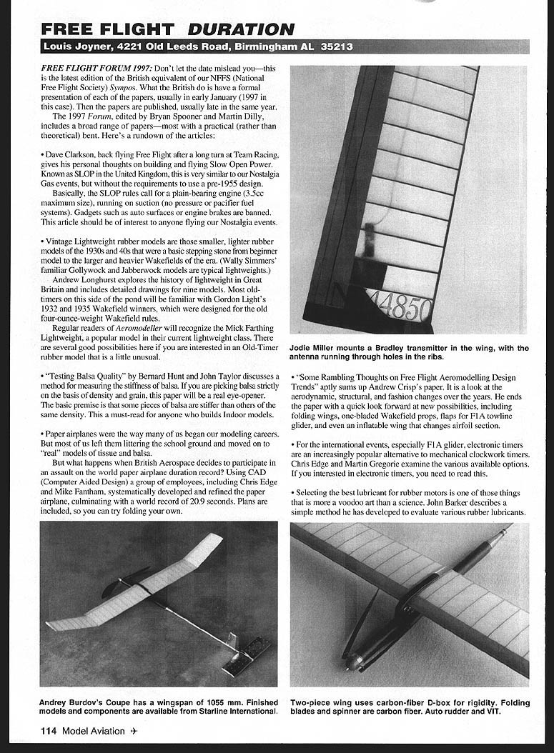 FREE FLIGHT DURATION FREE FLIGHT FORUM 1997 Dont let date mislead youthis latest edition British equivalent NFFS National Free Flight Society Sympos What British have formal presentation of papers usually early January 1997 case papers published usually late same year 1997 Forum edited Bryan Spooner Martin Dilly includes broad range papersmost practical rather theoretical bent Heres rundown articles Dave Clarkson back flying Free Flight after long turn Team Racing gives personal thoughts building flying Slow Open Power Known SLOP United Kingdom very similar Nostalgia Gas events requirements use pre-1955 design Basically SLOP rules call plain-bearing engine 35cc maximum size running suction no pressure pacifier fuel systems Gadgets such auto surfaces engine brakes banned article should interest anyone flying Nostalgia events Vintage Lightweight rubber models smaller lighter rubber models 1 930s 40s basic stepping stone beginner model larger heavier Wakefields era Wally Simmers familiar Gollywock Jabberwock models typical lightweights Andrew Longhurst explores history lightweight Great Britaln includes detailed drawings nine models Most oldtimers side pond will familiar Gordon Lights 1932 1935 Wakefield winners designed old four-ounce-weight Wakefield rules Regular readers Aeromodeller will recognize Mick Farthing Lightweight popular model current lightweight class several good possibilities interested Old-Timer rubber model little unusual Testing Balsa Quality Bernard Hunt John Taylor discusses method measuring stiffness balsa picking balsa strictly basis density grain paper will real eye-opener basic premise some pieces balsa stiffer others same density must-read anyone builds Indoor models Paper airplanes way us began modeling careers us left littering school ground moved real models tissue balsa what happens British Aerospace decides participate assault world paper airplane duration record Using CAD Computer Aided Design group employees including Chris Edge Mike Fantham systematically developed refined paper airplane culminating world record 209 seconds Plans included can try folding own Some Rambling Thoughts Free Flight Aeromodelling Design Trends aptly sums up Andrew Crisps paper look aerodynamic structural fashion changes over years ends paper quick look forward new possibilities including folding wings one-bladed Wakefield props flaps FlA towline glider inflatable wing changes airfoil section international events especially Fl glider electronic timers increasingly popular alternative mechanical clockwork timers Chris Edge Martin Gregorie examine various available options interested electronic timers need read Selecting best lubricant rubber motors things voodoo art science John Barker describes simple method has developed evaluate various rubber lubricants 114 Model Aviation e Miller mounts Bradley transmitter wing antenna running through holes ribs Andrey Burdovs Coupe has wingspan 1055 mm Finished Two-piece wing uses carbon-fiber D-box rigidity Folding models components available Starine International blades spinner carbon fiber Auto rudder VIT Basically involves closely wrapping few inches rubber strip around piece -inch-diameter tubing foot-long piece rubber looped over four-ounce weight added end provide tension see sketch Both pieces rubber treated lubricant being tested eight-ounce weight added time heavier end took reach floor 55 inches below noted result Good old glycerin-and-green-soap didnt try some popular American lubes such Formula 2001 automotive vinyl cleaner silicone oil has developed very simple method testing comparing lube 1997 Free Flight Forum available 850 pounds sterling including postage United States Order Martin Dilly 20 Links Road West Wickham Kent BR4 OQW England can order credit card sure send card number expiration date check However checks must pounds sterling drawn bank branch UK Make check payable BMFA F/F Team Support Fund Transmitter Housings Yes Free Flight column us use small low-powered radio transmitters track errant models sometimes distances up 20 miles backwards Radio Control transmitter model receiver hand Perhaps model controlling us typical transmitter such Walston Retrieval System unit measures about inch long bit less half-inch diameter Weight about five grams including wire antenna Since transmitters expensive people have few switch model model means needs some simple way quickly install transmitter model also antenna deal few ideas Ive seen typical Rubber model strap-on one-piece wing best place put transmitter under wing As long wing stays transmitter cant fall out neatest installations kind Tom McCoys Korda Tom simply made small balsa box top fuselage under wing open-topped Y16-sheet box just large enough hold transmitter antenna trailed out back box underneath wing along top fuselage Wakefield models have cutting hole rear pylon just above motor tube transmitter simply inserted hole antenna run through couple short lengths /16 aluminum tubing epoxied top motor tube seal off compartment inside keep dirt getting timer similar elegant solution developed Bill Shailor used short piece fiberglass tube projecting out rear pylon hold transmitter leaves room inside pylon other hardware such timer start switch wing wiggler After seeing Bills model 1997 Nats have used idea models Heres transmitter housing made heavy fiberglass cloth form used cutoff big end aluminum/carbon-fiber tailboom anything about 1/2 inch diameter would have worked Youll need adapt sizes fit transmitter wrapped layer plastic kitchen wrap around form release film cut piece fiberglass about two inches wide long enough wrap around form couple times coated glass cloth slow-curing epoxy blotted off excess resin paper towel wrapped around form cut piece drafting MylarTM about three inches square wrapped tightly around fiberglass epoxy wont stick MylarTM used masking tape hold together until epoxy hardened result smooth tube should just right size transmitter Please dont ge