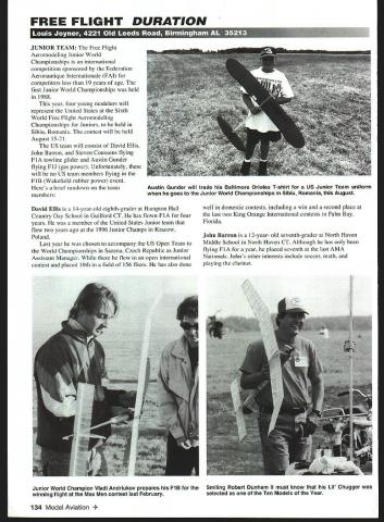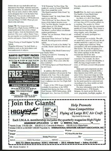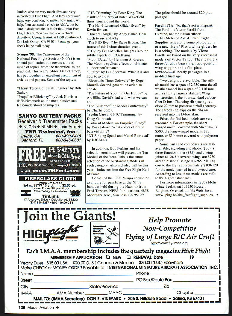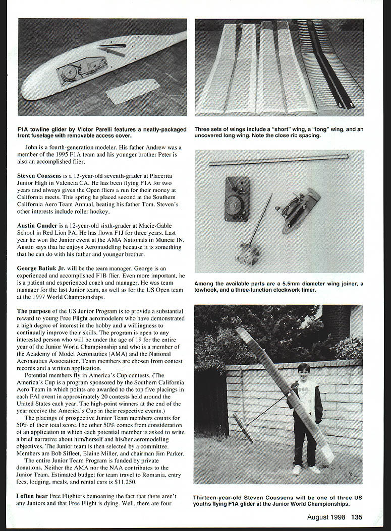 FREE FLIGHT DURATION JUNIOR TEAM Free Flight Aeromodeling Junior World Championships international competition sponsored Federation Aeronautique Internationale FAI competitors less 19 years age first Junior World Championships held 1988 year four young modelers will represent United States Sixth World Free Flight Aeromodeling Championships Juniors held Sibiu Romania contest will held August 15-21 US team will consist David Ellis John Barron Steven Coussens flying FIA towline glider Austin Gunder flying FIJ gas power Unfortunately will no US team members flying FlB Wakefield rubber power event Heres brief rundown team members David Ellis 14-year-old eighth-grader Hampton Hall Country Day School Guilford CT has flown FlA four years member United States Junior team flew two years ago 1996 Junior Champs Kracow Poland Last year chosen accompany US Open Team World Championships Sazena Czech Republic Junior Assistant Manager flew open international contest placed 10th field 156 fliers has also done well domestic contests including win second place last two King Orange International contests Palm Bay Florida John Barron 12-year- old seventh-grader North Haven Middle School North Haven CT Although has flying FlA year placed seventh last AMA Nationals Johns other interests include soccer math playing clarinet 134 Model Aviation in Gunder will trade Baltimore Orioles T-shirt US Junior Team uniform goes Junior World Championships Sibiu Romania August Junior World Champion Vladi Andriukov prepares Fl B Smiling Robert Dunham II must know Lii Chugger winning flight Max Men contest last February selected Ten Models Year John fourth-generation modeler father Andrew member 1995 FlA team younger brother Peter also accomplished flier Steven Coussens 13-year-old seventh-grader Placenta Junior High Valencia CA has flying FlA two years always gives Open fliers run money California meets spring placed second Southern California Aero Team Annual beating father Tom Stevens other interests include roller hockey Austin Gunder 12-year-old sixth-grader Macie-Gable School Red Lion PA has flown FIJ three years Last year won Junior event AMA Nationals Muncie IN Austin says enjoys Aeromodeling because something can father younger brother George Batiuk Jr will team manager George experienced accomplished FlB flier important patient experienced coach manager team manager last Junior team well US Open team 1997 World Championships purpose US Junior Program provide substantial reward young Free Flight aeromodelers have demonstrated high degree interest hobby willingness continually improve skills program open interested person will under age 19 entire year Junior World Championship member Academy Model Aeronautics AMA National Aeronautics Association Team members chosen contest records written application Potential members fly Americas Cup contests Americas Cup program sponsored Southern California Aero Team points awarded top five placings FAI event approximately 20 contests held around United States year high-point winners end year receive Americas Cup respective events placings prospective Junior Team members counts 50% total scoreThe other 50% comes consideration application potential member asked write brief narrative about him/herself his/her aeromodeling objectives Junior team selected committee Members Bob Sifleet Blame Miller chairman Jim Parker entire Junior Team Program funded private donations Neither AMA nor NAA contributes Junior Team Estimated budget team travel Romania entry fees lodging meals rental cars $11250 often hear Free Flighters bemoaning fact arent Juniors Free Flight dying Well four August1998 135 FlA towline glider Victor Parelli features neatly-packagedThree sets wings include short wing long wing front fuselage removable access coveruncovered long wing Note close rib spacing Among available parts 55mm diameter wing joiner towhook three-function clockwork timer Thirteen-year-old Steven Coussens will three US youths flying FlA glider Junior World Championships Juniors very much alive very interested Free Flight need help Any donation no matter small will help can send check AMA sure designate Junior Free Flight Team can also send check directly George Batiuk 1759 Southwood San Luis Obispo CA 93401 Please get check mail today Sympo 98 Symposium National Free Flight Society NFFS annual publication covers broad range topics theoretical practical years editor Daniel Tracy has put together excellent assortment articles papers Some topics Thrust Testing Small Engines Bob Stalick Propeller Efficiency Jack Norris definitive work most-elusive least-understood subjects SANYO BATTERY PACKS Receiver & Transmitter Packs Ni-Cds Ni-MH Acid TNR Technical Inc Irvine CA800-490-8418 Sanford FL800-346-0601 I2 FIJI i V&ii Premium Grade 314 az 38W 10 yrd mm $250 yd Lower Prices 30 yds & UP Other Weights Available I4 TinLins 17 Andrews Drive ville AL 36322 334 598-2287 1000 CST FiB Trimming Peter King results survey noted Wakefield fliers around world Hand-Launched Glider Event Kevin Brown Dihedral Angle Andy Bauer much use FlD Event Steve Brown future Indoor duration event C02 Fritz Mueller Insights subtle aspects CO flying Moon Dates Hermann Andresen Moons cyclical effects ultimate outdoor performance Flutter Len Sherman What avoid Electronic Timer Software Roger Morrell Second-generation avionics update Future Youth Hobby Art Ellis Davids dad tells what can Builder Model Controversy Charlie Stiles Seelig Care FIC Trimming Doug Galbreath Color Models Empirical Study Ross Jahnke What colors offer best visibility DT Sinking Speed Model Retrieval Jeff Annis addition Bob Perkins selection committee will present Ten Models Year annual selection outstanding models category Also included will years inductees Free Flight Hall Fame Copies 1998 Sympo should available purchase NFFS banquet held during Nats Fred Terzian NFFS Publications 4858 Moorpark Ave San Jose CA 95129 price should around $20 plus postage Parelli FlA No thats