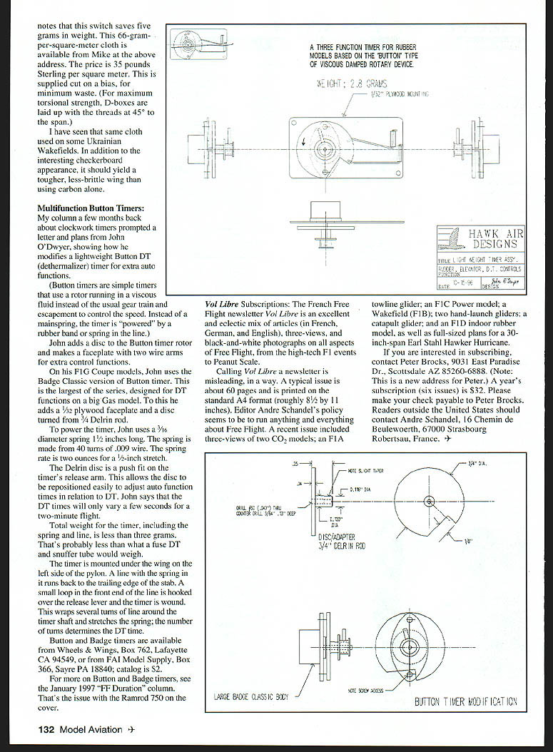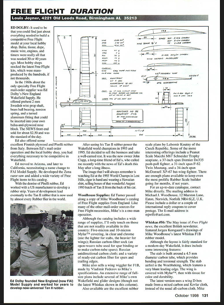 FREE FLIGHT DURATION 4 ED DOLBY used could find just about everything needed build competitive Free Flight model local hobby shop Balsa tissue dope music wire engines timers really needed 30 40 years ago Most hobby shops stocked latest Free Flight kits massproduced hundreds thousands 1960s about specialty Free Flight mall-order supplier Ed Dolby s New England Wakefield Supply offered prebent 2 mm Swedish wire prop shaft brass ball bearing tension spring turned aluminum fitting could inserted own balsa-and-plywood nose block NEWS front end sold about $250 standard day Ed also offered some excellent Finnish plywood Pirelli rubber Italy Between Eds mail order operation local hobby shop everything necessary competitive Wakefield Ed moved Arizona later California necessitating name change FAI Model Supply developed Zona razor saw added wide variety Free Flight items catalog demise Pirelli rubber Ed worked US manufacturer develop rubber strip Years development lead eventually Tan II rubber now used almost Rubber flier world 00 C6J51 2L 05 A4 WLAD/559 54952 10 104L8 61 OLVC60 9 5048Sq lOS709 80040/6 9 00 O66 9 TOTAL4495 0 64055Ceg nyzAt Ant 4/SOLO 039 5440840/LAP 644 0 SC/S eoaoet4,tc j LAOS /Mfl6r4 2 00544 P60- AP /5 4440 OSsLAVY Spoor 4 S//CE 048655 640 50600CC 740 24 AT /401/fl AT 065/ Woe/s 44., 9s/0eesT AZ I-I 25 SPAOS P i06 C4580/S ioof 506 400404 40/400 8LE fedrO2 O8 cnCd00 20 0-04044 939/1/ CACL3LO3 A,AL9 50544/0/S AVDESLSAXS 45w04000002 SSBE aidffios06C 699 bVOE88EA4 9404 05 999/4/ C 0050 440/ 080 9 1V4500 After seeing Tan II rubber power Wakefield world champions 1993 1995 Ed decided sell business take well-earned rest new owner John Clapp long-time friend Eds called recently news Eds death May after long illness image will always remember watching Ed 1993 Wodd Champs Lost Hills cigar hand wearing Hawaiian shirt selling boxes wonderful August 1993 batch Tan II back car Woodhouse Supplies Ed Turner passed along copy Mike Woodhouses catalog Free Flight supplies England Like other mail-order sources Free Flight necessities Mikes one-man operation Although catalog includes wide range supplies Ill touch readily available country Five-micron 10-micron MylariM covering clear chrome use lighter stabs heavier wings Russian carbon-fiber sock open-weave tube used spar binding make carbon-tube spars Russian unidirectional carbon cloth variety ready-cut carbon fiber spars trailing edges Mike also sells wing wiggler FiB made Vladimir Fedorov Mikes specifications An extensive range fullsize plans include several Mikes own Wakefield glider designs though latest Whiskas shown column Also available excellent rubber scale plans Lubomir Koutny Czech Republic Some interesting offerings include Peanut Scale Macchi M67 Schneider Trophy seaplane 37-inch span Dornier Do335 push-pull fighter 31-inch span F-82 Twin Mustang 34-inch span McDonnell XP-67 bat-wing fighter enough plans available keep prolific Rubber Scale builder going months years up-to-date catalogue contact Mike directly mailing address Michael J Woodhouse 12 Marston Lane Eaton Norwich Norfolk NR4 6LZ UK Please include dollar couple international reply coupons cover postage E-mail address mjwffs @ aolcom Whiskas #56 May issue Free Flight news excellent British newsletter featured Jorgen Korsgaard s drawings Mike Woodhouses latest Whiskas FlB rubber model Although layout fairly standard modern-day Wakefield does include some interesting features stab built around 45 mm diameter carbon tube provides bending torsional strength stab airfoil Woebbeking features very blunt leading edge wing covered MylarTM tissue color durability latest version uses wing D-box made mixed carbon Kevlar cloth instead usual all-carbon cloth Mike October1998 131 85 W/o/SKAO 9/0 56 G0uRMgr ia 8/ /4/05 40000 lOUSE LIE 0006408/ 0 40e040440aw Ed Dolby founded New England now FAI Model Supply worked years develop now-universal Tan II rubber OP notes switch saves five grams weight 66-gramper-square-meter cloth available Mike above address price 35 pounds Sterling per square meter supplied cut bias minimum waste maximum torsional strength D-boxes laid up threads 450 span have seen same cloth used some Ukrainian Wakefields addition interesting checkerboard appearance should yield tougher less-brittle wing using carbon alone Multifunction Button Timers column few months back about clockwork timers prompted letter plans John ODwyer showing modifies lightweight Button DT dethermalizer timer extra auto functions Button timers simple timers use rotor running viscous fluid instead usual gear train escapement control speed Instead mainspring timer powered rubber band spring line John adds disc Button timer rotor makes faceplate two wire arms extra control functions FIG Coupe models John uses Badge Classic version Button timer largest series designed DT functions big Gas model adds 1/32 plywood faceplate disc turned in rod power timer John uses diameter spring 1 /2 inches long spring made 40 turns 009 wire spring rate two ounces /2-inch stretch Delrin disc push fit timers release arm allows disc repositioned easily adjust auto function times relation DT John says DT times will vary few seconds two-minute flight Total weight timer including spring line less three grams Thats probably less what fuse DT snuffer tube would weigh timer mounted under wing left side pylon line spring runs back trailing edge stab small ioop front end line hooked over release lever timer wound wraps several turns line around timer shaft stretches spring number turns determines DT time Button Badge timers available Wheels & Wings Box 762 Lafayette CA 94549 FAI Model Supply Box 366 Sayre PA 18840 catalog $2 Button Badge timers see January 1997 FF Duration column Thats issue Ramrod 750 cover THREE FUNCTION TIMER FOR RUBBER MODELS BASED ON THE BUTTON TYPE OF VISCOUS DAMPED ROTARY DEVICE V 2H 28 CRAM 1 2P MOOu EL I- 1 Vol Libre Subscriptions French Free Flight newsletter Vol Libre excellent eclectic mix articles French