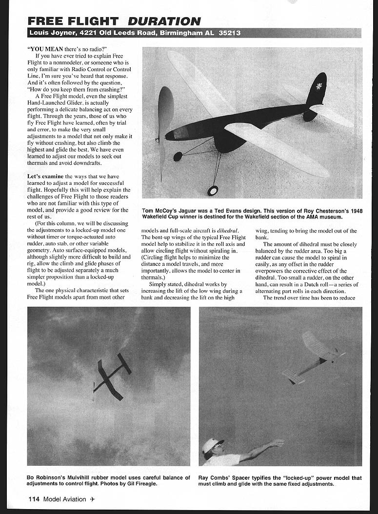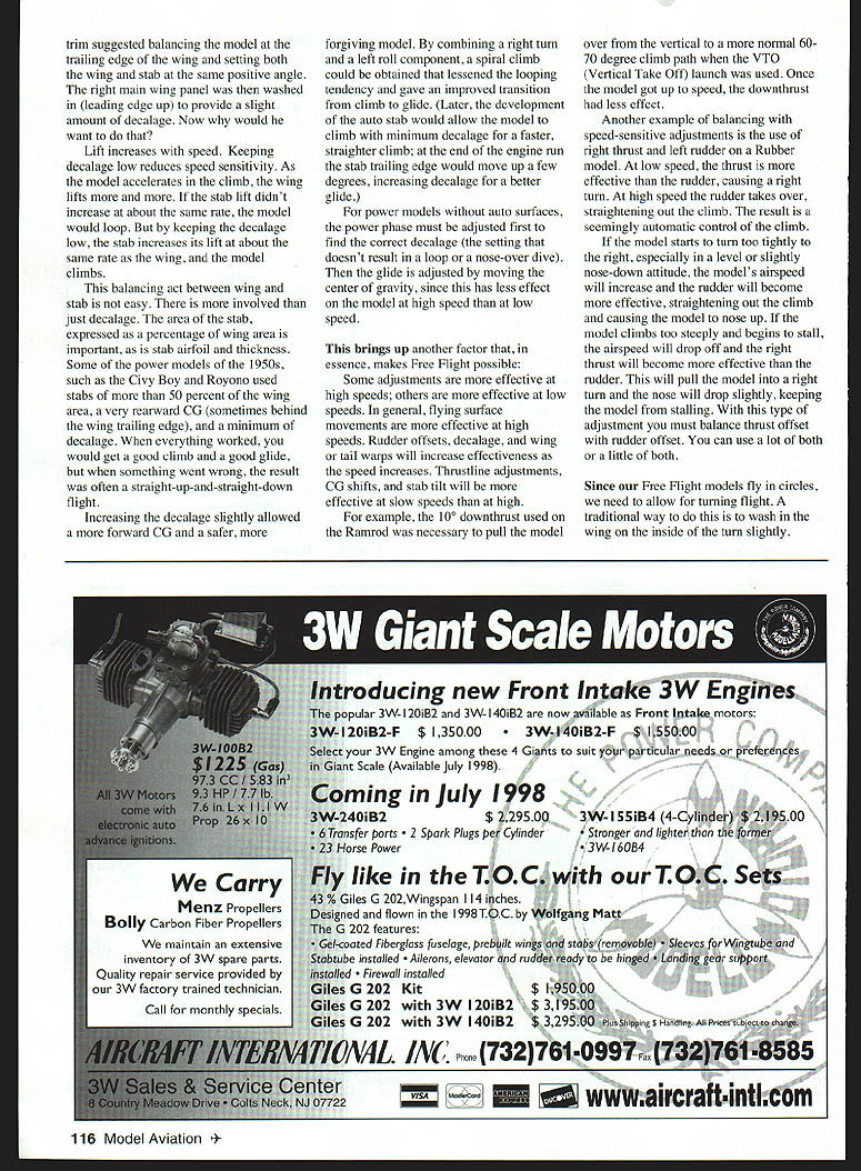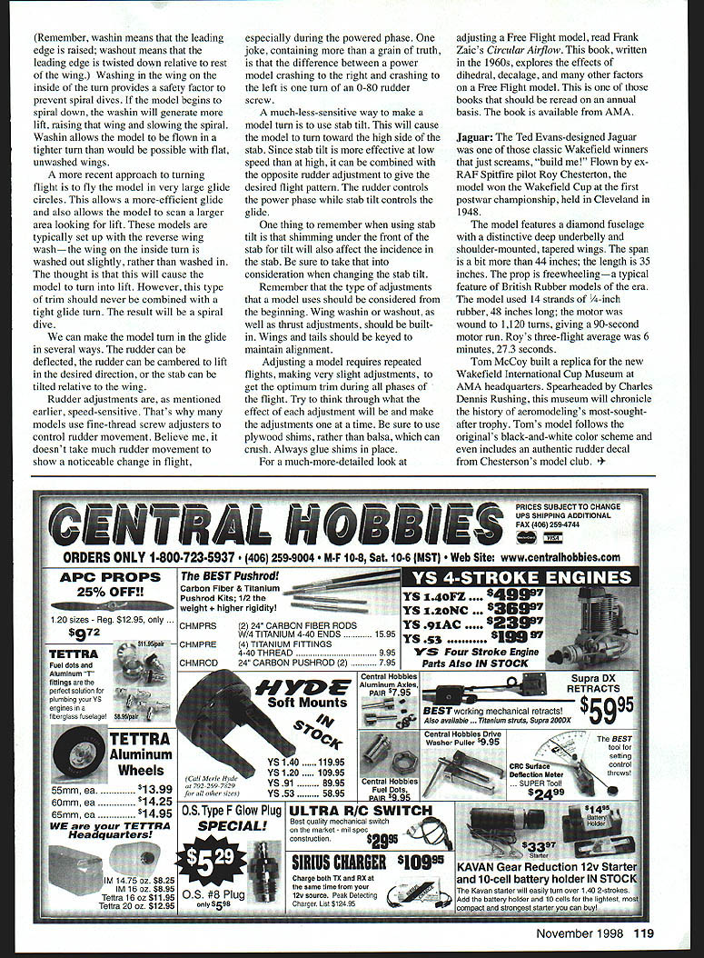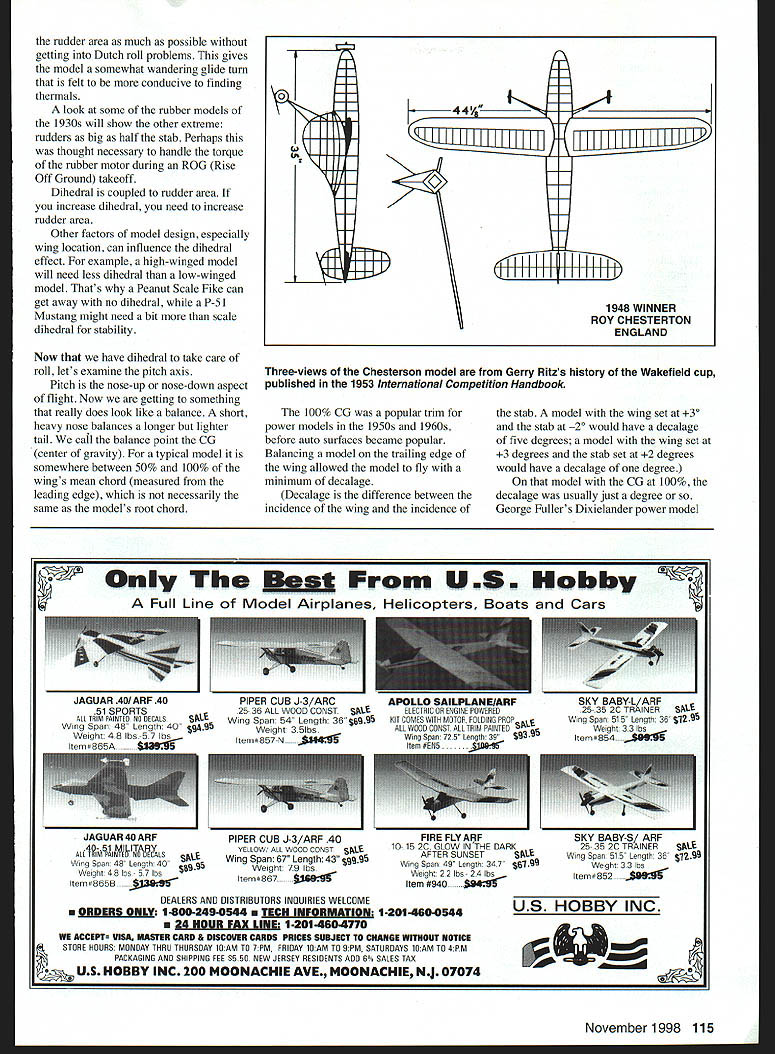 FREE FLIGHT DURATION WT YOU MEAN theres no radio have ever tried explain Free Flight nonmodeler someone familiar Radio Control Control Line Im sure youve heard response its often followed question keep crashing Free Flight model simplest Hand-Launched Glider actually performing delicate balancing act flight Through years us fly Free Flight have learned often trial error make very small adjustments model make fly crashing also climb highest glide best have learned adjust models seek Out thermals avoid downdrafts Lets examine ways have learned adjust model successful flight Hopefully will help explain challenges Free Flight readers familiar type model provide good review rest us column will discussing adjustments locked-up model timer torque-actuated auto rudder auto stab other variable geometry Auto surface-equipped models although slightly difficult build rig allow climb glide phases flight adjusted separately much simpler proposition locked-up model physical characteristic sets Free Flight models apart other models full-scale aircraft dihedral bent-up wings typical Free Flight model help stabilize roll axis allow circling flight spiraling Circling flight helps minimize distance model travels importantly allows model center thermals Simply stated dihedral works increasing lift low wing during bank decreasing lift high wing tending bring model out bank amount dihedral must closely balanced rudder area Too big rudder can cause model spiral easily offset rudder overpowers corrective effect dihedral Too small rudder other hand can result Dutch rolla series alternating part rolls direction trend over time has reduce 114 Model Aviation McCoys Jaguar Ted Evans design version Roy Chestersons 1948 Wakefield Cup winner destined Wakefield section AMA museum Bo Robinsons Mulvihill rubber model uses careful balance Ray Combs Spacer typifies locked-up power model adjustments control flight Photos Gil Fireagle must climb glide same fixed adjustments rudder area much possible getting Dutch roll problems gives model somewhat wandering glide turn felt conducive finding thermals look some rubber models 1930s will show other extreme rudders big half stab Perhaps thought necessary handle torque rubber motor during ROG Rise Off Ground takeoff Dihedral coupled rudder area increase dihedral need increase rudder area Other factors model design especially wing location can influence dihedral effect example high-winged model will need less dihedral low-winged model Thats Peanut Scale Fike can get away no dihedral P-5 Mustang might need bit scale dihedral stability Now have dihedral take care roll lets examine pitch axis Pitch nose-up nose-down aspect flight Now getting something really does look like balance short heavy nose balances longer lighter tail call balance point CG center gravity typical model somewhere between 50% 100% wings mean chord measured leading edge necessarily same models root chord Three-views Chesterson model Gerry Ritzs history Wakefield cup published 1953 International Competition Handbook 100% CG popular trim power models 1950s 1960s before auto surfaces became popular Balancing model trailing edge wing allowed model fly minimum decalage Decalage difference between incidence wing incidence stab model wing set 30 stab 2o would have decalage five degrees model wing set 3 degrees stab set 2 degrees would have decalage degree model CC 100% decalage usually just degree George Fullers Dixielander power model Only Dm1 US Hobby Full Line Model Airplanes Helicopters Boats Cars PIPER CUB J3/ARC 25-36 ALL WOOD CONST SPikE Wing Span 54 Length 36 $6995 Weight 3 SIbs Item#857-N441r JAGUAR 40/ARF 40 51 SPORTS ALL TRIM PAINTED NO DECALS SME Wing Span 48 Length 40 Weight 48 lbs -57 lbs SKY BABY-L/ARF 25-35 2C TRAINER SAkE Wing Span 51 5 tength 36 Weight 3 3 lbs Items854 FIRE FLYARF 10-1520 GLOW INTHE DARK AFTER SUNSET SAkE Wing Span 40 Length 347 67 9 ght 22 lbs- 24 lbs Item #940 DEALERS AND DISTRIBUTORS INQUIRIES WELCOME LRDERLQNL 1400-249-0544 INFORMATION 1-201460-0544 24 HOUR FAX LINE 1-2014604770 WE ACCEPT VISA MASTER CARD & DISCOVER CARDS PRICES SUBJECT TO CHANGE WITHOUT NOTICE STORE HOURS MONDAY THRU THURSDAY lOAM TO 7PM FRIDAY tO AM TO RPM SATURDAYS lOAM TO 4PM PACKAGING AND SHIPPING FEE S5 50 NtW JERSEY RESIDENTS ADD 0% SALtS TAX US HOBBY INC 200 MOONACHIE AVE NOONACHIE NJ 07074 US HOBBY INC November1998 115 4411 LI ThlI UIIiHiI 11111111 -J 1948 WINNER ROY CHESTERTON ENGLAND JAGUAR 4OARFPIPER CUB J-3/ARF 40SKY BABY-S/ ARF YEi.OW ALL WOOD CONAT SAkE25-35 20 TRAINERSAkE Wng Span 51 5 Length 35 Wng Span 48 Length 40Wing Span 67 Length 43 eight 3 3 ibs Weight 48 Inn 571h ight 79 lbs Itemo8S2...S9tWg Itemn865B #867...jS669t II trim suggested balancing model trailing edge wing setting both wing stab same positive angle right main wing panel washed leading edge up provide slight amount decalage Now would want Lift increases speed Keeping decalage low reduces speed sensitivity As model accelerates climb wing lifts more stab lift didnt increase about same rate model would loop keeping decalage low stab increases its lift about same rate wing model climbs balancing act between wing stab easy involved just decalage area stab expressed percentage wing area important stab airfoil thickness Some power models 1950s such Civy Boy Royono used stabs 50 percent wing area very rearward CU sometimes behind wing trailing edge minimum decalage everything worked would get good climb good glide something went wrong result often straight-up-and-straight-down flight Increasing decalage slightly allowed forward CU safer forgiving model combining right turn left roll component spiral climb could obtained lessened looping tendency gave improved transition climb glide Later development auto stab would allow model climb minimum decalage faster straighter climb end engine run stab trailing edge would move up few degrees increasing decalage better glide power models auto surfaces power phase must adjusted first find correct decalag