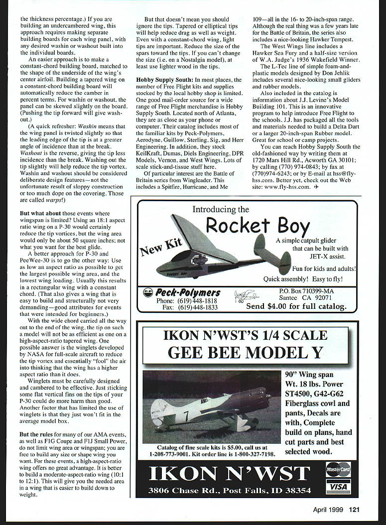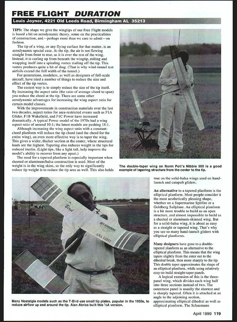 FREE FLIGHT DURATION TIPS shape give wingtips Free Flight models based bit aerodynamic theory some practicalities construction andperhaps care admiton fashion tip wing flying surface matter aerodynamic special case tip air flowing straight front rear over rest wing Instead curling up beneath wingtip rolling wrapping itself spiraling vortex trailing off tip vortex produces quite bit drag wind-tunnel test airfoils extend full width tunnel generations modelers well designers full-scale aircraft have tried number things reduce size effect tip vortex easiest way simply reduce size tip itself increasing aspect ratio ratio average chord span reduce chord tip some other aerodynamic advantages increasing wing aspect ratio certain model classes improvements construction materials over last two decades aspect ratios area-restricted events such FlA Glider FlB Wakefield FiC Power have increased dramatically typical Power model 1970s wing aspect ratio around 101 latest models pushing 181 Although increasing wing aspect ratio constantchord planform will reduce tip chord chord entire wing effective way taper wing gives wider thicker section center structural loads highest Tapering also reduces weight tips reduced inertia Light tips like light tail help improve models ability recover upset need tapered planform especially important sheeted aluminum/balsa construction used Most weight wing skins way significantly reduce tip weight reduce tip area well also holds true solid-balsa wings used handlaunch catapult gliders An alternative tapered planform elliptical planform Most people consider aesthetically pleasing shape whether Supermarine Spitfire Goldberg Sailplane An elliptical planform bit trouble build open structure almost impossible build sheeted aluminum-skinned wing solid-balsa wing about easy straight tapered wing Thats see hand-launch gliders elliptical planforms designers have gone doubletapered planform alternative elliptical planform means wing tapers slightly enter out dihedral break sharply tip double taper approximates shape elliptical planform using relatively easy-to-build straight-taper panels logical extension threepanel wing divides wing half three sections instead two outermost panel usually shortest sharply tapered Often attached angle adjoining section approximating elliptical dihedral well elliptical planform Schuemann April1999 119 double-taper wing Norm Potis Nibble 300 good example tapering structure center tip Nostalgia models such T-Bird use small tip plates popular 1950s reduce airflow up around tip Alan Abriss built Y2A version L 9, A9OovTwQ OF tONGS 1/YAW OCt00 SCALY ASS j-i-1-o 1 4 cL N s2CCF04S CO SYCSF04 FEW An early version Schuemann planform model 1930s German sailplane Frank Zaics Model Planes American Boy St o planform developed full-scale sailpianes widely used RC gliders good example three-panel approach double- triple-taper wing rear face wing main spar usually straight top view easier construction As alternative trailing edge can straight taper occurring swept-back leading edge Either way helps have some straight reference line aerodynamic reasons airfoil thickness camber usually reduced progressively center tip example wing might have center airfoil thickness 6% decreasing 55% break 45% tip Camber would likewise decrease hard way to replot airfoil break tip reducing percentage chamber thickness have airfoil plotting software packages shouldnt take too long Note merely reducing center airfoil copier would change Schuemann planform helps reduce tip vortex NFFS Book Power Models Ed Kecks FiC has narrow tip chord helps reduce tip vortices Use hightech materials allows long thin wings built amazing strength triple-taper wing Bill Cushenberrys Wakefield features turned-up tips approximate elliptical dihedral Tip wide SCHUEMANN WING PLANFORM FIT 2 AIRFLOS4 OVER AIRFCL SHAPE RaATIPE PRESSURE DISTRI6SJTIOT4 P163 LO4 SEPARAn AT TRAILING EDSE Lt*pIIi E( Inq -/ ISII L II PIG4-STRAIEUT WING AIRFLOW LEAVNG ECCE TOP FIG 5- NORMAL -rWINC TIP WITH SWEPT FORWARD TRAILING EDGE EJOTE SPAN WISE ROW rOWAROS ROOT LE*Wfl4 00CC TOP OWS - SMALL PLOW SEPARATION AT TIlE WINGTIP TRAVELS TOWARD ROOT tNIIRE SPAN MAT EFA PATE-ONCE STAPTEG THUS CREATING NIT/I OPAGANIS uir toss AKER 1ST VOCACA p \A7tvnK SWEPT LE CSTRAIGNTTE SPAN WISE FLOW IS tJE6LIDIOLL TAPERED TIP MINIMIZES VORTLT LOSSE5 FIGR MULTIPLE TAPERS I-IELPACHIEVE THE NEAR OPTIFIUMELLIPTICAL5 LIFT ESISTRIBU TION AND HELP COMBAT HIGH TIP LOSSES 120 Model Aviation 4 thickness percentage building undercambered wing approach requires making separate building boards wing panel desired washin washout built individual boards An easier approach make constant-chord building board matched shape underside wings center airfoil Building tapered wing constant-chord building board will automatically reduce camber percent terms washin washout panel can skewed slightly board Pushing tip forward will give wash out quick refresher Washin means wing panel twisted slightly leading edge tip greater angle incidence break Washout reverse giving tip less incidence break Washing out tip slightly will help reduce tip vortex Washin washout should considered deliberate design featuresnot unfortunate result sloppy construction too much dope covering called warps what about events wingspan limited Using 181 aspect ratio wing P-30 would certainly reduce tip vortices wing area would about 50 square inches what want best glide better approach P-30 PeeWee-30 go other way Use low aspect ratio possible get largest possible wing area lowest wing loading Usually results rectangular wing constant chord also gives wing easy build structurally very demandinggood attributes events intended beginners wide chord carried way out end wing tip such model will efficient high-aspect-ratio tapered wing possible answer winglets developed NASA full-scale aircraft reduce tip vortex essentially fool air thinking wing has higher aspect ratio does Winglets must carefully designed cambered effe