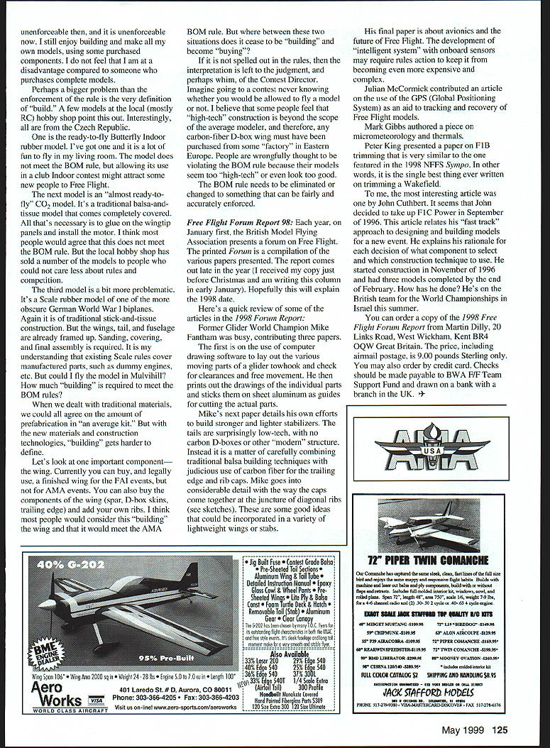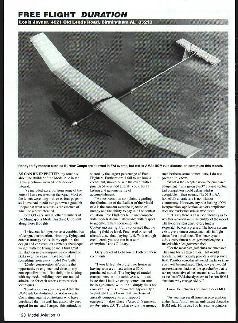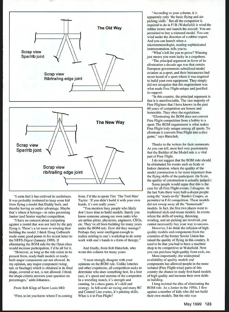 FREE FLIGHT DURATION AS CAN BE EXPECTED remarks about Builder Model rule January column aroused considerable interest Ive included excerpts some letters have received topic Most letters longthree four pages have edit things down good bit hope what remains essence what writer intended John OLeary 10 other members Minneapolis Model Airplane Club sent along thoughts view hobby/sport combination design construction trimming flying contest strategy skills opinion design construction elements share equal weight flying phase find great satisfaction ever-improving construction skills over years have learned something model Ive built Model construction affords opportunity engineer develop conceptualizations find delight sharing model building peers mutual admiration others construction techniques find no joy proposal BOM rule abolished AMA events Competing against contestants have purchased aircraft has absolutely zero appeal suspect attitude shared largest percentage Free Flighters Furthermore fail see contestant should win event purchased rented aircraft could feel lasting genuine sense accomplishment common complaint regarding elimination Builder Model rule concern over injection money ability pay contest equation Free Flighters build compete models deemed affordable respect income family economics etc Contestants rightfully concerned playing field level Purchased rented aircraft upset playing field enough credit cards too can world champion adds OLeary Gary Seckel Lebanon OH offered comments would feel absolutely no honor having won contest using $500 purchased model buying model components help achieve win issue believe contestant must agreement simply does compete mean apparently Wakefield fliers know purchase aircraft components support equipment takes place Note allowed rules U what extent money race bothers some contestants pretend know What accepted norm purchased equipment given event would venture competitors could define what acceptable events 51% BAA homebuilt aircraft rule controversy However rule lacking 100% interpretation application and/or compliance does render rule worthless Lets say issue honesty whether contestant builder model honor system exists time stopwatch button pressed honor system exists time contestant mails flight times postal meet honor system exists time rules-governed engine fueled rules-governed fuel part golf clubs purchased same 22 target rifles would hopefully automatically provide level playing field Possibly someday model airplanes event will purchased however would represent evolution sportlhobby representative now seems FM already caters non-BOM situation change AMA Bob Johannes Saint Charles MO As may recall conversation Nats Im somewhat ambivalent about BOM rule However have some opinions 120 Model Aviation y-to-fly models such Burdov Coupe allowed FAI events AMA BOM rule discussion continues month sorta feel has outlived its usefulness probably instituted keep some kid flying model Daddy built thereby having unfair advantage Maybe thats belongsin rules governing Junior Senior maybe competition have no concern about competing against model built guy flying Theres lot winning building model think Doug Galbreath made some good points recent letter NFFS Digest January 1999 eliminating BOM rule Open class would increase participation Id However long rule exists its present form ready-built models readybuilt major components allowed opinion major component wing tail fuselage obtained its final shape covered not allowed think shape criteria answers question percentages adds Johannes Bob Klipp Saint Louis MO First let know Im coming Id like quote Tim Tool Man Taylor didnt build own hands its reaily yours mention busy people likely dont have time build models Surely know someone among own ranks airline pilots physicists engineers CEOs etc Theyve ail building years under BOM rule did manage Perhaps intelligent enough realize retiring ones workshop some work ones hands form therapy finally Bob Hatschek wrote column years strongly disagree opinions BOM rule Unlike lotteries other crapshoots competition seeks detennine does something best foot race its speed stamina competitor wrestling match its strength cunning chess game its skill strategy full-scale air racing RC Control Line events its piloting skills What Free Right According column apparently basic flying airpicking skills competitor required FIB Wakefield wind rubber motor launch aircraft permitted buy trimmed model can wind under direction rubber expert can launch micrometeorologist reading sophisticated instrumentation tells Whats left prove Winning just means lucky crapshoot principal argument favor its elimination decade ago certain European governments subsidized model aviation sport bureaucrats never heard sport required build own equipment simply did recognize requirement what made Free Right unique justified its support country principal argument unenforceable vast majority Free Flighters have known past 60 years competition honest honorable obey regulations Eliminating BOM does convert Free Flight competition hobby sport BOM requirement what makes Free Right truly unique among sports eliminate converts Free Right dice game says Hatschek Thanks writers comments As can tell feel very passionately Builder Model rule vital part Free Flight suggest BOM rule should eliminated events such Scale Indoor duration quality model construction far important flying skills participant Scale quality construction actuaily judged Some people would argue case Free Flight events disagree last Nats half-a-dozen people using ready-to-fly Burdov Coupes permitted FAI competition models did sweep away homemade models fact first two places went traditional stick-and-tissue models events skills towing throwing winding air-picking involved cannot necessarily buy way success However think infusion highquality models components countries former Soviet Union has raised quality flying country used have machine shop competitive 