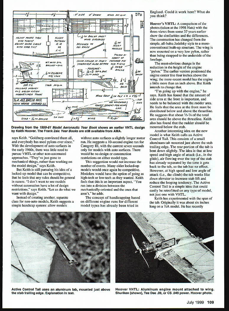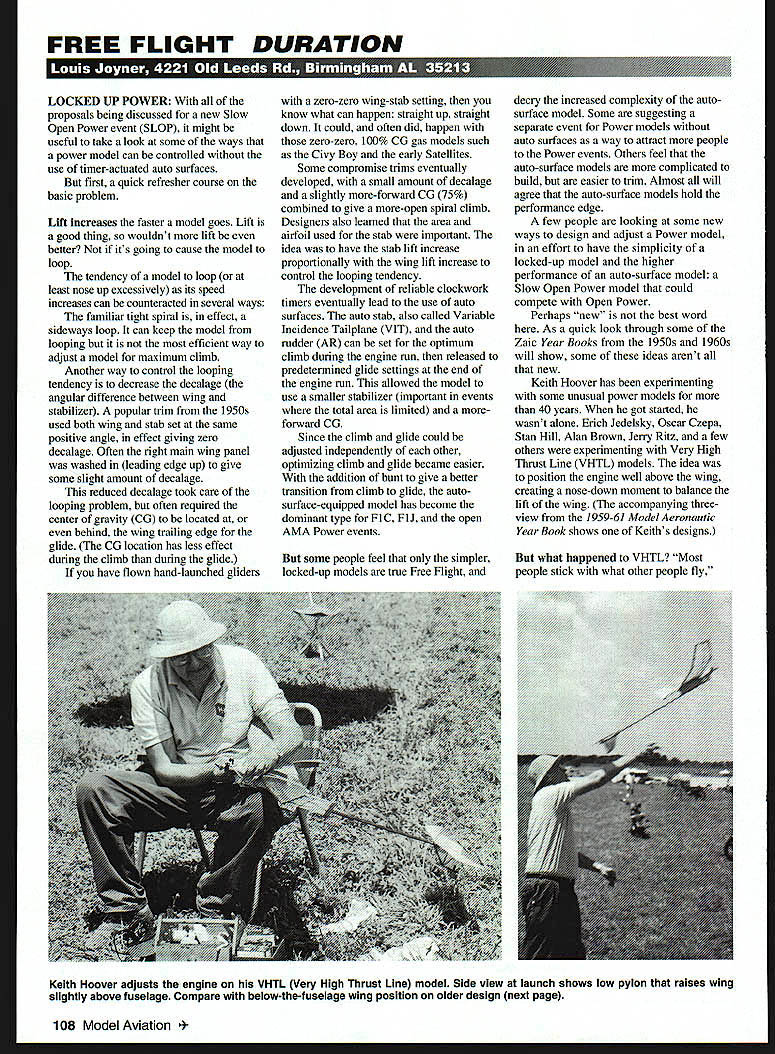 FREE FLIGHT DURATION LOCKED UP POWER proposals being discussed new Slow Open Power event SLOP might useful take look some ways power model can controlled use timer-actuated auto surfaces first quick refresher course basic problem Lift increases faster model goes Lift good thing wouldnt lift better its going cause model loop tendency model loop least nose up excessively its speed increases can counteracted several ways familiar tight spiral effect sideways loop can keep model looping efficient way adjust model maximum climb Another way control looping tendency decrease decalage angular difference between wing stabilizer popular trim 1950s used both wing stab set same positive angle effect giving zero decalage Often right main wing panel washed leading edge up give some slight amount decalage reduced decalage took care looping problem often required center gravity CC located behind wing trailing edge glide CC location has less effect during climb during glide have flown hand-launched gliders zero-zero wing-stab setting know what can happen straight up straight down could often did happen zero-zero 100% CC gas models such Civy Boy early Satellites Some compromise trims eventually developed small amount decalage slightly more-forward CC 75% combined give more-open spiral climb Designers also learned area airfoil used stab important idea have stab lift increase proportionally wing lift increase control looping tendency development reliable clockwork timers eventually lead use auto surfaces auto stab also called Variable Incidence Tailplane VITI auto rudder AR can set optimum climb during engine run released predetermined glide settings end engine run allowed model use smaller stabilizer important events total area limited moreforward CC Since climb glide could adjusted independently other optimizing climb glide became easier addition bunt give better transition climb glide autosurface-equipped model has become dominant type FIC FlJ open AMA Power events some people feel simpler locked-up models true Free Flight decry increased complexity autosurface model Some suggesting separate event Power models auto surfaces way attract people Power events Others feel auto-surface models complicated build easier trim Almost will agree auto-surface models hold performance edge few people looking some new ways design adjust Power model effort have simplicity locked-up model higher performance auto-surface model Slow Open Power model could compete Open Power Perhaps new best word As quick look through some Zaic Year Books 1950s 1960s will show some ideas arent new Keith Hoover has experimenting some unusual power models 40 years got started wasnt alone Erich Jedelsky Oscar Czepa Stan Hill Alan Brown Jeny Ritz few others experimenting Very High Thrust Line VHTL models idea position engine well above wing creating nose-down moment balance lift wing accompanying threeview 1 959-6 1 Model Aeronautic Year Book shows Keiths designs what happened VHTL Most people stick what other people fly 108 Model Aviation h Hoover adjusts engine VHTL Very High Thrust Line model Side view launch shows low pylon raises wing slightly above fuselage Compare below-the-fuselage wing position older design next page q -r-- Itzz/2zEzt r----. I liI ii - -~---i--] ---------I rI --------4I -I iI 42/U5 FL/S/IT Af 76 74/2Sf ADJOIT $t/D C/CL/I /2 -/2 4/TA S6 T/LT -L * 4T *7k 2 AL/Ie 504/I3 3Op//I /O 4A2 //OSAA7 6 3 6/2 96 A//LOA/ /0eAST /950 74iM /2AAILGQISgVNTL F /100iA LOILS LI __L_ Z S/I/I/ITzzz II EL 6 II II fYL 0/I & CgovT OF p/IeA/rrEe 7 yzoo Are Og/e P/Ecg /8- -4ep - 4 9/I 3/P/IS SALf ______________________________ ________________ "j4 HO DL9 MW/I 65T T/V P5/ /P I F/MS S__________________ LA/f // / g -7///L~ ______ ___p/N6 -xl-W/44VS2tt 4 2 Drawing 1959-61 Model Aeronautic Year Book shows earlier VHTL design Keith Hoover Frank Zaic Year Books still available AMA says Keith Goldberg convinced everybody has used pylons ever since development auto surfaces early 1960s little need pursue VHTL other non-automated approaches Theyve just gone mechanical things rather working model design says Keith Keith still pursuing idea locked-up model can competitive feels rules should general nature dont want see models automation have lot design restrictions says Keith Let us what want design Instead creating another separate class non-auto models Keith suggests simple handicap system allow models auto surfaces slightly longer motor run suggests 10-second engine run Category III current seven seconds models auto surfaces would no design construction restrictions either model type suggestion would increase number events older locked-up models would once again competitive Modelers would have option going high-tech low-tech wanted Keith feels important aspect run division between mechanically-oriented ones arent adds concept handicapping based different engine runs different model types has already tried England Could work What think Hoovers VHTL comparison photos taken 1998 Nats three-views some 37 years earlier show similarities differences construction has changed simple all-balsa Jedelsky style moreconventional built-up structure wing now mounted very low pylon rather being strapped underside fuselage most-obvious change reduction height engine pylon earlier version positioned engine center line four inches above wing more-recent model has engine little inch above Keith intends change Im going up engine says Keith has found amount side area front important needs balanced rudder area feels area front must distributed below above thrustline suggests about A- total area should above thrustline Keith also has found rudder should mounted below stab Another interesting idea new model what Keith calls Active Control Tail consists small aluminum tab mounted just above stab trailing edge rear portion tab bent down slightly idea low speed high angle attack ie glide air flowing over top stab has already separated time gets back tab tab has no effect However high