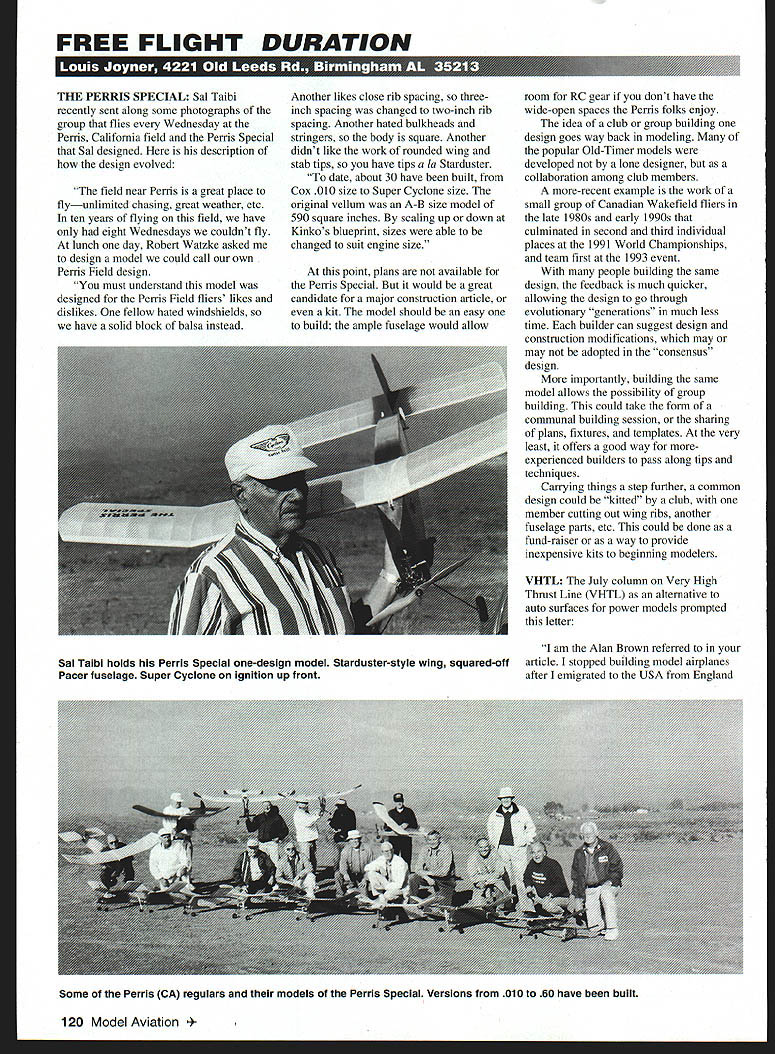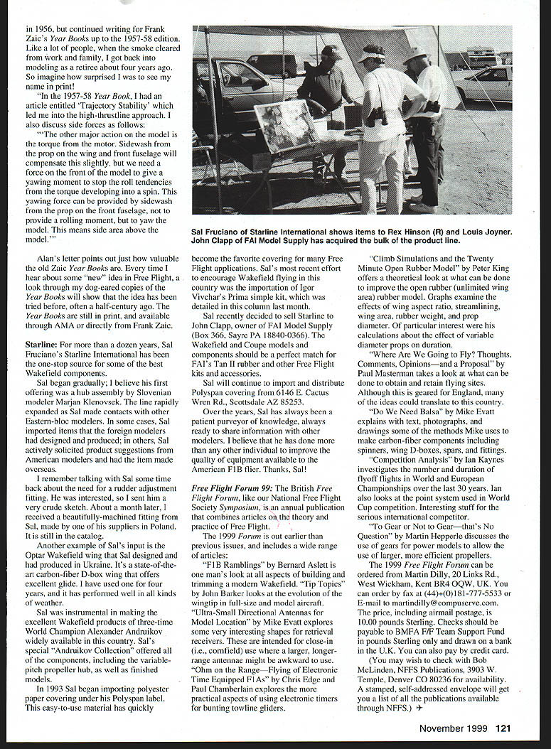 FREE FLIGHT DURATION U 1 II kU9 f11 A U THE PERRIS SPECIAL Sal Taibi recently sent along some photographs group flies Wednesday Penis California field Penis Special Sal designed description design evolved field near Perris great place flyunlimited chasing great weather etc ten years flying field have eight Wednesdays couldnt fly lunch day Robert Watzke asked design model could call own Penis Field design must understand model designed Penis Field fliers likes dislikes fellow hated windshields have solid block balsa instead Another likes close rib spacing threeinch spacing changed two-inch rib spacing Another hated bulkheads stringers body square Another didnt like work rounded wing stab tips have tips la Starduster date about 30 have built Cox 010 size Super Cyclone size original vellum A-B size model 590 square inches scaling up down Kinkos blueprint sizes able changed suit engine size point plans available Penis Special would great candidate major construction article kit model should easy build ample fuselage would allow room RC gear dont have wide-open spaces Penis folks enjoy idea club group building design goes way back modeling popular Old-Timer models developed lone designer collaboration among club members more-recent example work small group Canadian Wakefield fliers late 1980s early 1990s culminated second third individual places 1991 World Championships team first 1993 event people building same design feedback much quicker allowing design go through evolutionary generations much less time builder can suggest design construction modifications may may adopted consensus design importantly building same model allows possibility group building could take form communal building session sharing plans fixtures templates very least offers good way moreexperienced builders pass along tips techniques Carrying things step further common design could kitted club member cutting out wing ribs another fuselage parts etc could done fund-raiser way provide inexpensive kits beginning modelers VHTL July column Very High Thrust Line VHTL alternative auto surfaces power models prompted letter am Alan Brown referred article stopped building model airplanes after emigrated USA England 120 Model Aviation Taibi holds Perris Special one-design model Starduster-style wing squared-off Pacer fuselage Super Cyclone ignition up front Some Perris CA regulars models Perris Special Versions 010 60 have built 1956 continued writing Frank Zaics Year Books up 1957-58 edition Like lot people smoke cleared work family got back modeling retiree about four years ago So imagine surprised see name print 1957-5 8 Year Book article entitled Trajectory Stability led high-thrustline approach also discuss side forces follows other major action model torque motor Sidewash prop wing front fuselage will compensate slightly need force front model give yawing moment stop roll tendencies torque developing spin yawing force can provided sidewash prop front fuselage provide rolling moment yaw model means side area above model Alans letter points out just valuable old Zaic Year Books time hear about some new idea Free Flight look through dog-eared copies Year Books will show idea has tried before often half-century ago Year Books still print available through AMA directly Frank Zaic Starline For dozen years Sal Frucianos Starline International has one-stop source some best Wakefield components Sal began gradually believe first offering hub assembly Slovenian modeler Marjan Klenovsek line rapidly expanded Sal made contacts other Eastern-bloc modelers some cases Sal imported items foreign modelers designed produced others Sal actively solicited product suggestions American modelers item made overseas remember talking Sal some time back about need rudder adjustment fitting interested sent him very crude sketch About month later received beautifully-machined fitting Sal made suppliers Poland still catalog Another example Sals input Optar Wakefield wing Sal designed produced Ukraine Its state-of-theart carbon-fiber D-box wing offers excellent glide have used four years has performed well kinds weather Sal instrumental making excellent Wakefield products three-time World Champion Alexander Andruikov widely available country Sals special Andruikov Collection offered components including variablepitch propeller hub well finished models 1993 Sal began importing polyester paper covering under Polyspan label easy-to-use material has quickly become favorite covering Free Flight applications Sals recent effort encourage Wakefield flying country importation Igor Vivehars Prima simple kit detailed column last month Sal recently decided sell Starline John Clapp owner FAI Model Supply Box 366 Sayre PA 18840-0366 Wakefield Coupe models components should perfect match FAIs Tan II rubber other Free Flight kits accessories Sal will continue import distribute Polyspan covering 6146 E Cactus Wren Rd Scottsdale AZ 85253 Over years Sal has always patient purveyor knowledge always ready share information other modelers believe has done other individual improve quality equipment available American FlB flier Thanks Sal Free Flight Forum 99 British Free Flight Forum like National Free Flight Society Symposium annual publication combines articles theory practice Free Flight 1999 Forum out earlier previous issues includes wide range articles FIB Ramblings Bernard Aslett mans look aspects building trimming modern Wakefield Tip Topics John Barker looks evolution wingtip full-size model aircraft Ultra-Small Directional Antennas Model Location Mike Evatt explores some very interesting shapes retrieval receivers intended close-in ie cornfield use larger longerrange antennae might awkward use Ohm RangeFlying Electronic Time Equipped FIAs Chris Edge Paul Chamberlain explores practical aspects using electronic timers bunting towline gliders Climb Simulations Twenty Minute Open Rubber Model Peter King offers theoretical look what can done improve open rubber unlimited wi