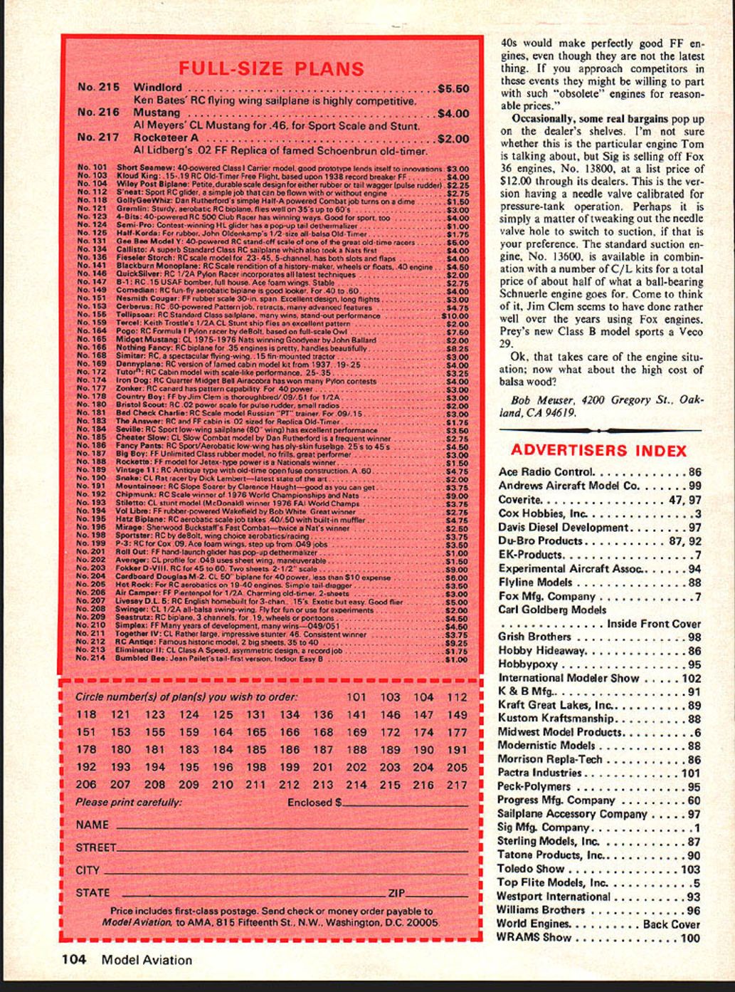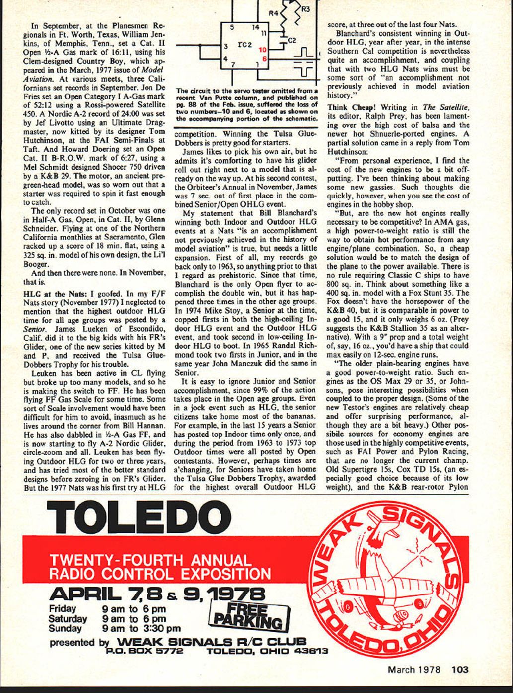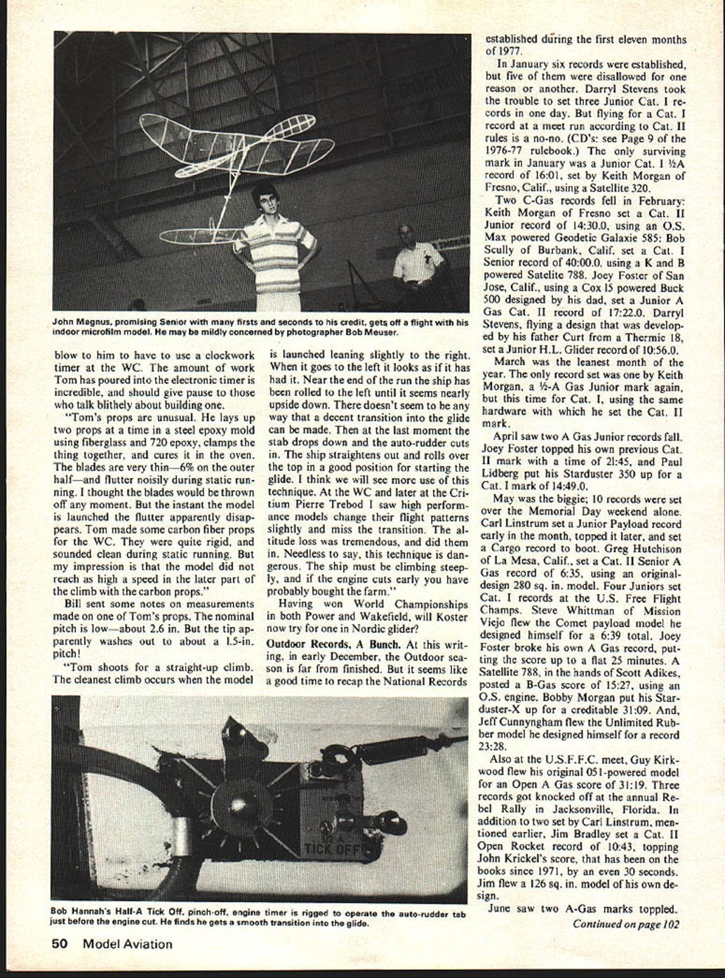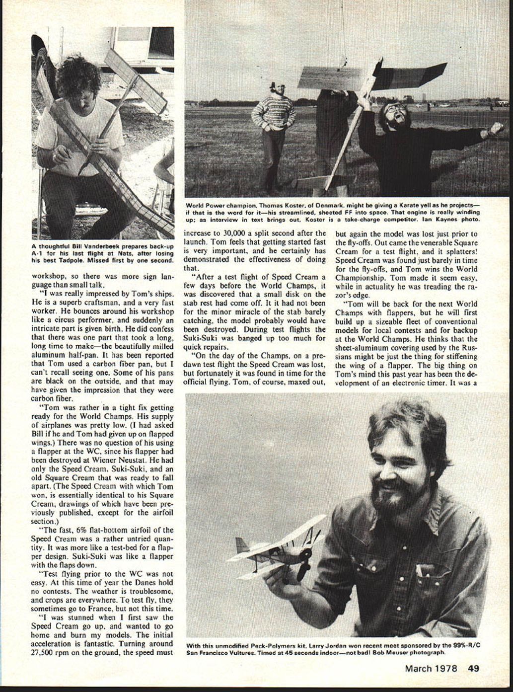 Duralion 0 Bob Meuser BUCK 650 Early 1977 13-year-old Joey Foster set three National Records using Buck 500 addition captur ing trophies both Northern Southern California meets June 650 version completed Within first few months its life won event entered both Class Class B Gas including Nats Joe Foster Joeys father designed model has flown just about sort model Among numerous other glories Wakefield World Cham pion early fifties still chucks hand-launch glider about well anyone Joe currently holds third oldest offi cial AMA National Record flew tiny indoor Baby ROG Stick model 21 mm 52 sec 1962 once active RC Pylon Racing what Joe has say about Buck 650 Wing construction similar used GYSOB design find rigid must glides well fuselage constructed flat board building up side si milar way Satellites made wing double covered Plyspan Superlite tissue Everything else singlecovered Nitrate dope used course ship flies right-right right wing washed /8-in polyhedral joint keep right wing up under pow er All-up weight 26 oz I3LECI 650 Dtsigned utj Joe Foster built bij Joey Fo5ter 1977 NATS h5 I St St 2__________ 4123 / 2 2514 1L3 Aas Jr Bas Jr 2 fllzi7 7O 25 L tia j Pt C VI 650 evolved two previous designs both used longer tail moment arms higher aspect ratios smaller wing area both flew well times difficult keep adjusted little wild side might say new design seems right size K&B 325cc Class 35cc engine Class B climb very fast making ideal 5-second engine run Category II after fourth max Using engines able get nearly 25000 rpm burning 60%-nitro fuel swinging 8/3 K&W fiber glass prop autorudder elevator along fuel shut-off actuated Seelig timer recently completed 850 version Dad could have some fun too powered new K&B 65cc front rotary So far three three competition 38 mm Thunderbugs Annual 43 mm Fresno Annual K&B real powerhouse feel 650 could adjusted fly auto-rudder auto-elevator using some down- right-thrust Jocys model 1/32-in differ ence between power glide settings elevator hardly worth extra gadgetry Tom Koster Bill Gieskieng stayed Tom Koster current FAI Power World Champion around time World Champs following comments ex tracted letter Bill spent three weeks Tom around time World Champs things hectic wasnt time pick ing brains too Tom addicted ear-drum-shattering music 48 Model Aviation Ron Young Cox employee seems happy about sheeted-wing FAI model better fliers can justify bit loving-care decorations workshop sign lan guage small talk really impressed Toms ships superb craftsman very fast worker bounces around workshop like circus performer suddenly intricate part given birth did confess part took long long time makethe beautifully milled aluminum half-pan has reported Tom used carbon fiber pan cant recall seeing Some pans black outside may have given impression carbon fiber Tom rather tight fix getting ready World Champs supply airplanes pretty low asked Bill Tom given up flapped wings no question using flapper WC since flapper destroyed Wiener Neustat Speed Cream Suki-Suki old Square Cream ready fall apart Speed Cream Tom won essentially identical Square Cream drawings have pre viously published except airfoil section fast 6% flat-bottom airfoil Speed Cream rather untried quan tity like test-bed flap per design Suki-Suki like flapper flaps down Test flying prior WC easy time year Danes hold no contests weather troublesome crops everywhere test fly sometimes go France time stunned first saw Speed Cream go up wanted go home burn models initial acceleration fantastic Turning around 27500 rpm ground speed must increase 30000 split second after launch Tom feels getting started fast very important certainly has demonstrated effectiveness doing After test flight Speed Cream few days before World Champs discovered small disk stab rest come off minor miracle stab barely catching model probably would have destroyed During test flights Suki-Suki banged up too much quick repairs day Champs pre dawn test flight Speed Cream lost fortunately found time official flying Tom course maxed out again model lost just prior fly-offs Out came venerable Square Cream test flight splatters Speed Cream found just barely time fly-offs Tom wins World Championship Tom made seem easy actuality treading ra zors edge Tom will back next World Champs flappers will first build up sizeable fleet conventional models local contests backup World Champs thinks sheet-aluminum covering used Rus sians might just thing stiffening wing flapper big thing Toms mind past year has de velopment electronic timer March1978 49 tflougflttul 5111 vanderbeek prepares back-up A-i last flight Nats after losing best Tadpole Missed first second World Power champion Thomas Koster Denmark might giving Karate yell projects word ithis streamlined sheeted FF space engine really winding up interview text brings out Koster take-charge competitor Ian Kaynes photo unmodified Peck-Polymers kit Larry Jordan won recent meet sponsored 99%-R/C San Francisco Vultures Timed 45 seconds indoornot bad Bob Meuser photograph blow him have use clockwork timer WC amount work Tom has poured electronic timer incredible should give pause talk blithely about building Toms props unusual lays up two props time steel epoxy mold using fiberglass 720 epoxy clamps thing together cures oven blades very thin6% outer halfand flutter noisily during static run ning thought blades would thrown off moment instant model launched flutter apparently disap pears Tom made some carbon fiber props WC quite rigid sounded clean during static running impression model did reach high speed later part climb carbon props Bill sent some notes measurements made Toms props nominal pitch lowabout 26 tip ap parently washes out about 15-in pitch Tom shoots straight-up climb cleanest climb occurs model launched leaning slightly right goes left looks has Near end run ship has rolled left until seems nearly upside down doesnt seem way decent transition glide can made last moment stab drops down auto-rudder cut