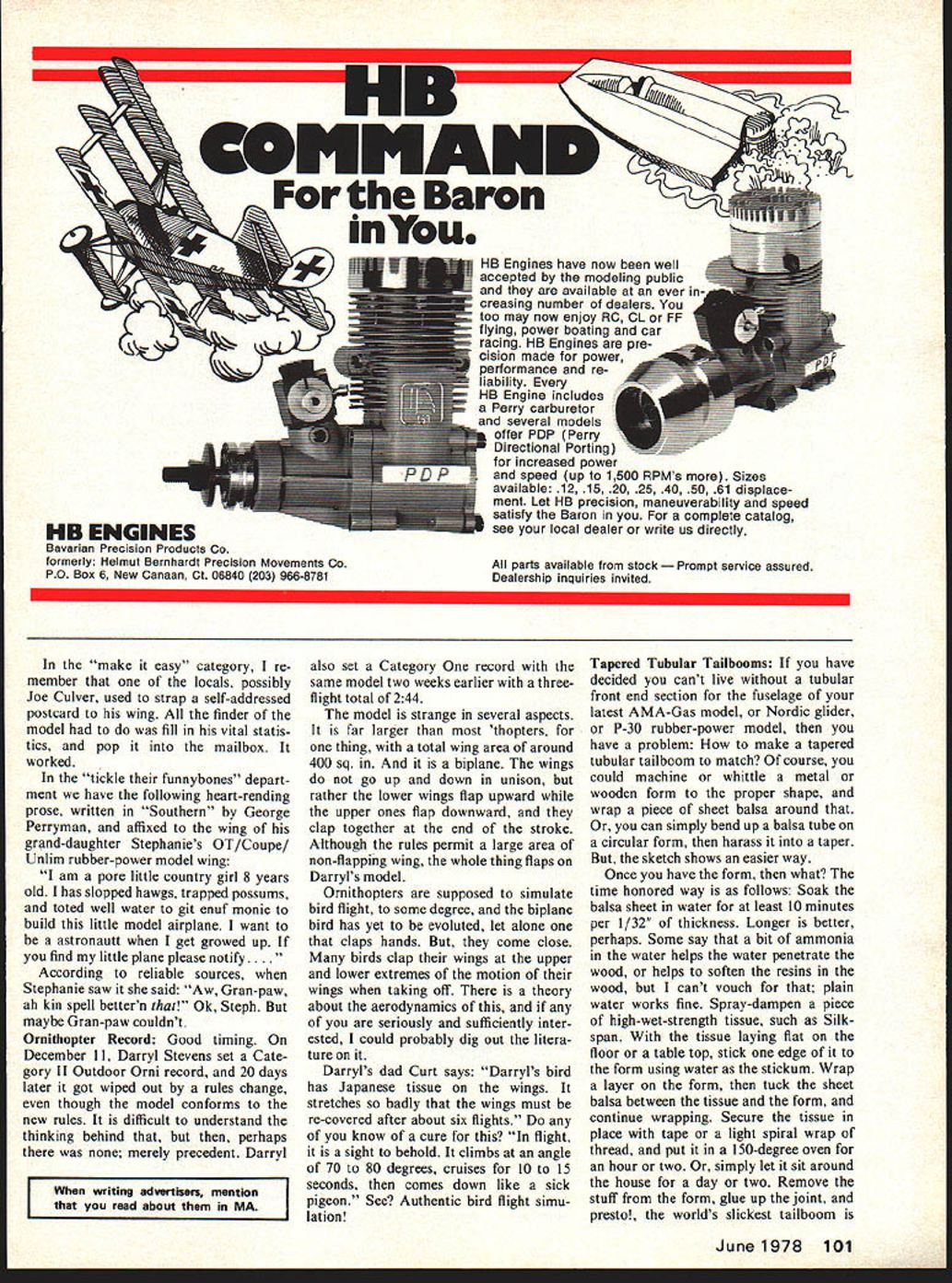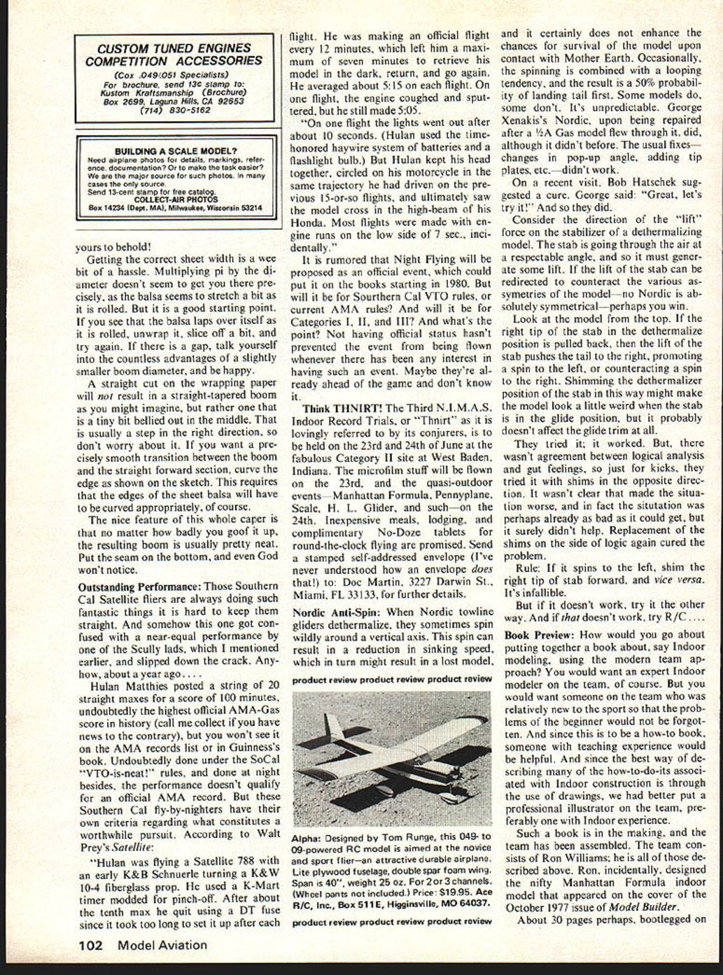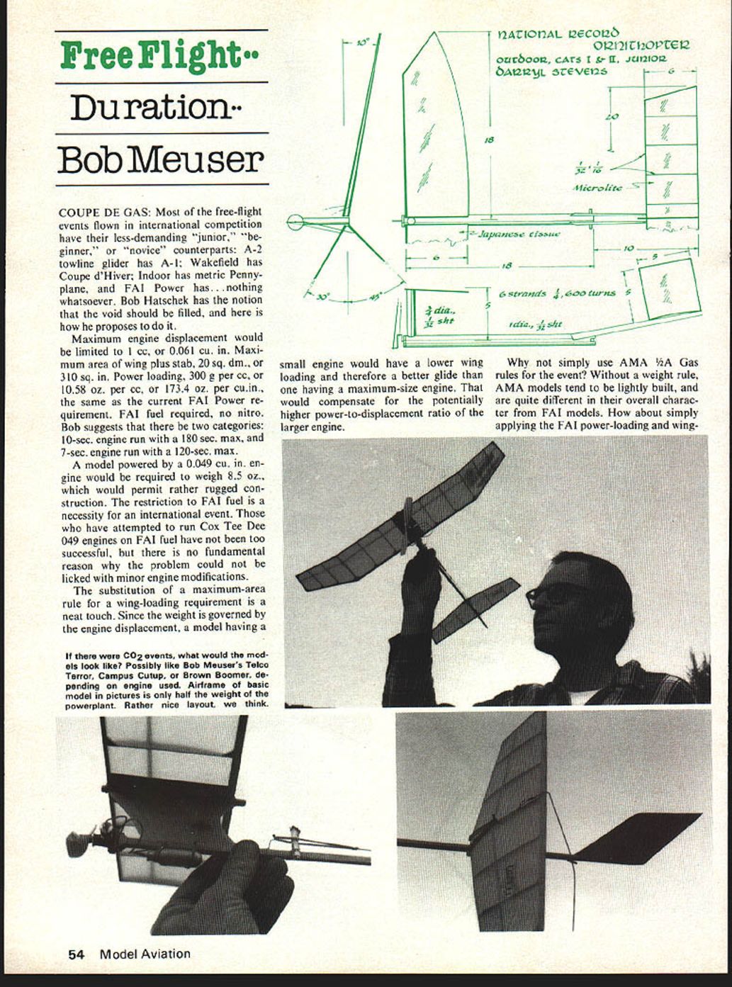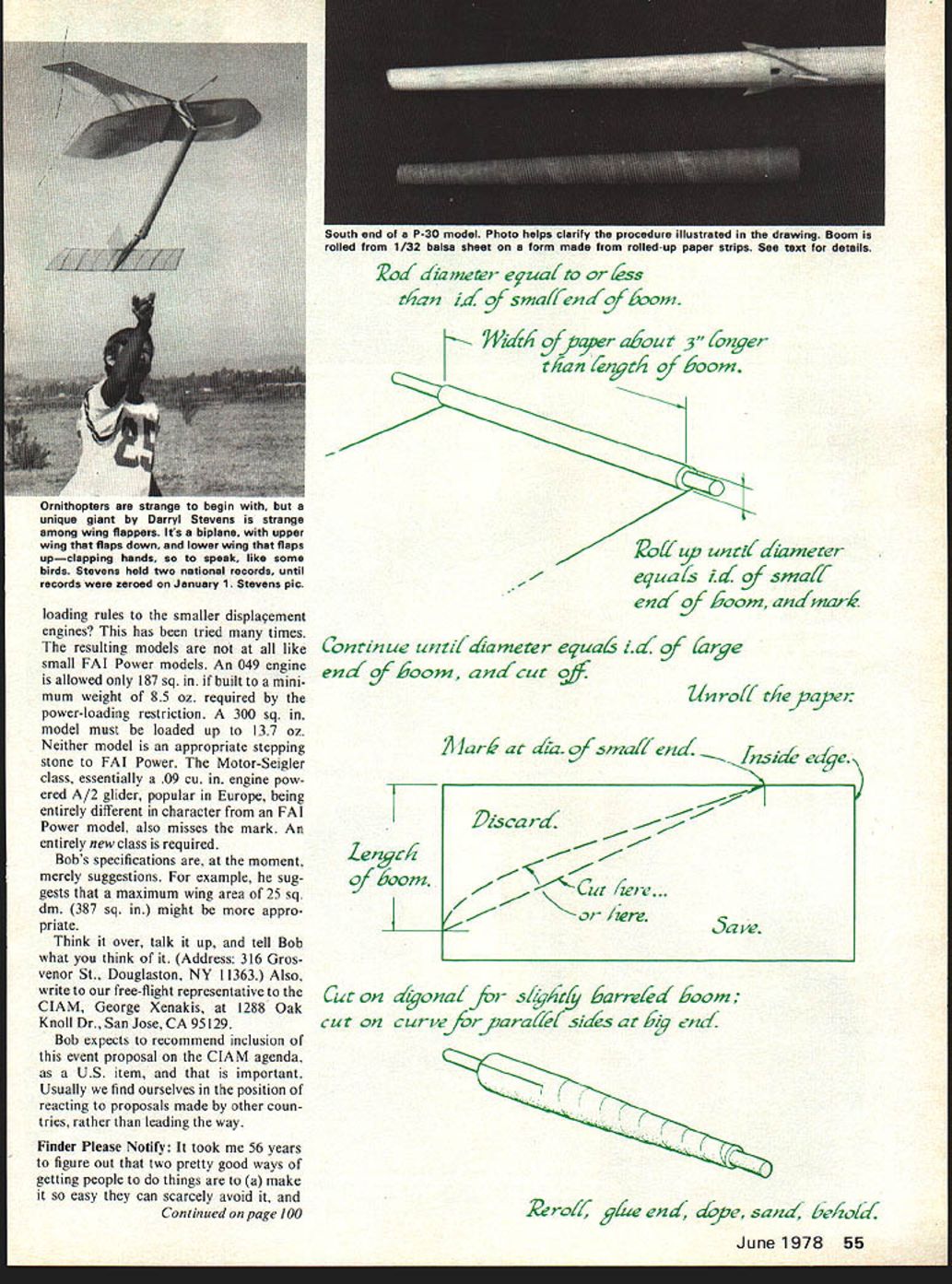 Free Flight Du ration Bob Meii ser COUPE DE GAS Most free-flight events flown international competition have less-demanding junior ginner novice counterparts A-2 towline glider has A-I Wakefield has Coupe dHiver Indoor has metric Pennyplane FAI Power has ing whatsoever Bob Hatschek has notion void should filled proposes Maximum engine displacement would limited cc 0061 cu Maxi mum area wing plus stab 20 sq din 310 sq Power loading 300 g per cc 1058 oz per cc 1734 oz per cuin same current FAI Power re quirement FAI fuel required no nitro Bob suggests two categories 10-sec engine run 180 sec max 7-sec engine run 120-sec max model powered 0049 cu en gine would required weigh 85 oz would permit rather rugged con struction restriction FAI fuel necessity international event have attempted run Cox Tee Dee 049 engines FAT fuel have too successful no fundamental reason problem could licked minor engine modifications substitution maximum-area rule wing-loading requirement neat touch Since weight governed engine displacement model having K iii t2AZIOflAL QECOI2& 012t21 Ct2OPtEl2 ourboaia CAtS t Sr II 4t4t21012 bA12t2yL 5tEVEt256 / 20 i8I 7/ / jig l4icro/zte -7 / Japanese tissue /0 - 6 i8 4 6 strands turns 5 dia. siitidia 4sht small engine would have lower wing simply use AMA Gas loading therefore better glide rules event Without weight rule having maximum-size engine AMA models tend lightly built would compensate potentially quite different overall charac higher power-to-displacement ratio ter FAI models about simply larger engine applying FAT power-loading wing54 Model Aviation CO2 events what would mod els look like Possibly like Bob Meusers Telco Terror Campus Cutup Brown Boomer de pending engine used Airframe basic model pictures half weight powerplant Rather nice layout think loading rules smaller displacement engines has tried times resulting models like small FAI Power models An 049 engine allowed 187 sq built mini mum weight 85 oz required power-loading restriction 300 sq model must loaded up 137 oz Neither model appropriate stepping stone FAI Power Motor-Seigler class essentially 09 cu engine pow ered A/2 glider popular Europe being entirely different character FAI Power model also misses mark An entirely new class required Bobs specifications moment merely suggestions example sug gests maximum wing area 25 sq din 387 sq might appro priate Think over talk up tell Bob what think Address 316 Gros venor St Douglaston NY 11363 Also write free-flight representative ClAM George Xenakis 1288 Oak Knoll Dr San Jose CA 95129 Bob expects recommend inclusion event proposal ClAM agenda US item important Usually find ourselves position reacting proposals made other coun tries rather leading way Finder Please Notify took 56 years figure out two pretty good ways getting people things make easy can scarcely avoid Continued page 100 Di5card eI equaL I~tf9 untidameter equats id[#sma{{ endgf 6~om andIinar6 i{oJ l2zrge 16i roff tAeyaye Continue unti{diameter end an/ cut en oJ6oom Cut cut ~erof y/e end /ope sand beliotiK June1978 55 v Sa -e South end P-30 model.. lled 1/32 balsa sheet form made rolledup paper strips See text details od aa meter e9ua{to /ss tan i{/sma(endi 6oom I14aA fpper a6oza 3 IZnger t6an iytA f6oom Ornithopters strange begin unique giant Darryl Stevens strange among wing flappers Its biplane upper wing flaps down lower wing flaps upclapping hands speak like some birds Stevens held two national records until records zeroed January 1 Stevens pic il 1a4 4z f sbza/f end d e#e N aK4jionaf fir s/A arrefeat 6oom curveJorjara{/f sids KITS 0 PtANS 0 ACCESSORIES BABY ACEP-NUT KITS NYLON BEARINGS BROWN CO-2 ENGINES _____________________REAL JAPANESE TISSUE-PROPS 57 SPAN COMPLETE CATALOG 50t KIT $4 25 MANY HAED TO FIND ITEMS Pt*-hfywes W BOX 2498LA MESA CALIF 92041 CATALOG 25c DAVIS22 D-IK PLAN CSD-7BY Chas E Steinchak MODERNISTIC MODELS PO B0X6974ALBUQNM87107 sanding lightly after coat Markings The roundels wing placed shown plan top ones shown inboard side bottom ones shown outboard side Heres good easy way make turn out right using compass draw proper circles contact paper cut out Starting center paint area roundel winga little actual area will finished airplane cover area contact paper mask center circle Seal edges clear paint Paint next color again little larger actual roundel will cover proper mask seal edges clear paint Continue until roundel complete Leave paper until rest Spitfire painted peel off contact paper presto youve got professional job may seem faster same time just make sure put right color right circles Pain canopy light blue Add AMA numbers initials can go fuselage Paint bottom airplane light blue paint top olive tan cam ouflage colors Conclusion Both Spitfires needed back plate engine filled sol der trimmed fly May June July 1976 issues Model Aviation Chris Lella tells lot airplanes actions problems articles bal ancing roll yaw pitch control line stunt ships quite good should read control line flyer models described article both capable doing complete AMA pattern problems either have worthy addition stable aerobatic mock-combat champions 52nd Nationals continued page 53 Charles Nats has possible adds up lot enjoyment economical conditions family oriented Nats Further food thought has become harder harder put Nats due cost complexity factors much has increasing talk re cent years about discontinuing Nats changing significantly make manageable might last opportunity enjoy Nats classic tradition Lake Charles offers best combination factors make trip worthwhile ever inclined go Nats years recommended offer facilities view point Lake Charles known site country much ideally suited Nats Thus stage set once again AMA put worlds biggest model meet invited FF Duration/Meuser continued page 55 b tickle funnybones applies getting people tell about find lost models Nats Entry&Meeting Information Advance Entry mail savings big Basic Fee refundable dont show Nats best bet advance entry postmark 