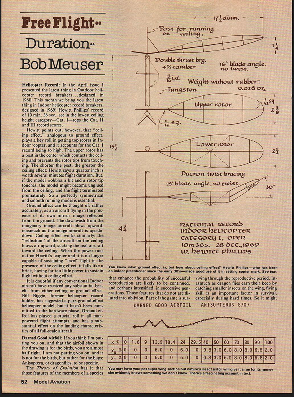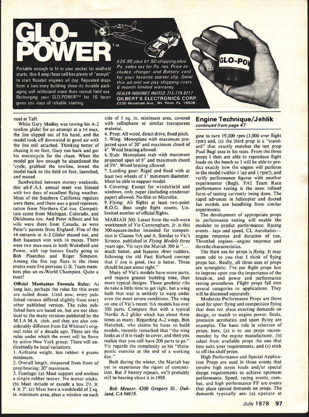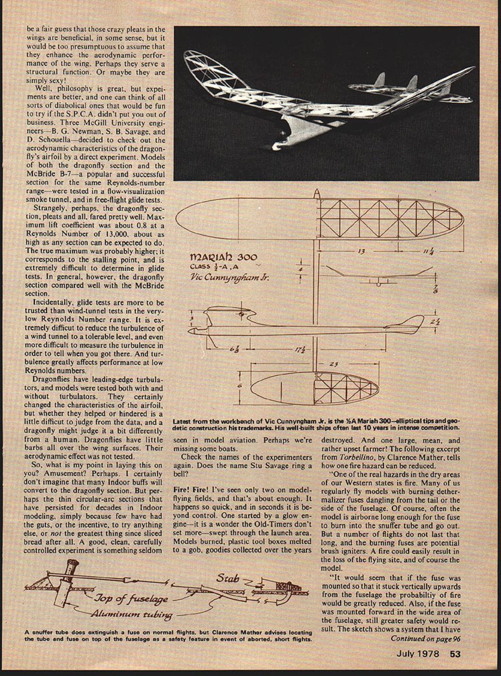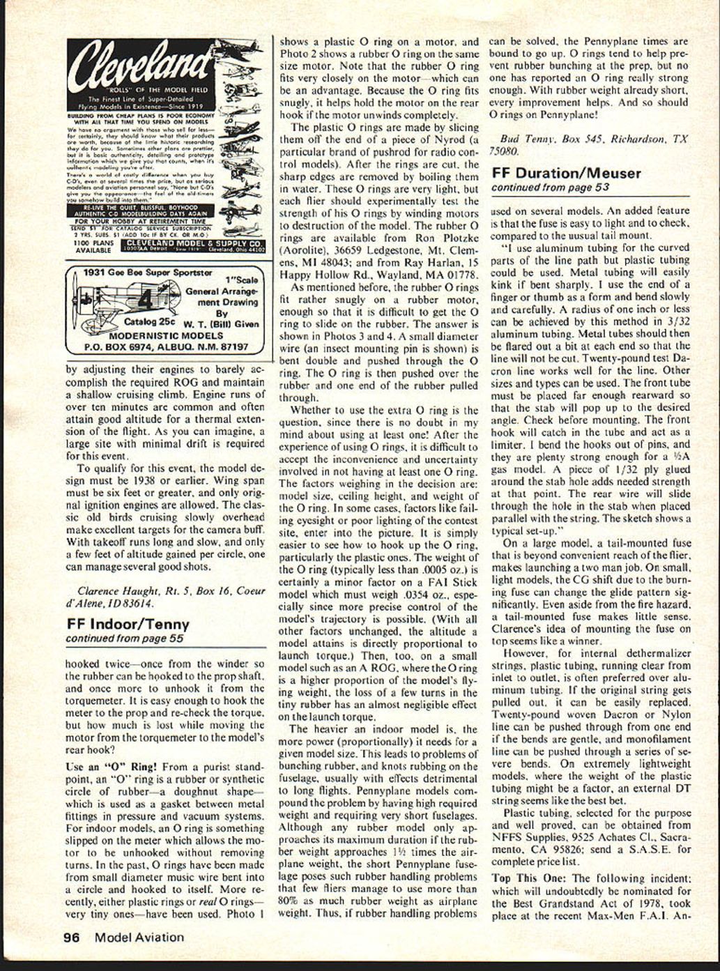 NO OCR TEXT NO OCR TEXT forcettoicly shey should hoow products ore worth because little historic researching fot Sowetiwes other plors ore prettier hut bosic ourheoticity detoiliog oed prototype inforwetioc glue rho t coonts whse its eufhertis wodeliog youre ofter Theres o world costly diPerenee wheo hcy CDs ecee otseoerol tiwen rho price hot os serious wodelerseod eciosion persoocol soy Nore hut CDs gioe yoc oppeoroncethe feel oldtiwers sowehew hoild thew FOR YOUR HOBBY AT R R M N M SENO St OR CATALOG SE 2 YRS SUBS St ADO tOe 1100 PLANS _________________________________ AVAILABLE 1931 Gee Bee Super Sportster 1 eeSle General Arrange ment Drawing Catalog 25c W T Bill Given MODERNISTIC MODELS PO BOX 6974 ALBUG NM 87197 adjusting engines barely ac complish required ROG maintain shallow cruising climb Engine runs over ten minutes common often attain good altitude thermal exten sion flight As can imagine large site minimal drift required event qualify event model de sign must 1938 earlier Wing span must six feet greater orig nal ignition engines allowed clas sic old birds cruising slowly overhead make excellent targets camera buff takeoff runs long slow few feet altitude gained per circle can manage several good shots Clarence Haught Rt 5 Box 16 Coeur dAlene ID 83614 FF Indoor/Tenny continued page 55 hooked twiceonce winder rubber can hooked prop shaft once unhook torquemeter easy enough hook meter prop re-check torque much lost moving motor torquemeter models rear hook Use 0 Ring purist stand point 0 ring rubber synthetic circle rubbera doughnut shape used gasket between metal fittings pressure vacuum systems indoor models 0 ring something slipped meter allows mo tor unhooked removing turns past 0 rings have made small diameter music wire bent circle hooked itself re cently either plastic rings real 0 ringsvery tiny ones-have used Photo shows plastic 0 ring motor Photo 2 shows rubber 0 ring same size motor Note rubber 0 ring fits very closely motor can advantage Because 0 ring fits snugly helps hold motor rear hook motor unwinds completely plastic 0 rings made slicing off end piece Nyrod particular brand pushrod radio con trol models After rings cut sharp edges removed boiling water 0 rings very light flier should experimentally test strength 0 rings winding motors destruction model rubber 0 rings available Ron Plotzke Aorolite 36659 Ledgestone Mt Clem ens Ml 48043 Ray Harlan 15 Happy Hollow Rd. Wayland MA 01778 As mentioned before rubber 0 rings fit rather snugly rubber motor enough difficult get 0 ring slide rubber answer shown Photos 3 4 small diameter wire insect mounting pin shown bent double pushed through 0 ring 0 ring pushed over rubber end rubber pulled through Whether use extra 0 ring question since no doubt mind about using least After experience using 0 rings difficult accept inconvenience uncertainty involved having least 0 ring factors weighing decision model size ceiling height weight 0 ring some cases factors like fail ing eyesight poor lighting contest site enter picture simply easier see hook up 0 ring particularly plastic ones weight 0 ring typically less 0005 oz certainly minor factor FAI Stick model must weigh 0354 oz espe cially since precise control models trajectory possible other factors unchanged altitude model attains directly proportional launch torque too small model such ROG 0 ring higher proportion models fly ing weight loss few turns tiny rubber has almost negligible effect launch torque heavier indoor model power proportionally needs given model size leads problems bunching rubber knots rubbing fuselage usually effects detrimental long flights Pennyplane models com pound problem having high required weight requiring very short fuselages Although rubber model ap proaches its maximum duration rub ber weight approaches 1 s air plane weight short Pennyplane fuse lage poses such rubber handling problems few fliers manage use 80% much rubber weight airplane weight Thus rubber handling problems can solved Pennyplane times bound go up 0 rings tend help pre vent rubber bunching prep no has reported 0 ring really strong enough rubber weight already short improvement helps should o rings Pennyplane Bud Tennv Box 545 Richardson TX 75080 FF Duration/Meuser continued page 53 used several models An added feature fuse easy light check compared uusual tail mount use aluminum tubing curved parts line path plastic tubing could used Metal tubing will easily kink bent sharply use end finger thumb form bend slowly carefully radius inch less can achieved method 3/32 aluminum tubing Metal tubes should flared out bit end line will cut Twenty-pound test Da cron line works well line Other sizes types can used front tube must placed far enough rearward stab will pop up desired angle Check before mounting front hook will catch tube act limiter bend hooks out pins plenty strong enough gas model piece 1/32 ply glued around stab hole adds needed strength point rear wire will slide through hole stab placed parallel string sketch shows typical set-up large model tail-mounted fuse beyond convenient reach flier makes launching two man job small light models CG shift due burn ing fuse can change glide pattern sig nificantly aside fire hazard tail-mounted fuse makes little sense Clarences idea mounting fuse top seems like winner However internal dethermalizer strings plastic tubing running clear inlet outlet often preferred over alu minum tubing original string gets pulled out can easily replaced Twenty-pound woven Dacron Nylon line can pushed through end bends gentle monofilament line can pushed through series se vere bends extremely lightweight models weight plastic tubing might factor external DT string seems like best bet Plastic tubing selected purpose well proved can obtained NFFS Supplies 9525 Achates Cl Sacra mento CA 95826 send SASE complete price list Top following incident will undoubtedly nominated Best Grandstand Act 1978 took place recent Max-Men FAI An96 Model Aviation nual Taft Ga