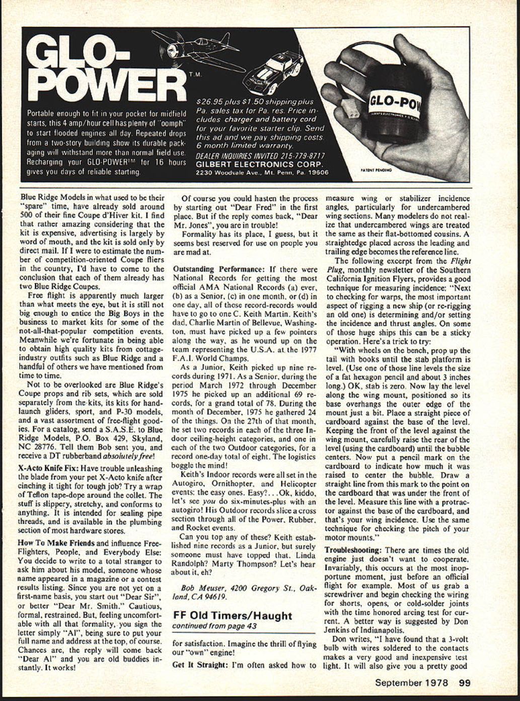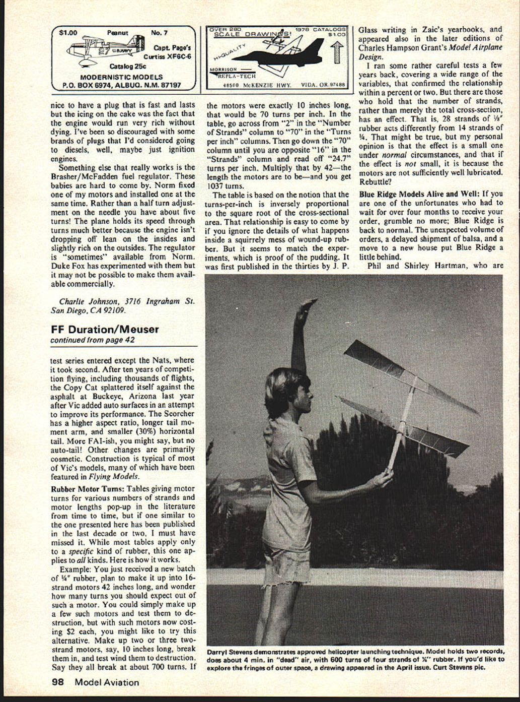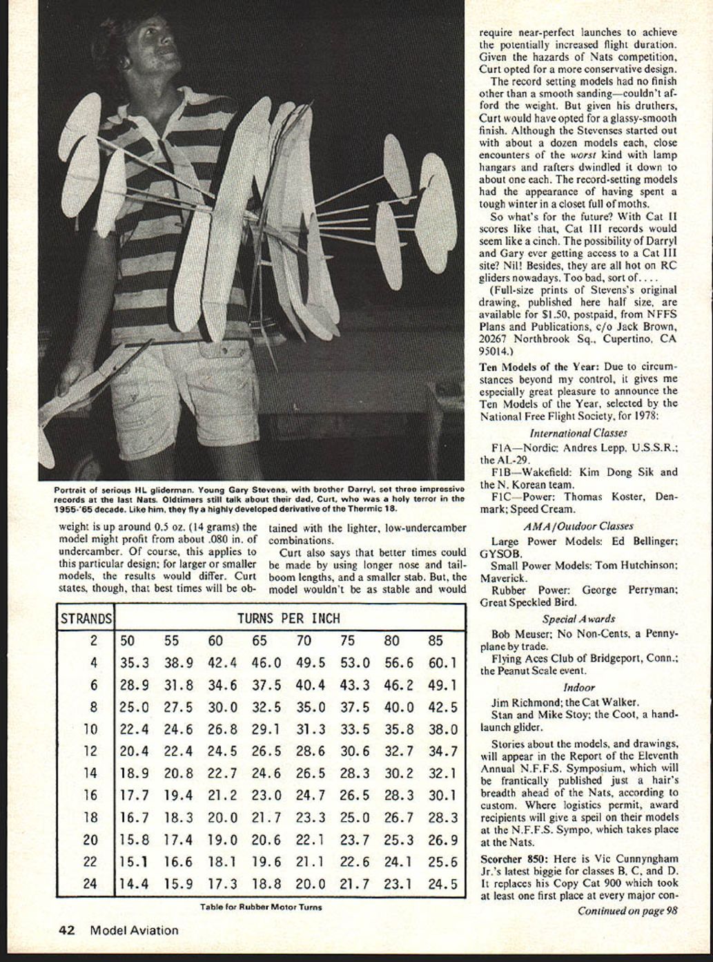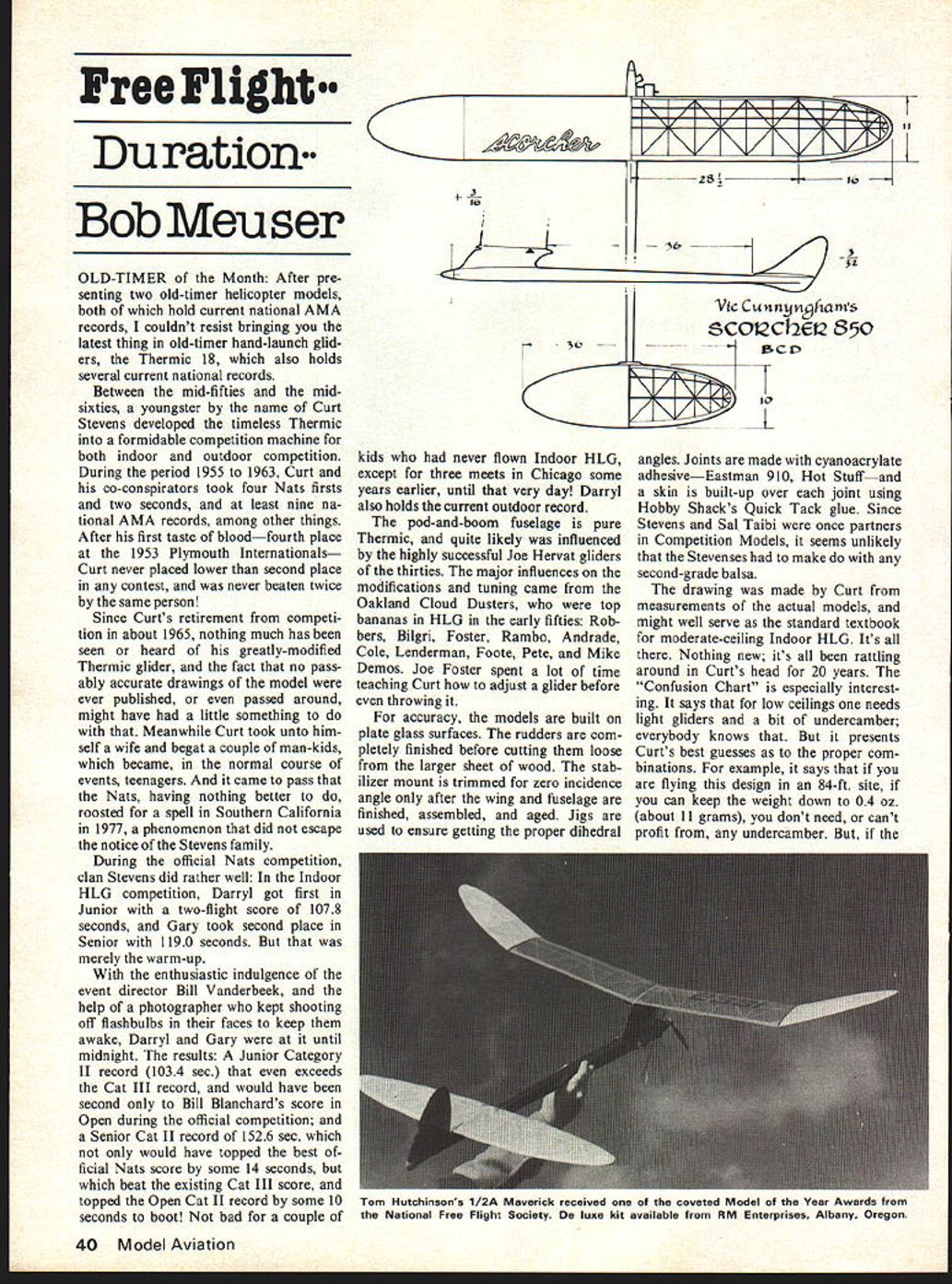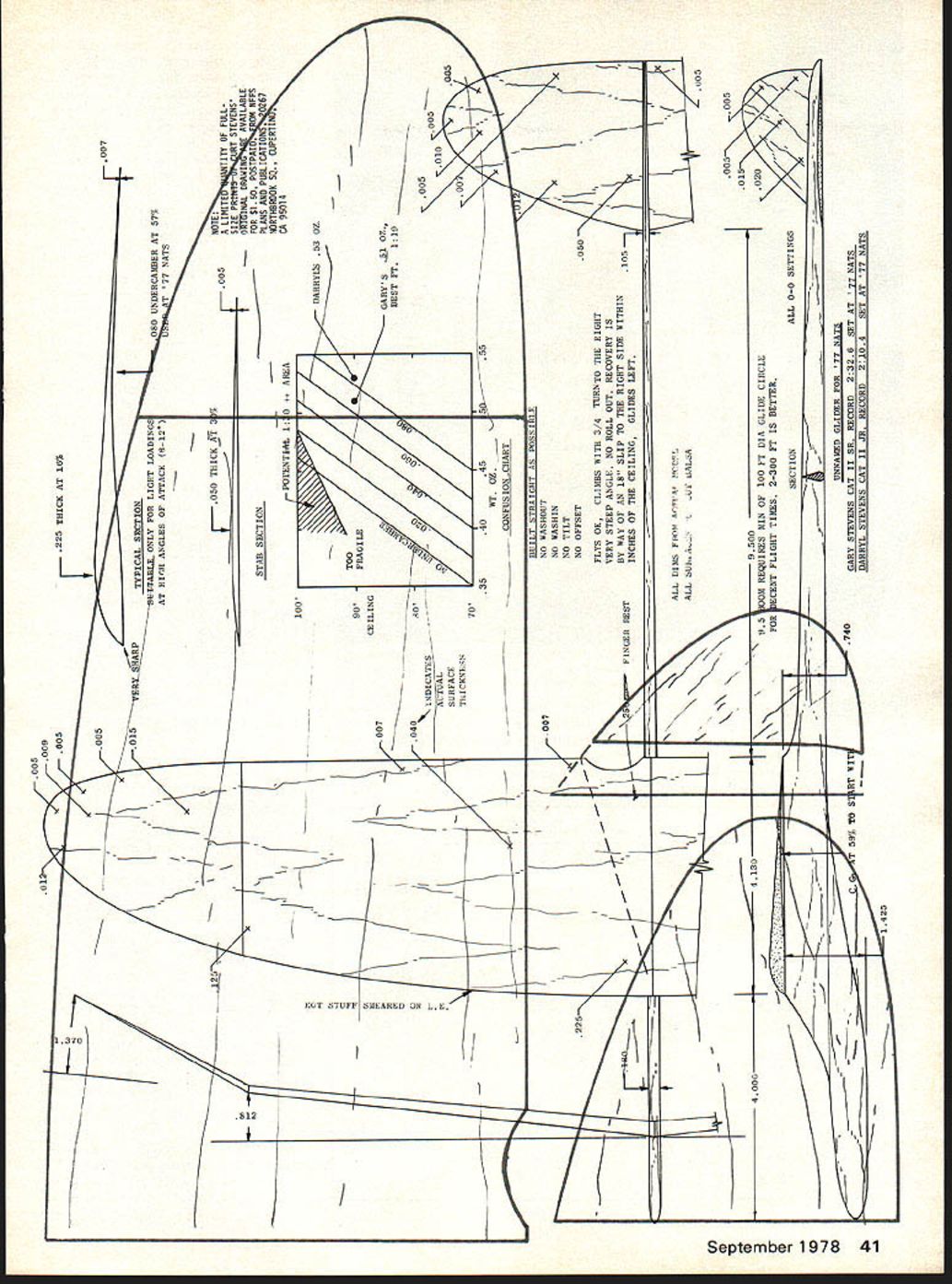 Free Flight. Du ration Bob Meu ser OLD-TIMER Month After pre senting two old-timer helicopter models both hold current national AMA records couldnt resist bringing latest thing old-timer hand-launch glid ers Thermic 18 also holds several current national records Between mid-fifties midsixties youngster name Curt Stevens developed timeless Thermic formidable competition machine both indoor outdoor competition During period 1955 1963 Curt co-conspirators took four Nats firsts two seconds least nine na tional AMA records among other things After first taste bloodfourth place 1953 Plymouth Internationals Curt never placed lower second place contest never beaten twice same person Since Curts retirement competi tion about 1965 nothing much has seen heard greatly-modified Thermic glider fact no pass ably accurate drawings model ever published passed around might have little something Meanwhile Curt took unto him self wife begat couple man-kids became normal course events teenagers came pass Nats having nothing better roosted spell Southern California 1977 phenomenon did escape notice Stevens family During official Nats competition clan Stevens did rather well Indoor HLG competition Darryl got first Junior two-flight score 1078 seconds Gary took second place Senior 1190 seconds merely warm-up enthusiastic indulgence event director Bill Vanderbeek help photographer kept shooting off flashbulbs faces keep awake Darryl Gary until midnight results Junior Category II record 1034 sec exceeds Cat III record would have second Bill Blanchards score Open during official competition Senior Cat II record 1526 sec would have topped best ficial Nats score some 14 seconds beat existing Cat III score topped Open Cat II record some 10 seconds boot bad couple Vic Cuiinyjnhams scc1d2Et2 850 K iJi~ 1 -Ikids never flown Indoor HLG except three meets Chicago some years earlier until very day Darryl also holds current outdoor record pod-and-boom fuselage pure Thermic quite likely influenced highly successful Joe Hervat gliders thirties major influences modifications tuning came Oakland Cloud Dusters top bananas HLG early fifties Rob bers Bilgri Foster Rambo Andrade Cole Lenderman Foote Pete Mike Demos Joe Foster spent lot time teaching Curt adjust glider before throwing accuracy models built plate glass surfaces rudders com pletely finished before cutting loose larger sheet wood stab ilizer mount trimmed zero incidence angle after wing fuselage finished assembled aged Jigs used ensure getting proper dihedral angles Joints made cyanoacrylate adhesiveEastman 910 Hot Stuffand skin built-up over joint using Hobby Shacks Quick Tack glue Since Stevens Sal Taibi once partners Competition Models seems unlikely Stevenses make second-grade balsa drawing made Curt measurements actual models might well serve standard textbook moderate-ceiling Indoor HLG Its Nothing new its rattling around Curts head 20 years Confusion Chart especially interest ing says low ceilings needs light gliders bit undercamber everybody knows presents Curts best guesses proper com binations example says flying design 84-ft site can keep weight down 04 oz about 11 grams dont need cant profit undercamber 40 Model Aviation 36 Tom Hutchinsons 1/2A Maverick received coveted Model Year Awards trom National Free Flight Society De luxe kit available RM Enterprises Albany Oregon GI LEv-K C 0 AT RICH ANGLES OF ATTACK 812 050 THICK AT 3 % OTINAL IIRAWIN AVAILABLE STAB SECTIONFOR $150 POSTPAI NFFS 100rPOTENTSAS 1 0 DARRYLS 53 OZ 90 CE SLING GARYS .jl OZ BEST FE 119 \IRDICATES005 010 QLS 00 354045555 - _____ GNFUSIOILXHART BUILT STRAIGHT AS POSSIBLE NOWASHOUT NOWASHIN NOTILT NOOFFSET050 FLYS OK CLIMBS WITH 3/4 TUENTO THE BIGHT VERY STEEP ASGLU NO ROLL OUT RECOVERY IS BY WAY OF SW SLIP TO THE RIGHT SIDE WITHIN 105 INCHES OF THE CEILING GLIDES LEFT ALL GIMI FROM AOU SUL Aj5CC L3ALA 005 400041300 cn CD005005 ____________________01 950DM REQUIRES BIN OF 100 FT DIA GLIDE CIRCLE020 -FOR ECENT FLIGHT TIllER 2300 FT IS BETTER CD SECTIONALL 00 SETTINGS 0__--\ -1 UNNAMED GLIDER FOR 77 HATS -- T59%TOSRTWIT740GARY STEVENS CAT II SR RECORD AT ATS ___________DARRYL STEVENS CAT II Ill RECORD AT 77 HATS -a require near-perfect launches achieve potentially increased flight duration Given hazards Nats competition Curt opted conservative design record setting models no finish other smooth sandingcouldnt af ford weight given druthers Curt would have opted glassy-smooth finish Although Stevenses started out about dozen models close encounters worst kind lamp hangars rafters dwindled down about record-setting models appearance having spent tough winter closet full moths So whats future Cat II scores like Cat III records would seem like cinch possibility Darryl Gary ever getting access Cat III site Nil Besides hot RC gliders nowadays Too bad sort of.. Full-size prints Stevenss original drawing published half size available $150 postpaid NFFS Plans Publications c/o Jack Brown 20267 Northbrook Sq Cupertino CA 95014 Ten Models Year Due circum stances beyond control gives especially great pleasure announce Ten Models Year selected National Free Flight Society 1978 International Classes FlANordic Andres Lepp USSR AL-29 FlBWakefield Kim Dong Sik N Korean team FlCPower Thomas Koster Den mark Speed Cream weight up around 05 oz 14 grams tamed lighter low-undercamber AMA/Outdoor Classes model might profit about 080 combinations Large Power Models Ed Bellinger undercamber course applies Curt also says better times could GYSOB particular design larger smaller made using longer nose tail- Small Power Models Tom Hutchinson models results would differ Curt boom lengths smaller stab Maverick states though best times will ob- model wouldnt stable would Rubber Power George Perryman Great Speckled Bird Special wards Bob Meuser No Non-Cents Pennyplane trade Flying Aces Club Bridgeport Conn Peanut Scale event Indoor Jim Richmond Cat Walker Stan Mike Stoy Coot handlaunch glider Stories about models drawings will 