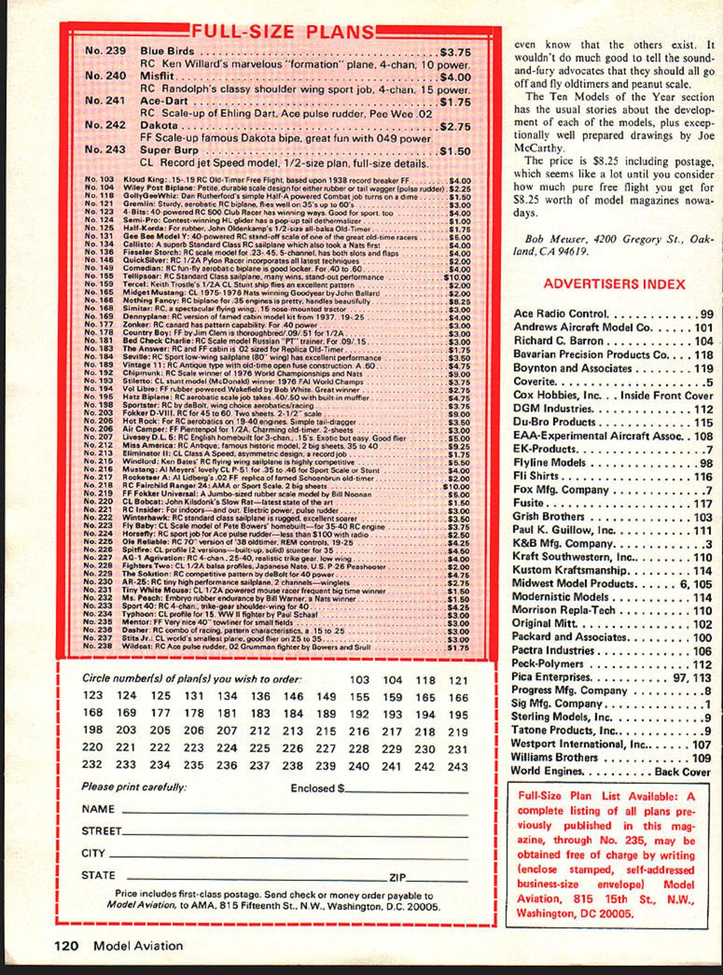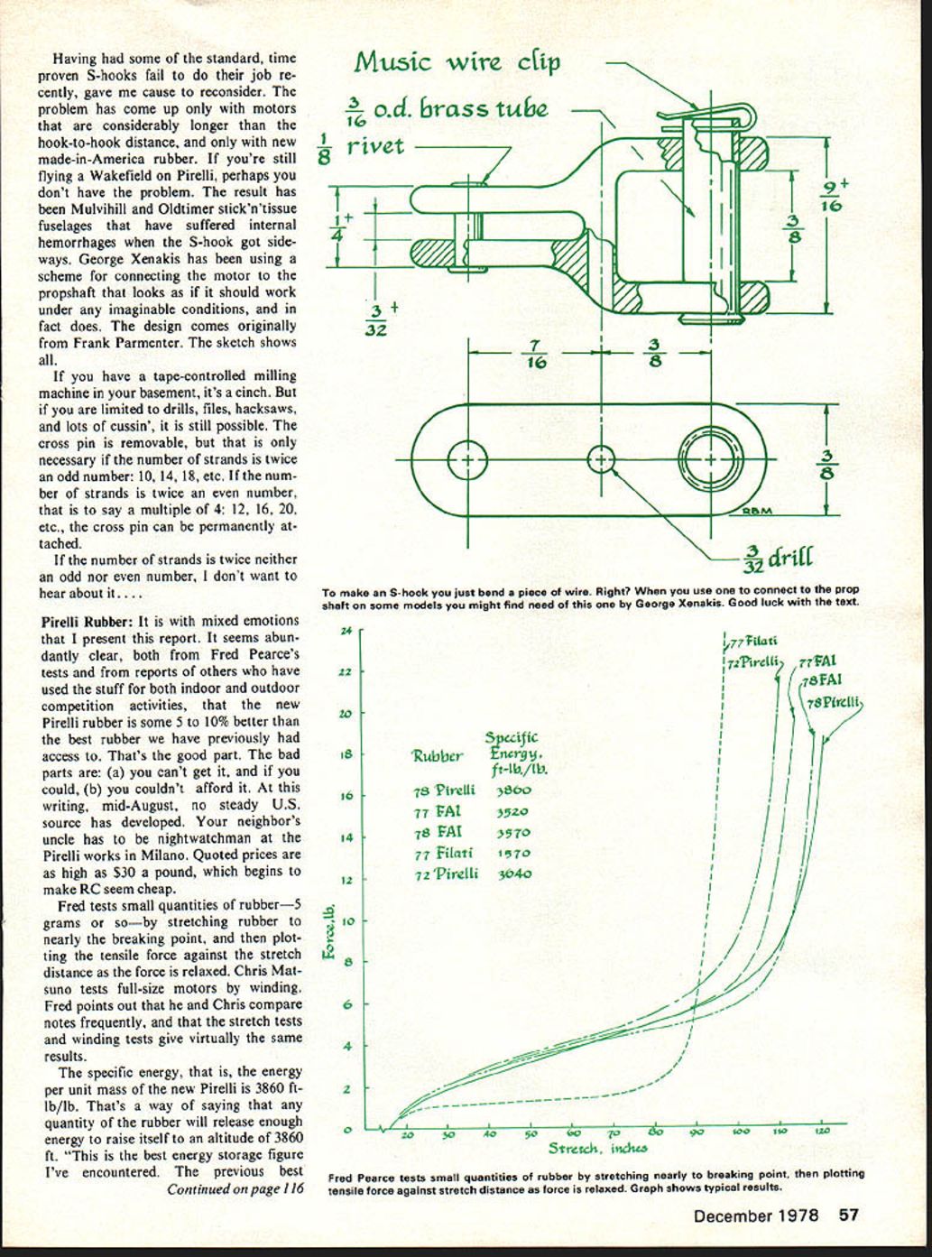 Free Flight. Du ration Bob Meu ser MAGNUM Although semantic im plications small magnum earth shattering Vic Cunnyngham Jr son Jeff have built several magnums various sizes during past four years design scientific models Start Galaxie size suit fancy Add rib bay wing tip Lengthen body stabilizer chord Turn rudder around mount hind stab Fuselage easy-to-build uniform-width construction cheeks added just behind firewall Everything built flat no intentional warps geodetic construction ensures wont unintentional ones either Vic says flies right off draw ing board didnt mention lands Venerable S-Hook Re-Re-Revisited First off lets get nomenclature straight term S-hook has two rather different meanings Free Flight parlance refers situation rubber motor connected directly propshaft Looking propshaft rear S-hook looks like 5 See article No Noncents July 1976 ModAv supposed keep rubber centered doesnt thats getting ahead 71r7- ~7 ==J~= N-, \ 7 IIII mcsm Vc Cunnpt8ham Jr Vic Cunnyngham son Jeff have building Magnums several sizes far past four years story another usage S-hook means whatever sort gadget used connect rubber propshaft Such gad get necessary kind model beefier Peanut Scale Indoor model wound rubber motor discon nected prop olden times simply piece music wire bent look like 5 IZx~ber Lctnd rizznJ - TZz wire tuiin variation old clothspin trick almost filed under dumb ideas before Bob tried biggest advantage Vince Ferrareses pin instant adjustability clamping force 56 Model Aviation P-ju outdoor rubber rapidly increasing popularity Bobs Spookweight 30 grams out rubber Borrows few indoor construction techniques torque controlled auto-stab Dolores Snyder displays little Asteroid rub ber-powered model George Perryman design early Thirtiesbefore George began de signing funny looking ships Roselle plc Having some standard time proven S-hooks fail job re cently gave cause reconsider problem has come up motors considerably longer hook-to-hook distance new made-in-America rubber youre still flying Wakefield Pirelli perhaps dont have problem result has Mulvihill Oldtimer stickntissue fuselages have suffered internal hemorrhages S-hook got side ways George Xenakis has using scheme connecting motor propshaft looks should work under imaginable conditions fact does design comes originally Frank Parmenter sketch shows have tape-controlled milling machine basement its cinch limited drills files hacksaws lots cussin still possible cross pin removable necessary number strands twice odd number 10 14 18 etc num ber strands twice number say multiple 412 16 20 etc cross pin can permanently tached number strands twice neither odd nor number dont want hear about Pirelli Rubber mixed emotions present report seems abun dantly clear both Fred Pearces tests reports others have used stuff both indoor outdoor competition activities new Pirelli rubber some 5 10% better best rubber have previously access Thats good part bad parts cant get could b couldnt afford writing mid-August no steady US source has developed neighbors uncle has nightwatchman Pirelli works Milano Quoted prices high $30 pound begins make RC seem cheap Fred tests small quantities rubber5 grams soby stretching rubber nearly breaking point plot ting tensile force against stretch distance force relaxed Chris Mat suno tests full-size motors winding Fred points out Chris compare notes frequently stretch tests winding tests give virtually same results specific energy energy per unit mass new Pirelli 3860 ft lb/lb Thats way saying quantity rubber will release enough energy raise itself altitude 3860 ft best energy storage figure Ive encountered previous best Continued page 116 Music wire dip % od frciss tt4e 1 rivet jl C 3 32 7 lb ft-Ib/W 3 ( make S-hook just bend piece wire Right use connect prop shaft some models might find need George Xenakis Good luck text 242220iS 4 12 JO 8 6 4 2 0 fr77{Lati 7jPi-di 77A1 T5FAI / II 78 PirelLiI / l70 II I I/ 200400oO0090400 Stretdt in6u6 Fred Pearce tests small quantities rubber stretching nearly breaking point plotting tensile force against stretch distance force relaxed Graph shows typical results 77 1A1 78 FAT 7 Filatt 72 PirelLi December1978 57 3 r 3 140IZO AMA WINGS ME AND MY RC 78 NATS 4 COLOR4 COLOR PERMISSION FROM AMA LUSIVE RIGHTSWhile Last FROM ROYAL CROWN COLA Green color Pattern Pylon Soaring Chopper Free Flight RC Widow Heavenly Sport RC Cherub Ukie Speed Rat Racer Combat Aerobatics choice white 50/50% polyester shirt navy trim $550 Postage FLI CAP 4 Color AMA Wines 5 M L Size Adjustable $550 Postage custom work clubsspecial events businesses Any size color print shirts jackets caps Information sent request FLI * HIRT 5132 DEL REY LAS VEGAS NEVADA 89102 proper balance achieved flying surfaces may glued place Use slow hardening epoxy glue cement wing stab place advisable dowel pin wing fuselage done drilling three 3/16 holes through center section wing about inch fuselage whereupon drilled holes fitted hard wood dowel pins glued place point wing stabilizer filleted fuselage Fiberglass recommended material rear cap strip added top rear fuselage contoured shape fuselage Fabricate rear engine mounting bracket bracket constructed 1/4 3-16 aluminum stock airfoiled shape bracket can mounted ways however suggested methods follows Drill mount ing bracket positions denoted plans 6-32 clearance drill also drill fuselage least center po sition way through bot tom point blind mounting nut pulled place hole has drilled way through body body must hollowed proper place accommodate blind nuts second method drill tap bracket two 6-32 machine screws body drilled way through clearance drill whereupon machine screws run up through fuselage thread bracket second method used record setting air plane equivalent strength method bit easier install pipe retaining clip formed 020 steel stock stainless steel stock Stain less steel stock preferred material because will rust dur able clip fastened bracket 4-40 machine screw Sand entire a