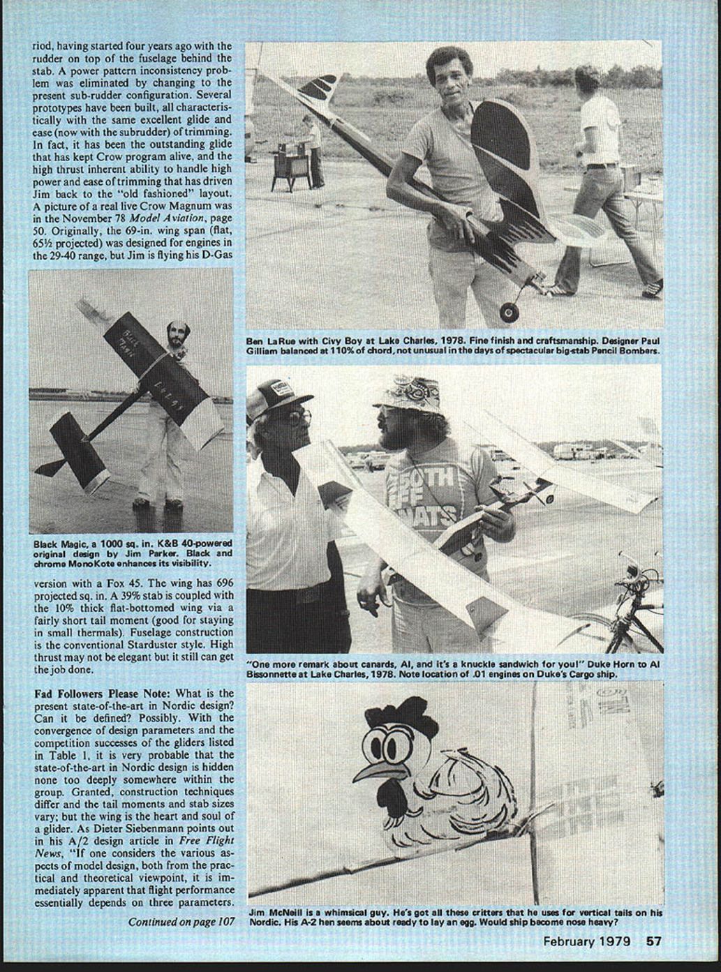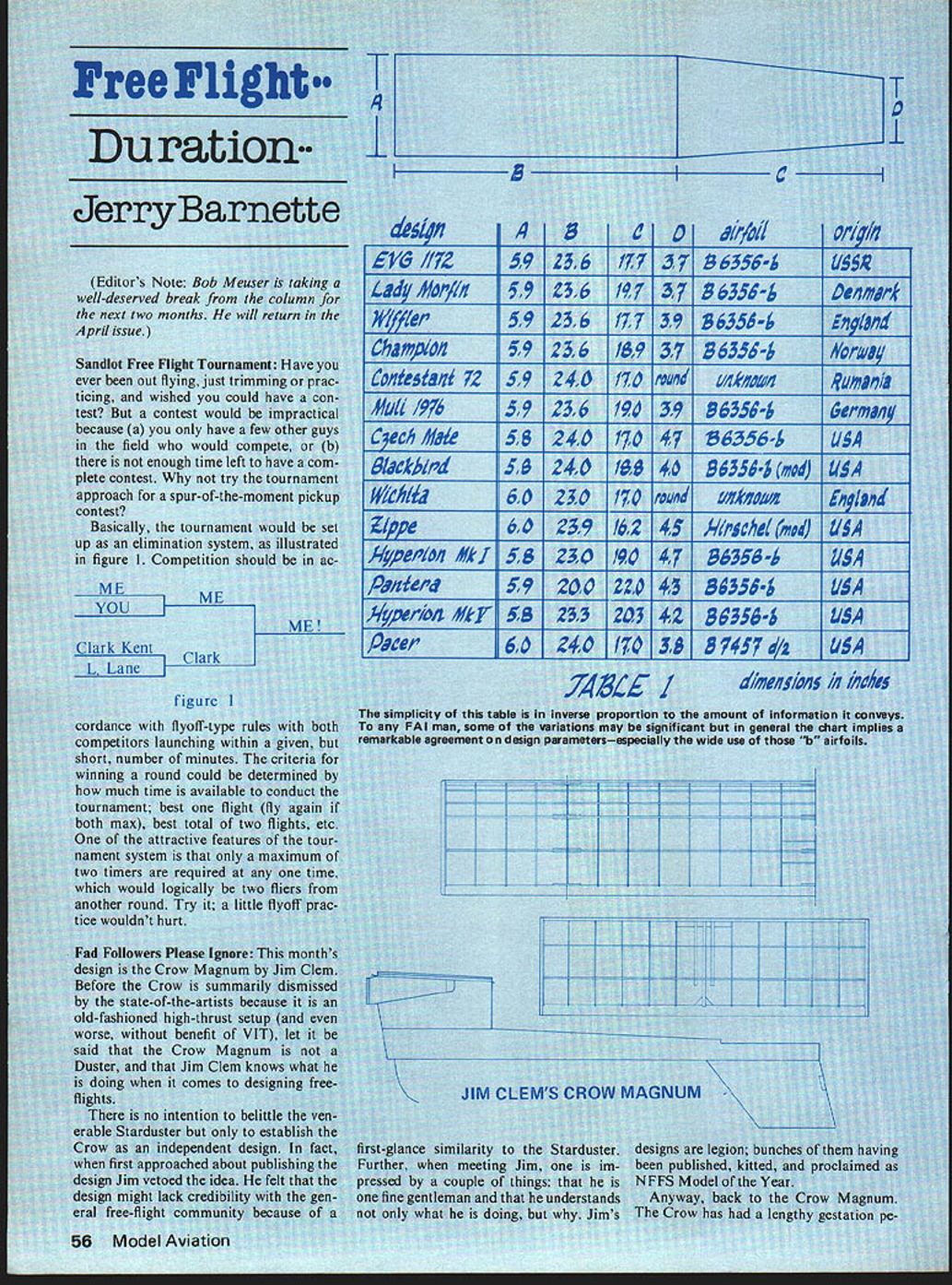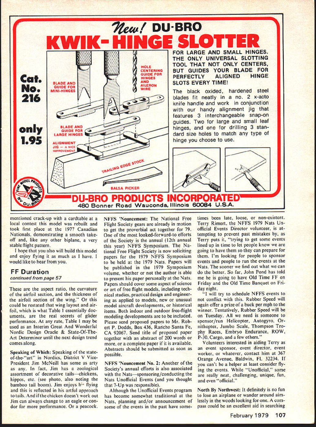Free Dur Jerryl Editors Note -deserved brea next two mon April issue Sandlot Free Fl ever out flyin ticing wished test contest because oni field up eliminam figure 1 Comp ME uIIj Kent dance fly competitors launcnin short number mini winning round c C 4 4 564 7ILi 4 4 57 dz unt mnforn t general use thos4 LII S 5 SA 59 50 6O 6O 5, 5 /arflfl 72 u/k ity tah man some agreement IIIL Liv utstand m aliv -in wix iesigned Jim flyi ossibi aram rob Boy 0% dii 7leaf DUBRO KWIK- HINGIE SLOTTER FOR LARGE AND SMALL HINGES THE ONLY UNIVERSAL SLOTTING TOOL THAT NOT ONLY CENTERS BUT GUIDES YOUR BLADE FOR PERFECTLY ALIGNEDHINGE SLOTS EVERY TIME BLADE AND BLADE AND black oxided hardened steel blades fit neatly no 2 x-acto knife handle work conjunction handy alignment jig features 3 interchangeable snap-on guides Two large small leaf hinges drilling 3 stan dard size holes match type hinge choose use C BALSA PICKER PRODUCTS INCORPORATED Pur 480 Bonner Road Wauconda1 Illinois 60084 USA mentioned crack-up cardtable local contest model rebuilt took first place 1977 Canadian Nationals demonstrating smooth take off like other biplane very stable flight pattern hope also will build model enjoy flying much have would like hear FF Duration continued page 57 aspect ratio curvature airfoil section thickness airfoil section wing could restated wing layout air foil what Table 1 essentially doc uments real secrets glider performance rate Table 1 may used Interim Great Wonderful Nordic Design Oracle & State-Of-TheArt Determiner until next design trend comes along Speaking Which Speaking state of-the-art Nordics District V VicePresident Jim McNeill has some arty fact Jim has zoological assortment decorative tailschickens hippos etc see photo also noting bamboo tail boom Jim enjoys h flying reflected artful approach tails chicken doesnt work out Jim can always change eagle con dor performance peacock NFFS Nouncement National Free Flight Society gears already motion get proverbial act together 79 looked-forward-to efforts Society annual 12th annual year NFFS Symposium Na tional Free Flight Society now soliciting papers 1979 NFFS Symposium held 1979 Nats Papers will published 1979 Symposium volume whether author able present paper personally Nats Papers should cover some aspect science art free flight models including tech nical studies practical design engineer ing applied models new unusual model aircraft developments historical items Both indoor outdoor free-flight modeling developments included Please send proposed papers Mr Rob ert P Dodds Box 436 Rancho Santa Fe CA 92067 Send title proposed paper together abstract 200 words or complete paper available Abstracts should submitted soon possible NFFS Nouncement No 2 Another Societys annual efforts also associated Natssponsoring/conducting Nats Unofficial Events thought 7-Up responsible Although Unofficial Events program has become somewhat traditional Nats planning and/or announcement some events past have sometimes late loose non-existent Terry Rimert NFFS 1979 Nats Un official Events Director volunteer tempting prevent past mistakes Terry puts trying get some events lined up time let people know going have can prepare Im looking people sponsor events people run events Nats sooner find out what can better So far John Pond has told going have Old Time FF Friday Old Time Banquet Fri day night will try schedule NFFS events conflict Rubber Speed will again offer prize buck per mph winner Tentatively Rubber Speed will Tuesday need someone sponsor/run Helicopter Autogyro nithopter Jumbo Scale Thompson Tro phy Races Embryo Endurance ROW P-30 Cargo few others Volunteers interested aiding Terry event sponsor event director event worker whatever contact him 367 Orange Avenue Baldwin FL 32234 cant helper least consider fly ing events Unofficial some really neat challenging unique fun official North Northwest definitely no fun lose airplane wander around aim lessly woods looking com pass could excellent aid searching February 1979 107 r Cat No 216 195 lost model properly used I-lowever compass doesnt much good dont know use As might somewhat embarassing ask structions compass use compet itor some people would rather eat worms ask help wouldnt how-to book nice Well book ex plains very simply some compass tech niques free fighters could use Over simplified fact See dog see cat see dog cat techniques book Expert Map Compass Orienteering Handbook Bjorn Kjellstrom Stackpole Books Bob Meuser 4200 Gregory St Oak land CA 94619 True helical pitch airfoil win-power 2 Blade Tractor 53each 545 35-4304 6364354 74767-8504 84868-8654 98104106854needs 11411-6118Si 12-412-512-65150 2 Blade PusherAT YOUR DEALER 5/ 3 5%4 6-36-4 354 3 Blade Pasher Metallic Aluminum 86885125 96 106 04 5150 Pusher106$150 FF Old Timer/Haught continued page 58 calibrated Flight performance Y & 0 props seems equal other brands although very difficult determine variables considered obtained nostalgic beauties Tom Cope 23262 SE 57th Street Route 3 Issaquab Washington 98027 lists along other items interest oldtimers Diameters range 8 18 pitches 4 8 range Tom tells Y & 0 props also available laminated wood prices right Ive also heard Mark Fechner 4456 W GRISH LARGE WOOD PROPELLERS HARDWOOD too hard minimizes costly plane 3145 So Salt Lake City Utah 84120 stocks Y & 0 props along hard get engine parts Rebuild Engine good original ignition engines getting harder harder find makes good sense get maxi mum life out ones have avail able Fortunately lapped piston cylinder assemblies have long lives exposed excessive dirt grit high-time engines still have good compression long after rest engine no longer serviceable cylinder-piston fit no longer ac ceptable possible have cylinder chrome plated old piston refitted provided engine has removable cyl inder head allowing access machining engine has integral head pretty much stuck common ailment old en gines worn main connecting rod bearings worn main bearings allow crankshaft wobble engine vi b