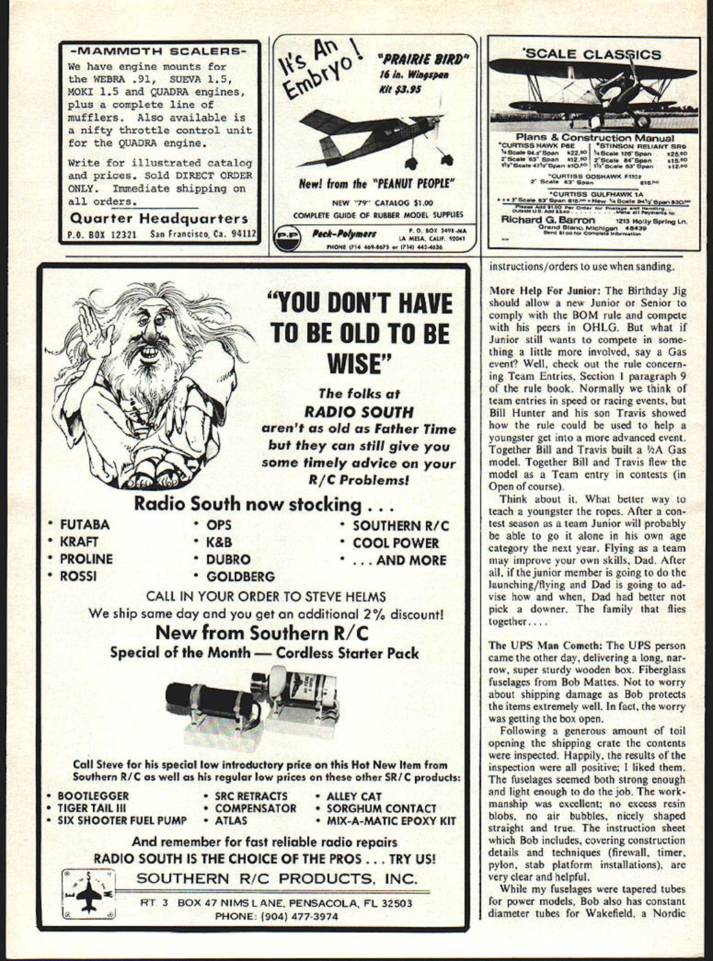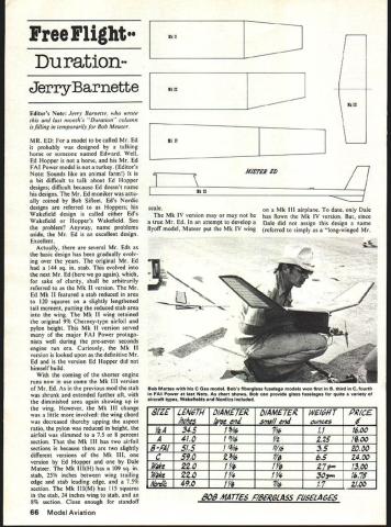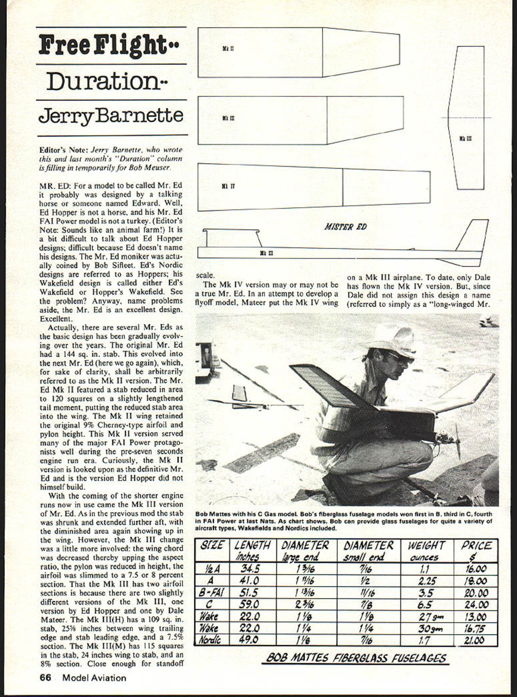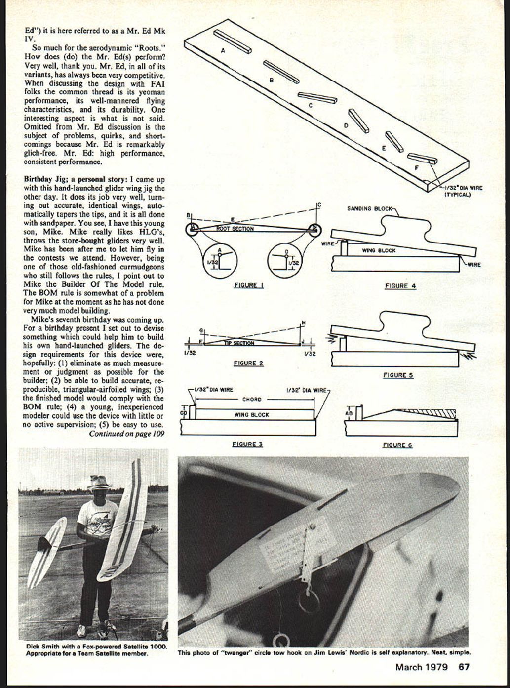 Free Flight Du ration Jerry B rnett e Editors Note Jerry Barnette wrote last months Duration column filling temporarily Bob Meuser MR ED model called Mr Ed probably designed talking horse someone named Edward Well Ed Hopper horse Mr Ed FAI Power model turkey Editors Note Sounds like animal farm bit difficult talk about Ed Hopper designs difficult because Ed doesnt name designs Mr Ed moniker actu ally coined Bob Sifleet Eds Nordic designs referred Hoppers Wakefield design called either Eds Wakefield Hoppers Wakefield See problem Anyway name problems aside Mr Ed excellent design Excellent Actually several Mr Eds basic design has gradually evolv ing over years original Mr Ed 144 sq stab evolved next Mr Ed go again sake clarity shall arbitrarily referred Mk II version Mr Ed Mk II featured stab reduced area 120 squares slightly lengthened tail moment putting reduced stab area wing Mk II wing retained original 9% Cherney-type airfoil pylon height Mk II version served major FAI Power protago nists well during pre-seven seconds engine run era Curiously Mk II version looked upon definitive Mr Ed version Ed Hopper did himself build coming shorter engine runs now use came Mk III version Mr Ed As previous mod stab shrunk extended further aft diminished area again showing up wing However Mk III change little involved wing chord decreased thereby upping aspect ratio pylon reduced height airfoil slimmed 75 8 percent section Mk III has two airfoil sections because two slightly different versions Mk III version Ed Hopper Dale Mateer Mk 111H has 109 sq stab 25/s inches between wing trailing edge stab leading edge 75% section Mk 111M has 115 squares stab 24 inches wing stab 8% section Close enough standoff Uk Ill K Uk III Uk IV jIlIgrER ED Uk III scaleon Mk III airplane date Dale Mk IV version may may behas flown Mk IV version since true Mr Ed attempt develop aDale did assign design name flyoff model Mateer put Mk IV wingreferred simply long-winged Mr SfZELEA1TAIO/AMU$YAMETERWF/6/-ITPs/cE i4c&esjye e4dsm// edowes YzA 345 116 716 ii 1600 410 ff06 225 Ix 8-F4 515 /6 35 2000 C 590 65 2400 Ae220IVe27s1300 7~gke2201150n175 /f/9 7/16 /1 2100 508 *t4TTES F/fA6&ASS PUSELAE5 66 Model Aviation Uk U Bob Mattes C Gas model Bobs fiberglass fuselage models won first B third C fourth FAI Power last Nets As chart shows Bob can provide glass fuselages quite variety aircraft types Wakefields Nordics included Ed referred Mr Ed Mk IV So much aerodynamic Roots does Mr Eds perform Very well thank Mr Ed its variants has always very competitive discussing design FAI folks common thread its yeoman performance its well-mannered flying characteristics its durability interesting aspect what said Omitted Mr Ed discussion subject problems quirks short comings because Mr Ed remarkably glich-free Mr Ed high performance consistent performance Birthday Jig personal story came up hand-launched glider wing jig other day does its job very well turn ing out accurate identical wings auto matically tapers tips done sandpaper see have young son Mike Mike really likes HLGs throws store-bought gliders very well Mike has after let him fly contests attend However being old-fashioned curmudgeons still follows rules point out Mike Builder Model rule BOM rule somewhat problem Mike moment has done very much model building Mikes seventh birthday coming up birthday present set out devise something could help him build own hand-launched gliders de sign requirements device hopefully 1 eliminate much measure ment judgment possible builder 2 able build accurate re producible triangular-airfoiled wings 3 finished model would comply BOM rule 4 young inexperienced modeler could use device little no active supervision 5 easy use Continued page 109 FIGURE H JKc2iU 1/32 FIGURE 2 H/32 OIA WIRE TYPICAL LC ~1 SANDING BLOCK WIRE DWING BLOCK WIRE FIGURE 4 1/32 1 FIGURE 5 I/32DIA WIRE1/32 DIA WIRE CHORD T CfWING BLOCK ABI~ LQELi March 1979 67 Dick Smith Fox-powered Satellite 1000 Appropriate Team Satellite member Thia photo twanger circle tow hook Jim Lewis Nordic self explanatory effort worth box build meets individual needs pre cisely theres another advantage custom-built field box com partments filled before leave flying field acts physical check list everythings havent gotten anything FF Duration continued page 67 Birthday Jig result Birth day Jig opinion does accomplish objectives Moreover Birthday Jig teaches need use appreciation sanding blocks proper tools jigs fixtures very worthwhile additional feature kids really ap preciate humble sanding block nor willing take time fabricate build ing fixtures So construct Birthday Jig own First select appropriate HLG design keeping mind jig gener ates triangular airfoil sections fol lowing discussion will assume wing lay out constant chord center panels tapered tip panels Once basic concept realized design variations can easily accommodated Next layout root center section airfoil illustrated Fig Note 1/32-in blunt leading trailing edges important Now geometry Having drawn perpendicu lars airfoil bottom leading trailing edges now extend top cam ber lines AE DE become AC BD trusty ever accurate ruler now measure lines AB CD Similarly tip scetion extend FK JK become FH GJ measure FG HJ Having gathered suitable board jig able hold jig bays firm flat warpfree 1/32-inch di ameter music wire some wood scraps ready now construct jig self very helpful wing panel blanks exact size used available assumed wing layout would center panels tips will build center wing panel jigbays first jig-bays B sketch Hot Stuff 1/32 diameter music wire edge board very near edge wire should about inch longer length wing panel cut Make sure wire straight Now fairly hard wooden block about same length first wire exactly equal height measured dimension CD thickness very important just strong enough bend during use Hot Stuff 1/32 diameter wire top edge Hot Stuff block/wire assembly board along line would define trailing edge wing panel Refer figure 3 wing pa