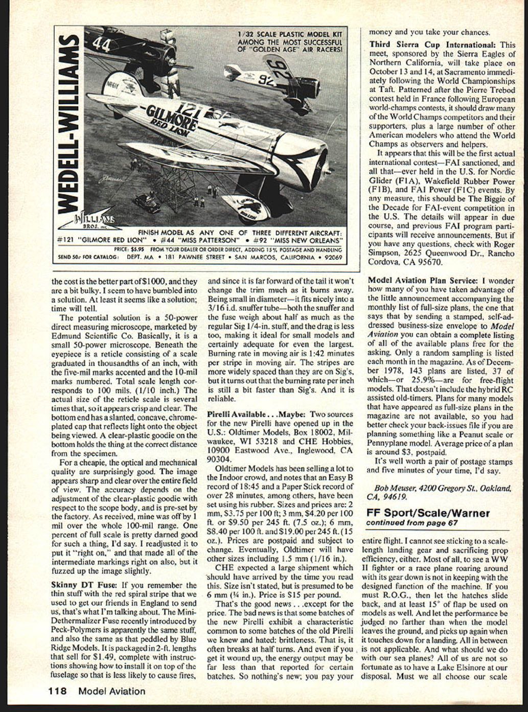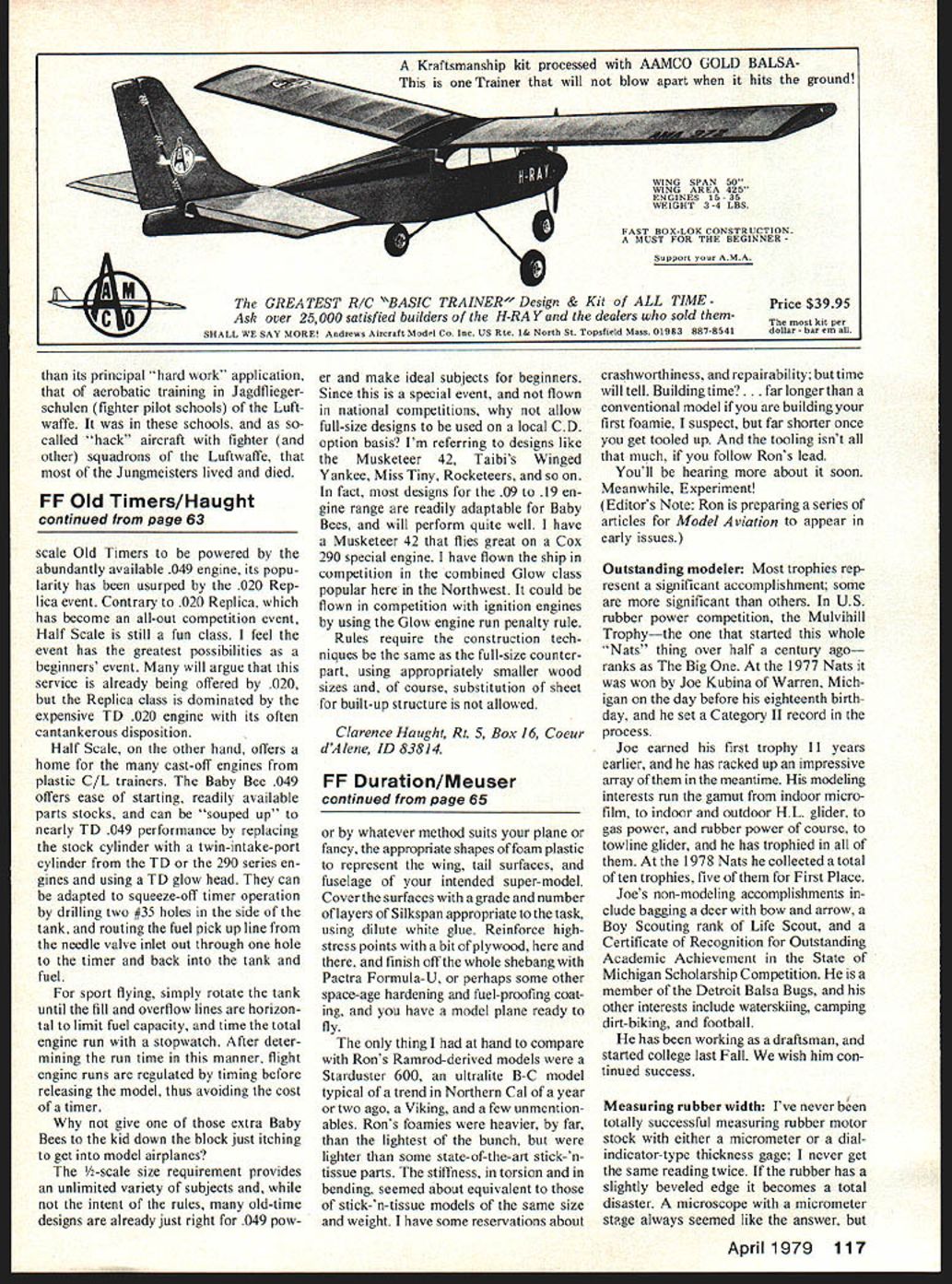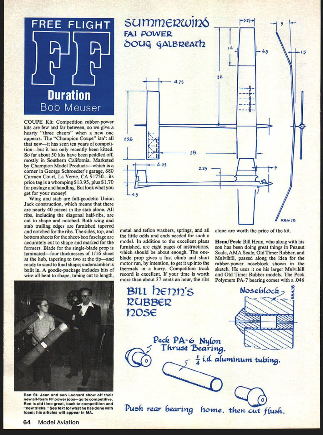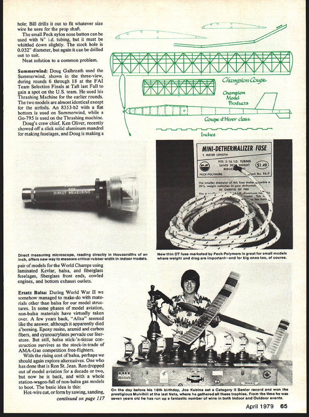 COUPE Kit Competition rubber-power kits few far between give hearty three cheers new appears Champion Coupe isnt newit has seen ten years competi tionbut has recently kitted So far about 50 kits have peddled off mostly Southern California Marketed Champion Model Productswhich corner George Schroedters garage 880 Carmen Court La Verne CA 91750its price tag whomping $1395 plus $170 postage handling look what get money Wing stab full-geodetic Union Jack construction means nearly 40 pieces stab alone ribs including diagonal half-ribs cut shape notched Both wing stab trailing edges furnished tapered notched ribs sides top bottom sheets sheet-box fuselage accurately cut shape marked formers Blade single-blade prop laminatedfour thicknesses 1/16 sheet hub tapering two tipand ready sand final shape undercamber built goodie-package includes bits wire bent shape tubing cut length su mmcQwir26 FAI POWEft bcnaq ALBQEA41 J525 1 ii 4 -f 3 t-J--F -J Fl K Vxi 28 q 425 -45 metal teflon washers springs little odds ends needed such model addition excellent plans furnished eight pages instructions should about enough oneblade prop gives fast climb short motor run intention get up thermals hurry Competition track record excellent time worth about 37 cents hour ribs pitt bEI2t2s Hi --it- jill --It-ii 2255 -I{7i7/ L K5 -H alone worth price kit Henn/Peclc Bill Henn along son has doing great things Peanut Scale AMA Scale Old Timer Rubber Mulvihill passed along idea rubber-power noseblock shown sketch uses larger Mulvihill Old Timer Rubber models Peck Polymers PA-7 bearing comes 046 No5d4od L J2CJB8C1Z 1i2Q5 Pcdz PA- N4on u5t lbearin9 id auninum tubinB Qj15 rear Gearjn9 home c-ut ffus 64 Model Aviation iiori i jean ana SOn eonara SflOW OTT ineir new all-foam FF power jobsquite competitive Ron old time great back competition new tricks See text forwhat has done foam articles will appear MA hole Bill drills out fit whatever size wire uses prop shaft small Peck nylon nose button can used ubing must whittled down slightly stock hole 0032 diameter again can drilled out suit Neat solution common problem Summerwind Doug Galbreath used Summerwind shown three-view during rounds 6 through 18 FAI Team Selection Finals Taft last Fall gain spot US team used Thrashing Machine earlier rounds two models almost identical except airfoils An 8353-b2 flat bottom used Summerwind Go-795 used Thrashing machine Dougs crew chief Ken Oliver recently showed off slick solid aluminum mandrel making fuselages Doug making - Ir--- ~jiT7fl7r2zz= G. _ - i/Kr T XII Clizmp ion cZuje roducts F -i---i-Indies Coupe dHjver class Direct measuring microscope reading directly thousandths inch offers new way measure critical rubber width Indoor models pair models World Champs using laminated Kevlar balsa fiberglass fuselages fiberglass front ends cowled engines bottom exhaust outlets Ersatz Balsa During World War II somehow managed make-do mate rials other balsa model struc tures some phases model aviation non-balsa materials have virtually taken over few years back Allsa seemed like answer although apparently died aborning Epoxy resins aramid carbon fibers cyanoacrylates pervade liter ature still balsa stick-n-tissue con struction survives stock-in-trade AMA-Gas competition free-fighters rising cost balsa perhaps should again explore alternatives has done Ron St Jean Ron dropped out model aviation decade two now back whole station-wagon-full non-balsa gas models boot basic idea Hot-wire cut form sawing sanding continued page 117 April 1979 65 New thin DT fuse marketed Peck-Polymers great small models weight drag importantand big ones too course day before 18th bIrthday Joe Kubina set Category II Senior record won prestigious Mulvihill last Nats gathered trophies time seven years old has run up fantastic number wins both Indoor Outdoor events its principal hard work application acrobatic training Jagdflieger schulen fighter pilot schools Luft waffe schools socalled hack aircraft fighter other squadrons Luftwaffe Jungmeisters lived died FF Old Timers/Haught continued page 63 scale Old Timers powered abundantly available 049 engine its popu larity has usurped 020 Rep lica event Contrary 020 Replica has become all-out competition event Half Scale still fun class feel event has greatest possibilities beginners event will argue service already being offered 020 Replica class dominated expensive TD 020 engine its often cantankerous disposition Half Scale other hand offers home cast-off engines plastic C/L trainers Baby Bee 049 offers ease starting readily available parts stocks can souped up nearly TD 049 performance replacing stock cylinder twin-intake-port cylinder TD 290 series en gines using ID glow head can adapted squeeze-off timer operation drilling two #35 holes side tank routing fuel pick up line needle valve inlet out through hole timer back tank fuel sport flying simply rotate tank until fill overflow lines horizon tal limit fuel capacity time total engine run stopwatch After deter mining run time manner flight engine runs regulated timing before releasing model thus avoiding cost timer give extra Baby Bees kid down block just itching get model airplanes -scale size requirement provides unlimited variety subjects intent rules old-time designs already just right 049 power make ideal subjects beginners Since special event flown national competitions allow full-size designs used local CD option basis Im referring designs like Musketeer 42 Taibis Winged Yankee Miss Tiny Rocketeers fact designs 09 19 en gine range readily adaptable Baby Bees will perform quite well have Musketeer 42 flies great Cox 290 special engine have flown ship competition combined Glow class popular Northwest could flown competition ignition engines using Glow engine run penalty rule Rules require construction tech niques same full-size counter part using appropriately smaller wood sizes course substitution sheet built-up structure allowed Clarence Haught Rt 5 Box 16 Coeur dAlene ID 