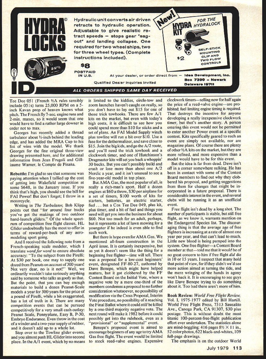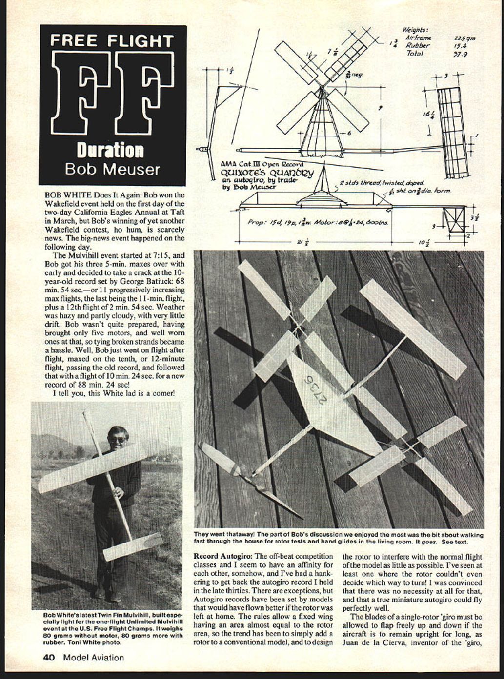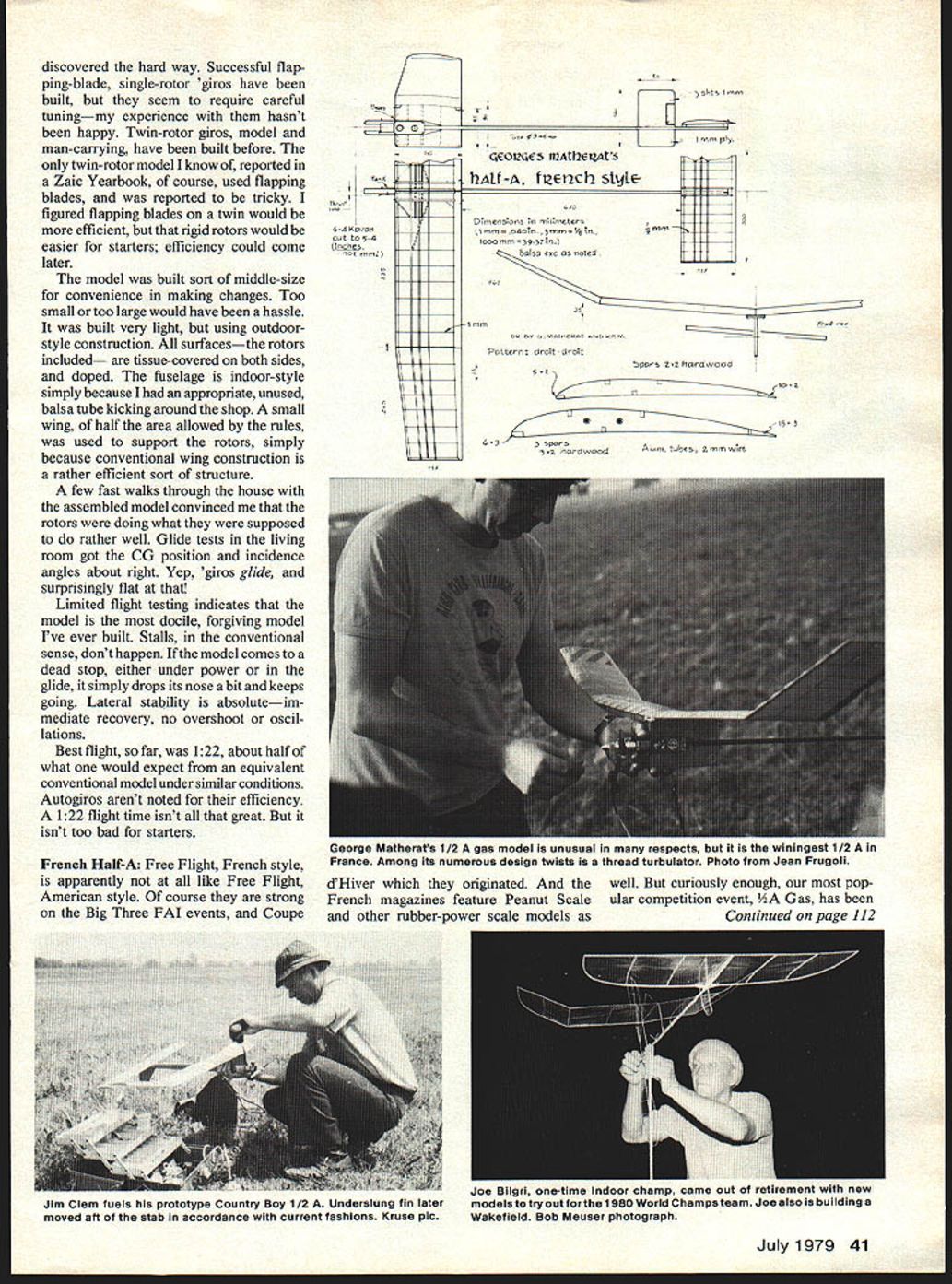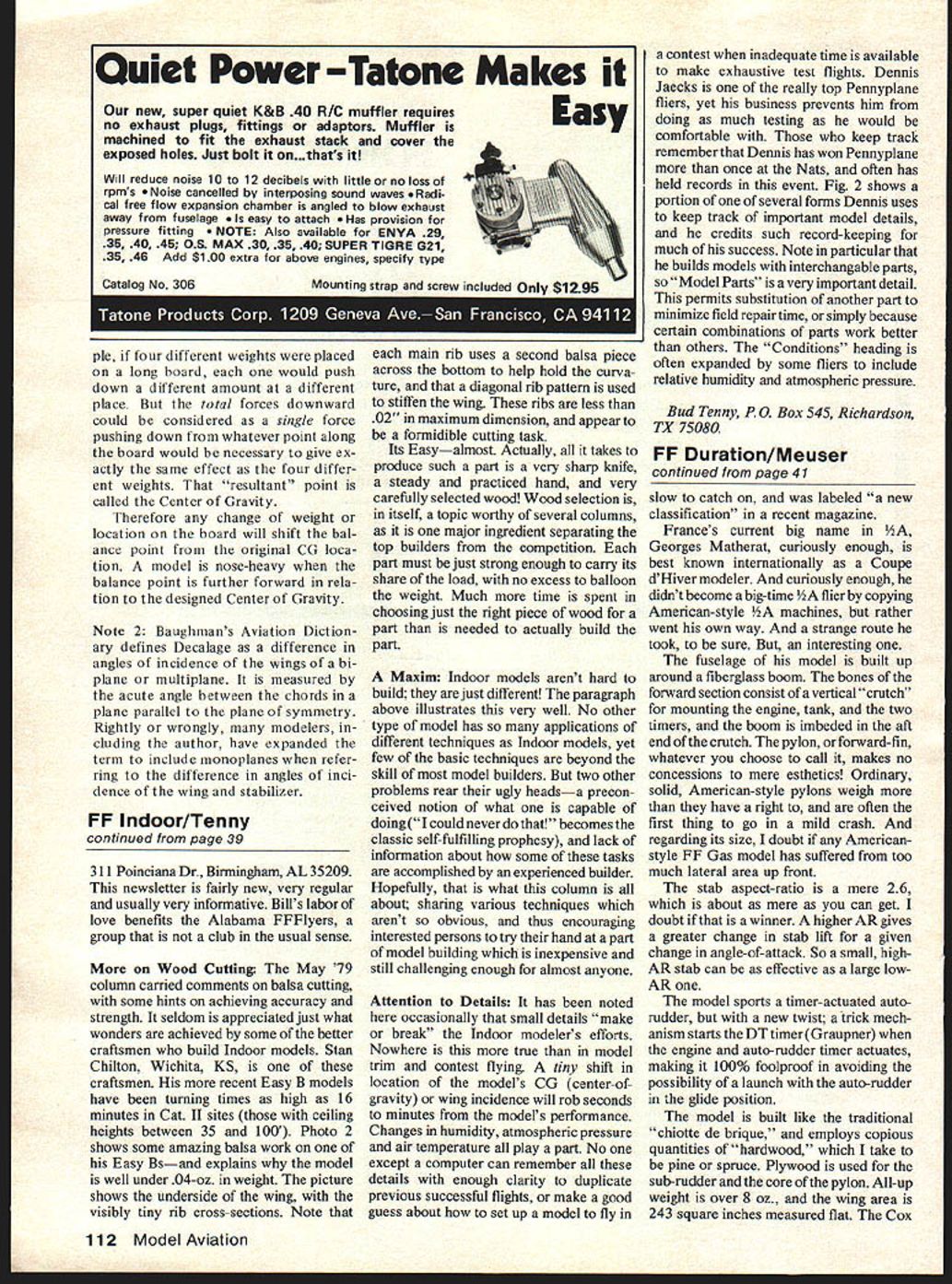 BOB WHITE Does Again Bob won Wakefield event held first day two-day California Eagles Annual Taft March Bobs winning yet another Wakefield contest ho hum scarcely news big-news event happened following day Mulvihill event started 715 Bob got three 5-mm maxes over early decided take crack 10year-old record set George Batiuck 68 mm 54 secor 11 progressively increasing max flights last being 11 -mm flight plus 12th flight 2 mm 54 sec Weather hazy partly cloudy very little drift Bob wasnt quite prepared having brought five motors well worn ones tying broken strands became hassle Well Bob just went flight after flight maxed tenth 12-minute flight passing old record followed flight 10 mm 24 sec new record 88 mm 24 sec tell White lad comer Record Autogiro off-beat competition classes seem have affinity other somehow Ive hank ering get back autogiro record held late thirties exceptions Autogiro records have set models would have flown better rotor left home rules allow fixed wing having area almost equal rotor area trend has simply add rotor conventional model design * 22% m /24 p79 -Wi4 I rotor interfere normal flight model little possible Ive seen least rotor couldnt decide way turn convinced no necessity that true miniature autogiro could fly perfectly well blades single-rotor giro must allowed flap freely up down aircraft remain upright long Juan de la Cierva inventor giro 40 Model Aviation 4 L S N p 7j6 AMA Ccffl Opcn ecord QU1XOt6 QUAt2 bQY4K aukoglro bj trade-2 sg5ds threoa twiiea aEoed bi fiob Mti*rshi onJda farm 11 Weiqhks Air/rome Rubber Total Prop /5 /9p 4s Motor 24 bs 9 10 went thataway part Bobs discussion enjoyed bit about walking fast through house rotor tests hand glides living room goes See text coo vv I1ILu win run wi uvn uu iii daily light forthe one-flight Unlimited Mulvihill event US Free Flight Champs weighs 80 grams motor 80 grams rubber Toni White photo discovered hard way Successful flap ping-blade single-rotor giros have built seem require careful tuningmy experience hasnt happy Twin-rotor giros model man-carrying have built before twin-rotor model know reported Zaic Yearbook course used flapping blades reported tricky figured flapping blades twin would efficient rigid rotors would easier starters efficiency could come later model built sort middle-size convenience making changes Too small too large would have hassle built very light using outdoorstyle construction surfacesthe rotors included tissue-covered both sides doped fuselage indoor-style simply because appropriate unused balsa tube kicking around shop small wing half area allowed rules used support rotors simply because conventional wing construction rather efficient sort structure few fast walks through house assembled model convinced rotors doing what supposed rather well Glide tests living room got CG position incidence angles about right Yep giros glide surprisingly flat Limited flight testing indicates model docile forgiving model Ive ever built Stalls conventional sense dont happen model comes dead stop either under power glide simply drops its nose bit keeps going Lateral stability absoluteim mediate recovery no overshoot oscil lations Best flight far 122 about half what would expect equivalent conventional model under similar conditions Autogiros arent noted efficiency 122 flight time isnt great isnt too bad starters French Half-A Free Flight French style apparently like Free Flight American style course strong Big Three FAL events Coupe -a ROlnrl Cut 205-4 V 00 5stS 0101 GOtiES fl2AtbC14tS f-A tizench stjte IF Dmeosors n nflnnvers1 l 01muo4O1130101&/45I-00c noted 01111Pottero or-oW Oroit 5pars Z2 iorowood S0 Spars 3ku-dooood tubeS 2 02000Cr-S dHiver originated well curiously enough pop French magazines feature Peanut Scale ular competition event Gas has other rubber-power scale models Continued page 112 July1979 41 George Matherats 1/2 gas model unusual respects winingest 1/2 France Among Its numerous design twists thread turbulator Photo Jean Frugoli Jim Clem fuels prototype Country Boy 1/2 Underslung fin later moved aft stab accordance current fashions Kruse plc Joe Bilgri one-time Indoor champ came out retirement new models try outforthe 1980 World Champs team Joe also building Wakefield Bob Meuser photograph Quiet Power -Tatone Makes Easy new super quiet K&B 40 R/C muffler requires no exhaust plugs fittings adaptors Muffler machined fit exhaust stack cover exposed holes Just bolt on.thats Will reduce noise 10 12 decibels little no loss rpms Noise cancelled interposing sound waves eRadi cal free flow expansion chamber angled blow exhaust away fuselage attach provision pressure fitting Also available ENVA 29 35 40 45 OS MAX 30 35 40 SUPER TIGRE G21 35 46 Add $100 extra above engines specify type pie four different weights placed long board would push down different amount different place total forces downward could considered single force pushing down whatever point along board would necessary give ex actly same effect four differ ent weights resultant point called Center Gravity Therefore change weight location board will shift bal ance point original CU loca tion model nose-heavy balance point further forward rela tion designed Center Gravity Note 2 Baughmans Aviation Diction ary defines Decalage difference angles incidence wings bi plane multiplane measured acute angle between chords plane parallel plane symmetry Rightly wrongly modelers cluding author have expanded term include monoplanes refer ring difference angles inci dence wing stabilizer FF Indoor/Tenny continued page 39 311 Poinciana Dr Birmingham AL 35209 newsletter fairly new very regular usually very informative Bills labor love benefits Alabama FFFlyers group club usual sense Wood Cutting May 79 column carried comments balsa cutting some hints achieving accuracy strength seldom appreciated just what wonders achieved some better craftsmen build Indoor models Stan Chilton Wichita KS craftsmen recent Easy B models have turning times high 1