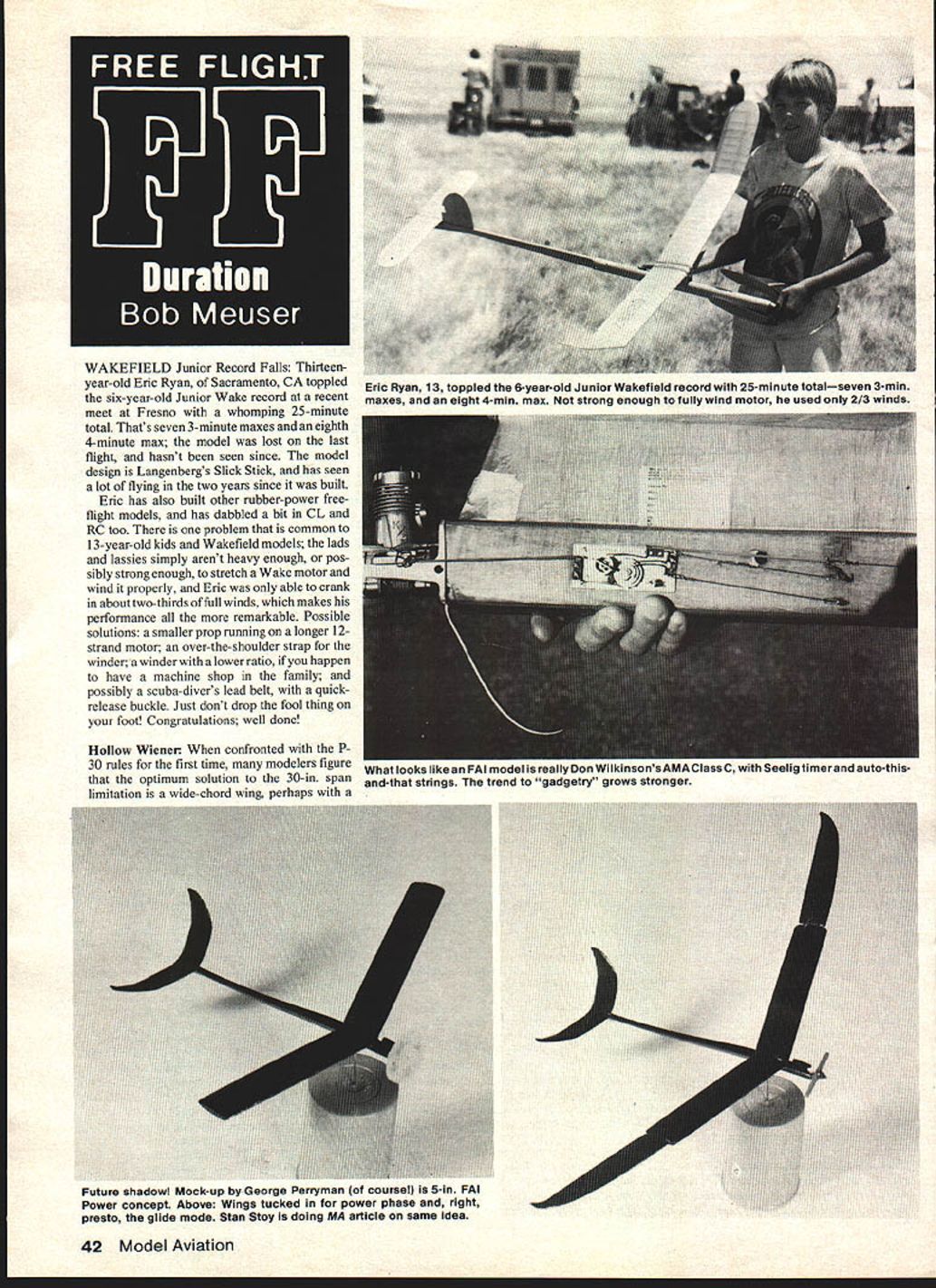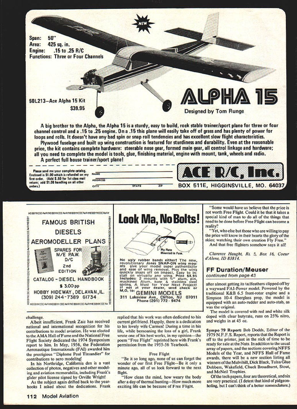 WAKEFIELD Junior Record Falls Thirteenyear-old Eric Ryan Sacramento CA toppled six-year-old Junior Wake record recent meet Fresno whomping 25-minute total Thats seven 3-minute maxes eighth 4-minute max model lost last flight hasnt seen since model design Langenbergs Slick Stick has seen lot flying two years since built Eric has also built other rubber-power freeflight models has dabbled bit CL RC too problem common 13-year-old kids Wakefield models lads lassies simply arent heavy enough pos sibly strong enough stretch Wake motor wind properly Eric able crank about two-thirds full winds makes performance remarkable Possible solutions smaller prop running longer 12strand motor over-the-shoulder strap winder winder lower ratio happen have machine shop family possibly scuba-divers lead belt quickrelease buckle Just dont drop fool thing foot Congratulations well done Future shadow Mock-up George Perryman course 5-in PAl Power concept Above Wings tucked power phase right presto glide mode Stan Stoy doing MA article same Idea 42 Model Aviation Eric Ryan 13 toppled 6-year-old Junior Wakefield record 25-minute totalseven 3-mm maxes eight 4-mm max strong enough fully wind motor used 2/3 winds Hollow Wiener confronted P 30 rules first time modelers figure What looks del re Don InsonsAMALIass U witn eeiig timerano auxo-tnis optimum solution 30-in span and-that strings trend gadgetry grows stronger limitation wide-chord wine nerhans highly cambered airfoil doesnt seem work unless never fly anything dead calm b also have model conventional proportions flying average weather model went through several develop mental stages too traumatic relate before configuration shown drawing evolved during about thing wasnt changed wing chord bit nanower five-section wing wasnt quite planned way worked out well building another Id just way eliminates usually weak center dihedral joint permits grading woodharder wood inner panels lighter stuff nid panels still lighter tip sections model flown novice outdoor flying therefore capable handling launch less-than-perfect angle wind part reason pylon greaterthan-normal dihedral model gets up side-down does once awhile rolls normal flight attitude little loss altitude similar model less dihedral threepanel wing has proved far less forgiving First time out two test flights model maxed twice won second time US Free Flight Champsit maxed out winning Junior event topping win ning Senior Open scores too shabby starters Tn-Folders August issue des cribed folding-wing Indoor Hand-Launch Gliders developed Stoy boys Mike Stan successful assault Cate gory II record Stan Well did again broke own record four times recent Fourth Annual NIMAS Record Trials West Baden Final score 82-sec best flight 77-sec backup flight Brother Mikes model suffered crash re quiring extensive repairs performance indicated has what takes top Ron Whittmans Cat III record time will tell Another Record GYSOB Although Ed Bellingers GYSOB design now some ten years old keeps winning setting records model shown front-end close-up earned Category III Open-Class C Gas record Donald Wilkinson Ozark Alabama Gathering Turkeys meet Pensacola Continued page 112 dre ddn 4 44 16 52 3232 ~ht2a 6 1W 31 2 cUier2el2 Built fknvti b A4ar A4eucr t2 Dcsttei b &b AkuMr apc 57 First ilaxJr hkjhtimJrSE-Oaen Po Class USFrec trt Chamvst979 22j 332 auilinc ~nbs 32 - October1979 43 12 So think clever dude Meet 1 2-yearold Jeanine Andrews Cat II record holding girothe GyreRate Drawing gives details ----6 -cxi1Jean Ancfrew5 K 8 ---3 Outlines L 11o 5 1 3 K - in]V3 ri/i Pace/ic prop 6- bry QutdoorAutogiro Current Open Sr AMA record5 Cat 1&-2 CatI Jr I2&3 K tip vz&zout left rudder IL 4 Z12E hoLLow -v 4 3 175% sheet orm F Designed Tom Runge big brother Alpha Alpha 15 isa sturdy easy build rock stable trainer/sport plane three four channel control 15 25 engine 15 plane will easily take off grass has plenty power loops rolls doesnt have bad spin snap roll tendencies has excellent slow flight characteristics Plywood fuselage built up wing construction featured sturdiness durability reasonable price kit contains complete hardware steerable nose gear formed main gear control linkage hardware need complete model tools glue finishing material engine mount tank wheels radio perfect full house trainer/sport plane________________________________________________ Please send complete mtalog first order Add S50 1st clam mail[AF /j 1311 Enclosed S1OO refunded NAME rEturn add S1U handling ottierADDRESS NOESyHIOEAWAyHO55YHI5SAWAYH555YMIDEAWAYHO5BYHT5EAWAY FAMOUS BRITiSH DIESELS AEROMODELLER PLANS ES FOF M/E PAW D/C 2nd EDITION CATALOG-DIESEL HANDBOVI flOpp HOBBY HIDEWAYDELAVANIL 244-7389 61734 HoBByHTsEAwAyHOBBYHrDEAwAYSO55YNIDEAWAYI-I555YHI5EAW challenge Albeit insufficient Frank Zaic has received national international recognition contributions model aviation elected AMA Hall ofFanse National Free Flight Society dedicated 1974 Symposium report him May 1956 Federation Aeronautique Internationale FAI awarded him prestigious Diplome Paul Tissandier contributions aero modeling Northridge California den vast collection photos negatives other model ing aviation memorabilia including Franks glider pilot license signed Orville Wright As subject again drifted back yearbooks asked about dedications Frank Ply Plate Mounted Fuse No ugly rubber bands either new revolutionary Jones SNAP-ON wing mou nts give model super authenticity ease wing removal Plus wing quickly snaps off impact Easy stall virtually wing Price $895 Includes 2 mounts 1/4w alum pin machined Alum base & stainless steel spring Must Next Projectl dealer send check MO GEMINI MODELS 311 Lakeview Ave Clifton NJ 07011 Phone 201 772- 9474 replied work often dedicated current girl friend Happily dedication lovely wife Carmen During time life bemoaning loss girl Frank wrote best works opinionthe poem Free Flight reprinted Franks permission 1955-56 Yearbook Free Flight long ago us can forget wonder first Free Flig