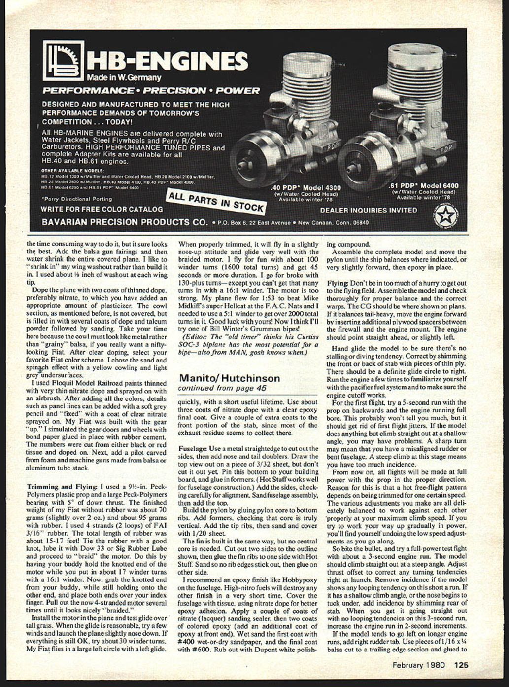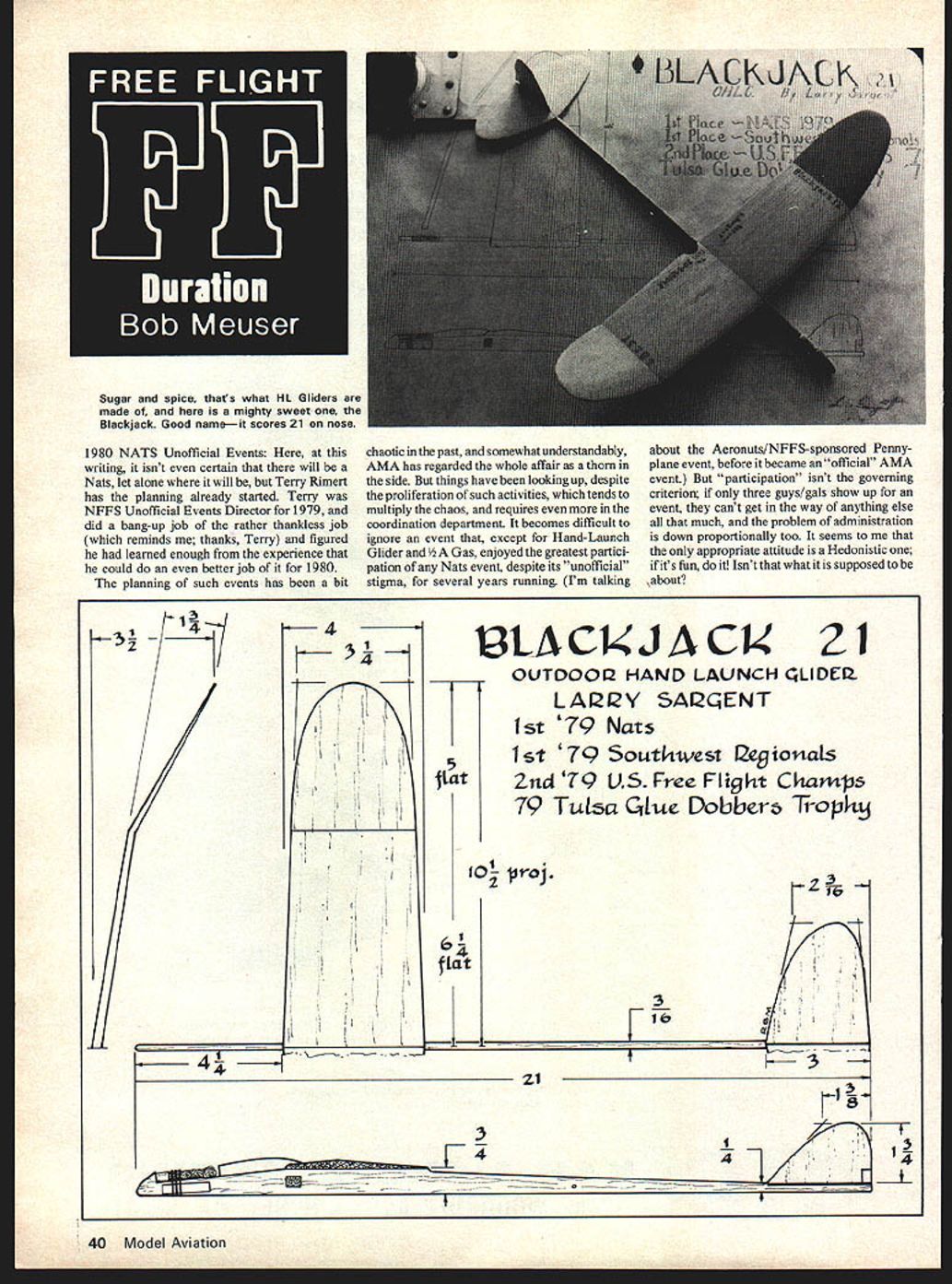 1980 NATS Unofficial Events writing isnt certain will Nats let alone will Terry Rimert has planning already started Terry NFFS Unofficial Events Director 1979 did bang-up job rather thankless job reminds thanks Terry figured learned enough experience could better job 1980 planning such events has bit chaotic past somewhat understandably AMA has regarded whole affair thorn side things have looking up despite proliferation such activities tends multiply chaos requires coordination department becomes difficult ignore event except Hand-Launch Glider 14 Gas enjoyed greatest partici pation Nats event despite its unofficial stigma several years running Im talking about Aeronuts/NFFS-sponsored Pennyplane event before itbecame anofficial AMA event participation isnt governing criterion three guys/gals show up event cant get way anything else much problem administration down proportionally too seems appropriate attitude Hedonistic its fun Isnt what supposed \about 13tACF4J C14 21 OUTDOOI2 HAND LAUNCH LIDCI2 LAJ2I2Y SAENT 1st 79 Nats ls$ 79 Sout-twcsr I2e8ionaLs ZndTQ L5FreeFIit Ckamp5 79 TuLci Qlue Dobixr Tropktj IO jiraj vz 3 z1 r-1 II -- 0 40 Model Aviation Sugar spice thats what HI Gliders made hare mighty sweet Blackjack Good nameit scares 21 nose -3j 4 4 5 fLat f[at 4 neat DT-fuse installation picture left parts shown right assembly left Typical installation shown pic right Bob says can make UD bunch little time takes make iuss Marnie Bobs aranddauohter chaos becomes unnecessarily intensified some club announces some six weeks before Nats going sponsor some event Chances knew going sponsor some months calendar just sort slipped away announced time event conflicted another unofficial event several official ones also turns out another club planning sponsor save event No kidding happens Part Terrys goal have competitions official AMA events official Nats menu addition course will some traditional unofficial events such Embryo Endurance RubberPower Speed wonder AMA will get around following its own rule about being improper have events official AMA events official Nats menu digress thats going Nats seems conflict inevitable minimize requires coordination thats what Terry trying takes effort also time So squid effect part Terrys Early Warning System Anyone wishing willing sponsor Nats unofficial event should contact him soon possible no kidding address 367 Orange Ave Baldwin Florida 32234 wonder should mention Terry Milpitas Twang-Hook Tweekers thinking about sponsoring unofficial event R 0 W electric-power canard-biplane-ornithopters Oh well theres plenty time Look Ma No Ribs Did waste youth naught whittling ribs could have wasted something far important such gluing stick stick B Hm waste no time solution hand present first time anywhere entire universe Meuser Un-Patented Ribless Con struction Technique Now youre awed half death lets get dont consider chunk 1/16-sq proper rib stretch imagination insofar outdoor free-flight technology con cerned indoor-type sliced rib also ranks pretty close ground zero totem pole sophistication So term ribless seems ap propriate Now believe fancy tables airfoil-section coordinates really mean whole lot relation free-flight model aviation going have little problem what follows After have plotted few dozen airfoil sections built few hundred wings might dawn you real sharp covering between ribs does whatever wants regardless ofwhatthe ribs either side tell solution carefully constructed sheet-balsa covered surfaces both windtunnel tests half-century competition experience have shown such slick airfoils really arent great Multi-spar construction will beat suede-shoe slick-surface lads field battle super-slick sheeted surfaces usually benefit being crummied up turbulators bottom surfacedetermines kind stick required replace rib bottom flat use square stock preferably rectangular stock edge bottom undercambered use indoor-style sliced ribs After size shape non-ribs has determined spars simply sit top non-ribs determine shape top surface simple straight wing stab standard-size strips will usually adequate two spars wing stab tapered might find necessary strip spars sheet stock Center sections tips dihedral breaks present minor problem easily solved tips simply scab piece oversize sheet stock after glue has set trim sand shape center sections dihedral breaks fill between spars sheet-balsa scraps Let stick up above desired level trim sand proper height afterwards Neat DT Some FFers like put DT fuses aft end model some like closer home closer CG wont bore prejudiced list pros cons suggest try both ways decide Now have decided forwardmounted fuse read photos show set-up has paid off dozen models Make up half-dozen crack installation onto model takes about minute parts shown right side first photo Punch hole bit 1/64 plywoodor 1/32 think can stand additional 01 grams using paper punch Cut off piece -OD aluminum tubing about half inch long rolling under knife blade course two -in lengths 9/32-in OD tubing Short lengths tubing tend skoonch out shape knife-cut helps stick piece dowel smaller tubing inside cutting worse straighten out pushing over centerpunch other tapered object Bend glass-headed pin shape shown go out buy glass-headed pins local department store dont settle plasticContinued page 122 February 1980 41 Dontlook nowbutthe bustle back forguys aswell gals isa nanaywalst-packsurvlval kltTrom JImurocket llepllcastnatnolastne miscellany wont fit pockets Handy says Bob Appeals ye Ed tooreal marvey pipes tobaccol Survival Kit guess could call rump pack belly pack depending whether facing north south put great carrying odds ends camera binoculars liquid refreshments compass DT fuse extra rubber bands perhaps spare pastrami sandwich snake-bite kit etc Stuff would like have close hand too bulky fit pockets Flip around front get stuff out flip behind will out way rye using decades got ski shoppe years ago Shops specializing rockclimbing back-packing sometimes have too now ma