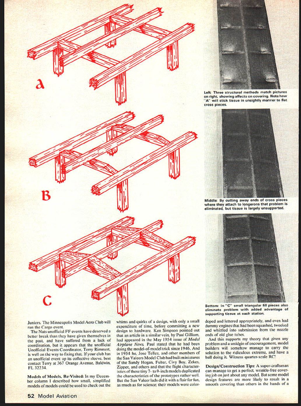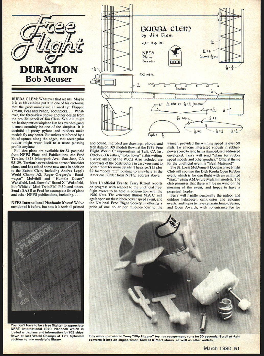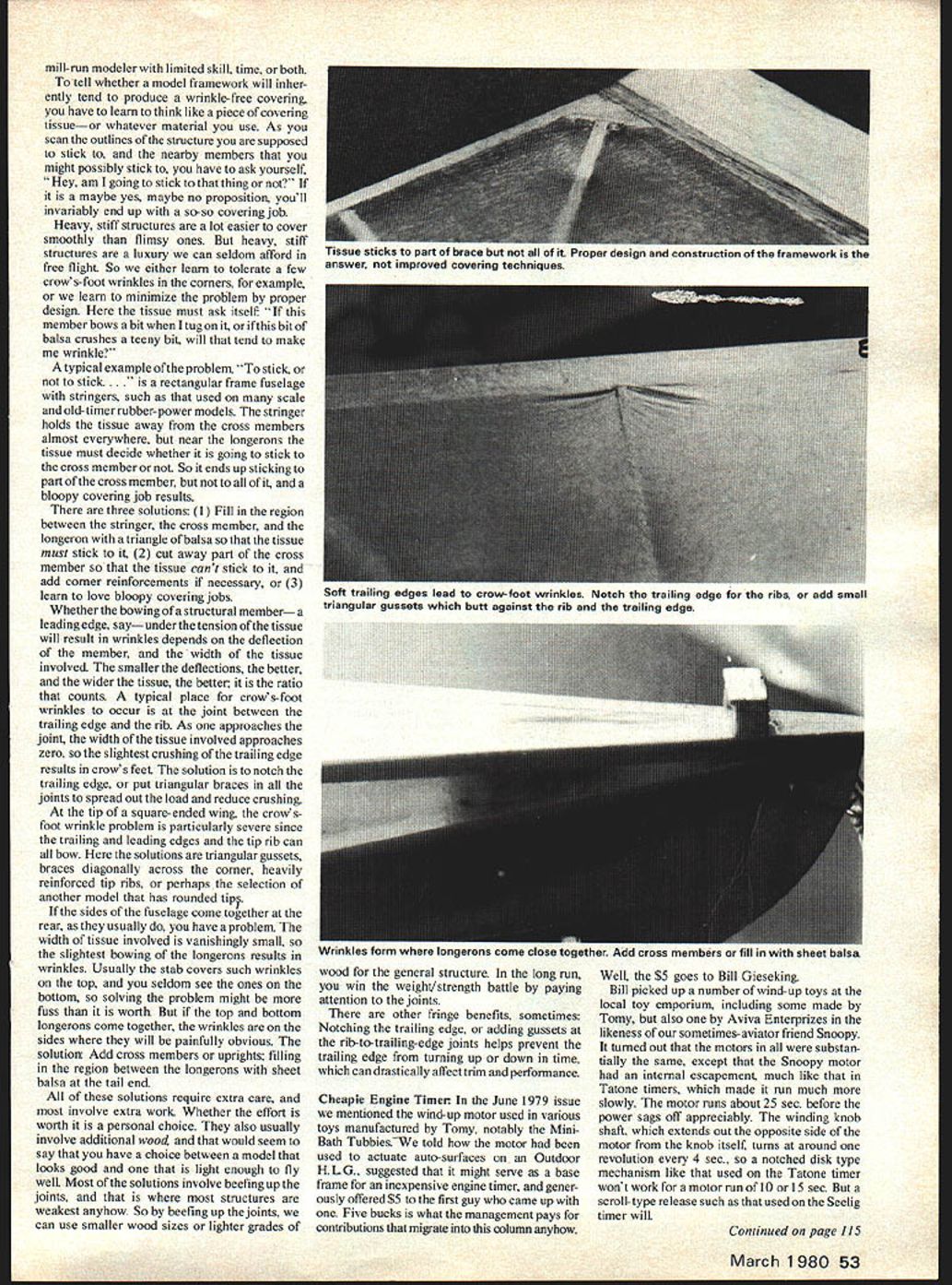 DURATION Bob Meuser BUBBA CLEM Whatever means Maybe Nakashima put cartoons good names used up Flapped Cream Peas Punch Toothpicks.. What ever three-view shows another design prolific pencil Jim Clem might prettiest airplane Jim has ever designed must certainly simplest doubtful pretty pylons rudders make models fly better unless reinforced bit spruce along edges rectangular rudder might wear itself pleasing profile anyhow Full-size plans available $4 postpaid NFFS Plans Publications c/n Fred Terzian 4858 Moorpark Ave San Jose CA 95129 Terzian has weeded out some older plans has added some new ones addition Bubba Clem including Andres Lepps World Champ A2 Roger Gregorys Band wagon Mulvihill Humble Duster Wakefield Jack BrownsBrand X Wakefield Bob Whites Mini-Twin Fin P-30 others Send SASE Fred complete list plans other NFFS publications including . NFFS International Planboole Its out Weve mentioned before now real printed K 13U138A cLEni2 bj Jim Clem 234 sq NFFS Plans Ser v ie sq S1xsrs I 82 C 78Y 0Z6810IZ Inches IIii 5ht e 7I 2 lb sq,-j sq 5II Tiplet bound Included drawings photos tech data 109 models flown 1979 Free Flight World Championships Taft CA last October rather flown writing week ahead WC Also included addresses contributors case want pester details price $15 plus $2 book rate postage anywhere Americas Order NFFS address above Nats Unofficial Events Terry Rimert reports progress respect unofficial freeflight events held conjunction 1980 Nats venerable Illinois MAC will again sponsor rubber-power speed event National Free Flight Society offering prize dollar per mile-per-hour winner provided winning speed over 50 mph anyone interested enough rubberpower speedto send him stamped self-addressed enveloped Terry will send plans rubber speed models other goodies Official theme unofficial event Beat Matsuno St Louis McDonnell-Douglas Free Flight Club will sponsor Dick Korda Open Rubber event flight unlimited max using AMA-rule Mulvihill models club promises will no wind morning event hopes have perpetual trophy Terry will handle personally indoor outdoor helicopter ornithopter autogiro events hopes have separate Junior Senior Open Awards no entrance fee March 1980 51 NFFS International 1979 Planbook h loaded plans information 109 ships flown last World Champs Taft Splendid ids esrapemen runs ior 3U secunus croi dl rigrit addition modelers library converts engine timer ooIu ai K-Mart stores well other outlets Juniors Minneapolis Model Aero Club willwhims quirks design smalldoped lettered appropriately run Cargo eventexpenditure time before committing newdummy enginesthathadbeensquashedtweeked Nats unofficial FF events have deserved adesign hardware Ken Simpson pointed outand whittled submission nozzle better break have given themselves inthat article similar vein Paul Gilliamends old glue tubes past have suffered lack ofhad appeared May 1954 issue Model supports theory given coordination appears unofficialAirplane News Paul stated beenproblem smidgin encouragement model Unofficial Events Coordinator Terry Rimmertdoing model-of-model trick since 1946 Andbuilders will somehow manage carry well way fixing club hasin 1954 Jose Tellez other members ofsolution ridiculous extreme have unofficial event up its collective sleeve bestthe San Valeers Model Club built miniaturesball doing Witness quarter-scale RC contact Terry 367 Orange Avenue Baldwinof Sandy Hogan Fubar Civy Boy Zekes FL 32234Zipper others flight character-Design/Construction Tips super-craftsman isticsofthesetiny7- to9-inchmodelsduplicatedcan manage get perfect wrinkle-free coverModels Models Re- Visite& Decem-the characteristics prototypes rather welLingjob just about model some model column described smalL simplifiedBut San Valeer lads did flair fundesign features likely result models models could used check Out theas much science models color-smooth covering others hands 52 Model Aviation Left I nree strucTural mesnoas maun pues right showing affects covering Note will stick tissue unsightly manner flat cross pieces Miaaie cunirig ewdY ach longerons problem eliminated tissue largely unsupported Bottom C ngular pieces also eliminate problem added advantage supporting tissue station mill-run modeler limited skill time both tell whether model framework will inher ently tend produce wrinkle-free covering have learn think like piece covering tissueor whatever material use As scan outlines structure supposed stick nearby members might possibly stick have ask yourself Hey am going stick thing maybe yes maybe no proposition youll invariably end up so-so covering job Heavy stiff structures lot easier cover smoothly flimsy ones heavy stiff structures luxury can seldom afford free flight So either learn tolerate few crows-foot wrinkles corners forexample learn minimize problem proper design tissue must ask itself member bows bit tug ifthis bit balsa crushes teeny bit will tend make wrinkle typical example problem stick stick ctangular frame fuselage stringers such used scale old-timer rubber-power models stringer holds tissue away cross members almost everywhere near longerons tissue must decide whether going stick cross member So ends up sticking part cross member bloopy covering job results three solutions Fill region between stringer cross member longeron triangle balsa tissue must stick 2 cut away part cross member tissue cant stick add corner reinforcements necessary 3 learn love bloopy covering jobs Whether bowing structural member leading edge say under tension ofthe tissue will result wrinkles depends deflection member width tissue involved smaller deflections better wider tissue better ratio counts typical place crows-foot wrinkles occur joint between trailing edge rib As approaches joint width tissue involved approaches zero slightest crushing trailing edge results crows feet solution notch trailing edge put triangular braces joints spread out load reduce crushing tip square-ended wing crowsfoot wrinkle problem particularly s