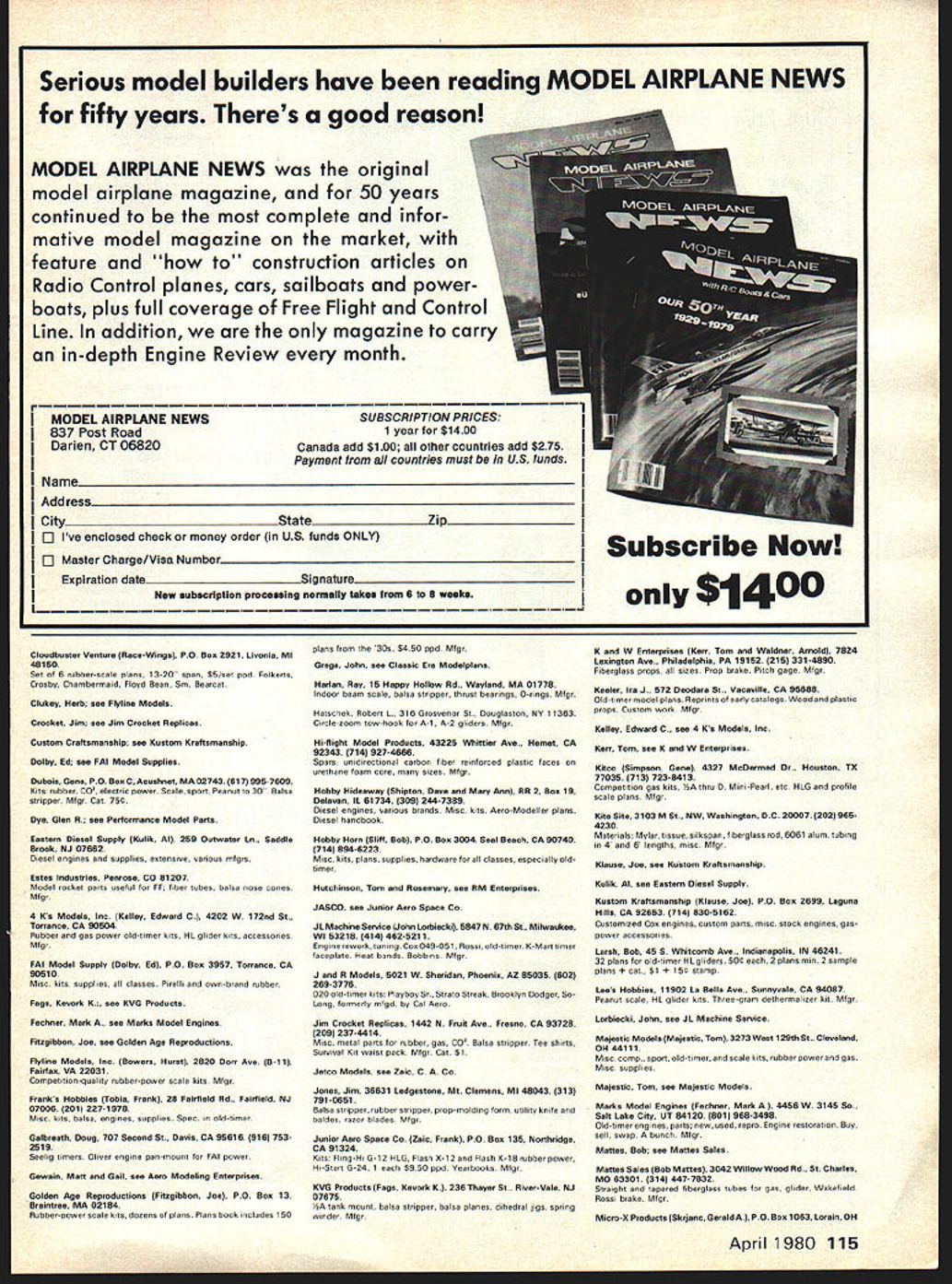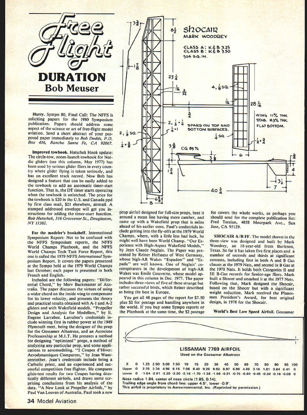 DURATION Bob Meuser Hurry Sympo 80 Final Call NFFS soliciting papers 1980 Symposium publication Papers should address some aspect science art free-flight model aviation Send short abstract pro posed paper immediately Bob Dodds PO Box 436 Ranc/io Santa Fe CA 92067 Improved towbook Hatschek Hook update circle-tow zoom-launch towhook Nor dic gliders see column May 1977 has used serious glider fliers coun try glider flying taken seriously has excellent track record Now Bob has designed feature can easily added towhook add automatic timer-start function DT timer starts operating towbook unlatched price towbook $20 US Canada ppd first class mail $21 elsewhere airmail stamped addressed envelope will get structions adding timer-start function Bob Hatschek 316 Grosvenor St Douglaston NY 11363 modelers bookshelf International Symposium Report confused NFFS Symposium reports NFFS World Champs Planbook NFFS World Champs Tech Task Force Report called 1979 NFFS International Sym posium Report covers papers presented Sympo held 1979 World Champs last October paper presented both French English Included following papers Differ ential Chord Merv Buckmaster Aus tralia paper discusses virtues using wider chord inside wing compensate its lower velocity presents theory practical results obtained A-i A-2 gliders Wakefield models Propeller Design Analysis Modellers E Eugene Larrabee Larrabees credentials clude winning first rubber power 1949 Plymouth meet being designer prop Gossamer Albatross Associate Professorship MIT presents method designing optimized props method analyzing particular prop some appli cations aeromodeling 2 Coupes dHiver Aerodynamiques Comparees Jean Want zenriether Jeans credentials include being Catholic priest experienced suc cessful competition free fighter compares glide-test results two Coupes having dras tically different airfoils draws some sur prising conclusions analysis data New Look Propeller Airfoils Paul Van Leuven Australia Paul took new 73*j / {-l Q N N / $7 S prop airfoil designed full-size props bent around mean line having camber came up Wakefield prop miles ahead earlier ones Pauls credentials clude getting fly-offs 1979 World Champs little less bad luck might well have World Champ Ex perience High-Aspect Wakefield Models Jean Claude Neglais Paper pre sented Reiner Hofsaess West Germany high-AR Wakes Espadon Es pada well known Neglais co conspirators development high-AR Wakes Emile Gouverne model ap peared column Dec 1977 paper includes three-views five strange rather successful birds Reiner described being best Europe get 48 pages report $750 plus $2 postage handling anywhere world buy some Sympo reports Planbook same time $2 postage 8j 23 3 4 5PARS OW TOP ANO bOTTOM SUVACES SQ 2 3j CC 85% 4rft 28 WING1 ii% TI-IK STAB 83% THK FLhT bOTTOM --5 -8 4 -4 43 1-v S fee covers whole works perhaps should send complete publication list Fred Terzian 4858 Moorpark Ave San Jose CA 95129 SHOCAIR A/B FE model shown three-view designed built Mark Woodrey 18-year-old Burleson Texas So far has taken five first places number seconds thirds significant contests including first both B Gas classes 1979 Nats second B Gas 1978 Nats holds both Categories II III B-Gas records Senior-age fliers Mark built Shocer smashed 1977 Nats Following Mark designed Shocair based Shocer significant weight reduction Mark received Planesmen Presidents Award best original design 1978 Shocair Worlds Best Low Speed Airfoil Gossamer 34 Model Aviation sh OCAfl2 MARK WOODEY CL~ K 4 B 325 CLAS5Bk B O 45Q LISSAMAN 7769 AIRFOIL Used Gossamer Albatross X 0 125 250 500 750 10 15 20 30 40 50 60 70 80 90 95 100 Upper 0 225 334 496 615 706 840 926 992 897 696 486 316 181 084 041 0 Lower 0 -164 -201 -230 -230 -216 -170 -138 -106 -091 -075 -060 -045 -030 -016 -008 0 Nose radius 184 center nose circle 185 014 Trailing edge angle chord line upper 450 lower 090 airfoil proprietary Aerovironmental Inc Reprinted permission Albatross airfoil Lissaman 7769 airfoil coordinates shown elsewhere column used peoplepower Gossamer Albatross won sec ond Kremer prize its successful crossing English Channel course computer designed what isnt nowadays sides apples horses Im really sure arent dont know whether de sign specific Reynolds Number Gossamer Albatross hard say whether would better others F/F model Reynolds numbers looks might bears family resemblance very successful foil used Peter Allnutt World Champs A-2 gliders Well present Peters airfoil next month seems certain airfoil would require turbulators some sort model use nose radius seems far too large airfoil develop turbulent boundary upper sur face left its own devices reflexed trail ing edge would tend make airfoil stable should able get away smaller-than-usual horizontal tail load tail moving CG aft trailing edge would have thickened bit F/F model applications unless have source 7-ft razor blades Once again popular demand Free Flight Products Directory hassles free flight knowing obtain some plans kits hardware supplies various sorts need Like last time walked local hobby emporium saw Nordic circle-zoom towhook sitting shelf reel Pirelli rubber peg back wall Hence Directory list far complete did best know suppliers should have included yourself please let know perhaps can update list time time have included suppliers have indicated sell direct mail order also sell through hobby shops check first Im big Oldtimer events little Old-timer material drifts way didnt wont future exclude such material have shunned suppliers run fullpage ads dont need tell about So wont find Carl Goldberg Comet Sig listed shouldnt need tell about Still wonder right Sig example peddles its house brand lots little free flight nifties such ballbearing thrust washers distributor some FAI Supplies Pecks stuff sells direct mail price pay Sig catalog available direct mail hobby shop doesnt carry may well best two bucks ever spent very subjective judgement what include omit have leaned toward cottageindustry enterp