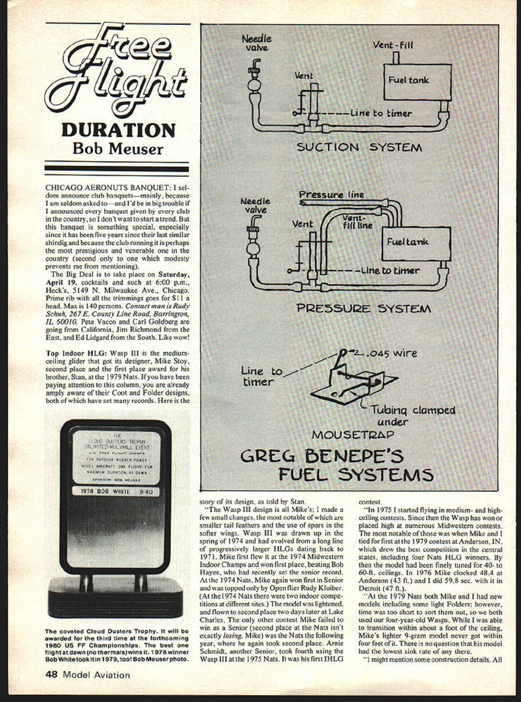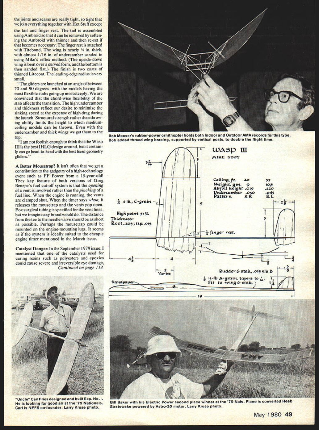 DURATION Bob Meuser CHICAGO AERONUTS BANQUET sel dom announce club banquetsmainly because lam seldom asked toand Id big trouble announced banquet given club country dont want start trend banquet something special especially since has five years since last similar shindig because club running perhaps prestigious venerable country second modesty prevents mentioning Big Deal take place Saturday April 19 cocktails such 600 pm Hecks 5149 N Milwaukee Ave Chicago Prime rib trimmings goes $11 head Max 140 persons Contact man Rudy Schuh 267 F County Line Road Barrington IL 60010 Pete Vacco Carl Goldberg going California Jim Richmond East Ed Lidgard South Like wow Top Indoor HLG Wasp III mediumceiling glider got its designer Mike Stoy second place first place award brother Stan 1979 Nats have paying attention column already amply aware Coot Folder designs both have set records story its design told Stan Wasp III design Mikes made few small changes notable smaller tail feathers use spars softer wings Wasp III drawn up spring 1974 evolved long line progressively larger HLGs dating back 1971 Mike first flew 1974 Midwestern Indoor Champs won first place beating Bob Hayes recently set senior record 1974 Nats Mike again won first Senior topped Open flier Rudy Kluiber 1974 Nats two indoor compe titions different sites model lightened flown second place two days later Lake Charles other contest Mike failed win Senior second place Nats isnt exactly losing Mike Nats following year again took second place Arnie Schmidt another Senior took fourth using Wasp III 1975 Nats first IHLG contest 1975 started flying medium- highceiling contests Since Wasp has won placed high numerous Midwestern contests notable Mike tied first 1979 contest Anderson IN drew best competition central states including four Nats HLG winners model finely tuned 40- 60-ft ceilings 1976 Mike clocked 484 Anderson 43 ft did 598 sec Detroit 47 ft 1979 Nats both Mike new models including some light Folders however time too short sort out both used four-year-old Wasps able transition within about foot ceiling Mikes lighter 9-gram model never got within four feet no question model lowest sink rate might mention some construction details 48 Model Aviation coveted Cloud Dusters Trophy will awarded third time forthcoming iao us FF Championships best flightatdawn nothermalslwins 1 978winner Bob Whitetook 1979 too Bob Meuser photo joints seams really tight tight join everything together Hot Stuff except tail finger rest tail assembled using Ambroid can removed soften ing Ambroid thinner re-set becomes necessary finger rest attached Titebond wing nearly thick almost 1/16 undercamber sanded using Mikes reflex method upside-down wing bent over curved form bottom sanded flat finish two coats thinned Litecoat leading-edge radius very small gliders launched angle between 70 90 degrees models having flexible stabs goingup steeply convinced chord-wise flexibility stab affects transition high undercamber thickness reflect desire minimize sinking speed expense high drag during launch Structural strength rather throw ing ability limits height mediumceiling models can thrown undercamber thick wings get top am foolish enough think thatthe Wasp III best IHLG design around certain ly can go head-to-head best fixed-geometry gliders Better Mousetrap isnt often get contribution gadgetry high-technology event such FF Power 15-year-old key feature both versions Greg Benepes fuel cut-off system opening vent involved rather thepinching ofa fuel line engine running vents clamped shut timer says whoa releases mousetrap vents pop open Fox surgical tubing specified vent lines imagine brand would distance tee needle valve should short possible Perhaps mousetrap could mounted engine-mounting lugs seems system ideally suited cheapie engine timer mentioned March issue Catalyst DangerInthe September 1979 issueI mentioned catalysts used curing resins such polyesters epoxies could cause severe irreversible eye damage Continued page 113 11 4 lb C-t-aL/ i {jr Hi8h point t% Thicness Root zos tip 09 MIKE STOY Ci1in8 fe-do 9 Airftthrfalit 019 Vndereamber oo PatternRR 9 r rgst \i~j \ 4I 4i4 9 Rudder&-stak045lbB18~1 varidsj San paper. izAb A-grain tapet-s Fit witi8 6- atakI y 1980 49 Bob Meusers rubber-power ornitnopter noias 00th Indoor ana uutdoor AMA records type Bob added thread wing bracing supported vertical posts double flight time WA~ hr l0 zz0 045 RL -zk1 19 Uncle Carl Fries designed built Exp No1 looking good air g Nationals Carl NFFS co-founder Larry Kruse photo Ulil baker wHin nis iecsric rower secona piace winner ai ne converted Heeb Stratowake powered Astro-20 motor Larry Kruse photo took get hospital emergency room another story itself time issue reaches mailbox active flying season us northern states will upon us ask club officers take look field rules compare list Now time make changes after accident occurs Have another safe month John Preston 7012 Elvira Court Falls Church VA 22042 FF Duration/Meuser continued page 49 washed off almost immediately catalyst referred methyl ethyl ketoneperox ide indeed very watery stuff supplied polyester boat resin auto-body putty usually comes small polyethylene dropper bottle warning bottle refers eye irritation permanent damage dont know what active material syrup-like paste catalysts used epoxy cements finishes sold hobby use know work government-funded lab some epoxy catalysts have banned altogether Its OK have plutonium tritium around place certain catalysts Well cant go through life being afraid everything often dont take rudimentary precautions Im reminded local physicians wife died result using some spray-can stuff Christmas tree adequate ventilation Book Review recently received letter youngster name Jimmy Williams whats address Jimmy tells story far better could part Jimmys letter am Junior Modeler just turned 141 amnot yet member AMA hope tojoin sometime friend member lets read Model Aviation month like column Scale Indoor column