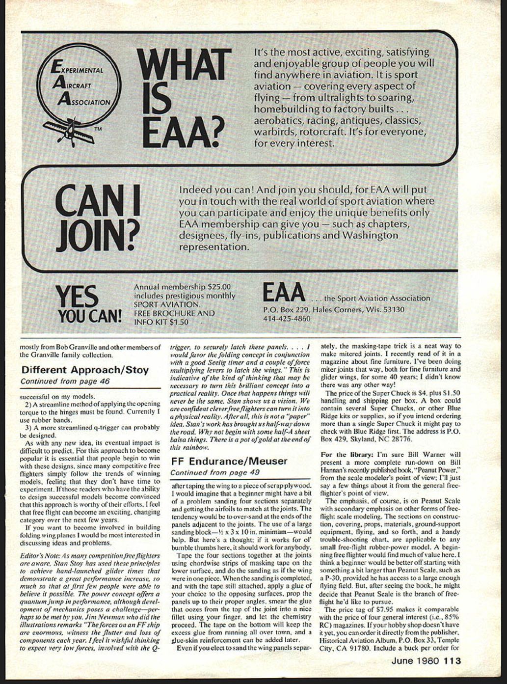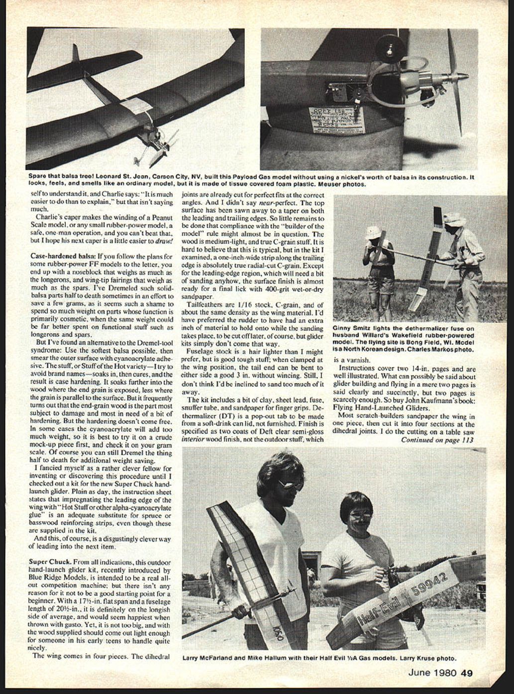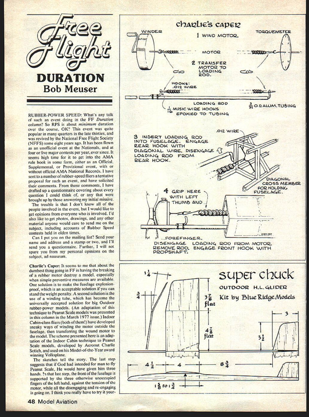 DURATION Bob Meuser RUBBER-POWER SPEED Whats talk such event doing FF Duration column So RPS about minimum duration over course OK event quite popular quarters late thirties revived National Free Flight Society NFFS some eight years ago has flown unofficial event Nationals four five major contests per year ever since seems high time get AMA rule book some form either Official Supplemental Provisional event official AMA National Records have sent number rubber-speed fliers tentative proposal such event have solicited comments comments have drafted up questionnaire covering about question could think brought up answering initial missive trouble dont know people involved event would like get opinions everyone involved Id also like get photos drawings other material anyone would care send subject including accounts Rubber Speed contests held olden times Can put mailing list Send name address stamp two Ill send questionnaire Further will spare personal opinions subject ad nauseum Charlies Caper seems about dumbest thing going FF having breaking rubber motor destroy model especially simple preventive measures available solution make fuselage explosionproof acceptable solution can stand weight penalty second solution use winding tube has become universally accepted solution big Outdoor rubber-power models An adaptation technique Peanut Scale models presented column March 1977 issue Indoor Cabin-class fliers both have developed sneaky ways winding motor outside fuselage transferring wound motor model scheme presented adap tation Indoor Cabin technique Peanut Scale models developed Aeronut Charlie Sotich used Model-of-the-Year award winning Volksplane sketches tell story last step suggests God intended man fly Peanut Scale would have given him three hands last step front fuselage supported three otherwise unoccupied fingers left hahd against tension motor disengaging re-engaging going think really have try yourWIIJOER ~tIIlIIkMOTOR 2 T2AJ5FE MOTOR TO LOADI ROD HOOKS 012 WIRE LOADINCa ROD 2 MUSIC WIRE HOOKS POXIeD TO TU1rIC4 TO2QVEMT O DALUMTLEd 3 I5&RT LOADlt3C QOD llTO FUSEL4ECA ZER HOOK WITH DIACqOIQAL WIRE. DISENCAC llJC ROD FROM QEAR HOOK DIcOtJAL CO5S MEMBR 3 4 JLc&t 4 V-- 48 Model Aviation C12At2L1CS CAPI2 WIND MOTOR FOREFINcEIZ DI5C1AE LOAOlIJC ROD FROM MOTOQ REMOVE ROD EN44GE FOrJT HOOI4 WITH PQOPSI-i AFT super chuck OUTDOOI HL GLI QER kit b Blue Rict0eMod& 1~ I L4~ self understand Charlie says much easier to explain isnt saying much Charlies caper makes winding Peanut Scale model small rubber-power model safe one-man operation cant beat hope next caper little easier draw Case-hardened balsa follow plans some rubber-power FF models letter end up noseblock weighs much longerons wing-tip fairings weigh much spars Ive Dremeled such solidbalsa parts half death sometimes effort save few grams seems such shame spend much weight parts function primarily cosmetic same weight could far better spent functional stuff such longerons spars Ive found alternative Dremel-tool syndrome Use softest balsa possible smear outer surface cyanoacrylate adhe sive stuff Stuff Hot varietyI try avoid brand namessoaks cures result case hardening soaks further wood end grain exposed less grain parallel surface frequently turns out end-grain wood part subject damage need bit hardening hardening doesnt come free some cases cyanoacrylate will add too much weight best try crude mock-up piece first check gram scale course can still Dremel thing half death additfonal weight saving fancied myself rather clever fellow inventing discovering procedure until checked out kit new Super Chuck handlaunch glider Plain day instruction sheet states impregnating leading edge wing Hot Stuff other alpha-cyanoacrylate glue adequate substitute spruce basswood reinforcing strips though supplied kit course adisgustinglycleverway leading next item Super Chuck indications outdoor hand-launch glider kit recently introduced Blue Ridge Models intended real out competition machine isnt reason good starting point beginner 17 A-in flat span fuselage length 20-in definitely longish side average would seem happiest thrown gusto Yet too big wood supplied should come out light enough someone early teens handle quite nicely wing comes four pieces dihedral joints already cut perfect fits correct angles didnt say near-perfect top surface has sawn away taper both leading trailing edges So little remains done compliance builder model rule might almost question wood medium-light true C-grain stuff Jt hard believe typical kit examined one-inch-wide strip along trailing edge absolutely true radial-cut C-grain Except leading-edge region will need bit sanding anyhow surface finish almost ready final lick 400-grit wet-or-dry sandpaper Tailfeathers 1/16 stock C-grain about same density wing material Id have preferred rudder have extra inch material hold onto sanding takes place cut off later course glider kits simply dont come way Fuselage stock hair lighter might prefer good tough stuff clamped wing position tail end can bent either side good 3 wincing Still dont think Id inclined sand too much away kit includes bit clay sheet lead fuse snuffer tube sandpaper finger grips De thermalizer DT pop-out tab made soft-drink can lid furnished Finish specified two coats Deft clear semi-gloss interior wood finish outdoor stuff varnish Instructions cover two 14-in pages well illustrated What can possibly said about glider building flying mere two pages said clearly succinctly two pages scarcely enough So buy John Kaufmanns book Flying Hand-Launched Gliders Most scratch-builders sandpaper wing piece cut four sections dihedral joints cutting table saw Continued page 113 spare tnat balsa treel Leonard St Jean Carson City NV built Payload Uss model using nicKels worth 0 balsa its construction looks feels smells like ordinary model made tissue covered foam plastic Meuser photos Ginny 5mhz ignts aetnermalizer ruse husband Willards Wakefield rubber-powered model flying site Bong Fie