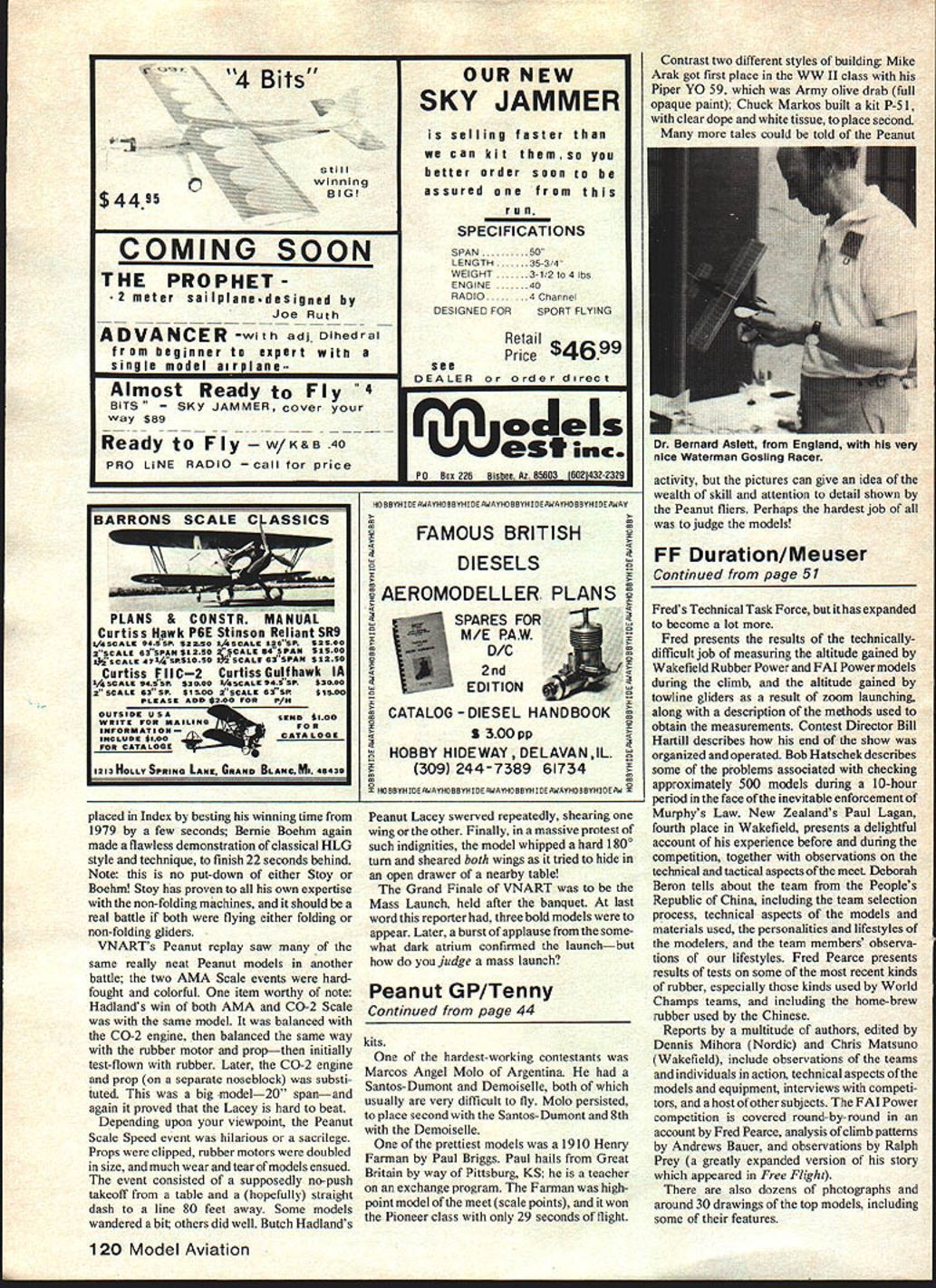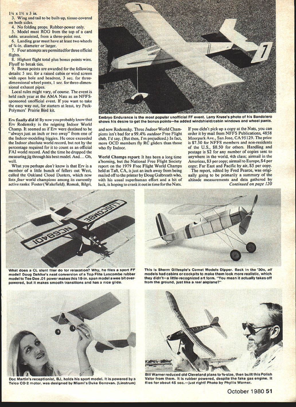 DURATION Bob Meuser SPORT FREE FLIGHT exception Larry Kruse Bandolero Bill Rufis Satellite photos shown models have never won contest never will simply because no contests strictly funzies motivation Perhaps pseudo-scale model full-size plane exists designers mind perhaps someones personal idea something looks cute snazzy whatever him doesnt look cute snazzy whatever youthats problem perhaps. knows countless possible reasons building such contraptions other simply turn some Embryo Endurance competition event attempts limit competition small sporttype models Unfortunately winning comes name game rather fun something gets lost Anyhow seems work pretty well some pretty cute snazzylooking models have come out rules pretty simple 1 Not over 50 sq monoplane 70 sq biplane wing area 45 sq maximum larger biplane wing Stab area exceed 50% total wing area 2 Fuselage enclose imaginary box least Bill Ruff Lancaster CA looks thermal can fly Satellite Power K&B 66 41 cu inl enginemakes just over border Class 0 close becoming one-design event Meuser photo Ctim6 N&euscr * Z59 IzzIzzuz Tranition said Leonardo da Vinci dead latest mind-numbing concept series 9 Lee Campbells THERMAL PIGLET Outdoor Hand Launch Glider Campbells Custom Kits ka. 16 3 Th 3 --16 -WTh 4 1 4 spruce1 3 4 AL 1 1816 ing weight DT folks latest HLG kit hit market Price ordering column 50 Model Aviation didnt grok John Oldenkamp design lust havent paying attention John built pretty 30-in ROW took picture later donated craft art gallery 1 x 1 x 3 3 Wing tail built-up tissue-covered both sides 4 No folding props Rubber-power 5 Model must ROG top card table unassisted three-point rest 6 Landing gear must have least two wheels -in diameter larger 7 Four attempts permitted three official flights 8 Highest flight total plus bonus points wins Flyoff break ties 9 Bonus points awarded following details 5 sec raised cabin wind screen open hole headrest 3 sec threedimensional wheel pants 1 sec three-dimen sional exhaust pipes Local rules might vary course event held year AMA Nats NFFS sponsored unofficial event want take easy way out starters least try PeckPolymers Prairie Bird kit Erv finally did now probably know En Rodemsky reigning Indoor World Champ seemed En destined always just inch two away Indoor-modeling biggies once exceeded Indoor absolute world record percentage required count official FM world record time dropped measuringjig through best model And. Oh well What perhaps dont know En member little bunch fellers out West called Oakland Cloud Dusters now lists four world champions among its currently active ranks FosterWakefield Romak Bilgri now Rodemsky Three Indoor World Cham pions isnt bad 994% outdoor Free Flight club Id say Im prejudiced fact OCD members fly RC gliders fly Indoor World Champs report has long time aborning National Free Flight Society report 1979 Free Flight World Champs held Taft CA just inch away being mailed off printer Doug Galbreath usual superhuman effort bit luck hoping crank out time Nats didnt pick up copy Nats can order mail NFFS Publications 4858 Moorpark Ave San Jose CA 95129 price $750 NFFS members non-residents US $850 others Handling postage $2 number copies sent anywhere world 4th class airmail Americas $3 per copy airmail Europe $4 per copy Far East Pacific air $5 per copy report edited Fred Pearce origi nally going primarily summary altitude measurements data gathered Continued page 120 , rm Gillespies Comet Models Dipper Back 30s ,uud Doug Dahikes neat conversion Top ~nbe rubber models cabins cockpits make look realistic model Tee Dee 01 power makes 1 8-in spain model wee bit over- didnta little-recognized art form mean actually takes off powered makes smooth transitions has nice glide ground just like real airplane October 1980 51 Embryo Endurance popular unofficial FF event Larry Kruses photo Bandolero shows desire get bonus pointshe added windshield/cabin windows wheel pants rtuptiurut 0., nuu rib sport uriodel powered bya io CO-2 motor designed Miamis Duke Donovan Linstrum / ,u .udriu plans t Polish rubber powered despite fake gas engine ru about 45 secjust right Photo Phyllis Warner 4 Bits 1 $ 4495 still winning BIG COMING SOON THE PROPHET2 meter sailplanedesigned Joe Ruth ADVANCER wit h adi Dihedral beginner expert single model airplane. Almost Ready Fly 4 BiTS JAMMER cover way $89 Ready Fly B PRO LINE RADIO price BA RR ONS SC LE CASS ICS PLANS & CONSTA MANUAL Curtiss Hawk P6E Stinson Reliant SR9 I/4SCALE 94SSP $2250 IASCALE 126SP $2500 2SCALE 63SPAN $1250 2~CALE R4SPAN $1500 1J5CALE 4714SPS1050 SCALE 62SPAN $ 1250 Curtiss FIIC2 Curtiss Gulfhawk IA IASCALE 94S $3000 1/ASCALE 945SP $3000 2 SCALE 63 SF $1500 2SCALE 63SR $1500 PLEASE ADD $200 FORP/H USA $100 WRITE FOR MAILING FOR INFORMATION INCLUDE $100 LOGS FOR CATALOGE 1213 HOLLY SPRING LANE GRAND BLANC Mi 46436 placed Index besting winning time 1979 few seconds Bernie Boehm again made flawless demonstration classical HLG style technique finish 22 seconds behind Note no put-down either Stoy Boehm Stoy has proven own expertise non-folding machines should real battle both flying either folding non-folding gliders VNARTs Peanut replay saw same really neat Peanut models another battle two AMA Scale events hardfought colorful item worthy note Hadlands win both AMA CO-2 Scale same model balanced CO-2 engine balanced same way rubber motor propthen initially test-flown rubber Later CO-2 engine prop separate noseblock substi tuted big model2O spanand again proved Lacey hard beat Depending upon viewpoint Peanut Scale Speed event hilarious sacrilege Props clipped rubber motors doubled size much wear tear models ensued event consisted supposedly no-push takeoff table hopefully straight dash line 80 feet away Some models wandered bit others did well Butch Hadlands OUR NEW SKY JAMMER selling faster can kit themso better order soon assured r U n SPECIFICATIONS SPAN50 LENGTH35-3/4 WEIGHT3-1/2 4 lbs ENGINE40 RADIO4 Channel DESIGNED FORSPORT FLYING Retail Pric