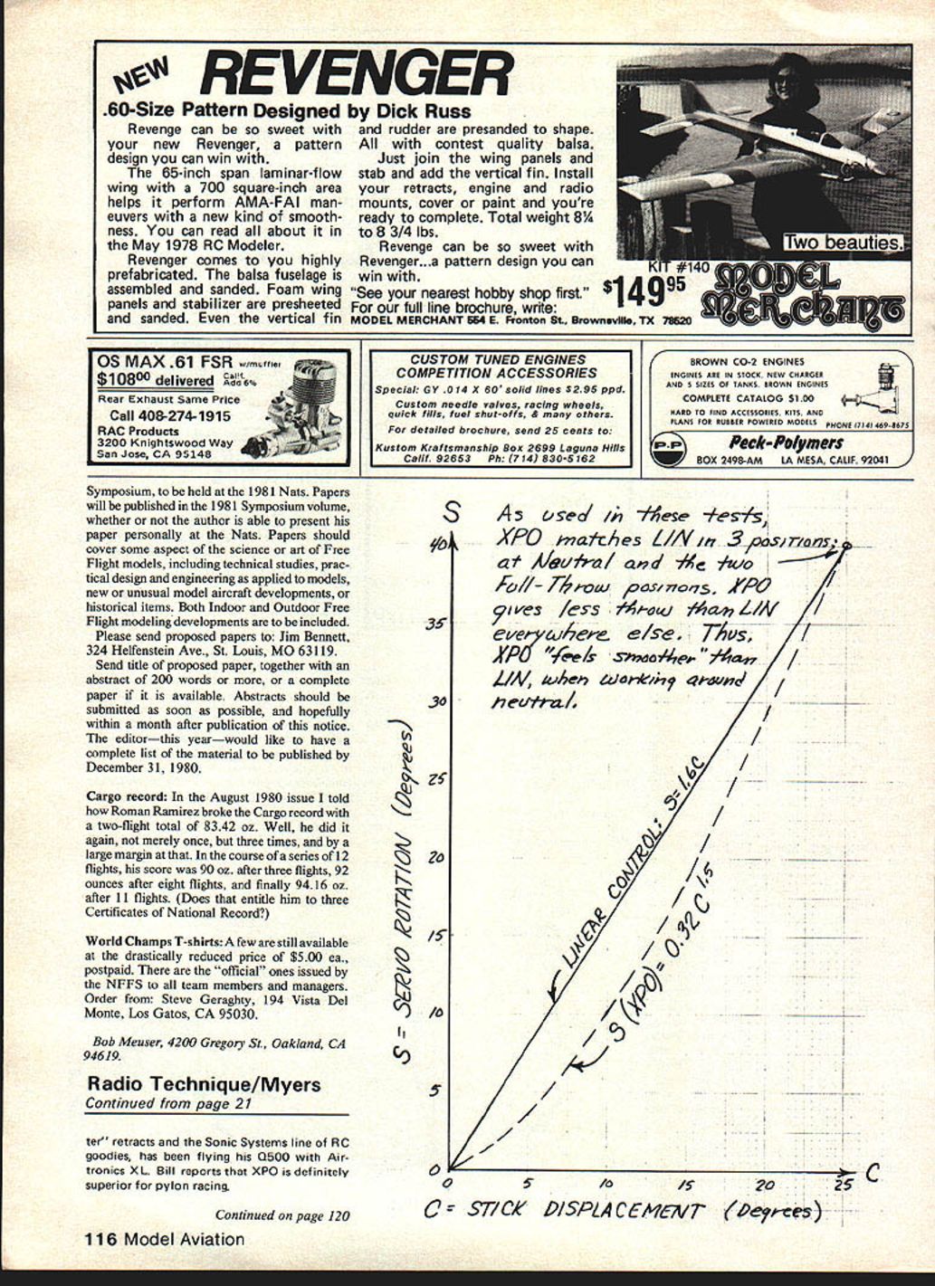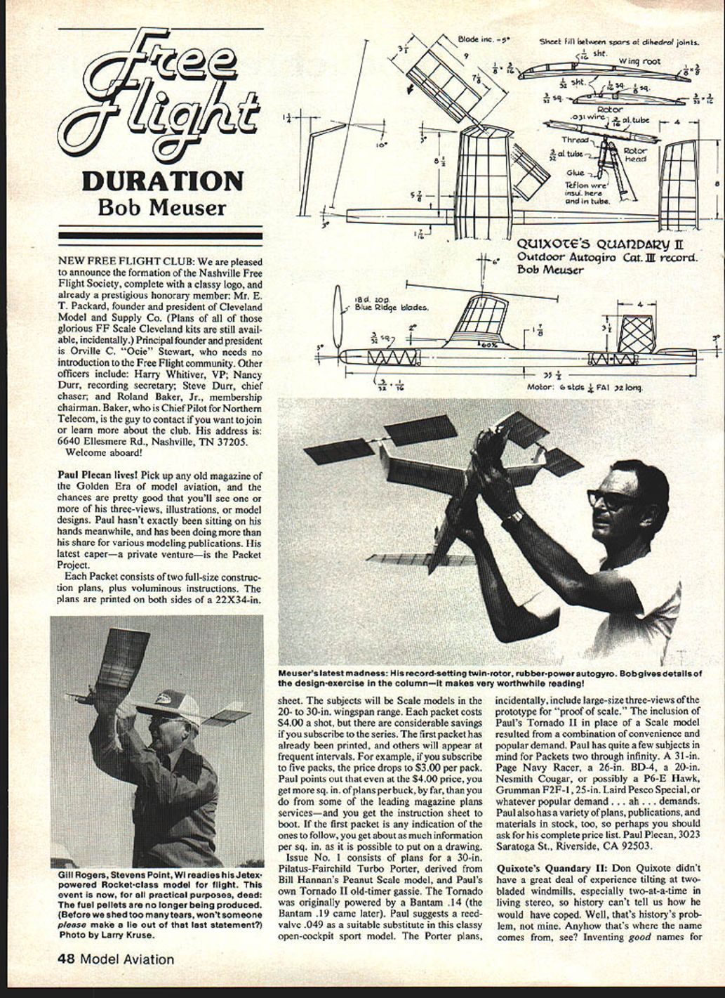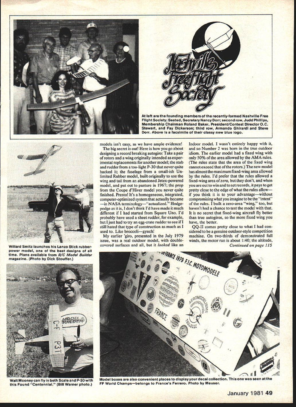 4tQDURATION Bob Meuser NEW FREE FLIGHT CLUB pleased announce formation Nashville Free Flight Society complete classy logo already prestigious honorary member Mr E T Packard founder president Cleveland Model Supply Co Plans of glorious FF Scale Cleveland kits still avail able incidentally Principal founder president Orville C Ocie Stewart needs no introduction Free Flight community Other officers include Harry Whitiver VP Nancy Durr recording secretary Steve Durr chief chaser Roland Baker Jr membership chalrman Baker Chief Pilot Northern Telecom guy contact want join learn about club address 6640 Ellesmere Rd Nashville TN 37205 Welcome aboard Paul Plecan lives Pick up old magazine Golden Era model aviation chances pretty good youll see three-views illustrations model designs Paul hasnt exactly sitting hands meanwhile has doing share various modeling publications latest capera private ventureis Packet Project Packet consists two full-size construc tion plans plus voluminous instructions plans printed both sides 22X34-in 1* Blade inc Skeet Fiji lieteeen srars dihedral joints 9 t I3S 32 sq ~3iIZ32 C otor O3IWire aaI tu6e 10al tube 7F otor ad hend Glue TFlon sul he- 8 tube 0 8 i QUIXOtES QUA12DAtZV IL Outdoor Autoqiro Cat 1K rccord Bob Mcuer blodes 20 sheet subjects will Scale models 20- 30-in wingspan range packet costs $400 shot considerable savings subscribe series first packet has already printed others will appear frequent intervals example subscribe five packs price drops $300 per pack Paul points out $400 price get sq ofplans per buck far some leading magazine plans servicesand get instruction sheet boot first packet indication ones follow get about much information per sq possible put drawing Issue No 1 consists plans 30-in Pilatus-Fairchild Turbo Porter derived Bill Hannans Peanut Scale model Pauls own Tornado II old-timer gassie Tornado originally powered Bantam 14 Bantam 19 came later Paul suggests reedvalve 049 suitable substitute classy open-cockpit sport model Porter plans incidentally include large-size three-views prototype proof scale inclusion Pauls Tornado II place Scale model resulted combination convenience popular demand Paul has quite few subjects mind Packets two through infinity 31-in Page Navy Racer 26-in BD-4 20-in Nesmith Cougar possibly P6-E Hawk Grumman F2F-l25-in Laird Pesco Special whatever popular demand. demands Paul also has variety plans publications materials stock too perhaps should ask complete price list Paul Plecan 3023 Saratoga St Riverside CA 92503 Quixotes Quandary II Don Quixote didnt have great deal experience tilting two bladed windmills especially two-at-a-time living stereo history cant tell us would have coped Well thats historys proW lem Anyhow thats name comes see Inventing good names 48 Model Aviation SI 32IC mousers latest madness nis recora-senlng swin-rosor ruoDer-powerautogyro Bobgives details deslgnexercise columnit makes very worthwhile reading Un nuer ieveria rolni WI reduIuanIaJLA powered Rocket-class model flight event now practical purposes dead fuel pellets no longer being produced Before shed too manytears wont someone please make lie Out last statement Photo Larry Kruse models isnt easy have ample evidence big secret out go about designing record breaking autogiro Take pair rotors wing originally intended exper imental replacements another model stab rudder too-light P-30 never quite hacked fuselage small-ish Un limited Rubber model built originally use wing tail abandoned Jetex-powered model put out pasture 1967 prop Coupe dHiver model never quite finished Presto Its homogeneous integrated computer-optimized system actually became NASA terminology actualized Hodge podge dont think Id have made much different started Square Uno Id probably have used sheet rudder example Ijust try egg-crate rudder see still hated type construction much used Like broccoligyuch earlier giro presented July 1979 issue real outdoor model doublecovered surfaces looked like Indoor model wasnt entirely happy Number 2 born true outdoor idiom earlier model fixed wing 50% area allowed AMA rules rules state area fixed wing cannot exceed rotors new model has almost maximum fixed-wing area allowed rules Id prefer rules allowed fixed-wing area zero dont out win set records pays get pretty close edge what rules allow think advantagewithout compromising what imagine intent rules built zero-area wing too havent chance test model no secret fixed-wing aircraft fly better true autogiros fixed wing have better QQ-II comes pretty close what con sidered genuine outdoor-style competition machine two-thirds demonstrated full winds motor run about 140 altitude Continued page 115 j74 Walt Mooney can fly b MOOCH ooxes aiso convenient piaces aispiay aecal collection seen Found Centennial Bill Warner photo FF World Champsbelongs Frances Ferrero Photo Meuser January 1981 49 left founding members recently-formed Nashville Free Flight Society Seated Secretary Nancy Dorr second row Judd Phillips Membership Chairman Roland Bsker President/Contest Director OC Stewart Fay Dickerson third row Armando Ghirardl Steve Dorr Above facsimile classy new blue logo Willard Smitz launches Lanzo Stick rubberpower model best designs time Plans available RIC Model Builder magazine Photo Dick Stouffer meI havent gotten either Charlie Johnson 3716 Ingraham St San Diego CA 92109 FF Duration/Meuser Continued page 49 some 250 ft still-air flight duration around 230 its first official flight accidentally launched light early-morning thermal dethermalized edge field score 404 So seems will fly climb max DT-on-command things competition Free Flight models supposed back mid-1979 thought set Cat record beating old two allowed three flight turned out made administrative glitch gota read rule book often closelyand sol withdrew record application Early year set official Cat III record machine wasnt flying too well forgotten bring winding tube bit chicken really wind up Therell other times dethermalize autogir