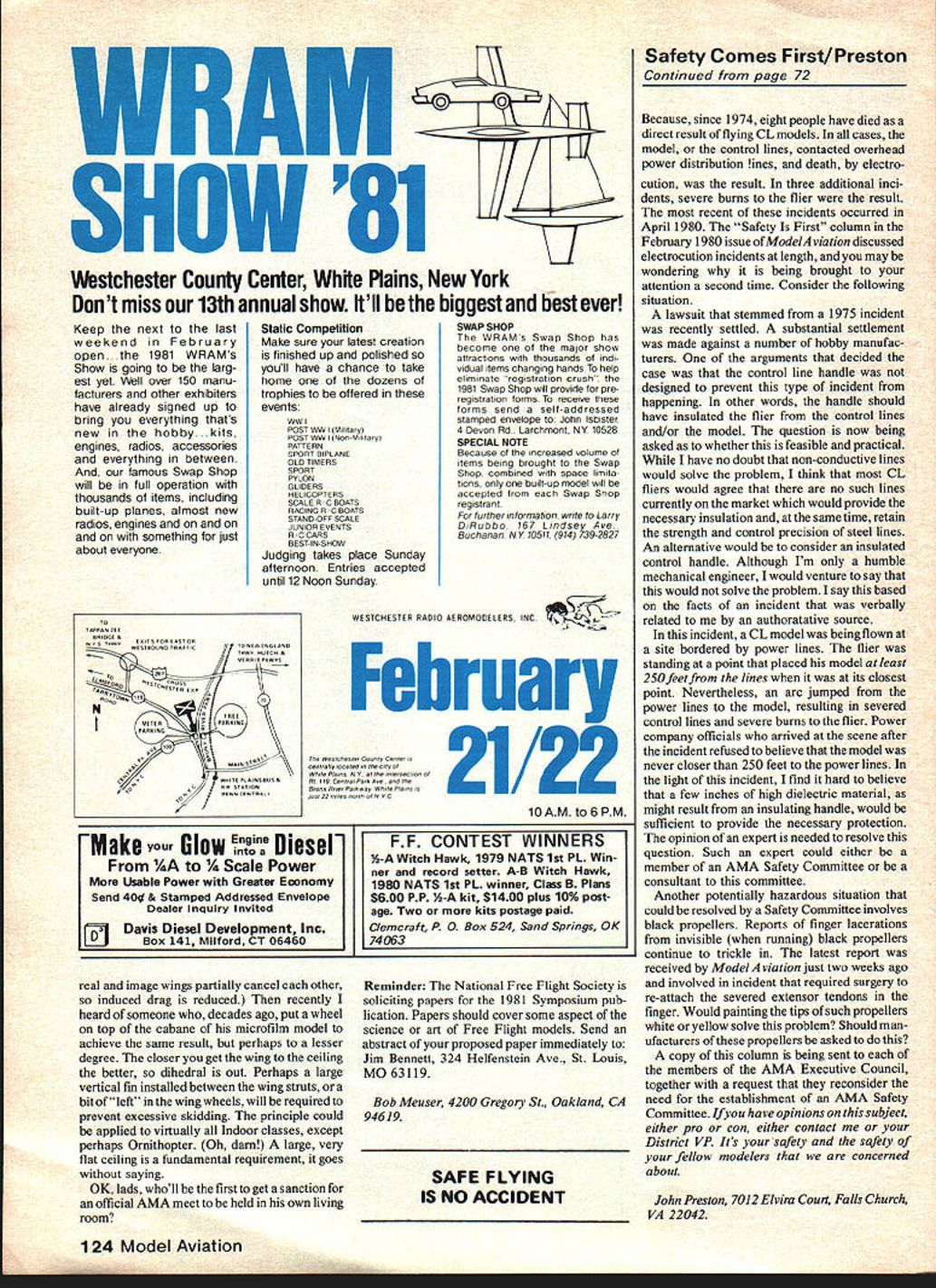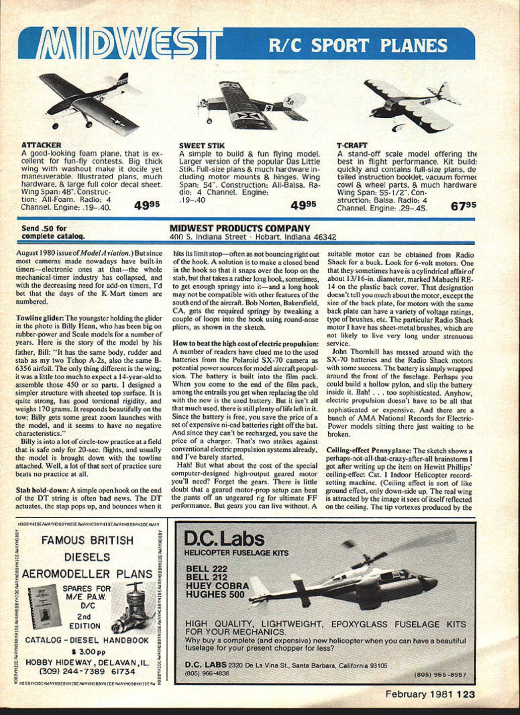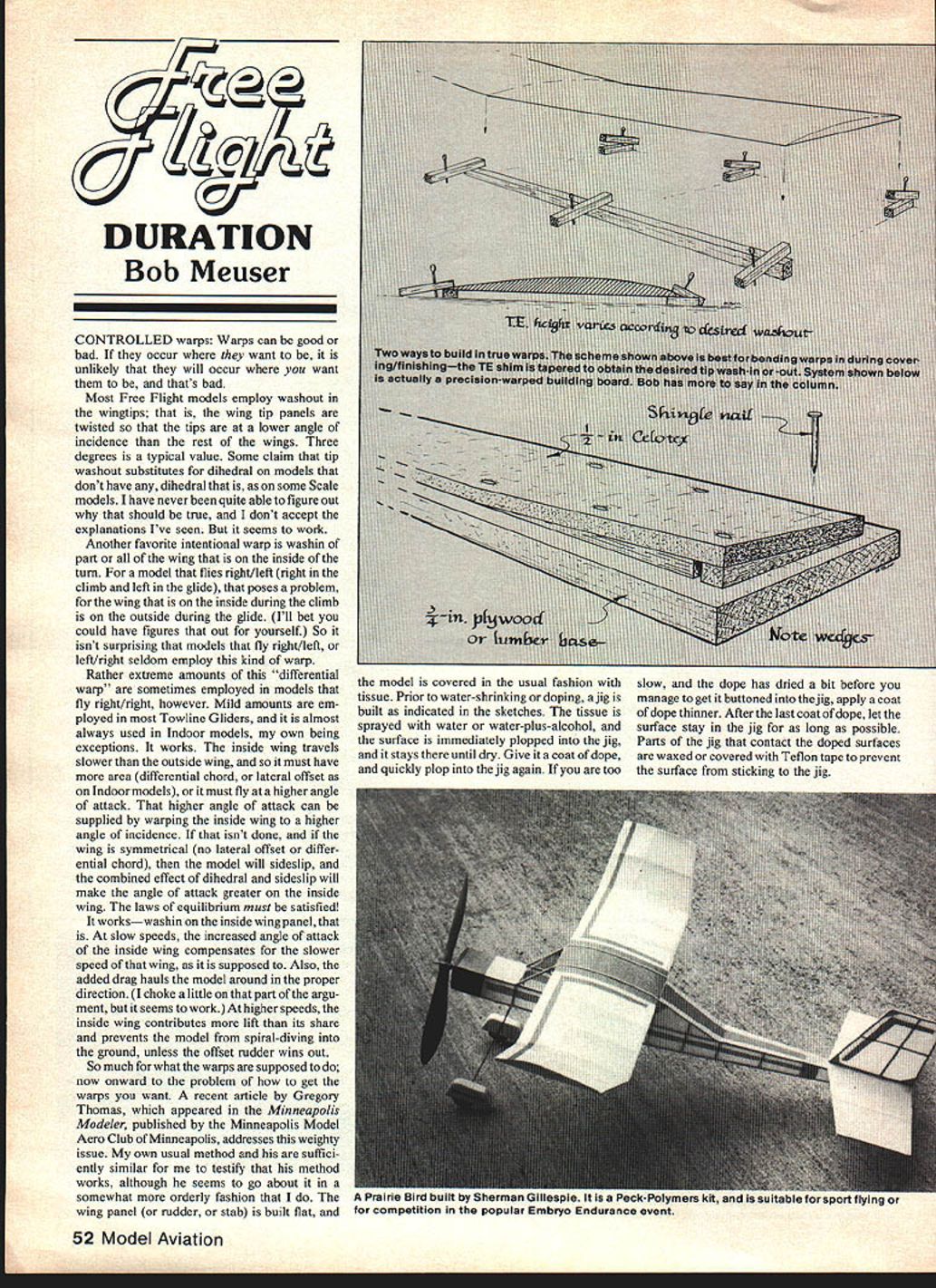 DURATION Bob Meuser CONTROLLED warps Warps can good bad occur want unlikely will occur want thats bad Most Free Flight models employ washout wingtips wing tip panels twisted tips lower angle incidence rest wings Three degrees typical value Some claim tip washout substitutes dihedral models dont have dihedral some Scale models have never quite able figure out should true dont accept explanations Ive seen seems work Another favorite intentional warp washin part wing inside turn model flies right/left right climb left glide poses problem wing inside during climb outside during glide Ill bet could have figures Out yourself So isnt surprising models fly right/left left/right seldom employ kind warp Rather extreme amounts differential warp sometimes employed models fly right/right however Mild amounts em ployed Towline Gliders almost always used Indoor models own being exceptions works inside wing travels slower outside wing must have area differential chord lateral offset Indoor models must fly higher angle attack higher angle attack can supplied warping inside wing higher angle incidence isnt done wing symmetrical no lateral offset differ ential chord model will sideslip combined effect dihedral sideslip will make angle attack greater inside wing laws equilibrium must satisfied workswashin inside wing panel slow speeds increased angle attack inside wing compensates slower speed wing supposed Also added drag hauls model around proper direction choke little part argu ment seems work higher speeds inside wing contributes lift its share prevents model spiral-diving ground unless offset rudder wins out So much what warps supposed now onward problem get warps want recent article Gregory Thomas appeared Minneapolis Modeler published Minneapolis Model Aero Club Minneapolis addresses weighty issue own usual method suffici ently similar testify method works although seems go about somewhat orderly fashion wing panel rudder stab built flat model covered usual fashion tissue Prior water-shrinking doping aug built indicated sketches tissue sprayed water water-plus-alcohol surface immediately plopped jig stays until dry Give coat dope quickly plop jig again too slow dope has dried bit before manage get buttoned thejig apply coat dope thinner After last coat dope let surface stay jig long possible Parts jig contact doped surfaces waxed covered Teflon tape prevent surface sticking jig 52 Model Aviation Praibuilt Sherman Gillespie Peck-Polymers kit suit competition popular Embryo Endurance event works just dandy structures have little torsional stiffness other supplied covering box spar diagonal rib construction used warps must built framework before covered torsionally limp frameworks think building warps structure has slight edge over building flat warping structure afterwardand just happen have solution hip pocket solution Celotex Thats local trade name havent faintest idea what generic term would Maybe insulation board RAIcM comes 4 x 8-ft panels -in thick used covering walls ceilings soft can push pin clear through makes easy thumbs bit flimsy large piece will warp under its own weight small pieces stay pretty flat larger pieces can tacked plywood thought mainly useful building board Delta Darts such until started using itit really nice stuffi Start chunk stuff several inches larger model surface building Nail down piece -in plywood workbench dining-room table whatevers handy before mash nails home insert shims get warps want recently built Scale model wing way curved dihedral prototype flat wing figure judges will think curve got accidentally tip washout inboardwing washin built Celotex surface Stick plans build frame warps built structure Use same rig after covering water later dope drying nothing its little problems dog simply loves eat Celotex Thats bad part good part its cheaper dog food. Electronic timers Since integrated circuit chips became available decade ago modelers have attempted develop electronic timers replace mechanical timers fuses engine cutoff dethermalizer actuation incentive has potentially accurate timing higher reliability compared mechanical clockwork timers problem electronic timers has electronics per se actuator Small electric motors electro magnets etc tend bulky heavy power Continued page 122 February 1981 53 Billy Henn gets lots practice towing witn tnis moaitieu iCnop R- towliner dad Bill simplified wing structure design John Thornhills cheapie electric-power FF bird uses tlaalo nack ungeared motor battery used Polaroid SX-70 film pack Note motor attached duct tape battery nestles underthe wing top pylon Sharp eyes will see fuse-operated Ia OT hand-bent wire battery switch below pylon all-balsa bird world-beaterjust lots fun N U U f7EiT7J Strips Balsa Fuzz-Freew/out Adjustments Small -$1000 Large shown-$2000 Please add $100 postage P Kits ature Renlicas EE BEE $600 please ad Si 00 postage Catalog 75 GENE DUBOIS P0 Box c Acuslinet MA 02743 ....DEALER INQUIRIES INVITED 4 Fine Quality Flying Models 98 RUBBER POWER KITS plus Gliders CIL R/C Accessories Books Catalog $150 MAJESTIC MODELS 3273 West 129th Street Cleveland Ohio 44111 adjustment per flight go slowly Sensitivity adjustments increases speed Increase DT time fine-tune glide until satisfied Sea Power contribution state art Free Flight hope enjoy introduction programmable tail feathers FF Duration/Meuser Continued page 53 hungry According Bat Sheet Strat-O-Bats Wash ington Steve Helmick editor Ken Bauer pro ducing electronic timers Nordic Towline Gliders perhaps multi-function timer Power models will come later havent chance check information Ken get photos drawings Helmicks comments Bauers timer look like way go all-weatherA-2 calm-air zoom delay desirable glider does work Basically theres steel plate fastened DT line stuck onto electro-magnet made coil relay Some electronic wizardry IC chip times current flow coil shuts down DT-time comes row tiny rocker switches sets DT time. assigned times 10 40 160 640 seconds fly