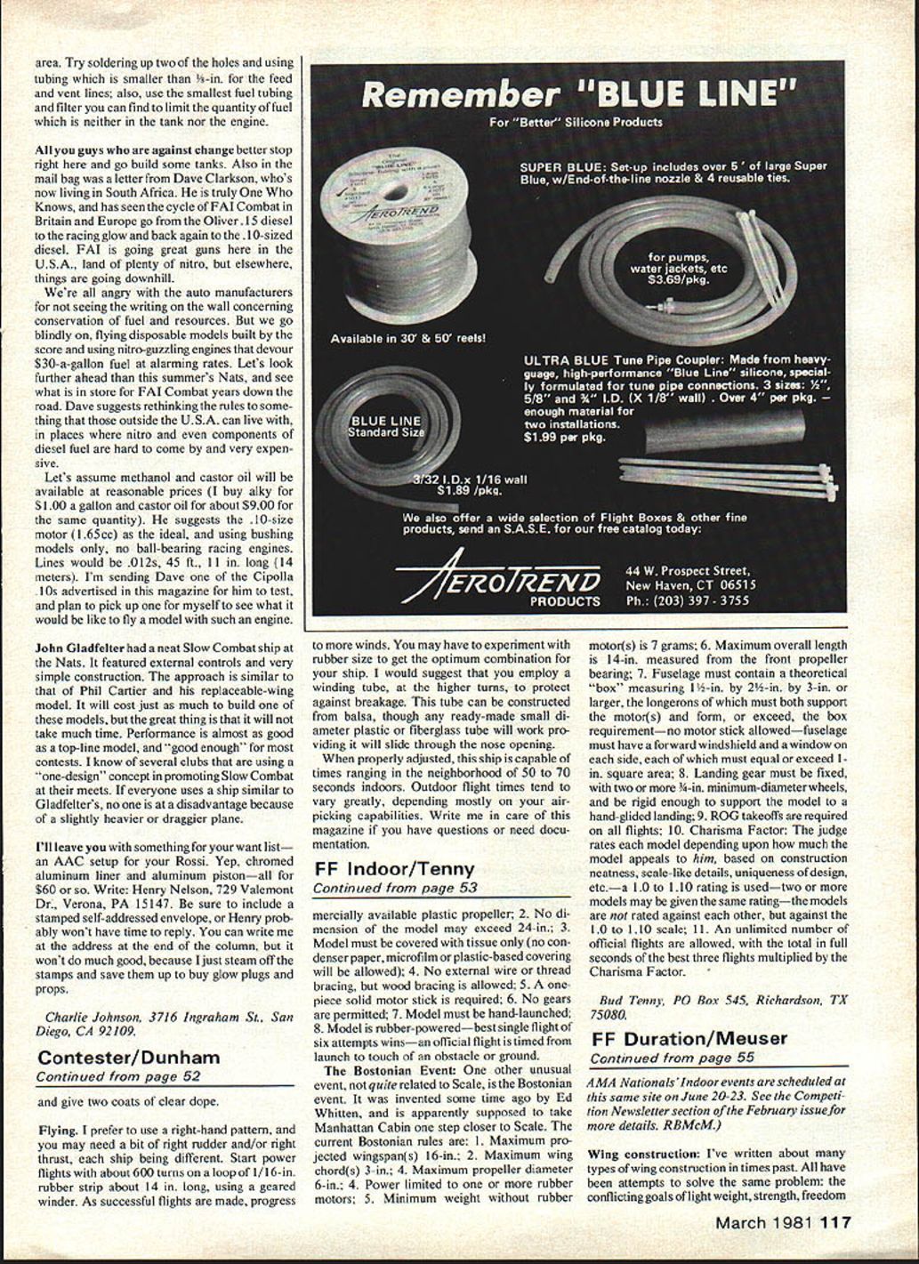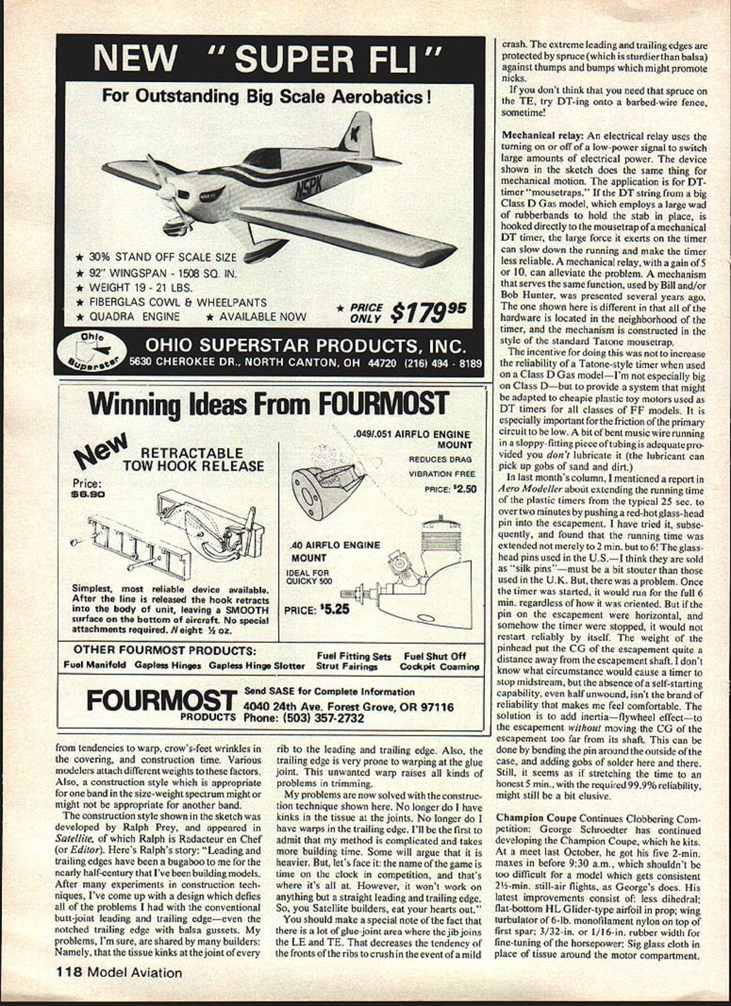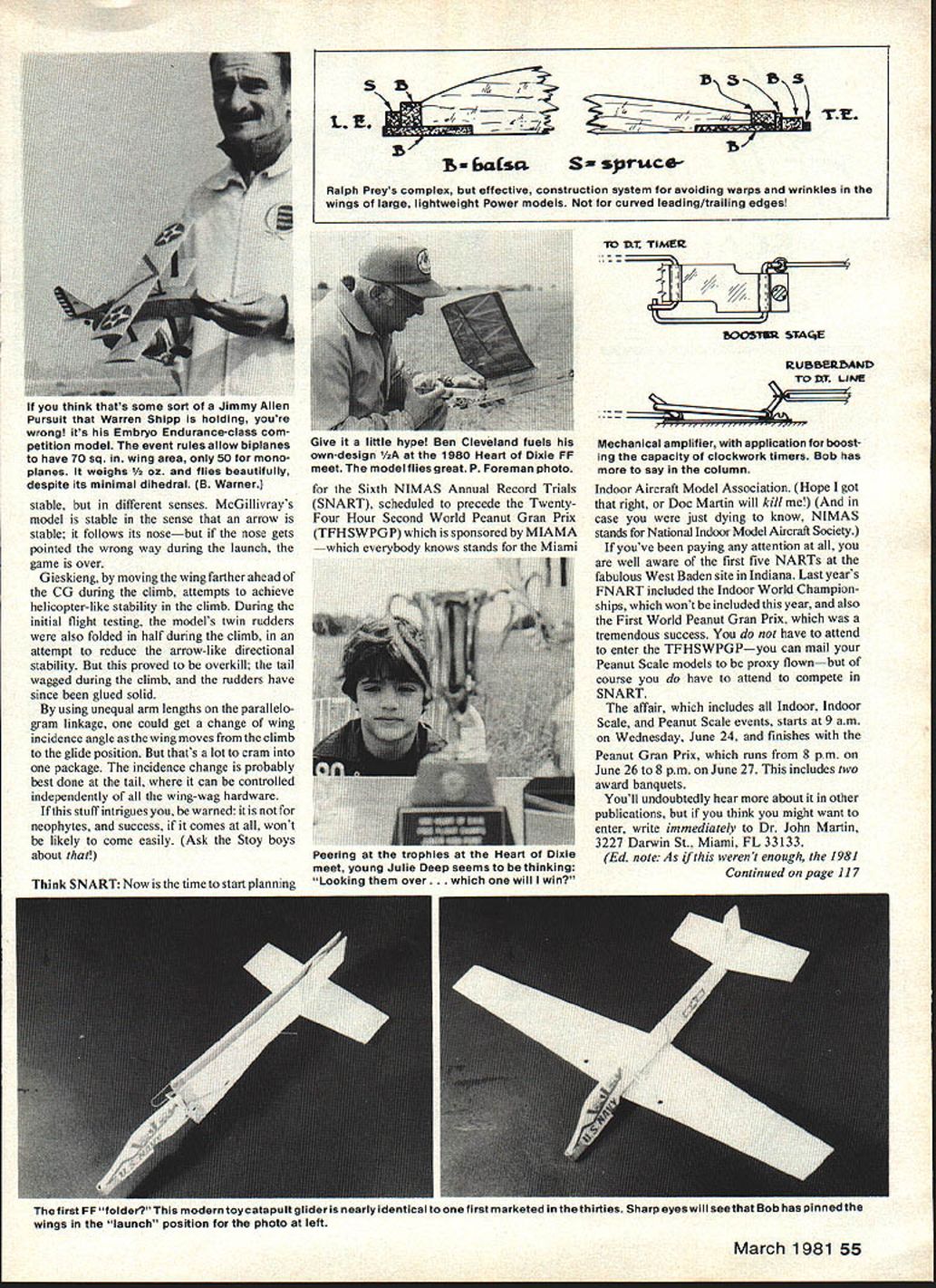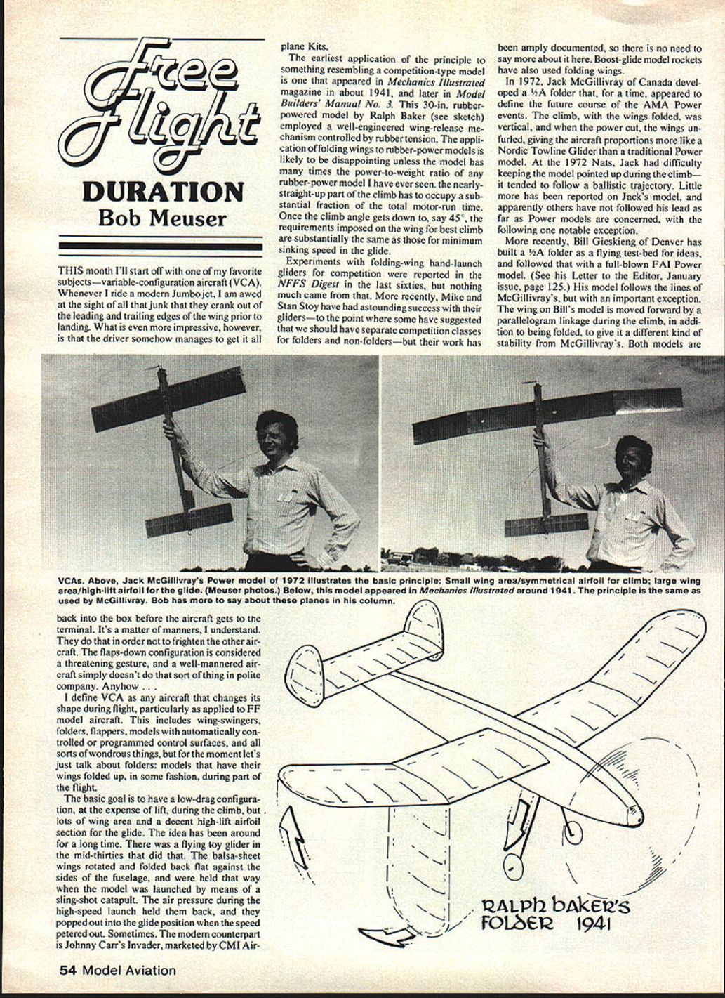 DURATION Bob Meuser THIS month Ill start off favorite subjectsvariable-configuration aircraft VCA Whenever ride modern Jumbo jet am awed sight junk crank Out leading trailing edges wing prior landing What impressive however driver somehow manages get plane Kits earliest application principle something resembling competition-type model appeared Mechanics Illustrated magazine about 1941 later Model Builders Manual No 3 30-in rubberpowered model Ralph Baker see sketch employed well-engineered wing-release chanism controlled rubbertension appli cation folding wings rubber-power models likely disappointing unless model has times power-to-weight ratio rubber-power model have ever seen nearlystraight-up part climb has occupy sub stantial fraction total motor-run time Once climb angle gets down say 450 requirements imposed wing best climb substantially same minimum sinking speed glide Experiments folding-wing hand-launch gliders competition reported NFFS Digest last sixties nothing much came recently Mike Stan Stoy have astounding success glidersto point some have suggested should have separate competition classes folders non-foldersbut work has amply documented no need say about Boost-glide model rockets have also used folding wings 1972 Jack McGillivray Canada devel oped folder time appeared define future course AMA Power events climb wings folded vertical power cut wings un furled giving aircraft proportions like Nordic Towline Glider traditional Power model 1972 Nats Jack difficulty keeping model pointed up during climb tended follow ballistic trajectory Little has reported Jacks model apparently others have followed lead far Power models concerned following notable exception recently Bill Gieskieng Denver has built folder flying test-bed ideas followed full-blown FAI Power model See Letter Editor January issue page 125 model follows lines McGillivrays important exception wing Bills model moved forward parallelogram linkage during climb addi tion being folded give different kind stability McGillivrays Both models VCAs Above Jack McGillivrays Power model 1972 illustrates basic principle Small wing area/symmetrical airfoil climb large wing area/high-lift airfoil glide Meuser photos Below model appeared Meahan/cs Illustrated around 1941 principle same used McGillivray Bob has say about planes column / / / / N back box before aircraft gets tfle terminal Its matter manners understand order frighten other air craft flaps-down configuration considered threatening gesture well-mannered air craft simply doesnt sort thing polite company Anyhow. define VCA aircraft changes its shape during flight particularly applied FF model aircraft includes wing-swingers folders flappers models automatically con trolled programmed control surfaces sorts wondrous things moment lets just talk about folders models have wings folded up some fashion during part flight basic goal have low-drag configura tion expense lift during climb lots wing area decent high-lift airfoil section glide idea has around long time flying toy glider mid-thirties did balsa-sheet wings rotated folded back flat against sides fuselage held way model launched means sling-shot catapult air pressure during high-speed launch held back popped out glide position speed petered out Sometimes modern counterpart Johnny Carrs Invader marketed CMI Air\NfjY ZALPh bAkiizS rouSe 1941 54 Model Aviation stable different senses McGillivrays model stable sense arrow stable follows its nosebut nose gets pointed wrong way during launch game over Gieskieng moving wing farther ahead CG during climb attempts achieve helicopter-like stability climb During initial flight testing models twin rudders also folded half during climb attempt reduce arrow-like directional stability proved overkill tail wagged during climb rudders have since glued solid using unequal arm lengths parallelo gram linkage could get change wing incidence angle wing moves climb glide position thats lot cram package incidence change probably best done tail can controlled independently wing-wag hardware stuff intrigues warned neophytes success comes wont likely come easily Ask Stoy boys about Think SNART Now time start olannine 47BS S 11 B basa S ce Ralph Preys complex effective construction system avoiding warps wrinkles wings large lightweight Power models curved leading/trailing edges Sixth NIMAS Annual Record Trials SNART scheduled precede TwentyFour Hour Second World Peanut Gran Prix TFHSWPGP sponsored MIAMA everybody knows stands Miami 0 UT TIME IOO51 STAC4E RUBBEAAND TOXZt LINE Mechanical amplifier application boost ing capacity clockwork timers Bob has say column Indoor Aircraft Model Association Hope got right Doc Martin will kill case just dying know NIMAS stands National Indoor Model Aircraft Society youve paying attention well aware first five NARTs fabulous West Baden site Indiana Last years FNART included Indoor World Champion ships wont included year also First World Peanut Gran Prix tremendous success have attend enter TFHSWPGPyou can mail Peanut Scale models proxy flownbut course have attend compete SNART affair includes Indoor Indoor Scale Peanut Scale events starts 9 am Wednesday June 24 finishes Peanut Gran Prix runs 8 pm June 26 8 pm June 27 includes two award banquets Youll undoubtedly hear about other publications think might want enter write immediately Dr John Martin 3227 Darwin St Miami FL 33133 Ed note As werent enough 1981 Continued page 117 first FF folder modern toycatapult glider nearly identical tirst marketed thirties sharp eyeswill see max uoo nsa pinneu inc wings launch position photo left March 1981 55 think thats some sort Jimmy Allen Pursuit Warren Shipp holding youre wrong its Embryo Endurance-class com petition model event rules allow biplanes have 70 sq wing area 50 mono planes weighs lies beautifully despite its minimal dihedral B Warner Give little hype Ben Cleveland fuels own-design 1/zA i980 Heart Dixie FF meet model flies great P Foreman photo Peering trophi