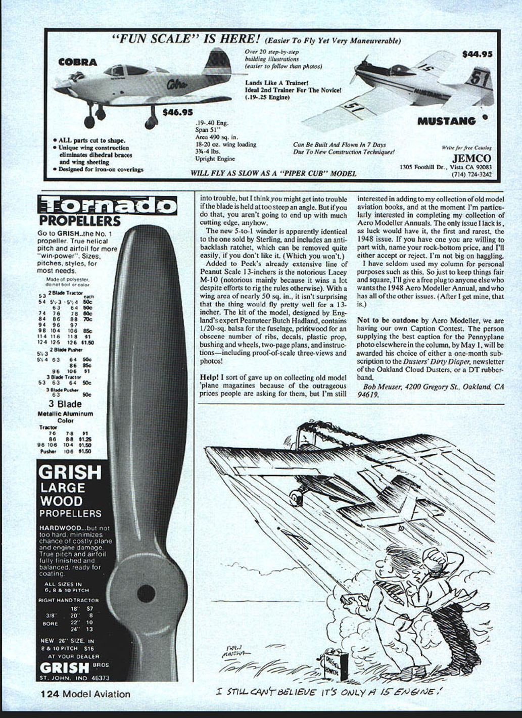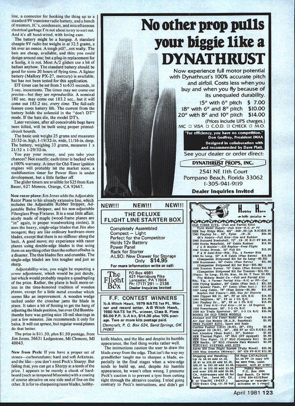 FCC FlighE Duration Bob Meuser MEUSINGS A lot has said both visible underground model aviation press concerning new 1980-81 Easy B rules affectionately called Botched B Bungled B etc event nobody wanted True would have nice AMA rules Easy B reflected what everyone wanted rules wishful thinking best has nothing controversy over rules Easy B since invented would helpful f modelers would pay attention rules proposals inform theirEF Contest Boards opinions key point seems have missed People seem assuming inasmuch official Easy B event rule book must fly Easy B event according rules simply true Any rules can specified contest organizers care specify provided safety compromised official AMA-sanctioned meet meet could event old Easy B new Easy B both Absolutely nothing has taken away 1980-81 rules wasnt official traditional Easy B event before isnt now What has added totally new official AMA Indoor event unfortunately perhaps called Easy B Inasmuch Indoor community has taken delight having sorts crazy events categories set official records would think would wringing hands glee rather anguish ample evidence some contest organizers aware point annual US Free Flight Championships AMA Gas 7ig6t cftm Engines K&-B ft535 Prop Kc1% 61-4#zss 200 Wash Out t~S 717as~ r4y/it wing i 1fr odwn thrust mCms I2AW1 1025 f-sf I1~ events held under old VTO rules official AMA rules isnt club country flies either Indoor Outdoor Flying Scale Peanut events entirely according AMA rules AMA Nats holds nonAMA-rule events official Nats events despite being specf1cally prohibited AMA rule book despite annual bitching AMA Nats Planning Committee via AMA Headquarters about AMA ignoring its own rules Ed note Bob refers case 1977 Nats Easy B flown different set rules Provisional rules AMA rule book RMcM Based precedent see no reason traditional Easy B event could held future Nats official Nats event instead official rule book Easy B event provided right people lean hard enough right people So own thing quit bellyaching Easy-B types youre ahead dont seem know Boeing Management Association Contest Scholarship prizes worth $3500 plus trophies admiration peers should sufficient incentiveif under 19 years /043 00 837 50 159 426 age July 11 1981to take whack annual event wide range events Free Flight Control Line Rocket addition two Specialty events RC Sailplane Design Craftsmanship way rigged dont stand much chance winning scholarship fly category two categories will quite nicely Historically Free Flighters have done rather well Usually some special arrangements have made putting up contestants parents unable accompany old folks havent ignored will awardsbut big moneyfor Open-class fliers too Interested Check Boeing Manage ment Assoc Attn Ted Caputo Org 4-1800 Mail Stop 63-10 P0 Box 3707 Seattle WA 98124 Covering flimsy wings following hint hobbyist comes Paul Mcllrath designer Sigs Customaire Cabinaire 29er kits Covering flimsy indoor wing panel can difficult because light tissue condenser paper tends pull down wrinkle between ribs whenever chordwise tension applied have trouble like try laying strip 56 Model Aviation Biplane ornithopter uIck uaxter dreamed up wing rigid although top has dihedral Photo right gives general idea flap Upper-right lower-left panels go up/down unison ditto opposite panels Nose boom holds balance weighta clear case using whatever works Bill Warner photos single-function device Meuser photo writing paper about h chord over frame before covering Curl paper slightly matches curve ribs lay tissue right over Youll find covering can pulled quite tight buckling Attach tissue leading trailing edges first slide writing paper endwise just far enough permit attaching tissue rib end Finally slip support completely Out dope covering other end rib Removing supporting paper will also leave little slack front-to-rear reducing warp ing tendencies paper tightens age system should work straight-tapers well constant-chord wings Sorry no ellipses Just sure have clear path slide paper out end panel other Witch Hawks Although rather new Free Flight scene Jim Clems Witch Hawk has made rather impressive dent system hands Bill Dunlop Bill Jenkins Smaller versions shown first 2A Nats setting national record hands Bill Jenkins Dunlop took fifth 1980 Nats addi tion hiizlt placins thc Y2A ver sion Dunlop took first lass B settin record Jenkins took fifth both 500 version simple model well flown about Bauer timer Bauer Electronic Timer No 2240 Sorry didnt report previous 2239 versions breaks designing timer Ken Bauer following goals mind few moving parts fail safe towline breaks bats poop out anything else goes awry thing must DT greater accuracy mechanical timers despite heat cold moisture dirt dark night small size weight fit conveniently Nordic A/2 Glider fuselage no cleaning servicing required except battery replacement Ken seems have achieved goals have put the thing perspective Continued page 122 J ~ OR CURVE R COVERING AID FOR LIGHTWEIGHTS simple typing-paper shield allows Paul Mcllrath cover Indoor models very light tissue getting usual wrinkles between ribs info column April1981 57 Prototype Bauer Electronic DT Timer No 2240 see textl Metal Jim Jones new Adjustable Razor Plane info price column rectangle right attached DT-line Magnetic forces hold place modified relay coil until electric power interrupted either electronic timer unit center battery failure miniswitch timer unit allows desired actuation time coded Switch unitat left resetsthetimerwheneverthere tug thetowline David Hagen doesnt look too serious about new Pennyplane-class Indoor modeI its because isntt photo opens new Write-a-Caption Contest Details column Entry deadline May 1 1981 Meuser photo New Peck-Polymers mini-sharpening stone looks like must item serious modelers razor blades hobby-knife blades Good scissors fish hooks too Read column Bob Diefenderfer know get picture ot favorite model column Emma Jane Shealer restrains old-time Sniffer FF us Bobfliesitw