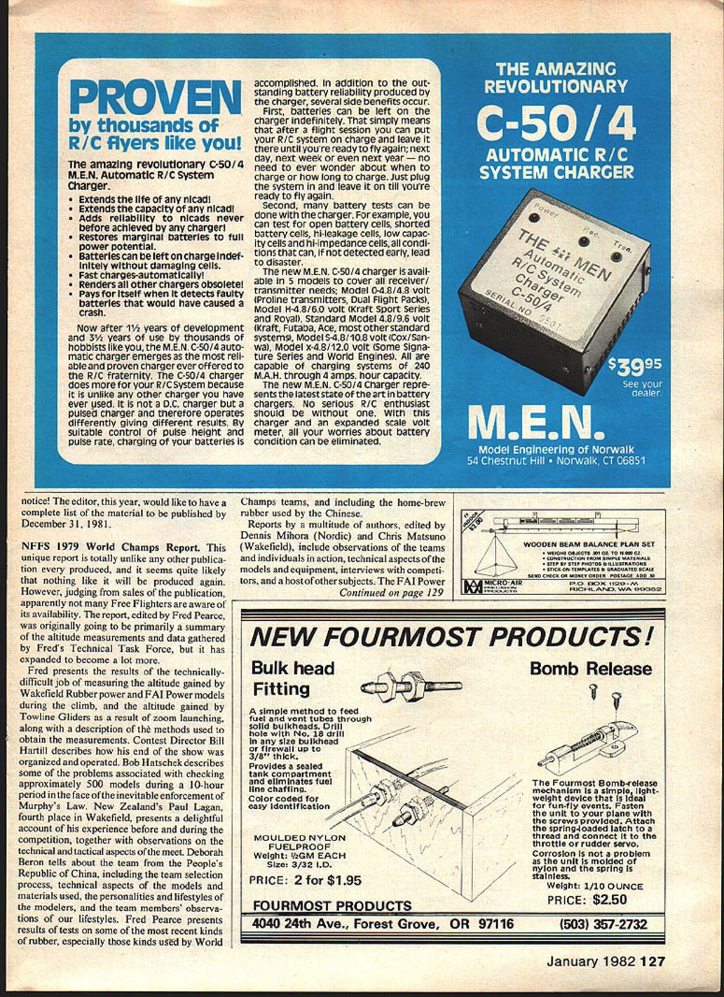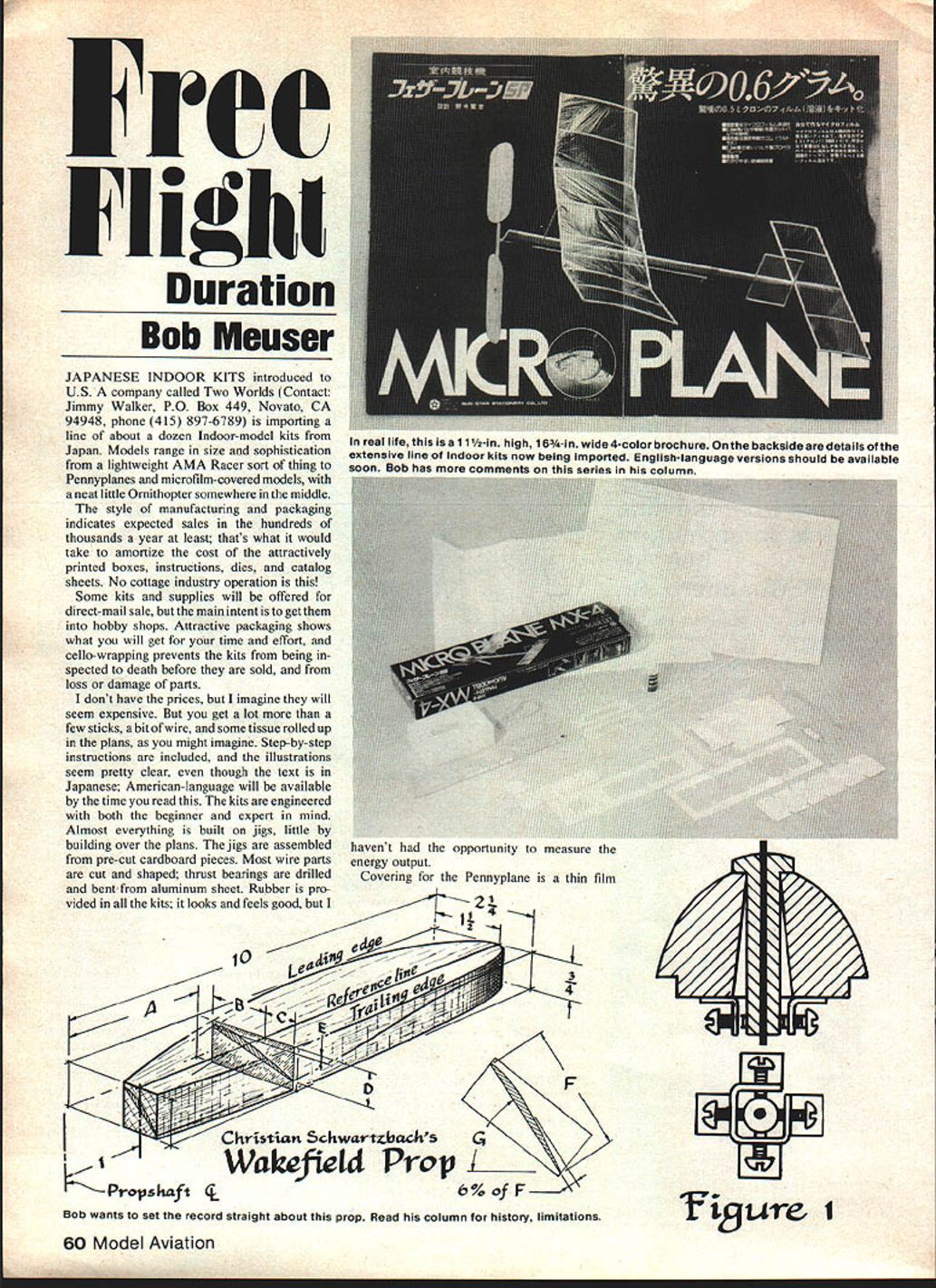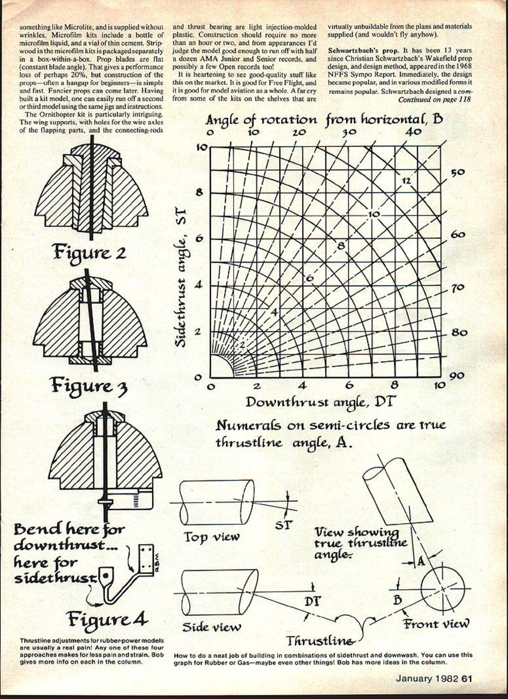 Fee Flight Duration Bob Meuser JAPANESE INDOOR KITS introduced US company called Two Worlds Contact Jimmy Walker PO Box 449 Novato CA 94948 phone 415 897-6789 importing line about dozen Indoor-model kits Japan Models range size sophistication lightweight AMA Racer sort thing Pennyplanes microfilm-covered models neat little Ornithopter somewhere middle style manufacturing packaging indicates expected sales hundreds thousands year least thats what would take amortize cost attractively printed boxes instructions dies catalog sheets No cottage industry operation Some kits supplies will offered direct-mail sale main intent get hobby shops Attractive packaging shows what will get time effort cello-wrapping prevents kits being spected death before sold loss damage parts dont have prices imagine will seem expensive get lot few sticks bit wire some tissue rolled up plans might imagine Step-by-step instructions included illustrations seem pretty clear though text Japanese American-language will available time read kits engineered both beginner expert mind Almost everything built jigs little building over plans jigs assembled pre-cut cardboard pieces Most wire parts cut shaped thrust bearings drilled bent aluminum sheet Rubber pro vided kits looks feels good naven t energy output Covering Pennyplane thin film Ckristian Sckwar-tzbadis Wakefield Prop Props kaft 1 Bob wants set record straight about prop Read column history limitations Fi8tsre- 1 60 Model Aviation real life 1/z-in high 1 6-in wide 4-color brochure backside details extensive line Indoor kits now being imported English-language versions should available Q*flfl Rnk line main something like Microlite supplied wrinkles Microfilm kits include bottle microfilm liquid vial thin cement Stripwood microfilm kits packaged separately box-within-a-box Prop blades flat constant blade angle gives performance loss perhaps 20% construction propsoften hangup beginnersis simple fast Fancier props can come later Having built kit model can easily run off second third model using same jigs instructions Ornithopter kit particularly intriguing wing supports holes wire axles flapping parts connecting-rods Fiurc 2 P thrust bearing light injection-molded plastic Construction should require no hour two appearances Id judge model good enough run off half dozen AMA Junior Senior records possibly few Open records too heartening see good-quality stuff like market good Free Flight good model aviation whole far cry some kits shelves 6 0 6 III virtually unbuildable plans materials supplied wouldnt fly anyhow Schwartz bachs prop has 13 years since Christian Schwartzbachs Wakefield prop design design method appeared 1968 NFFS Sympo Report Immediately design became popular various modified forms remains popular Schwartzbach designed cornContinued page 118 30 II / 50 6o 70 42 / 0 Yi8ure3 0 z 4 6 6Ia 90 N / Downtl2ii-ust an8e- 3YF NuincraCs semi-cu-des truc tirustii tzuzi9z# bend fierST wnthrust. Fwre s idet Iwrtss FQunr 4 Thrustline adjustments rubber-power models usually real pain Any four approaches makes less pain strain Bob gives info column Top ieWu 1I av10CeA t vcv Tfirwstine 5icfe View neat job building combinations sidethrust downwash can use graph Rubber Gasmaybe other things Bob has ideas column January 1982 61 Anc rotation front krizonta b 010La40 [%i77 R/C MULTI ENGINES SYSTEMS THESE SUPERB NEW G-MARK THROTTLE-EQUIPPED MULTI-CYLINDER R/C ENGINES OFFER SCALE APPEARANCE & PERFORMANCE ALL ARE EASY STARTING WITU OTH OPERATION & EXCELLENT TOP END POWER $29500 305 5CYL R/C 30 R/C TWIN SCHNEURLE PORTING THROTTLE MUFFLER AND BALL BEARINGS STD ALL ENGINES1319 OL 495 OZGLOW PLUGS NOT INCLUDED2500-15000 RPMI SHIPPING & HANDLING $300 20% DEPOSIT ON yJ5COD ORDERS CALIF RESIDENTS ADD SALES TAX. COMPLETE R/C BROCHURE 50 U S $150 FOREIGN 13400-26 Saticoy StreetNorth Hollywood Calif 91605213 764-1488J [v32][b-2-10-1-10]] up foam wood salvage kit Mount wheels engine propeller balance model indicated plan important step dont skip Add weight required get balance Check model warps Steam will work remove slight warps balsa sheet wings Hold wing flat pass over steam Keep holding wing flat until wood cools room temperature warp should come out Repeat necesary Adding out-thrust engine may also help make first flight successful suggest get set 35-ft steel lines flying SE-S models fly much better steel lines dacron last much longer too Pick calm day test fly SE-5 ready spend lot time flying original model has flown exhaustion having flown weekiy several years hope will enjoy much have Show & Tell/Shepherd Continued page 59 other hand crowd control must space limitations unpredictable flight pat tern Indoor models means audience gets strict instructions handle model lands near 36 shows three models have ever damaged needed extensive repair think thats excellent record believe hobby desperately needs youngsters like tomorrows builders competitors Unless encourage give attention deserve may no tomorrow modeling believe complex glamorous models advanced modelers anxious show off discourage youthful builders es pecially attempt before success possible lectures have tried return some dignity glamour simple fun-flying models go beyond show tell stage local modelers teachers parents have follow up capture enthusiasm hope continue programs other nearby towns cities encourage other modelers begin programs similar anyone would like information about start such program Ill glad assist way possible Jesse F Shepherd 2713 Summit View Bedford TX 76021 FF Duration/Meuser Continued page 61 bination blade shape pitch distribution supposed give blade-loading distri bution close ideal Other combinations presumably would have done well example helical pitch blade shape designed match might have performed well have no idea what blade shape would have might bit grotesque designers outstanding models have used Schwartzbach pitch distribution own blade shape course blows whole thing its combination counts blade sh