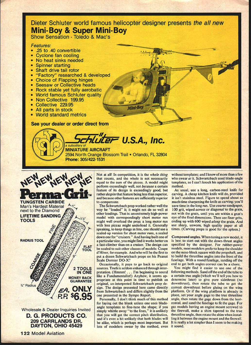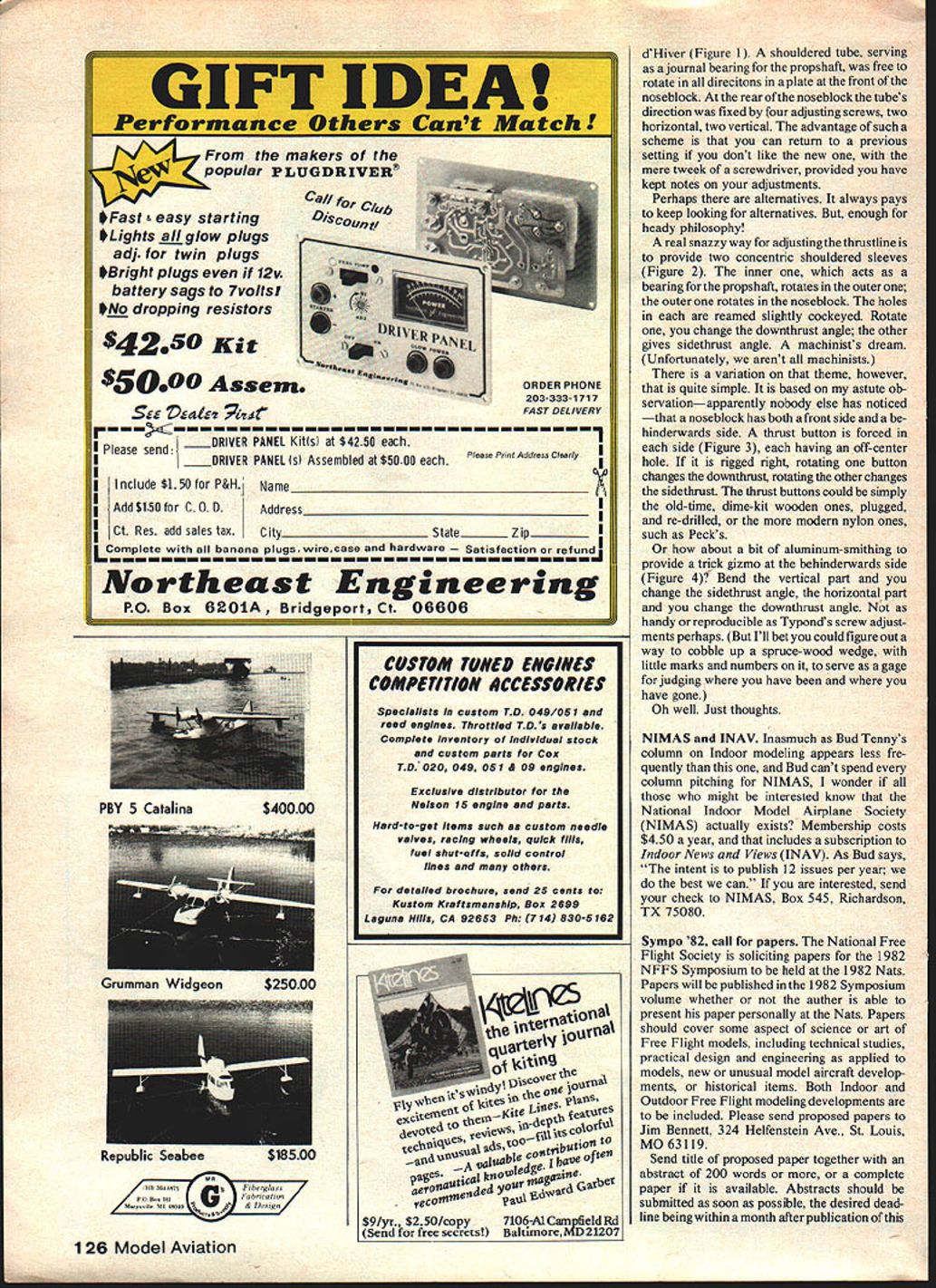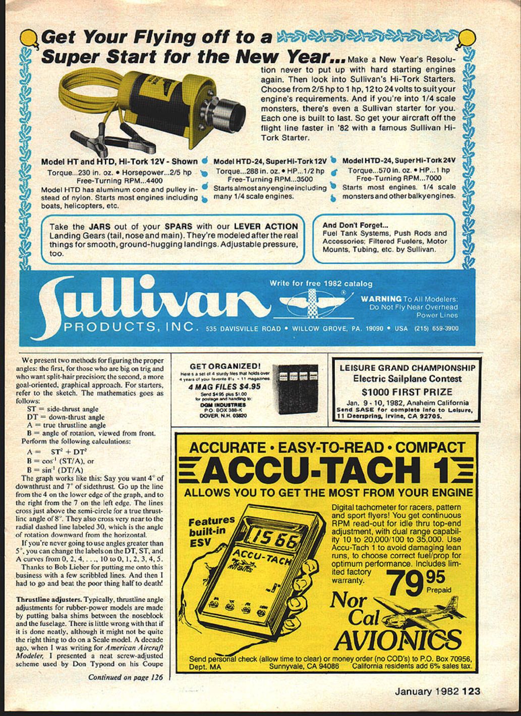 Fee Flight Duration Bob Meuser JAPANESE INDOOR KITS introduced US company called Two Worlds Contact Jimmy Walker PO Box 449 Novato CA 94948 phone 415 897-6789 importing line about dozen Indoor-model kits Japan Models range size sophistication lightweight AMA Racer sort thing Pennyplanes microfilm-covered models neat little Ornithopter somewhere middle style manufacturing packaging indicates expected sales hundreds thousands year least thats what would take amortize cost attractively printed boxes instructions dies catalog sheets No cottage industry operation Some kits supplies will offered direct-mail sale main intent get hobby shops Attractive packaging shows what will get time effort cello-wrapping prevents kits being spected death before sold loss damage parts dont have prices imagine will seem expensive get lot few sticks bit wire some tissue rolled up plans might imagine Step-by-step instructions included illustrations seem pretty clear though text Japanese American-language will available time read kits engineered both beginner expert mind Almost everything built jigs little building over plans jigs assembled pre-cut cardboard pieces Most wire parts cut shaped thrust bearings drilled bent aluminum sheet Rubber pro vided kits looks feels good naven t energy output Covering Pennyplane thin film Ckristian Sckwar-tzbadis Wakefield Prop Props kaft 1 Bob wants set record straight about prop Read column history limitations Fi8tsre- 1 60 Model Aviation real life 1/z-in high 1 6-in wide 4-color brochure backside details extensive line Indoor kits now being imported English-language versions should available Q*flfl Rnk line main something like Microlite supplied wrinkles Microfilm kits include bottle microfilm liquid vial thin cement Stripwood microfilm kits packaged separately box-within-a-box Prop blades flat constant blade angle gives performance loss perhaps 20% construction propsoften hangup beginnersis simple fast Fancier props can come later Having built kit model can easily run off second third model using same jigs instructions Ornithopter kit particularly intriguing wing supports holes wire axles flapping parts connecting-rods Fiurc 2 P thrust bearing light injection-molded plastic Construction should require no hour two appearances Id judge model good enough run off half dozen AMA Junior Senior records possibly few Open records too heartening see good-quality stuff like market good Free Flight good model aviation whole far cry some kits shelves 6 0 6 III virtually unbuildable plans materials supplied wouldnt fly anyhow Schwartz bachs prop has 13 years since Christian Schwartzbachs Wakefield prop design design method appeared 1968 NFFS Sympo Report Immediately design became popular various modified forms remains popular Schwartzbach designed cornContinued page 118 30 II / 50 6o 70 42 / 0 Yi8ure3 0 z 4 6 6Ia 90 N / Downtl2ii-ust an8e- 3YF NuincraCs semi-cu-des truc tirustii tzuzi9z# bend fierST wnthrust. Fwre s idet Iwrtss FQunr 4 Thrustline adjustments rubber-power models usually real pain Any four approaches makes less pain strain Bob gives info column Top ieWu 1I av10CeA t vcv Tfirwstine 5icfe View neat job building combinations sidethrust downwash can use graph Rubber Gasmaybe other things Bob has ideas column January 1982 61 Anc rotation front krizonta b 010La40 [%i77 R/C MULTI ENGINES SYSTEMS THESE SUPERB NEW G-MARK THROTTLE-EQUIPPED MULTI-CYLINDER R/C ENGINES OFFER SCALE APPEARANCE & PERFORMANCE ALL ARE EASY STARTING WITU OTH OPERATION & EXCELLENT TOP END POWER $29500 305 5CYL R/C 30 R/C TWIN SCHNEURLE PORTING THROTTLE MUFFLER AND BALL BEARINGS STD ALL ENGINES1319 OL 495 OZGLOW PLUGS NOT INCLUDED2500-15000 RPMI SHIPPING & HANDLING $300 20% DEPOSIT ON yJ5COD ORDERS CALIF RESIDENTS ADD SALES TAX. COMPLETE R/C BROCHURE 50 U S $150 FOREIGN 13400-26 Saticoy StreetNorth Hollywood Calif 91605213 764-1488J [v32][b-2-10-1-10]] up foam wood salvage kit Mount wheels engine propeller balance model indicated plan important step dont skip Add weight required get balance Check model warps Steam will work remove slight warps balsa sheet wings Hold wing flat pass over steam Keep holding wing flat until wood cools room temperature warp should come out Repeat necesary Adding out-thrust engine may also help make first flight successful suggest get set 35-ft steel lines flying SE-S models fly much better steel lines dacron last much longer too Pick calm day test fly SE-5 ready spend lot time flying original model has flown exhaustion having flown weekiy several years hope will enjoy much have Show & Tell/Shepherd Continued page 59 other hand crowd control must space limitations unpredictable flight pat tern Indoor models means audience gets strict instructions handle model lands near 36 shows three models have ever damaged needed extensive repair think thats excellent record believe hobby desperately needs youngsters like tomorrows builders competitors Unless encourage give attention deserve may no tomorrow modeling believe complex glamorous models advanced modelers anxious show off discourage youthful builders es pecially attempt before success possible lectures have tried return some dignity glamour simple fun-flying models go beyond show tell stage local modelers teachers parents have follow up capture enthusiasm hope continue programs other nearby towns cities encourage other modelers begin programs similar anyone would like information about start such program Ill glad assist way possible Jesse F Shepherd 2713 Summit View Bedford TX 76021 FF Duration/Meuser Continued page 61 bination blade shape pitch distribution supposed give blade-loading distri bution close ideal Other combinations presumably would have done well example helical pitch blade shape designed match might have performed well have no idea what blade shape would have might bit grotesque designers outstanding models have used Schwartzbach pitch distribution own blade shape course blows whole thing its combination counts blade sh
