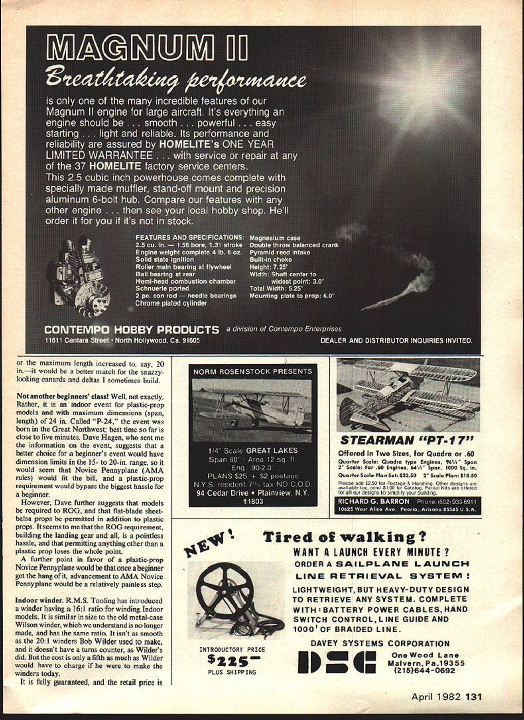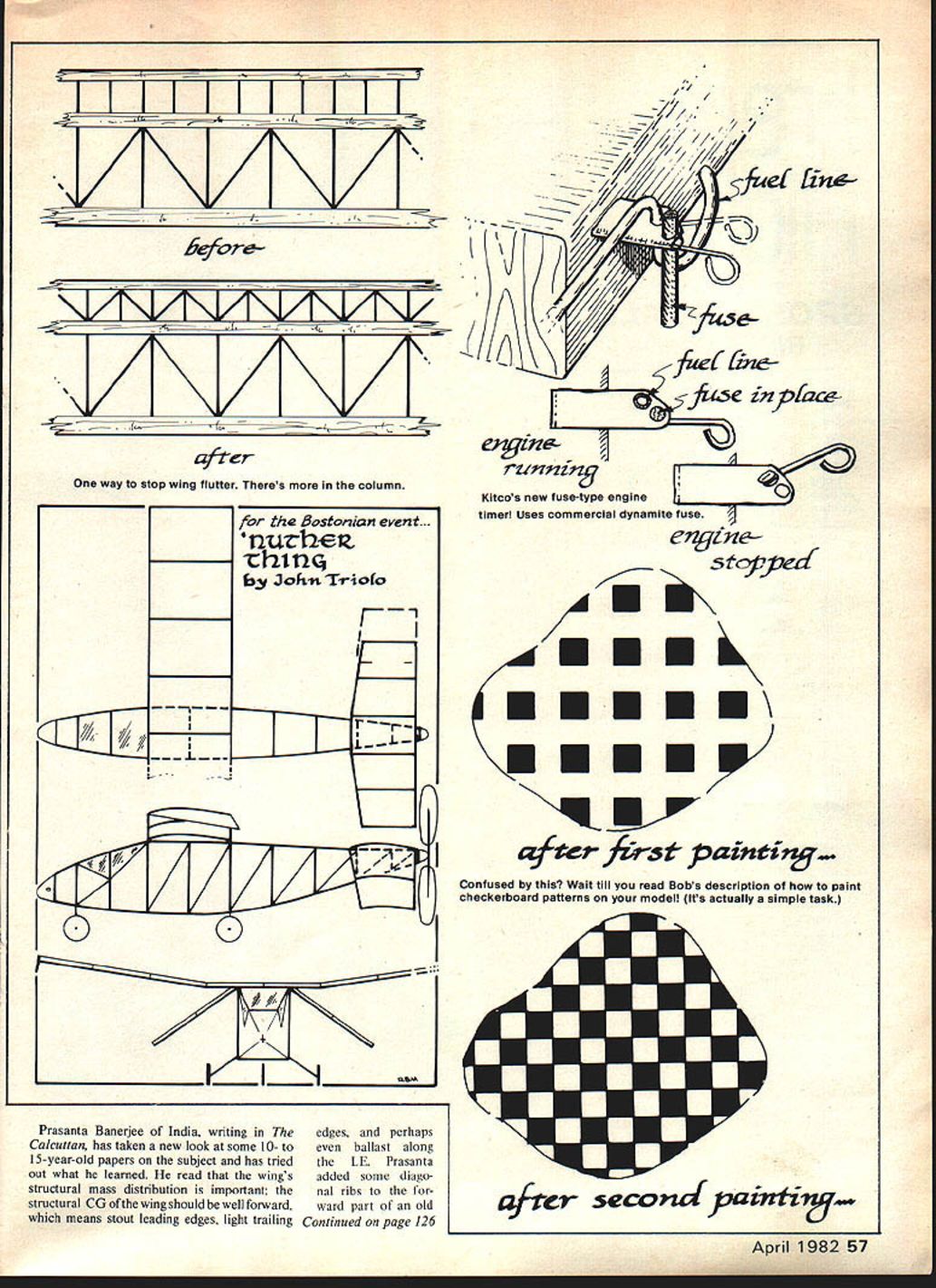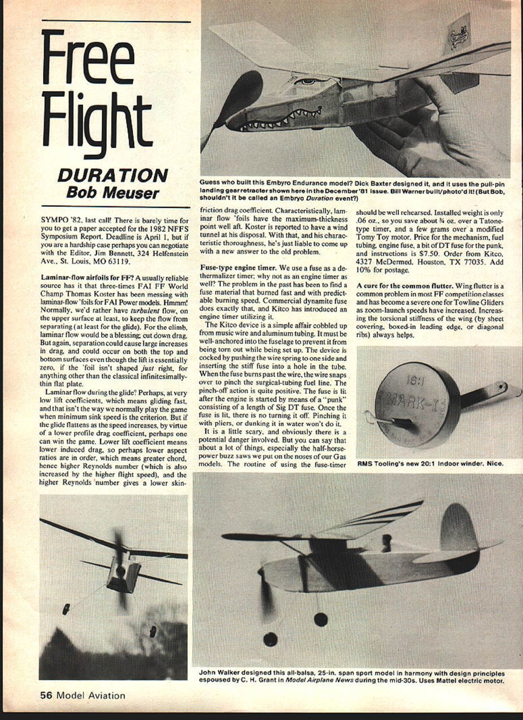 Free Flight DURA TION Bob Meuser SYMPO 82 last call barely time get paper accepted 1982 NFFS Symposium Report Deadline April 1 hardship case perhaps can negotiate Editor Jim Bennett 324 Helfenstein Ave St Louis MO 63119 Laminar-flow airfoils FF7 usually reliable source has three-times FAI FF World Champ Thomas Koster has messing laminar-flow foils FAI Power models Hmnim Normally wed rather have turbulent flow upper surface least keep flow separating least glide climb laminar flow would blessing cut down drag again separation could cause large increases drag could occur both top bottom surfaces though lift essentially zero foil isnt shaped just right anything other classical infinitesimallythin flat plate Laminar flow during glide Perhaps very low lift coefficients means gliding fast isnt way normally play game minimum sink speed criterion glide flattens speed increases virtue lower profile drag coefficient perhaps can win game Lower lift coefficient means lower induced drag perhaps lower aspect ratios order means greater chord hence higher Reynolds number also increased higher flight speed higher Reynolds number gives lower skinfriction drag coefficient Characteristically lam mar flow foils have maximum-thickness point well aft Koster reported have wind tunnel disposal charac teristic thoroughness hes just liable come up new answer old problem Fuse-type engine timer use fuse de thermalizer timei- engine timer well problem past has find fuse material burned fast predict able burning speed Commercial dynamite fuse does exactly Kitco has introduced engine timer utilizing Kitco device simple affair cobbled up music wire aluminum tubing must well-anchored fuselage prevent being torn out being set up device cocked pushing wire spring side inserting stiff fuse hole tube fuse burns past wire wire snaps over pinch surgical-tubing fuel line pinch-off action quite positive fuse lit after engine started means punk consisting length Sig DT fuse Once fuse lit no turning off Pinching pliers dunking water wont little scary obviously potential danger involved can say about lot things especially half-horse power buzz saws put noses Gas models routine using fuse-timer should well rehearsed Installed weight 06 oz save about ver Tatone type timer few grams over modified Tomy Toy motor Price mechanism fuel tubing engine fuse bit DT fuse punk instructions $750 Order Kitco 4327 McDermed Houston TX 77035 Add 10% postage cure common flutter Wing flutter common problem FF competition classes has become severe Towline Gliders zoom-launch speeds have increased Increas ing torsional stiffness wing sheet covering boxed-in leading edge diagonal ribs always helps 56 Model Aviation Guess built Embyro Endurance model Dick Baxter designed it uses pull-pin landing gear retractershown herein December51 Issue Bill Warnerbuilt/photod Bob shouldnt called Embryo Duration event aunn waiter oesigneo hub all-odisa O-n pa bPUIL Ih1UUU nierniony WILfl UUbIfl PIflUIPIUb espoused C H Grant ModelAirplane News during mid-30s Uses Mattel electric motor IIII1F1 ILI7Q before/ / __ /fr -. 7TA /J-______ -— -------------/ __________________________7 I/i / - Lin& fti4sein _EQL22c& way stop wing after flutter Theres column 0 Kitcos new fuse-type engine timer Uses commercial dynamite fuse Bostonian event. nuvhEtze7ifjtn&tI2tn 5topped 3ohnTroIo I--A II/ EEh\\ m U /4 //iU iI i--i #terfrst painting. Confused Wait till read Bobs description paint checkerboard patterns model Its actually simple task U. Prasanta Banerjee India writing Theedges perhaps33 Calcuttan has taken new look some 10- toeven bailast along 15-year-old papers subject has triedthe LE Prasanta out what learned read wingsadded some diago structural mass distribution important thenal ribs forsecond parntit~ structural CGofthewingshouldbeweilforwardward part oldCt means stout leading edges light trailing Continued page 126 Li11tNT April 1982 57 AUEE Look Future Product DeveIopmen Full Command Systems Manufacturers EK Logitrol radios accessories py eai Dealer Inquiries Welcome Full Command Systems 9O8ERo sewood Spokane WA 99207 . 509 487-2122 414 90 1 r CaQtcg213 76 JIceceggoktcgPO BOX R/C GOODIES 192 S VAN NUYS CA 91408I month 3uvdia offering SPECIAL PRICES several accessory items RegularI 1prices shown small tvoe BARGAIN PRICES shown heavy typeI VCAPS$895UNIVERSAL SERVO TRAY Hi Visibility 2Color Caps I match 72 MHz Freq Specify size fits 5289 AIR-FLO HINGES21 tray Bantam Connon N OCE3 CE4 CE5 Futaba Kraft KPS12 Midget servos1 mcMtg hardware included C Q FREQUENCY FLAGS j 051 Golden Bee etc Uses Iron Hinges easy chable holder1 standard 1/432 glow pluginstall Strips 36 Ig polyester ribbons $209SMALL 1iLARGE 1 1/2All Frec colors $169$149 $169I Urn$2500$169$199 VISA ORParts Ship 7 Calif add Soles Tax Catalog 604 MORE US $1 70 Foreign Add 4-1/2% Visor Master Cordj heat desired Saran film may painted inside prior application Most spray paint will work will look like expensive factory-painted -glued Mylar films small fraction cost Scotch Monocoat will exclude moisture better before painting Since F&M Saran Wrap softer Mylar does tend get scuffed up bit making landings hard sufface such spots turn up easily repaired bit 5-mm epoxy smeared bad spot might instead put piece Mylar over spot Conclusions seems ridiculous believe piece flimsy highly-flexible easilysquashed piece foam could stiffened given enough strength addition mere paper glue become competitive model airplane begins cover long thin wing instance first thought handling delicate coat might might well try cover wet noodle once foam has taken its paper clothing undergoes transforma tion unlike metamorphosis David Banner turning Hulk say proof pudding eating What will such model competi tion date foam fleet has won nine trophies five contests using first-generation hardware SFC approach has now used success fully several types FF models including Hand-Launched Gliders P-30 Coupe Un limited Rubber models A-i Towline Gliders catapult g