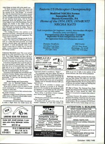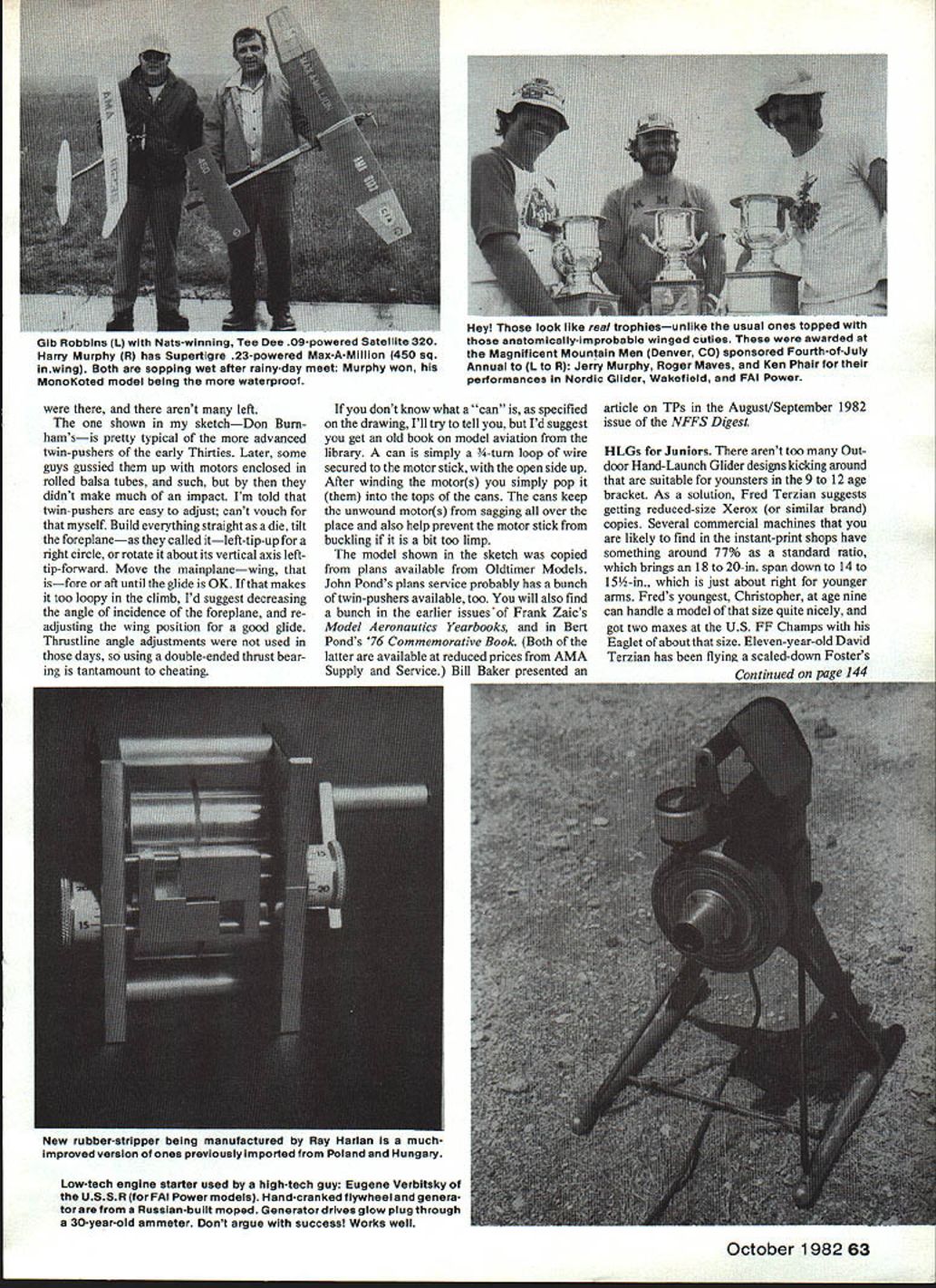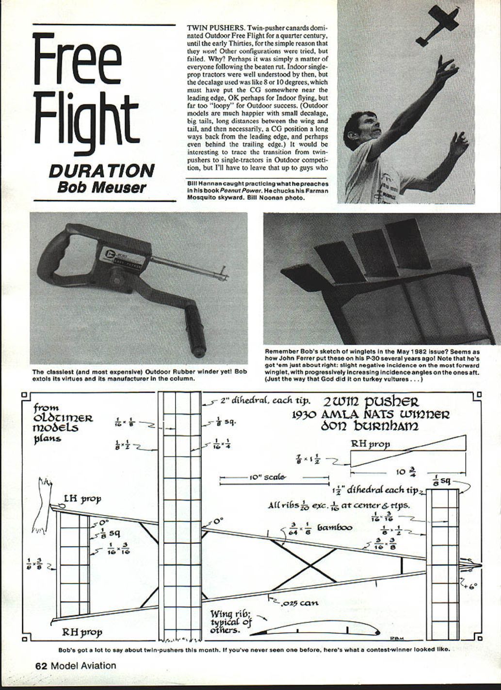 Free Flight DURA TION Bob Meuser ot&rn2EJ moeLs $ans LE Jrop Hprop TWIN PUSHERS Twin-pusher canards domi nated Outdoor Free Flight quarter century until early Thirties simple reason won Other configurations tried failed Perhaps simply matter everyone following beaten rut Indoor singleprop tractors well understood decalage used like 8 10 degrees must have put CG somewhere near leading edge OK perhaps Indoor flying far too loopy Outdoor success Outdoor models much happier small decalage big tails long distances between wing tail necessarily CG position long ways back leading edge perhaps behind trailing edge would interesting trace transition twinpushers single-tractors Outdoor competi tion Ill have leave up guys Bill Hannan caught practicing what preaches book Peanut P0 chucks Farman Mosquito skyward Bill Noonan photo Bobs got lot say about twin-pushers month youve never seen before heres what contest-winner looked like 62 Model Aviation classiest expensive Outdoor Rubber winder yett Bob extols its virtues its manufacturer column Hemember UoDs sketch wingless May 1 9B2 issue Seems John Ferrer put P-30 several years ago Note hes got em lust about right slight negative incidence forward winglet progressively increasing incidence angles ones aft Just way God did turkey vultures - 2 dihecra aich up 2 wrn pushe sq1930 AMLA NATS Wfl2121 6012 bcNflhAn2 RU pro 10 SCO6Ilo lj cfihedraeachtip Mribsk exc atcentr&rLps 0 Winq rib izizzzIziII there arent left shown sketchDon Burnhamsis pretty typical advanced twin-pushers early Thirties Later some guys gussied up motors enclosed rolled balsa tubes such didnt make much impact Im told twin-pushers easy adjust cant vouch myself Build everything straight die tilt foreplaneas called itleft-tip-up right circle rotate about its vertical axis lefttip-forward Move mainplanewing isfore aft until glide OK makes too loopy climb Id suggest decreasing angle incidence foreplane re adjusting wing position good glide Thrustline angle adjustments used days using double-ended thrust bear ing tantamount cheating dont know what can specified drawing Ill try tell Id suggest get old book model aviation library can simply -turn loop wire secured motor stick open side up After winding motors simply pop tops cans cans keep unwound motors sagging over place also help prevent motor stick buckling bit too limp model shown sketch copied plans available Oldtimer Models John Ponds plans service probably has bunch twin-pushers available too will also find bunch earlier issuesof Frank Zaics Model Aeronautics Yearbooks Bert Ponds 76 Commemorative Book Both latter available reduced prices AMA Supply Service Bill Baker oresented article TPs August/September 1982 issue NEES Digest HLGs Juniors arent too Out door Hand-Launch Glider desigus kicking around suitable younsters 9 12 age bracket As solution Fred Terzian suggests getting reduced-size Xerox similar brand copies Several commercial machines likely find instant-print shops have something around 77% standard ratio brings 18 20-in span down 14 15-in just about right younger arms Freds youngest Christopher age nine can handle model size quite nicely got two maxes US FF Champs Eaglet about size Eleven-year-old David Terzian has flying scaled-down Fosters n,op 144 October 1982 63 Gib Robbins L Nats-winning Tee Dee 09-powered Satellite 320 Harry Murphy R has Supertigre 23-powered Max-A-Million 450 sq inwing Both sopping wet after rainy-day meet Murphy won MonoKoted model being waterproof Hey Inose lOOK IIKC real trophiesunlike urnial ones topped anatomically-improbable winged cuties awarded Magnificent Mountain Men Denver CO sponsored Fourth-of-July Annual L R Jerry Murphy Roger Maves Ken Phair performances Nordic Glider Wakefield FAI Power New rubber-stripper being manufactured Ray Harlan muchimproved version ones previously imported Poland Hungary Low-tech engine starter used high-tech guy Eugene Verbitaky USSR FAI Power models Hand-cranked flywheel genera tor Russian-built moped Generator drives glow plug through 30-year-old ammeter Dont argue success Works well following sources can supply very good materials Oldtimer Models PO Box 913 Westmin ster CA 92783 Japanese tissue balsa prop blanks balsa tapered trailing edge stock hard wood balsa wheels brass washers rubber motor rubber lube etc Catalog $100 Peck-Polymers PO Box 2498 La Mesa CA 92401 Japanese tissue plastic props rubber lube rubber motor Williams Bros wheels Catalog $100 Sig Manufacturing Co Inc Route 1 Box 1 Montezuma IA 50171 Sig rubber motor rub ber lube balsa tissue plastic props wheels Catalog $200 FF Duration/Meuser Continued page 63 Freeze now big enough handle fullsize gliders got two mazes third place using Polly Yet another Outdoor Rubber winder price tag baby will knock hat off what doesnt nowadays built Burt Precision headed Mike Di Martino housing hogged out block aluminum alloy anodized blue corrosion skuff re sistance absolutely gorgeous Speed switch set helical gears bearings anti-friction types ball roller needle Bob Piser chio has using prototype several years hitch Helical gears wee bit scarey side essentially amount worm-gear set run wrong direction thats OK aligned lubed properly Larry Parsons built some 40 years ago worked fine about 25 years started binding up turned out lube problem easily cured Burt Precision device lubed Teflon-loaded goop supposed stay put wipe off Let know 25 30 years whether claims true Id like know base price gulp $162 white sidewalls radio air conditioning available slight extra cost Order Burt Precision Bob Piser chio 5257 Stone Court San Diego CA 92115 New rubber-stripper available Most Indoor modelers have rubber-stripper some sort access oneto cut down A-in-wide stuff useful sizes alternative buy pre stripped rubber suppliers caters Indoor Peanut Scale modelers favorite stripper has Czechowski Poland no longer available fill need Ray Harlan manufacturers sorts neat stuff Indoor modelers has started manu facturing According Ray