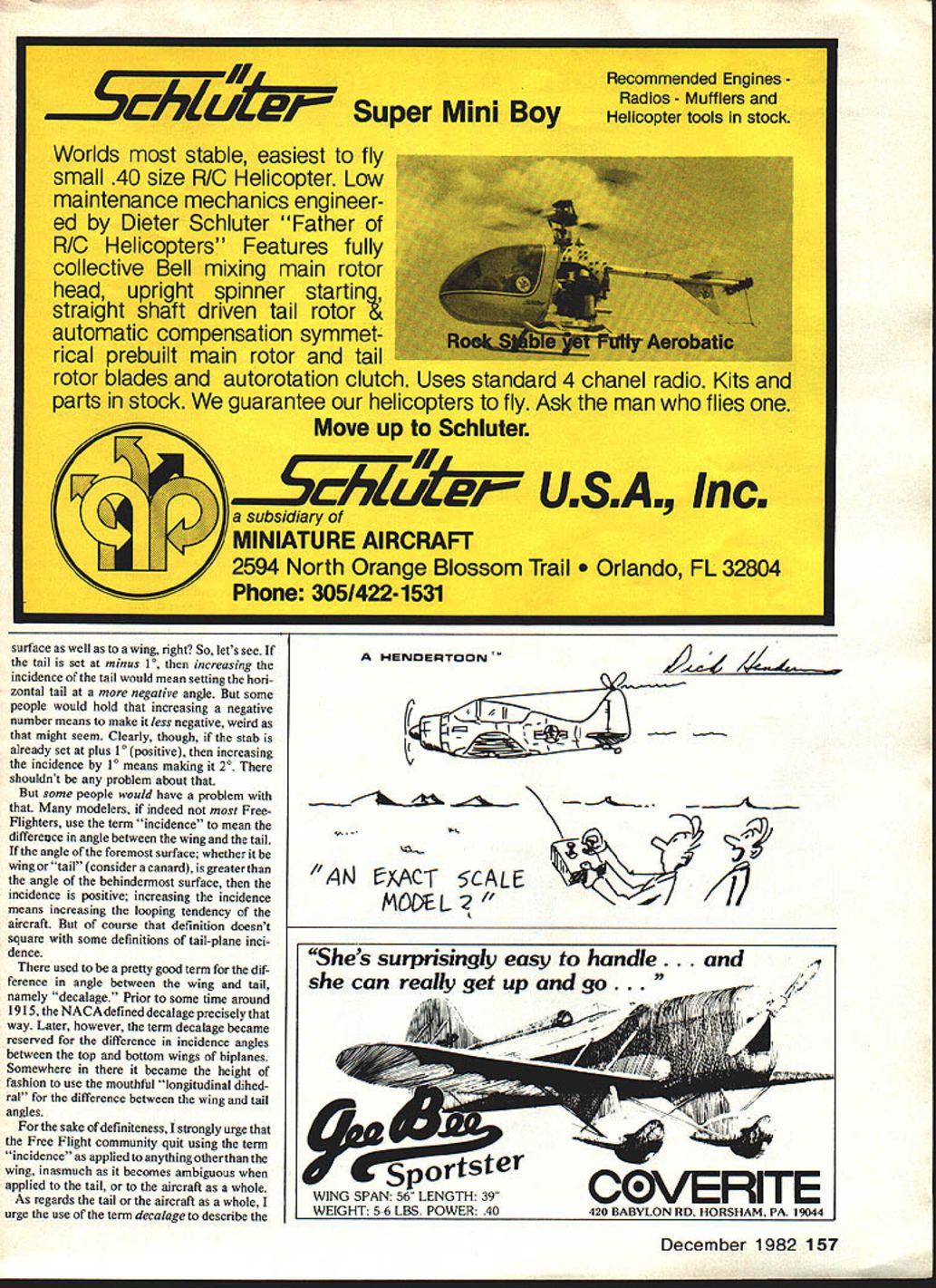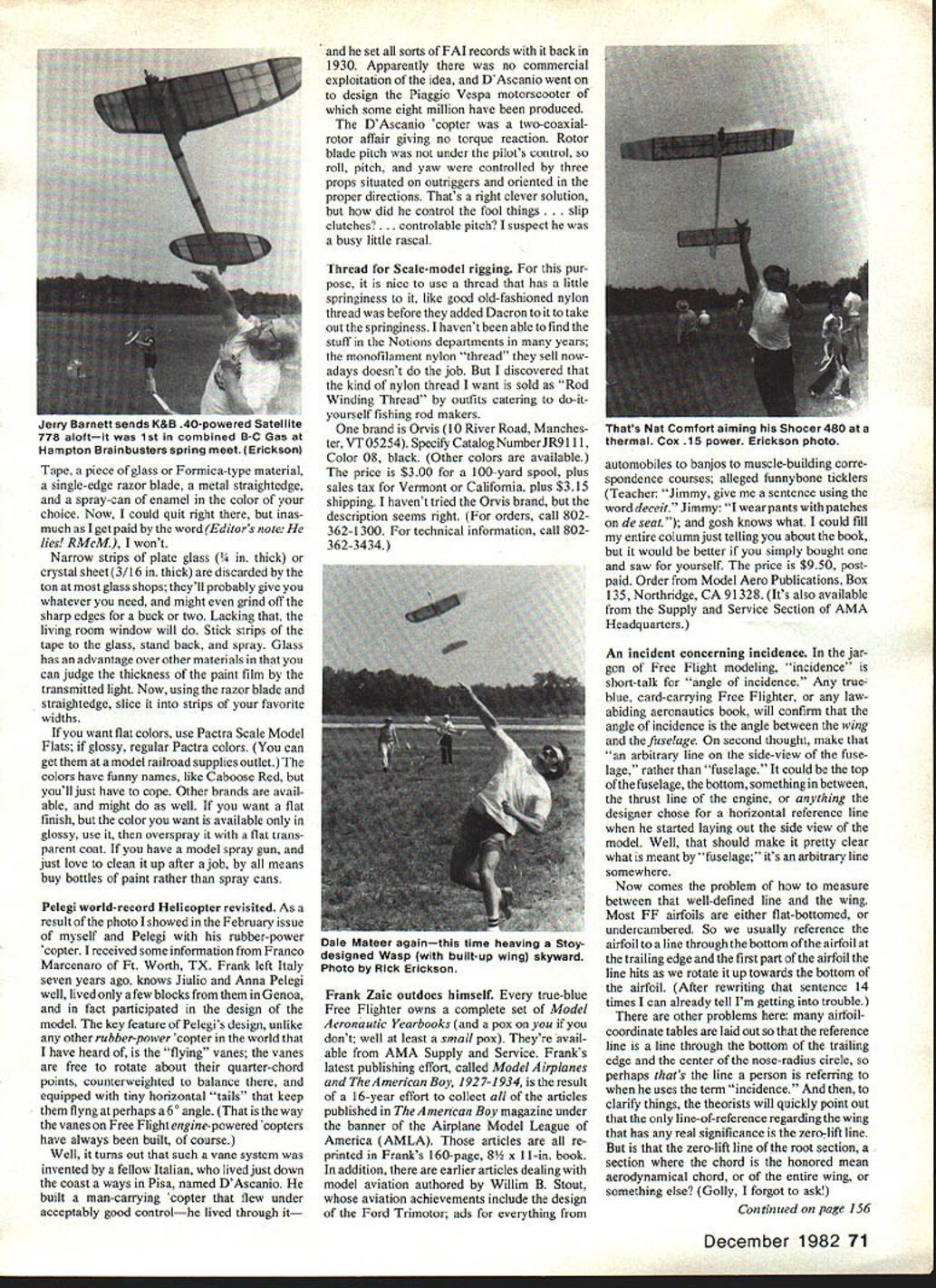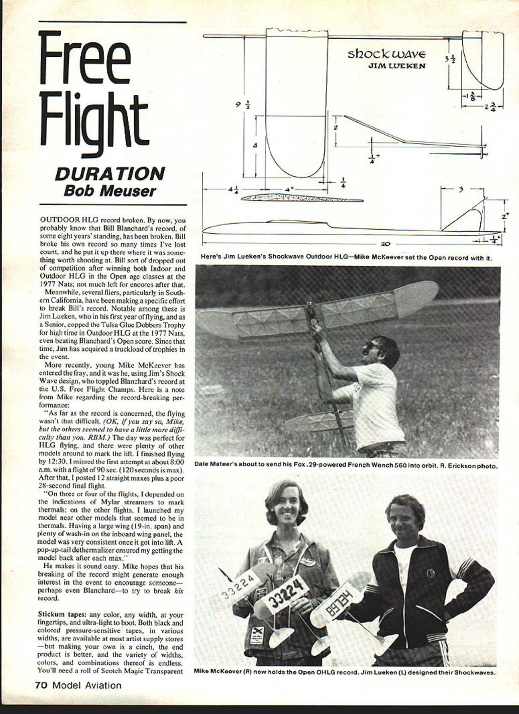 Free Flight DURA TION Bob Meuser OUTDOOR HLG record broken now probably know Bill Blanchards record some eight years standing has broken Bill broke own record times Ive lost count put up some thing worth shooting Bill sort dropped out competition after winning both Indoor Outdoor HLG Open age classes 1977 Nats much left encores after Meanwhile several fliers particularly South ern California have making specific effort break Bills record Notable among Jim Lueken first year flying Senior copped Tulsa Glue Dobbers Trophy high time Outdoor HLG 1977 Nats beating Blanchards Open score Since time Jim has acquired truckload trophies event recently young Mike McKeever has entered fray using Jims Shock Wave design toppled Blanchards record US Free Flight Champs note Mike regarding record-breaking per formance As far record concerned flying wasnt difficult OK say Mike others seemed have little culty RBM day perfect HLG flying plenty other models around mark lift finished flying 1230 missed first attempt about 800 am flight 90 sec 120 seconds max After posted 12 straight maxes plus poor 28-second final flight three four flights depended indications Mylar streamers mark thermals other flights launched model near other models seemed thermals Having large wing 19-in span plenty wash-in inboard wing panel model very consistent once got lift pop-up-tail dethermalizer ensured getting model back after max makes sound easy Mike hopes breaking record might generate enough interest event encourage someone perhaps Blanchardto try break record Stickum tapes color width fingertips ultra-light boot Both black colored pressure-sensitive tapes various widths available artist supply stores making own cinch end product better variety widths colors combinations thereof endless Youll need roll Scotch Magic Transparent 4 4 42 4 - SI2OCk WAVE TIM LVE1Cf 11 4 1 2 -i-i 4 K xx Zn 20 4J Heres Jim Luekens Shockwave Outdoor HLGMike McKeever set Open record f 70 Model Aviation Dale Mateers about send Fox 29-powered French Wench 560 orbit R Erickson photo Mike McKeever R now holds Open OHLG record Jim Lueken L designed theirShockwaves Tape piece glass Formica-type material single-edge razor blade metal straightedge spray-can enamel color choice Now could quit right inas much get paid word Editors note lies RMcM wont Narrow strips plate glass k crystal sheet 3/16 thick discarded ton glass shops theyll probably give whatever need might grind off sharp edges buck two Lacking living room window will Stick strips tape glass stand back spray Glass has advantage over other materials can judge thickness paint film transmitted light Now using razor blade straightedge slice strips favorite widths want flat colors use Pactra Scale Model Flats glossy regular Pactra colors can get model railroad supplies outlet colors have funny names like Caboose Red youll just have cope Other brands avail able might well want flat finish color want available glossy use overspray flat trans parent coat have model spray gun just love clean up after job means buy bottles paint rather spray cans Pelegi world-record Helicopter revisited As result photo showed February issue myself Pelegi rubber-power copter received some information Franco Marcenaro Ft Worth TX Frank left Italy seven years ago knows Jiulio Anna Pelegi well lived few blocks Genoa fact participated design model key feature Pelegis design unlike other rubber-power copter world have heard flying vanes vanes free rotate about quarter-chord points counterweighted balance equipped tiny horizontal tails keep flyng perhaps 60 angle way vanes Free Flight engine-powered copters have always built course Well turns out such vane system invented fellow Italian lived just down coast ways Pisa named DAscanio built man-carrying copter flew under acceptably good controlhe lived through set sorts ofFAl records back 1930 Apparently no commercial exploitation idea DAscanio went design Piaggio Vespa motorscooter some eight million have produced DAscanio copter two-coaxialrotor affair giving no torque reaction Rotor blade pitch under pilots control roll pitch yaw controlled three props situated outriggers oriented proper directions Thats right clever solution did control fool things ip clutches ntrolable pitch suspect busy little rascal Thread Scale-model rigging pur pose nice use thread has little springiness like good old-fashioned nylon thread before added Dacron to take Out springiness havent able find stuff Notions departments years monofilament nylon thread sell now adays doesnt job discovered kind nylon thread want sold Rod Winding Thread outfits catering do-ityourself fishing rod makers brand Orvis 10 River Road Manches terVT05254 Specify CatalogNumberJR9l 11 Color 08 black Other colors available price $300 100-yard spool plus sales tax Vermont California plus $315 shipping havent tried Orvis brand description seems right orders call 802362-1300 For technical information call 802362-3434 Frank Zaic outdoes himself true-blue Free Flighter owns complete set Model Aeronautic Yearbooks pox you dont well least small pox Theyre avail able AMA Supply Service Franks latest publishing effort called ModelAirplanes TheAmerican Boy 192 7-1 934 result 16-year effort collect articles published American Boy magazine under banner Airplane Model League America AMLA articles re printed Franks 160-page 8 x 11-in book addition earlier articles dealing model aviation authored Willim B Stout aviation achievements include design Ford Trimotor ads everything automobiles banjos muscle-building corre spondence courses alleged funnybone ticklers Teacher Jimmy give sentence using word deceit Jimmy wear pants patches de seat gosh knows what could fill entire column just telling about book would better simply bought saw yourself price $950 post paid Order Model Aero Publications Box 135 Northridge CA 91328 Its also available Supply Service Section AMA Headquarters An incident concerning incidence jar gon Free Flight modeling incidence sh
