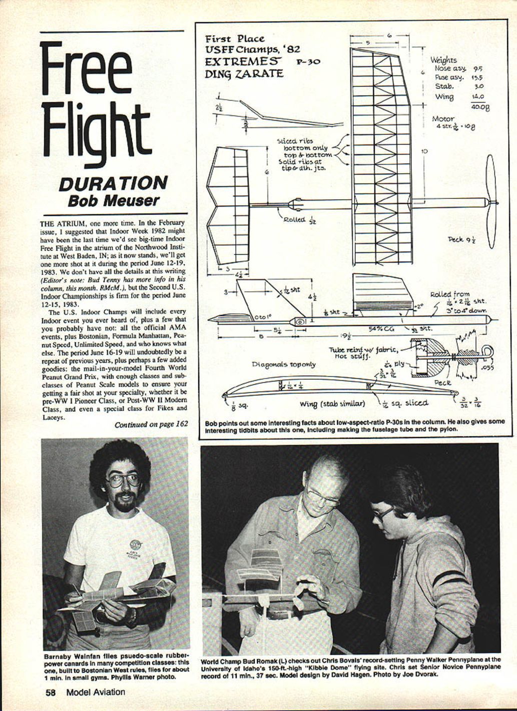 Free Flight DURA TION Bob Meuser THE ATRIUM time Februasy issue suggested Indoor Week 1982 might have last time wed see big-time Indoor Free Right atrium Nortbwood Insti tute West Baden IN now stands well get shot during period June 12-19 1983 dont have details writing Editors note Bud Tenny has info column month RMcM Second US Indoor Championships firm period June 12-15 1983 US Indoor Champs will include Indoor event ever heard plus few probably have official AMA events plus Bostonian Formula Manhattan Pea nut Speed Unlimited Speed knows what else period June 16-19 will undoubtedly repeat previous years plus perhaps few added goodies mail-in-your-model Fourth World Peanut Grand Prix enough classes sub classes Peanut Scale models ensure getting fair shot specialty whether pre-WW Pioneer Class Post-WW II Modern Class special class Fikes Laceys First Ptac USEFChamm 82 EXTIZEMES P-30 D1N ZARATh 3 SLiCCd ri bottom onLy & bottom soLid ricsot 3-4t 0 10 RoLledL 2 j 31t - B- Dicx8oncsts top 1v 0 1We8ws Nose cts TtLse c2sxJ Stc12 Wing 95 155 30 i4o 400 Motor 4str 108 10 Peck 9j Pot Led fro-m J skt 2 4 down 47oCAi \-~5tt4Aj C Tibe rnlnf ic I-tot stuff 4055 33 32 4 3q32 W1n8 stab sjmiLr N ttced 58 Model Aviation LY~/F Continued page 162 Bob points out some Interesting facts about low-aspect-ratio P-30s column also gives some Interesting tidbits about Including making fuselage tube pylon Barnaby wainian Tiie5 psueao-seamu rubberpower canards competition classes World Champ Bud Romak L checks out Chris Bovais record-setting Penny WalKer Pennyplane inc built Bostonian West miss flies about University Idahos 150-ft-hlgh Kibble Dome flying site Chris set Senior Novice Pennyplane 1 mm small gyms Phyllis Warner photo record 11 mm 37 sec Model design David Hagan Photo Joe Dvorak Free Flight INDOOR Bud Tenny BAD NEWS REPLAY last column re lated demise Pirelli implied no rubber available buy However dealers have some supplies will carry needs Although does solve power problem held bay momentarily Nevertheless should use present supplies sparingly suppliers try find some other good rubber us use Indoor Week Second United States Indoor Championships sponsored National Free Flight Society NFFS National Indoor Model Airplane Society NIMAS will held first four days door Week case havent heard Indoor Week will June 12-19 1983 magnificent atrium Northwood Institute West Baden IN Practice flying scheduled between 700 am noon Sunday June 12 Easy B Paper Stick events will flown noon through 600 pm atrium reserved FAI Indoor practice between 600 pm 800 pm Hand Launched Gliders will flown 800 am to noon Monday June 13 followed four two-hour rounds FAI Team Qualification trials Tuesday June 14 Manhattan Cabin Bostonian Cabin will flown between 700 am 1030 am Pennyplane Novice Pennyplane 1030 am 300 pm last two rounds FAI Qualification trials will held between 300 pm 700 pm Indoor Cabin models will flown concurrently FAI models final competition session US Indoor Champs will Wednesday June 15 800 am 100 pm During time slot Indoor Scale events will flown AMA Scale Peanut Scale using AMA rule 51-A Circular Speed Kit-plane Scale events will doubtless flown full stomachs official banquet scheduled 730 night before June 14 banquets excellent West Baden What rules AMA events flown US Champs will use AMA rules special rules other events copy rules will furnished entry blank available Italiano 1655 Re vere Dr Brookfield WI 53005 Please send business-sized SASE request en try blank entries postmarked later June 1 1982 will assessed $5 late-entry fee Rules Manhattan Bostonian Cabin events fairly standard will presented next column However Rubber Speed Kit-plan Scale events follows Unlimited Rubber Speed 1 Models must rubber-powered propellerdriven 2 Models must start unassisted ROG launch three-point sitting position 3 Model timed two complete laps around two pylons set 20 ft apart 4 Flights will disqualified model touches either pylon ground after cross ing starting line 5 The timer will stand line two pylons Timing starts model crosses line determined two pylons ends crosses line after completing two laps 6 Timepieces must able time 1/100 second 7 Shortest time two complete laps determines winner 8 There will no limit number models launches Peanut Speed rules Unlimited Rubber Speed shall apply except I The models limited Peanut Scale mod els 2 The models scores will time seconds models fly two laps 3 The lowest time will determine winner Kit-Plan Scale I Scale rubber-powered models built kits and/or published plans 2 The prop and/or rubber may changed allow better prop-power combination 3 The nose block thrust button may altered facilitate winding motor nose block must retain shape size etc original 4 The tissue color may changed pertinent marking must plane ie door lines hinge lines cowl bumps etc color trim should appropriate era aircraft being modeled No condenser paper film coverings will allowed flying surfaces must double-covered 5 Static judging competition will used pub lished plans Structure craftsmanship fidelity construction plan basis models score Photographs three-views needed required 6 The final score will total static Continued page 138 60 Model Aviation Super-simple winding stooge Peanut Scale Manhattan Cabin AMA Scale models Base clamps convenient anchor Slide popsicle stick up down close open wires hook rear motor peg loops slide wires closed wind model Overview Rich Doigs balsa-tester Clamp seen closeup left side deflection scale right Length-scale base may show up well photos Test weight can seen attached balsa stick just right deflection scale Closeup Richard Doigs balsa strength-tester brass tube vertical epoxied piece balsa horizontal metal rail weight metal T vertical leg slides tube holds piece balsa being tested quite se curely CoNTACTI Sullivan Sure Safe Start Stop putting up hard starting engines Start looking famous Sullivan Hi-Tork Starters fast sure starts can choose 2/5 1 hp 12 24 volts torques 23