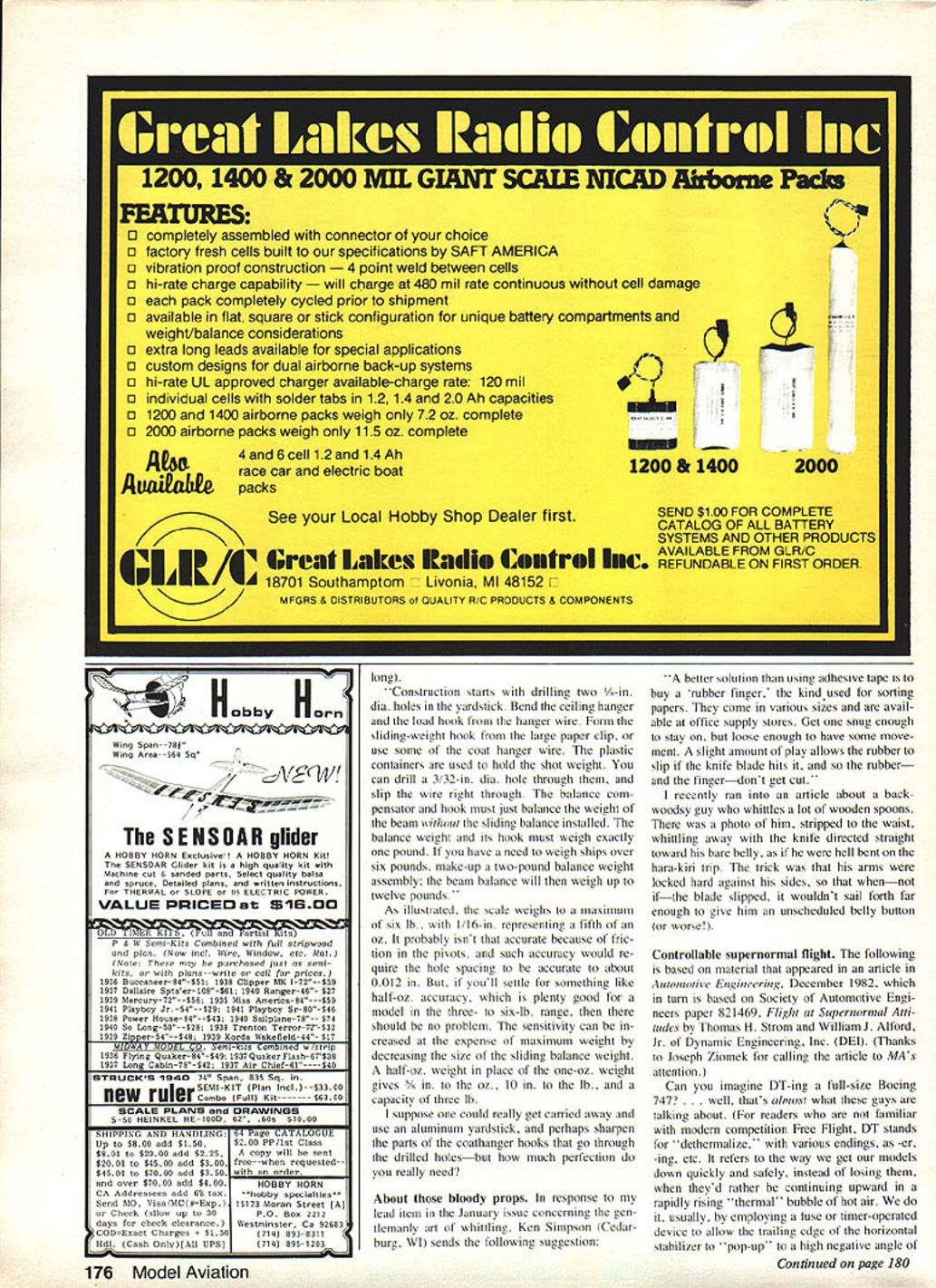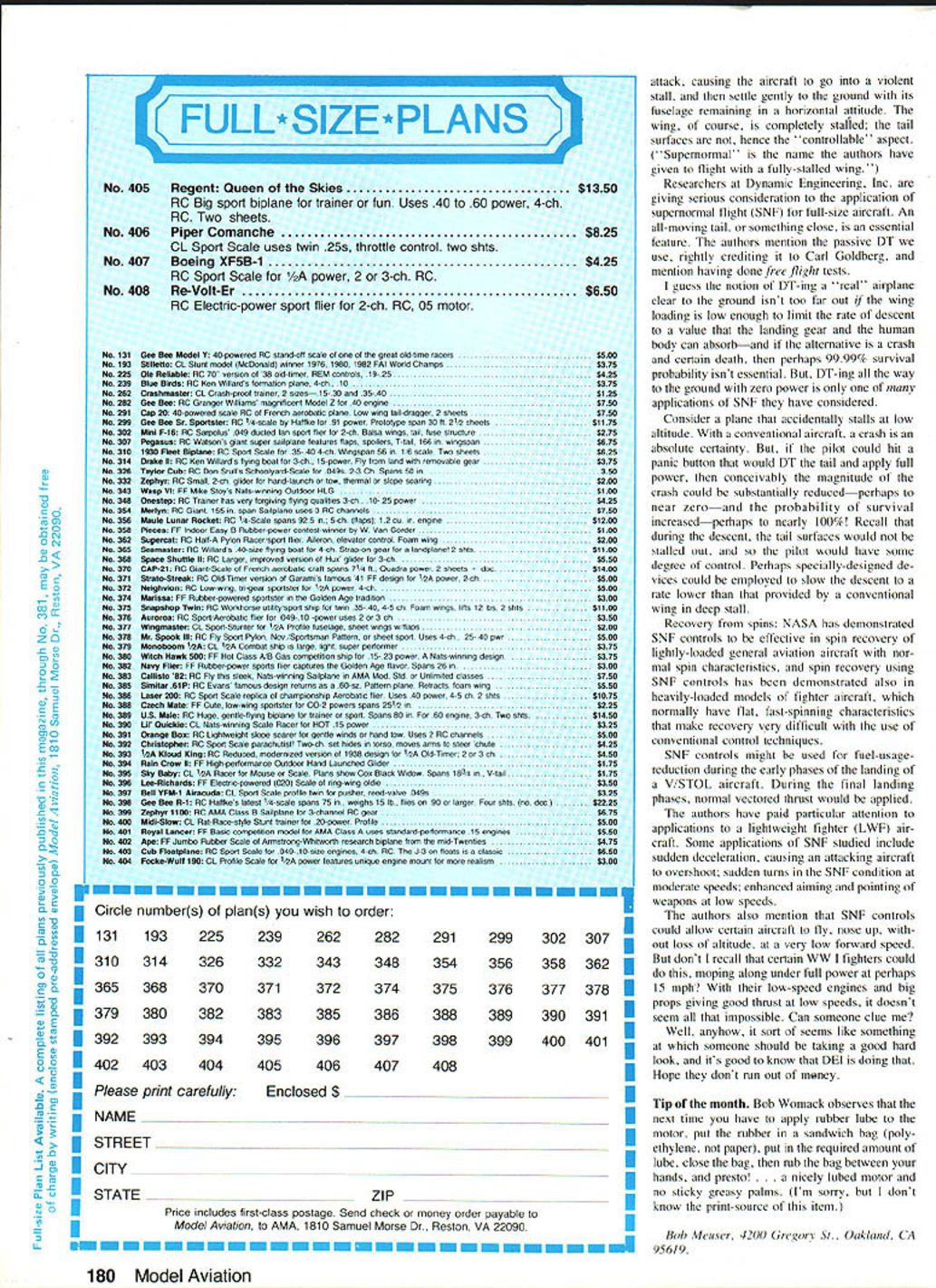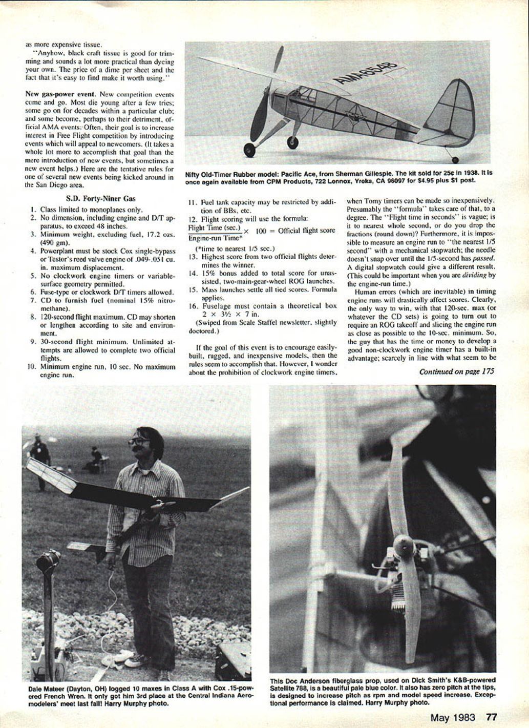 Free Flight DURA TION Bob Meuser THE RULES AMA Cargo event check em out theyre AMA rule book pretty simple Basically small-field event dont come smaller Using Cox 020 engine pair OlOs main idea see much gross weight can carry least 40 sec maximum 20-sec engine run wingspan restriction 48 Clearly arent going have problem keeping model sight Back March 1977 column presented sketch Roman Ramirezs record-breaking model carried three-flight-total 76 oz Somewhere along line upped 82 oz 1979according August 1980 columnhe stuck up 8342 oz might have lost track has meanwhile last September cpped totally ridiculous figure 10021 oz about two lb per flight Try local 020 models would scarcely get off ground let alone make flight times twice engine-run times An ultra-sophisticated model maybe winglets super computer-designed airfoil Nope same old square-tip turkey hes flying along good old NACA 6409 airfoil out Twenties Thirties simple model well-flown beats usual Tissue tips Taking note several items regard iog virtues various covering tissues have appeared column recent months Al Lidberg supplies following information 1 agree real Japanese tissue nice stuff HAA/ Pgc44 CYL /A1ej 7 0 2 4 6 i 0/z4F6z8 Ij 8 47 /h LAO 8A4 AA/ee-PAAT sv2e / 3/ 3233 34 35 36 II rACr 5 OA/ a7/CA/ i, b4EP7/C/-i / Z &5~ c26C ~7L Al ~V ~egs-- i~ h7e %//4Ar44ej 4P0 LAD - ee 77e-g A-IA 7eAL A44 e7c9A/47sqj/ eA/ 7 ~A4 94 4ACE% LEi-AL. 563 --/777f42S k7/C %&AZ Bob Dittmers steelyard scalemake under dollar wooden yardstick coat hanger some small plastic containers some BBs Capacity depends sliding weight 6 lb work theres workable alternative Art supply stores some hobby shops sell tissue artsy-craftsy projects such flowers etc stuff cheap lOg-15g per sheet comes about two dozen colors black included Ive used golden yellow red couple models covering tissue good results 'None stuff colorfast water needs use very line mist shrinking use atrbrush avoid large drops make big blot marks 'For black trim strips numbers tissue works great can stuck down thinner just like real tissue Ive also used khaki brown Sperry Messenger recently appeared MAN brown pretty terrible though has little resistance tears holesfar worse thing Ive ever used color just right Dont know color tissue seems have different qualities Some black brown have shine side like good tissue dont work well covering Some red yel low blue dull both sides yet work well Mike Stoy has won Indoor HL Glider event US FF Champs twice flights around 33 sec under 20-ft ceiling Note large model size tiny tail-teath ers until recently didnt know would work having never tried theml fi Ds4 FL4H7 47 AVV P47w A441/MOAI DURA7/A \ /\ / Ix 5A5 XI\ ______ K -O2 4t \- oa sq __________ C c 75/1552 TZeCi #3 • R 7W5 UV4/A1/T5CM4v55/U 8LM &I 5 FPPL/7Cl4AIP$ ________ ________ _______ _______ _______ inches Will Team Williams Unlimited Mulvihill model able beat Bob White Meuser claims drawn its rugged enough everyday contest use-but special-purpose design modelers using plane have own favorite prop designs 76 Model Aviation expensive tissue Anyhow black craft tissue good trim ming sounds lot practical dyeing own price dime per sheet fact its easy find make worth using New gas-power event New competition events come go Most die young after few tries some go decades within particular club some become perhaps detriment ficial AMA eventsOften goal increase interest Free Flight competition introducing events will appeal newcomers takes whole lot accomplish goal mere introduction new events sometimes new event helps tentative rules several new events being kicked around San Diego area SD Forty-Niner Gas I Class limited monoplanes 2 No dimension including engine D/T ap paratus exceed 48 inches 3 Minimum weight excluding fuel 172 ozs 490 gin 4 Powerplant must stock Cox single-bypass Testors reed valve engine 049-051 cu maximum displacement 5 No clockwork engine timers variablesurface geometry permitted 6 Fuse-type clockwork D/T timers allowed 7 CD furnish fuel nominal 15% nitro methane 8 120-second flight maximum CD may shorten lengthen according site environ ment 9 30-second flight minimum Unlimited tempts allowed complete two official flights 10 Minimum engine run 10 sec No maximum engine run II Fuel tank capacity may restricted addi tion BBs etc 12 Flight scoring will use formula Right Time sec x 100Official flight score Engine-run Time* *time nearest I/S sec 13 Highest score two official flights deter mines winner 14 15% bonus added total score unas sisted two-main-gear-wheel ROG launches 15 Mass launches settle tied scores Formula applies 16 Fuselage must contain theoretical box 2 X 3 x 7 Swiped Scale Staffel newsletter slightly doctored goal event encourage easilybuilt rugged inexpensive models rules seem accomplish However wonder about prohibition clockwork engine timers Tomy timers can made inexpensively Presumably formula takes care degree Flight time seconds vague nearest whole second drop fractions round down Furthermore impos sible measure engine run nearest I/S second mechanical stopwatch needle doesnt snap over until 1/5-second has passed digital stopwatch could give different result could important dividing engine-run time Human errors inevitable timing engine runs will drastically affect scores Clearly way win 120-sec max whatever CD sets going tum out require ROG takeoff slicing engine run close possible 10-sec minimum So guy has time money develop good non-clockwork engine timer has built-in advantage scarcely line what seem May 1983 77 Nifty Old-Timer Rubber model Pacific Ace Sherman Gillespie kit sold 25* 1938 once again available CPM Products 722 Lennox Yreka CA 96097 $495 plus Si post Continued page 175 Dale Mateer Dayton OH logged 10 maxes Class Cox 15-pow ered French Wren got him 3rd place Central Indiana Aero modelers meet last fall Harry Murphy photo Doc Anderson fiberglass prop used Dick Smiths K&B-powered Satellite 788 beautiful pale blue color also has zero pitch tips designed incre
