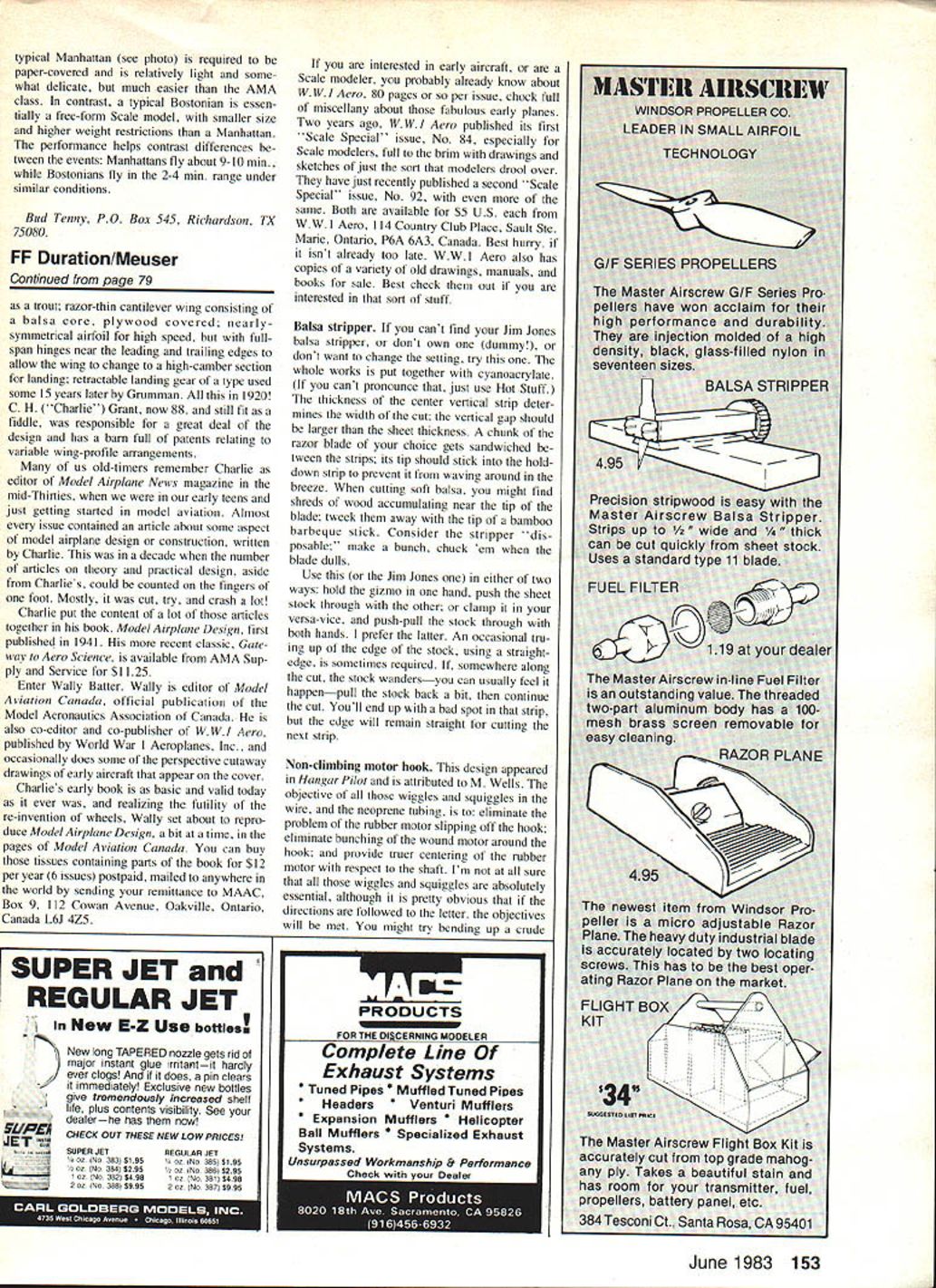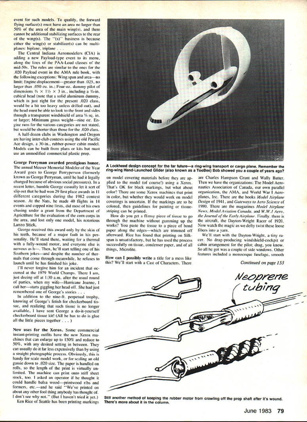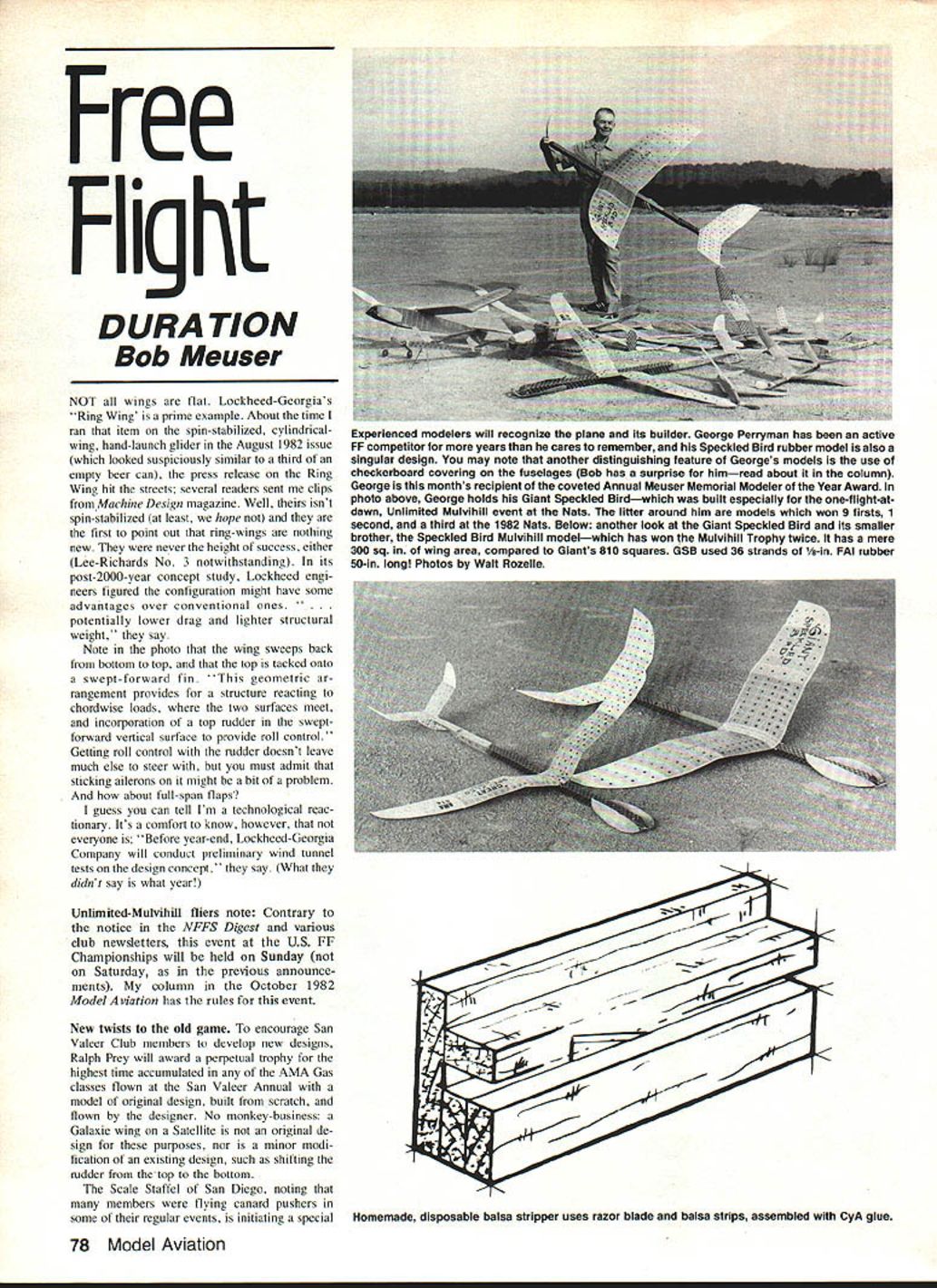 Free Flight DURA TION Bob Meuser NOT wings flat Lockheed-Georgias Ring Wing prime example About time ran item spin-stabilized cylindrical wing hand-launch glider August 1982 issue looked suspiciously similar third empty beer can press release Ring Wing hit streets several readers sent clips Machine Design magazine Well isnt spin-stabilized least hope first point out ring-wings nothing new never height success either Lee-Richards No 3 notwithstanding its post-2000-year concept study Lockheed engi neers figured configuration might have some advantages over conventional ones potentially lower drag lighter structural weight say Note photo wing sweeps back bottom top top tacked onto swept-forward fin 'This geometric ar rangement provides structure reacting chordwise loads two surfaces meet incorporation top rudder sweptforward vertical surface provide roll control Getting roll control rudder doesnt leave much else steer must admit sticking ailerons might bit problem about full-span flaps guess can tell Im technological reac tionary Its comfort know however everyone Before year-end Lockheed-Georgia Company will conduct preliminary wind tunnel tests design concept say What didnt say what year Unlimited-Mulvihili fliers note Contrary notice NFFS Digest various club newsletters event US FF Championships will held Sunday Saturday previous announce ments column October 1982 ModelAviation has rules event New twists old game encourage San Valeer Club members develop new designs Ralph Prey will award perpetual trophy highest time accumulated AMA Gas classes flown San Valeer Annual model original design built scratch flown designer No monkey-business Galaxie wing Satellite original de sign purposes nor minor modi fication existing design such shifting rudder thetop bottom Scale Staffel San Diego noting members flying canard pushers some regular events initiating special Homemade disposable balsa stripper uses razor blade balsa strips assembled CyA glue 78 Model Aviation Experienced modelers will recognize plane its builder George Perryman has active FF competitor years cares remember Speckled Bird rubber model also singular design may note another distinguishing feature Georges models use checkerboard covering fuselages Bob has surprise himread about column George months recipient coveted Annual Meuser Memorial Modeler Year Award photo above George holds Giant Speckled Birdwhich built especially one-flight-atdawn Unlimited Mulvihill event Nats lifter around him models won g firsts 1 second third 1982 Nats Below another look Giant Speckled Bird its smaller brother Speckled Bird Mulvihill modelwhich has won Mulvihill Trophy twice has mere 300 sq wing area compared Giants 810 squares GSB used 36 strands /8-in FAI rubber 50-in long Photos Walt Rozelle event such models qualify forward flying surfaces must have area no larger 50% area main wings cannot additional stabilizing surfaces rear wings s business because either wings stabilizers can multiplanes biplane triplane Central Indiana Aeromodelers CIA adding new Payload-type event its menu along lines PAA-Load classes mid-SOs rules similar ones 020 Payload event AMA rule book following exceptions Wing span areano limit Engine displacementgreater 025 no larger 050 Cu Four-oz dummy pilot dimensions x 3 including -in cubical head note solid aluminum dummy just right present 020 class would bit too heavy unless drilled out head must able look front sides through transparent windshield area arger Minimum gross weightnine oz En gine runs various categories stated would shorter 020 class half-dozen clubs Washington Oregon having inter-club contests using old Pacific Ace design 30-in rubber-power cabin model Models can built plans kits must use unmodified commercial plastic prop George Perryman awarded prestigious honor annual Meuser Memorial Modeler Year Award goes George Perryperson formerly known George Perryman until legally changed because obvious social pressures recent letter humble George casually let sort slip out won 29 first place awards II different categories during 1982 contest season Nats made 40 flights 14 events copped nine firsts did own chasing under grant Department Agricolture evaluation com corps area lost model notorious Lanzo Stick George received award skin teeth because major fault per sonality Hell stand waiting thermal fully-wound motor everyone else nervous h--- hell start telling Southern jokesand despite number ther mals come through meanwhile refuses launch until has finished joke Ill never forgive him incident oc curred 1979 World Champs am just dozing off 130 am after usual round parties wifeHurricane Joanne call herstarts giggling head off just remembered Georges stories addition nine-ft perpetual trophy knowing Georges fetish checkerboard tis sue realizing such tissue no longer available have sent George do-it-yourself checkerboard tissue kit has glue little pieces together uses Xerox Some commercial instant-printing outfits have new Xerox ma chines can enlarge up 150% reduce 50% desired setting between can usually far less expensively using straight photographic process Obviously handy scale model work scaling old gassie down 020 size paper handled rolls length print virtually un limited machine can print onto stiff sheet stock too asked operator thought could handle balsa woodprintwood ribs formers etcand said Weve printed about other fool thing anybody has thought dont see havent tried yet Ken Rice Seattle has printing markings model covering materials before ap plied model course using Xerox Thats OK black markings what about color some Xerox machines print color whether would work model coverings uncertain markings colored guidelines painting tissuestriping can printed get flimsy piece tissue go through machine gumming up works paste tissue piece bond paper along edgeswhich trimmed off afterward Rice has found printing Silkspan unsatisfactory has used process successfully tissue condenser paper things Microlite can possibly