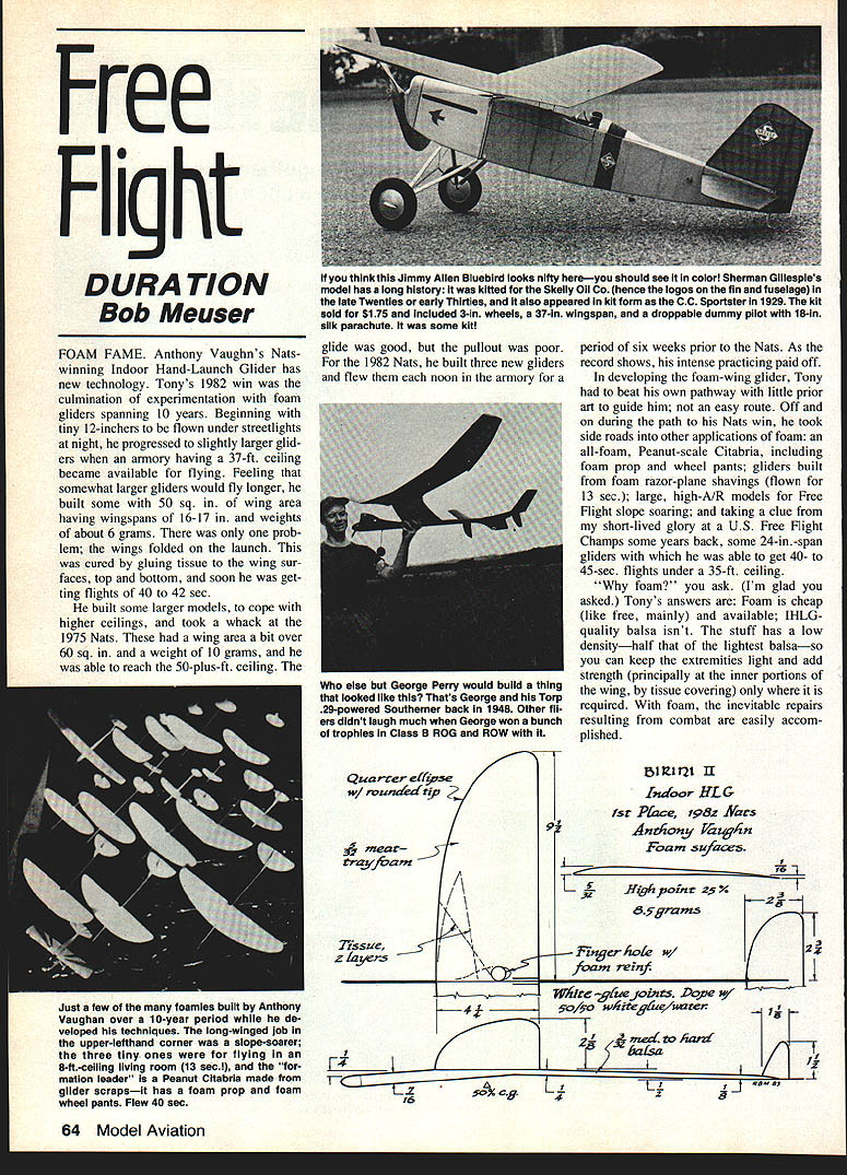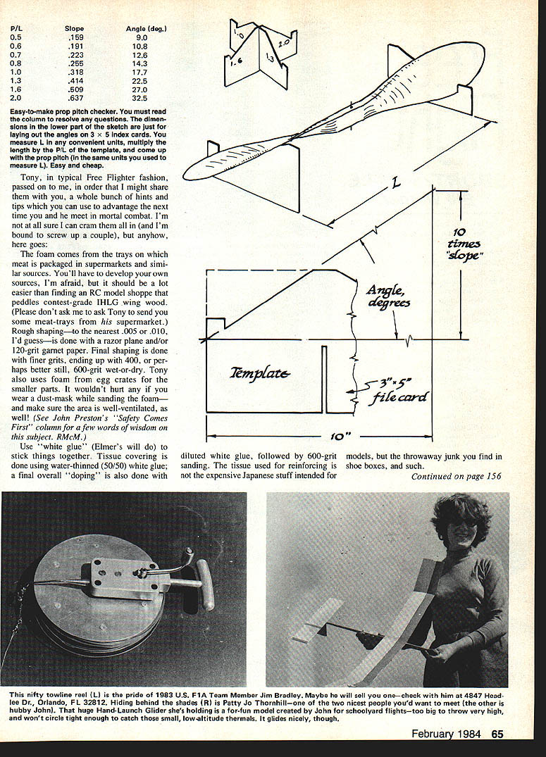 Free Flight DURA TION Bob Meuser FOAM FAME Anthony Vaughns Nats winning Indoor Hand-Launch Glider has new technology Tonys 1982 win culmination experimentation foam gliders spanning 10 years Beginning tiny 12-inchers flown under streetlights night progressed slightly larger glid ers armory having 37-ft ceiling became available flying Feeling somewhat larger gliders would fly longer built some 50 sq wing area having wingspans 16-17 weights about 6 grams prob lem wings folded launch cured gluing tissue wing sur faces top bottom soon get ting flights 40 42 sec built some larger models cope higher ceilings took whack 1975 Nats wing area bit over 60 sq weight 10 grams able reach 50-plus-ft ceiling glide good pullout poor 1982 Nats built three new gliders flew noon armory Quarter d4vse w/ mun&dtp neat trayfoam 7ssue z1ayen _______________________ 1 ifi__ 2K 16Xc8 7 period six weeks prior Nats As record shows intense practicing paid off developing foam-wing glider Tony beat own pathway little prior art guide him easy route Off during path Nats win took side roads other applications foam all-foam Peanut-scale Citabria including foam prop wheel pants gliders built foam razor-plane shavings flown 13 sec large high-A/R models Free Flight slope soaring taking clue short-lived glory US Free Flight Champs some years back some 24-in-span gliders able get 40- 45-sec flights under 35-ft ceiling foam ask Im glad asked Tonys answers Foam cheap like free mainly available IHLG quality balsa isnt stuff has low densityhalf lightest balsaso can keep extremities light add strength principally inner portions wing tissue covering required foam inevitable repairs resulting combat easily accom plished blIU21 II bzaoor IILG fst Pace 1982 iVars AnrAo~i TzugAn Foam suJace w - FIqh point 25 ams FYer Aoe w/ foam -eby W~Ite g6uejobtts Ape y 5O/ wie86ue7zter 2 jmedzofiani A 64 Model Aviation think Jimmy Alien Bluebird looks nifty hereyou should see color Sherman Gillespies model has long history kitted Skelly Oil Co hence logos fin fuselage late Twenties early Thirties also appeared kit form CC Sportater 1929 kit sold Si 75 Included 3-in wheels 37-in wingspan droppabie dummy pilot 1 8-in silk parachute some kit else George Perry would build thing looked like Thats George Torp 29-powered Southerner back 1948 Other f Iiera didnt laugh much George won bunch trophies Class B ROG ROW Just few foamies buIlt Anthony Vaughan over 10-year period de veloped techniques long-winged job upper-lefthand corner slope-soarer three tiny ones flying 8-ft-ceiling living room 13 sec mation leader Peanut Citabria made glider scrapsit has foam prop foam wheel pants Flew 40 sec P/L 05 06 07 08 10 13 16 20 Slope 159 191 223 255 318 414 509 637 Angle deg 90 108 126 143 177 225 270 325 Easy-to-make prop pitch checker must read column resolve questions dimen sions iower part sketch lust laying Out angles 3 x 5 index cards measure convenient units multiply length P/L template come up prop pitch same units used measure L Easy cheap Tony typical Free Flighter fashion passed order might share whole bunch hints tips can use advantage next time meet mortal combat Im sure can cram Im bound screw up couple anyhow goes foam comes trays meat packaged supermarkets simi lar sources Youll have develop own sources Im afraid should lot easier finding RC model shoppe peddles contest-grade IHLG wing wood Please dont ask ask Tony send some meat-trays supermarket Rough shapingto nearest 005 010 Id guessis done razor plane andlor 120-grit garnet paper Final shaping done finer grits ending up 400 per haps better still 600-grit wet-or-dry Tony also uses foam egg crates smaller parts wouldnt hurt wear dust-mask sanding foam make sure area well-ventilated well See John Prestons Safety Comes First column few words wisdom subject RMcM Use white glue Elmers will stick things together Tissue covering done using water-thinned 50/50 white glue final overall doping also done 2mfrat& L V fife card tO U diluted white glue followed 600-grit sanding tissue used reinforcing expensive Japanese stuff intended 10 times ope models throwaway junk find shoe boxes such Continued page 156 nifty towline reel pride 1983 US FlA Team Member Jim Bradley Maybe will sell onecheck him 4847 Headlee Dr Orlando FL 32812 Hiding behind shades RI Patty J0 Thornhilione two nicest people youd want meet other hubby John huge Hand-Launch Glider shes holding for-fun model created John schoolyard flightstoo big throw very high wont circle tight enough catch small low-altitude thermals glides nicely though February 1984 65 FF Duration/Meuser Continued OAOP 156 Walter Getsla old-time Wake field flier credited Walter Brock now deceased illustrious Illinois Model Airplane Club basic idea goes back about 1927 Ive changed tem plate angles give what believe convenient set sketch table tells story Two templates P/L value required convenience make tem plates 3 X 5 file cards two differ ent P/L values card 05 06 pair cards 07 08 another pair forth cards notched assembled egg-crate fashion self-standing Hmmm self-standing reminds quip Margaret Mitchell made about self-addressed envelopes can envelopes Well dont expect cards stand themselves uptheyll need little help once stood will stay stood Meanwhile back work bench erned gas-power Fine Quality Flying Models Catalog $150 98 RUBBER POWER KITS plus Gliders CIL R/C Accessories Books e 4 4 4 3 4 3 3- 3 MAJESTIC MODELS 3273 West 129th Street Cleveland Ohio 44111 props make templates four smaller PIL values rubber-power props make ones four higher values template angles expressed table both form slope de grees use whichever suits best Cant knock sound advice like can Using templates duck soup Select pair templates P/L value Plop prop onto templates slide templates back forth along blades keeping prop centerline roughly midway between templates until blade angles match templates Measure distance between templates multiply P/L value template pitch whatever units used measure dist