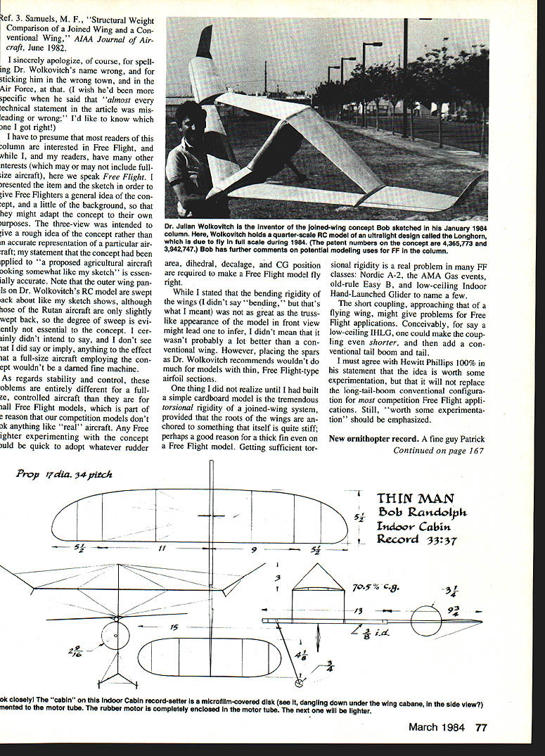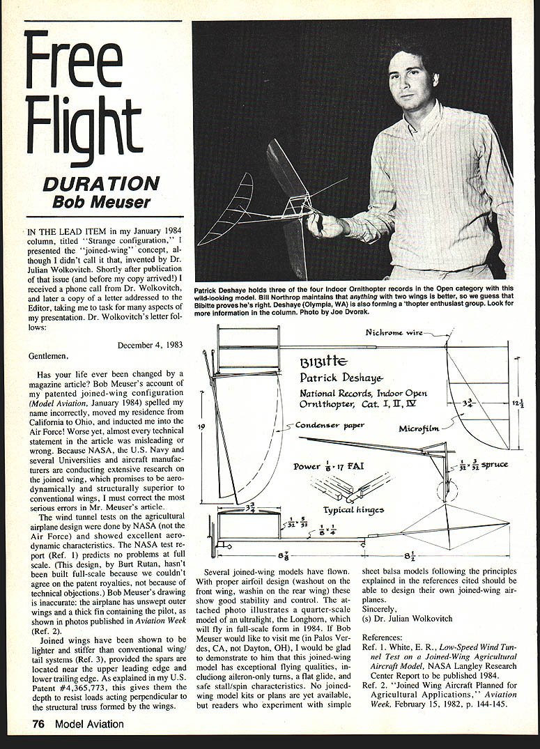 Free Flight DURA TION Bob Meuser IN THE LEAD ITEM Januaiy 1984 column titled Strange configuration presented joined-wing concept al though didnt call invented Dr Julian Wolkovitch Shortly after publication issue before copy arrived received phone call Dr Wolkovitch later copy letter addressed Editor taking task aspects presentation Dr Wolkovitchs letter fol lows December 4 1983 Gentlemen Has life ever changed magazine article Bob Meusers account patented joined-wing configuration Model Aviation January 1984 spelled name incorrectly moved residence California Ohio inducted Air Force Worse yet almost technical statement article misleading wrong Because NASA US Navy several Universities aircraft manufac turers conducting extensive research joined wing promises aero dynamically structurally superior conventional wings must correct serious errors Mr Meusers article wind tunnel tests agricultural airplane design done NASA Air Force showed excellent aero dynamic characteristics NASA test re port Ref 1 predicts no problems full scale design Burt Rutan hasnt built full-scale because couldnt agree patent royalties because technical objections Bob Meusers drawing inaccurate airplane has unswept outer wings thick fin containing pilot shown photos published Aviation Week Ref 2 Joined wings have shown lighter stiffer conventional wing tail systems Ref 3 provided spars located near upper leading edge lower trailing edge As explained US Patent #4365773 gives depth resist loads acting perpendicular structural truss formed wings N 19 i ICondnsgt paper / / / / / -7 3 r M K~2 Typical hjir5c 1Jicjromt wing 3 34 Microjim 11 63 31s9ruct AWN Ir~85------Several joined-wing models have flown proper airfoil design washout front wing washin rear wing show good stability control tached photo illustrates quarter-scale model ultralight Longhorn will fly full-scale form 1984 Bob Meuser would like visit Palos Ver des CA Dayton OH would glad demonstrate him joined-wing model has exceptional flying qualities cludiong aileron-only turns flat glide safe stall/spin characteristics No joinedwing model kits plans yet available readers experiment simple sheet balsa models following principles explained references cited should able design own joined-wing air planes Sincerely s Dr Julian Wolkovitch References Ref 1 White E R Low-Speed Wind Tun nel Test Joined-Wing Agricultural Aircraft Model NASA Langley Research Center Report published 1984 Ref 2 Joined Wing Aircraft Planned Agricultural Applications' Aviation Week February 15 1982 p 144-145 76 Model Aviation Patrick Deshaye holds three four Indoor Ornithopter records Open category wild-looking model Bill Northrop maintains anything two wings better guess Bibitte proves hes right Deshaye Olympia WA also forming thopter enthusiast group Look information column Photo Joe Dvorak l3lt3lttEr Pcatrick PsIuze Mationat Records Indoor Optn Ornitkopter Cat II ef 3 Samuels M F Structural Weight Comparison Joined Wing Con ventional Wing AIAA Journal Air craft June 1982 sincerely apologize course spell ng Dr Wolkovitchs name wrong ticking him wrong town ir Force wish hed pecific said almost echnical statement article mis eading wrong Id like know ne got right have presume readers olumn interested Free Flight hile readers have other nterests may may include full ize aircraft speak Free Flight resented item sketch order ive Free Flighters general idea con ept little background ey might adapt concept own urposes three-view intended ive rough idea concept rather accurate representation particular airraft statement concept pplied proposed agricultural aircraft ooking somewhat like sketch essen ially accurate Note outer wing pan ls Dr Wolkovitchs RC model swept ack about like sketch shows although hose Rutan aircraft slightly wept back degree sweep evi lently essential concept cer ainly didnt intend say dont see hat did say imply anything effect hat full-size aircraft employing con ept wouldnt darned fine machine As regards stability control roblems entirely different full ze controlled aircraft naIl Free Flight models part e reason competition models dont ok anything like real aircraft Any Free lighter experimenting concept ould quick adopt whatever rudder Prtp irdia 34 pitch 2 / p area dihedral decalage CG position required make Free Flight model fly right stated bending rigidity wings didnt say bending thats what meant great trusslike appearance model front view might lead infer didnt mean wasn t probably lot better con ventional wing However placing spars Dr Wolkovitch recommends wouldnt much models thin Free Flight-type airfoil sections thing did realize until built simple cardboard model tremendous torsional rigidity joined-wing system provided roots wings chored something itself quite stiff perhaps good reason thick fin Free Flight model Getting sufficient tor sional rigidity real problem FF classes Nordic A-2 AMA Gas events old-rule Easy B low-ceiling Indoor Hand-Launched Glider name few short coupling approaching flying wing might give problems Free Flight applications Conceivably say low-ceiling IHLG could make coup ling shorter add con ventional tail boom tail must agree Hewitt Phillips 100% statement idea worth some experimentation will replace l6ng-tail-boom conventional configura tion competition Free Flight appli cations Still worth some experimenta tion should emphasized New ornitbopter record fine guy Patrick Continued page 167 vP 9 ----- 5 THIN MAN fob IZandolpk Record 3337 93 4 Zad TThk ioselyl cabin Indoor Cabin record-setter isa mIcrofIlm-covered disk see dangilng down under wing cabane aide vIew imented motor tube rubber motor completely enclosed motor tube next will lighter March 1984 77 Dr Julian Wolkovitch Inventor joined-wing concept Bob sketched January 1984 column Wolkovitch holds quarter-scale RC model ultralight design called Longhorn due fly lull scale during 1984 patent numbers concept 4365773 3942747 Bob has further comments potential modeling uses FF column 705% R