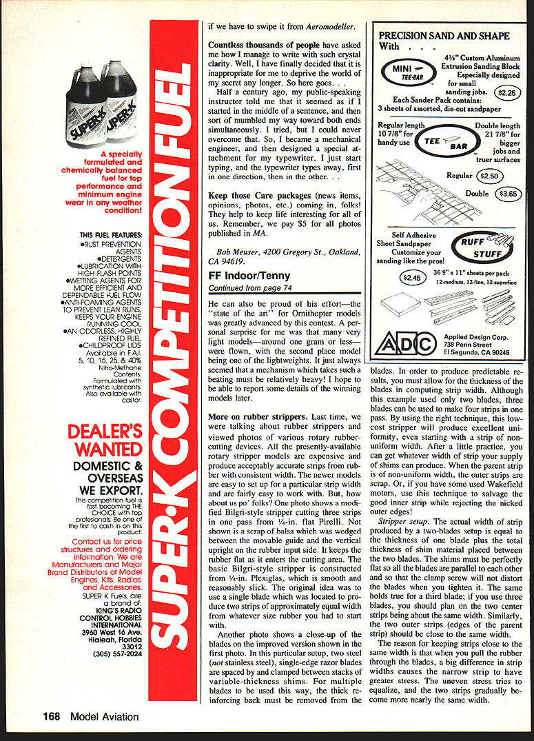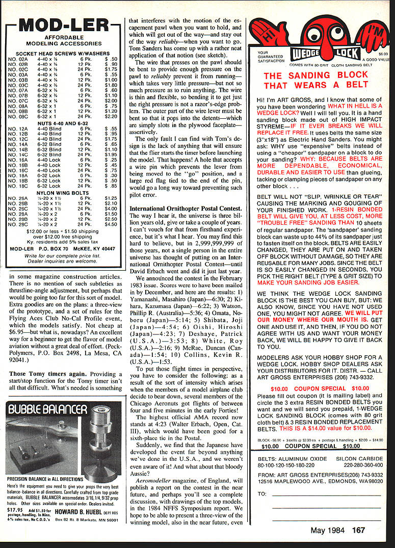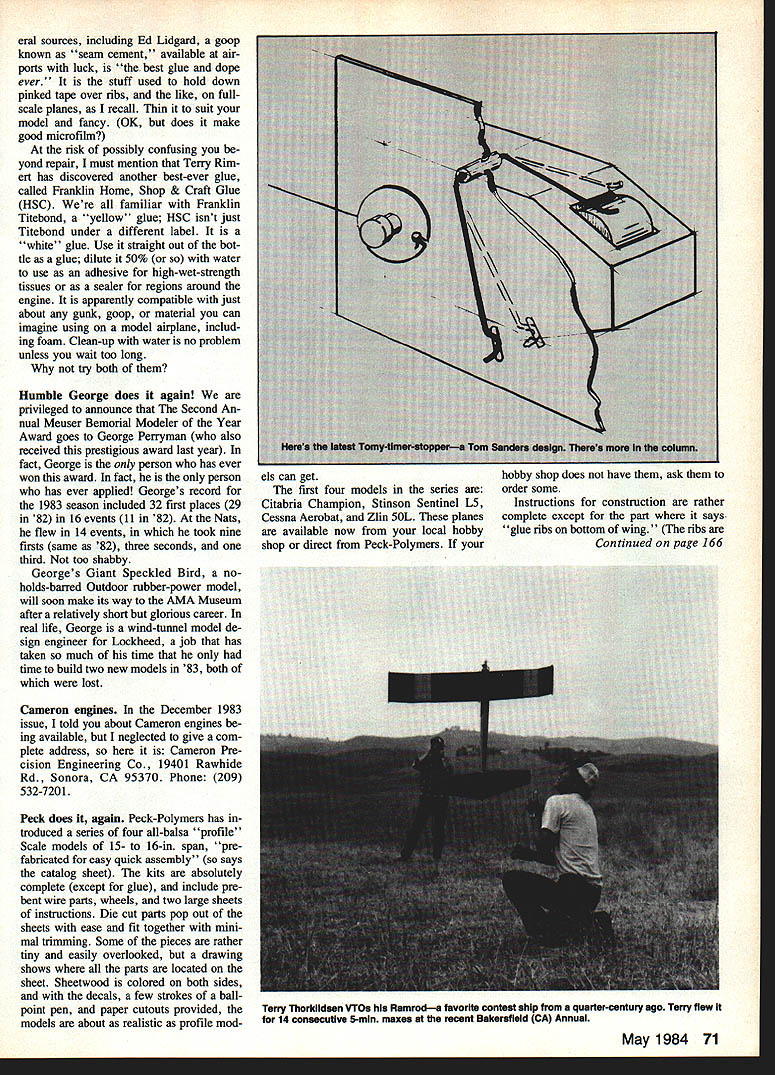 Free Flight DURA TION Bob MeuBer NFFS LIVES times column have prefaced statement Hard times come hard times go survive visible tip National Free Right Society iceberg Free Flight made terrific splurge 1981 1982 fell way behind toward end 1983 No excuses getting back stream hope will stay way awhile Meanwhile mainstream NFFS activities keeps tip iceberg afloat continues NFFS Supplies Plans Publications services management Indoor Champs administration what might turn out cutting edge Free Flight competition Nats unofficial events interaction World Champs ac tivities gosh knows what else Recently have quite few changes management various NFFS activities have questions guys get answers ask right question wrong person wrong question right person arent very likely get right answser right things still dont get right results thenbut thentalk about OK Heres latest NFFS Plans NFFS SuppliesJoe Wagner 12 Cook St Rowayton CT 06853 NFFS Publications except NFFS DigestFred Terzian 4858 Moorpark Ave San Jose CA 95129 NFFS Member ships SubscriptionsDon Hughes 8383 Zancanaro Ct Citrus Heights CA 95610 Free Flight NFFS Digest Material should sent appropriate Con tributing Editor doubt send EditorBob Meuser 4200 Gregory St Oakland CA 94619 An SASE appropriate person will get complete list what available NFFS Plans Supplies Pub lications Membership including sub scription Digest costs $15 year $27 two years USA residents 19 years age over residents other countries USA residents under 19 fee $750 year $1350 two Terrific glue dope According sev 70 Model Aviation George Perryman Giant Speckled Birdwhich built AMA wise designed specifically one-flight-st-dawn Uniimited-Uniimited eventswhich has winning contest record GSB will soon find its way AMA museum Ship spans 72 has 12-in chord 810 sq wing urea prop diameter 32 weight rubber motor 655 oz uses 36 strands 1A-in FAI rubber 51-in long Wait Rozeile photo Heres tour new profile Scale kits Peck-Polymers Stinson L-5 Sentinel Read column typical Baby ROG rise-off-ground model 1929 Plane published American Boy magazine kit available 50# part old AMLA program model built Sherman Gillespie 1929 version did have Fuiton Hungerford spoked wheals eral sources including Ed Lidgard goop know seam cement available air ports luck best glue dope ever f used hold down pinked tape over ribs like fullscale planes recall Thin suit model fancy OK does make good microfilm risk possibly confusing yond repair must mention Terry Rim ert discovered another best-ever glue calle Franldin Home Shop & Craft Glue HSC familiar Franklin Titebond yellow glue HSC isnt just Titebond under different label whi re glue Use straight out bot tle glue dilute 50% water us adhesive high-wet-strength tissues sealer regions around engine apparently compatible just about gunk goop material can imagine using model airplane includ ing fi am Clean-up water no problem unless wait too long try both Humble George does again privileged announce Second An nual N4euser Bemorial Modeler Year Awas d goes George Perryman also recei ed prestigious award last year fact George person has ever won award fact person has ever applied Georges record 83 season included 32 first places 29 & 16 events 11 82 Nats fbw 14 events took nine firsts same 82 three seconds third too shabby Gtorges Giant Speckled Bird noholds-barred Outdoor rubber-power model will soon make its way AMA Museum after relatively short glorious career real life George wind-tunnel model de sign engineer Lockheed job has taken much time time build two new models 83 both lost Cameron engines December 1983 issue told about Cameron engines ing available neglected give com plete address Cameron Pre cision Engineering Co 19401 Rawhide Rd Sonora CA 95370 Phone 209 532-7201 Peck does again Peck-Polymers has troduced series four all-balsa profile Scale models 15- 16-in span pre fabricated easy quick assembly says catalog sheet kits absolutely complete except glue include pre bent wire parts wheels two large sheets instructions Die cut parts pop out sheets ease fit together mini mal trimming Some pieces rather tiny easily overlooked drawing shows parts located sheet Sheetwood colored both sides decals few strokes ball point pen paper cutouts provided models about realistic profile models can get first four models series Citabria Champion Stinson Sentinel L5 Cessna Aerobat Zlin SOL planes available now local hobby shop direct Peck-Polymers May 1984 71 hobby shop does have ask order some Instructions construction rather complete except part says glue ribs bottom wing ribs Continued page 166 Terry Thorkildeen VTOs Ramrods favorite contest ship quarter-century ago Terry flew 14 consecutlvs 5-mm maxes recent Daksrsfleld CA Annual INTRODUCING ThE NEW MEN RC BUZZARD BOMBSHELL M E N s re-creation classic old timer free flight strengthened modified RO meets Society Antique Modelers requirements RC Old Time Competition May flown Free Flight Rudder Only Rudder Eleva tor Rudder/Elevator/Throttle vals will flex actu ated Add bottom blocks hollowing after fitted save weight Glue place sand contours shown cross sections Cut away nose area install engine throttle hookup blind nuts engine scale exhaust link age works smoothly anchor pushrod guides plank top bottom nose wing panels can now slid onto plywood spars fitted fuselage Hook up lead-outs solder per drawings AMA rule book Slide off wing panels fill wing spar holes epoxy slide panels back Align carefully block whole assembly place glue sets top block can now fitted hollowed glued Add rudder assembly along dorsal fin Cut out cabin door give few coats clear dope fill grain Finish inside door match cabin interior Bend door rails tin brass install grooves cut fuselage side Make sure door slides eas ily its track glue tracks place epoxy Build wing struts shown plan Fasten upper end spade bolt wing small 4-40 bolt nut fuselage end drill V4-in-dia hole bottom block fuselage Cut short length /4-in dowel drill hold spade bolt anchor Epoxy 