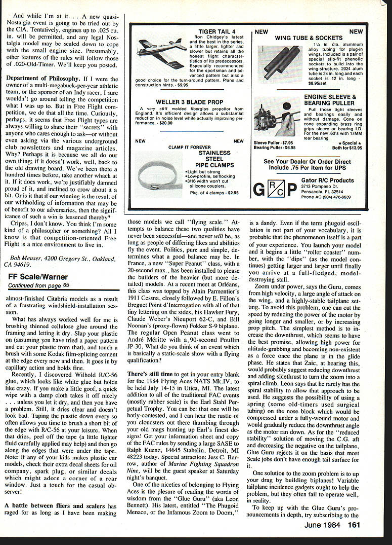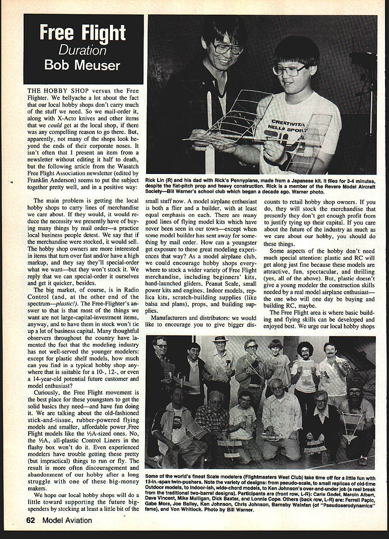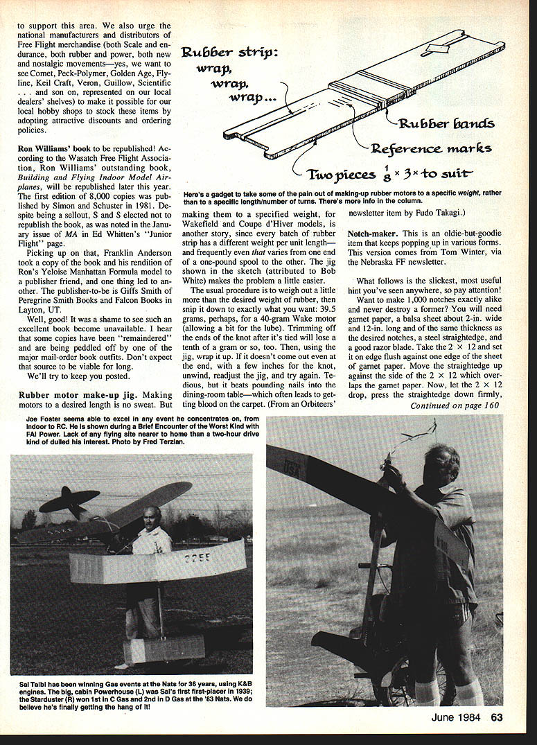 THE HOBBY SHOP versus Free Flighter bellyache lot about fact local hobby shops dont carry much stuff need So mail-order along X-Acto knives other items could get local shop compelling reason go apparently shops look yond ends corporate noses isnt often present item newsletter editing half death following article Wasatch Free Right Association newsletter edited Franklin Anderson seems put subject together pretty well positive way main problem getting local hobby shops carry lines merchandise care about would would re duce necessity presently have buy ing things mail ordera practice local business people detest say merchandise stocked would sell hobby shop owners interested items turn over fast and/or have high markup say theyll special-order what wantbut wont stock reply can special-order ourselves get quicker besides big market course Radio Control other end spectrumplastic Free-Flighters swer that things want large-capital-investment items anyway have stock wont tie up lot business capital thoughtful observers throughout country have la mented fact modeling industry has well-served younger modelers except plastic shelf models much can find typical hobby shop suitable 10- 12- 14-year-old potential future customer model enthusiast Curiously Free Right movement best place youngsters get solid basics needand have fun doing talking about old-fashioned stick-and-tissue rubber-powered flying models smaller affordable power Free Right models like /2A-sized ones No all-plastic Control Liners flashy box wont experienced modelers have trouble getting pretty impractical things run fly result often discouragement abandonment hobby after long struggle big-money makers hope local hobby shops will little toward supporting future bigspenders stocking least little bit small stuff now model airplane enthusiast both flier builder least equal emphasis good lines flying model kits have never seen townexcept some model builder has sent away some thing mail order can youngster get exposure great modeling experi ences way As model airplane club could encourage hobby shops stock wider variety Free Flight merchandise including beginners kits hand-launched gliders Peanut Scale small power kits engines Indoor models rep lica kits scratch-building supplies like balsa plans props building sup plies Manufacturers distributors would like encourage give bigger dis counts retail hobby shop owners will stock merchandise presently dont get enough profit justify tying up capital care about future industry much care about hobby should things Some aspects hobby dont need much special attention plastic RC will get along just fine because models attractive fun spectacular thrilling yes above plastic doesnt give young modeler construction skills needed real model airplane enthusiastthe will day buying building RC maybe Free Flight area basic build ing flying skills can developed enjoyed best urge local hobby shops 62 Model Aviation Rick Lin R dad Ricks Pennypiane msde Japanese kit files 3-4 minutes despite fiat-pitch prop heavy construction Rick member Revere Model Aircraft SocietyBili Warners school ciub began decade ago Warner photo Some worlds finest Scale modeiers Flightmastera West Ciub take time off iittie fun 13-in-span twin-pushers Note variety designs paeudo-scaie smaii replicas old-time Outdoor models indoor-ish wide-chord modeis Ken Johnsons over-and-under job reai break traditional two-barrei designs Participants front row L-R Carlo Godel Maroin Albert Dave Vincent Mike Mulligan Dick Baxter Lonnie Cope Others back row L-R Ferrell Papic Gabe Mora Joe Bailey Ken Johnson Chria Johnson Barnaby Wainfan Pseudoserodynamics fame Von Whitiock Photo Bill Warner support area also urge national manufacturers distributors Free Flight merchandise both Scale en durance both rubber power both new nostalgic movementsyes want see Comet Peck-Polymer Golden Age Fly line Keil Craft Veron Guillow Scientific son represented local dealers shelves make possible local hobby shops stock items adopting attractive discounts ordering policies Ron Williams book republished Ac cording Wasatch Free Flight Associa tion Ron Williams outstanding book Building Flying Indoor Model Air planes will republished later year first edition 8000 copies pub lished Simon Schuster 1981 De spite being sellout S S elected republish book noted Janu ary issue MA Ed Whittens Junior Flight page Picking up Franklin Anderson took copy book rendition Rons Yeloise Manhattan Formula model publisher friend thing led other publisher-to-be Giffs Smith Peregrine Smith Books Falcon Books Layton UT Well good shame see such excellent book become unavailable hear some copies have remaindered being peddled off major mail-order book outfits Dont expect source viable long Well try keep posted Rubber motor make-up jig Making motors desired length no sweat RuEi6er slr4i wrap wrap uiber and5 kefernce mctrs Twoicces x3xosujt Heres gadget take some pain out making-up rubber motors specific weight rather specific length/number turns Theres info column making specified weight Wakefield Coupe dHiver models another story since batch rubber strip has different weight per unit length frequently varies end one-pound spool other jig shown sketch attributed Bob White makes problem little easier usual procedure weigh out little desired weight rubber snip down exactly what want 395 grams perhaps 40-gram Wake motor allowing bit lube Trimming off ends knot after its tied will lose tenth gram too using jig wrap up doesnt come out end few inches knot unwind readjust jig try again Te dious beats pounding nails dining-room tablewhich often leads get ting blood carpet Orbiteers newsletter item Fudo Takagi Notch-maker oldie-but-goodie item keeps popping up various forms version comes Tom Winter via Nebraska FF newsletter What follows slickest useful hint youve seen anywhere pay attention Want make 1000 notches exactly alike never destroy former will need garnet paper balsa sheet about 2-in wide 12-in long same