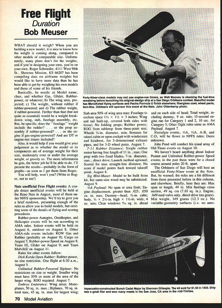 Free Flight Duration Bob Meuser WHAT should weigh building new model nice know weight coming along compared other models comparable size Unfortu nately plans dont list weights youre designing own youre own Roger Schroeder 4111 West 98th St Shawnee Mission KS 66207 has compiling data airframe weights would like have data has able get weighing own models some friends Basically needs Model name class whether Gas Glider Rubberpower whatever b wing area pro jected c weight rubber rubber-powered d rubber weight rubber-powered Further quite essential would weight break down wing stab fuselage assembly etc specific does fuselage weight include rudder op sembly rubber-powered gine gas-engine-powered DT engine-run timers included Also would help would give judgement whether model its components average weight size moderately over under average weight grossly information gets better job hell able Ill present resultsprobably form graphsas soon get Roger will help wont Write Rog er Nats unofficial Free Flight events cou ple dozen unofficial events will held Reno Nats August un der NFFS sponsorship Well try give brief rundown presenting enough rules allow build models omit ting some details flying scoring procedures Rubber-power Autogiro Omithopter Helicopter events will run according AMA rules Indoor events will held August 6 outdoor August 8 Other AMA-rule events include ROW Gas Rubber probably August 9 Cargo August 7 Rubber-power Speed August 8 Team HL Glider August 9 Team Mulvihill August 11 Rules other events follow Dick Korda Open Rubber Rubber-power no size restriction flight 630 August 9 Unlimited Rubber-Powered Biplane No restrictions size weight Smaller wing must have 50% area larger wing ROG required August 7 Embryo Endurance Wing areas Monoplanes 50 sq max Biplanes 70 sq total max 45 sq max largest wing Stab area 50% wing area max Fuselage enclose space 11/4 x 1 inches Wing tail built-up covered both sides tissue No folding props Rubber power ROG tabletop three-point rest Wheels 3/4-in diameter mm Bonuses raised cabin open cockpit windscreen headrest 3-dimensional exhaust pipes 3-D wheel pants August 7 7-11 Rubber Distance Single rubber motor having free length 11 max prop two fixed blades 7-in diameter max direct drive Launch method optional Scored max straight-line distance No score model points back toward takeoff point August 8 Sig Mini-Maxer Model built kit same-size wood may substituted August 9 /2A Payload No span area limit En gine displacement greater 025 050 cu max Dummyhead 3/4-in cube body 3/4 X 2/4-in high x 1-in wide 4 oz mm Clear windows /I6 sq ahead side head Total weight cluding dummy 9 oz mm 15-second en gine run Category 1 2 10 sec Category 3 Other flight rules same AMA Payload August 7 Nostalgia events A A-B C-D will flown NFFS rules Dates unknown John Pond will conduct usual array Old-Timer events August 10 havent heard anything about Indoor Peanut Unlimited Rubber-power Speed events past closed course around poles 20 ft apart Orbiteers San Diego will host unofficial Forty-Niner event Nats warned rules bit different presented before column elsewhere Briefly Max span length 49 Mm fuselage cross section 49 sq cm 765 sq Engine 049 reed-valve direct drive no gears Mm weight 349 grams 123 oz No variable-geometry surfaces ie no auto70 Model Aviation Forty-Niner-class models may use engine-run timers Walt Mooney checking fuel-time remaIning before launching original-design ship San Diego Orbiteers contest Beautiful model has MonoKoted flying surfaces Pactra Formula U finish elsewhere fiberglass cowl wheel pants twin-fins Orbiteers will sponsor event Nats John Oldenkamp photo Impeccably-constructed Bunch Cadet Major Sherman Gillespie kit sold $150 1935 ShIP great flier won meets San Jose CA area mid-Thirties anything Fuel 15% nitro furnished meet Engine-mn timing fuel-volume control onlyno clockwork timers Eye droppers open fuel tanks stuffed glass beads whatever calibrated lengths fuel tubing etc OK Main landing gear have two wheels 25% time-bonus ROG Max 120 seconds seven attempts best three count Flight time under 49 seconds unofficial Fractions seconds dropped Engine run taken greater 15 sec actual run Score flight duration divided engine run multiplied 125 ROG Keeping up changes rules interesting event getting painbut far better stick rules less best far better change whenever change will help early stages life event rather let bad inadequate rules solidify time point needed changes become extremely difficult sell however great need date August 11 info contact John Oldenkamp 3331 Adams Ave San Diego CA 92116 Also mark Thursday August 9 calendar NFFS Symposium awards presentation World-record kite aint RC aint CL looks like Free Flight model its gotta Free Right OK model shown sketch made record flight 9 hr 13 mm 1979 fol lowed up 39 hr 53 mm 1981 Both flights made Seattle Kingdome design appears based series record-breakers built Bill Bigge years ago least principle same hard tow effective CG extension towline model flies conventional wing-first mode towline slacked off gravity force acting effective CG becomes actual CG model flies backwards canard Bigge used rub ber strip rear part bridle order get automatic decrease angle attack increasing tow speed wing- tail-mount regions covered condenser paper act fins Getting areas just right provide directional stability during flight both directions could little tricky maybe designer just lucked out Im bit uncertain actually flew model could have Pinky whoever C Breweror likely team Quite project record likely broken quite spell Third US Indoor Championships Five solid days Indoor flying June 18-22 Michigan State Fair Coliseum Detroit official menu Champs takes place first three days includes AMA events except Helicopter Autogiro Ornithopter included plus Manhattan Cabin Bostonian Peanut Speed Un limited Speed latter two events entail two timed laps around two pylons 20 ft 7 4 2 /3/ Pres/ru* 7 cot 7der7 ser loper Paqona/ rits hd