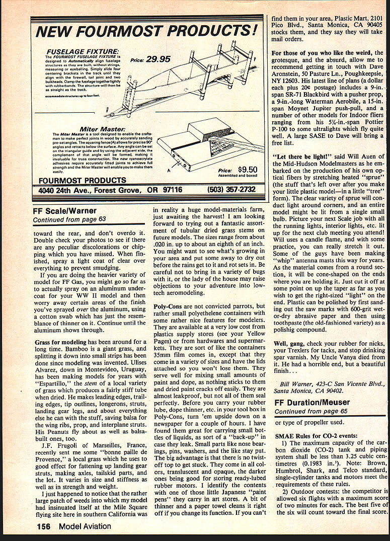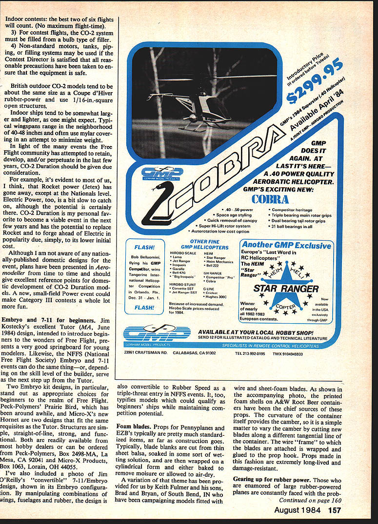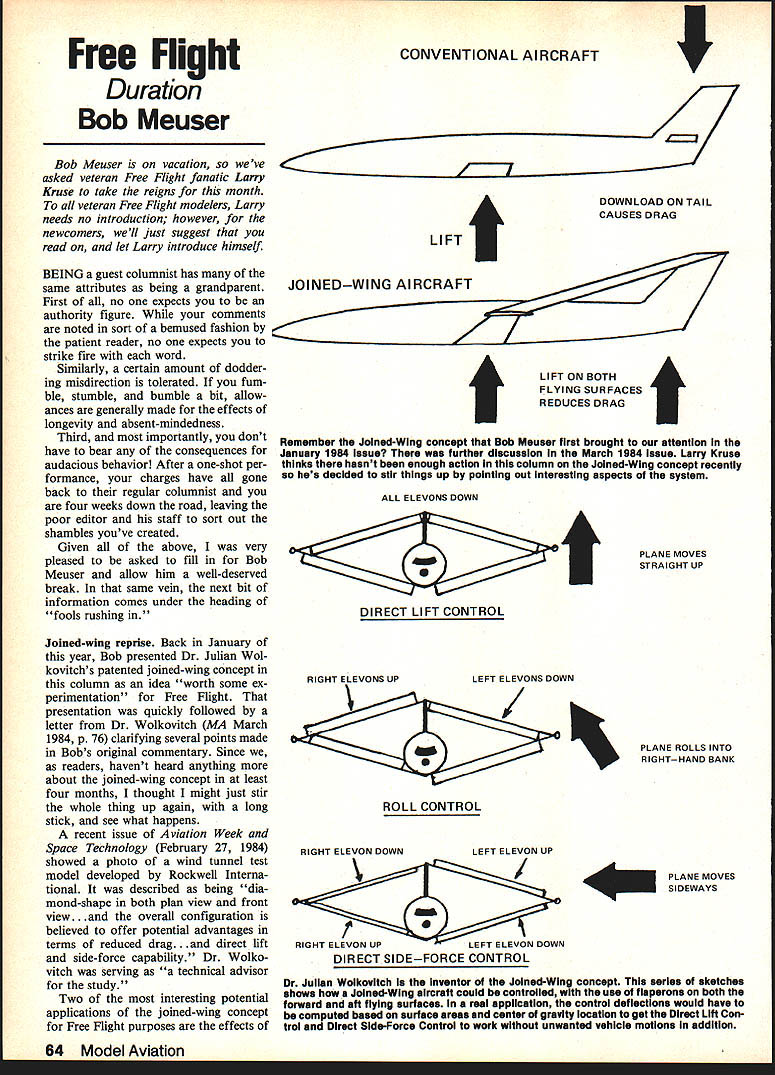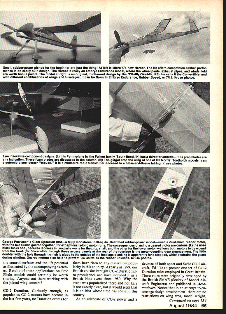 Free Flight Duration Bob Meuser CONVENTIONAL AIRCRAFT Bob Meuser vacation weve asked veteran Free Flight fanatic Larry Kruse take reigns month veteran Free Flight modelers Larry needs no introduction however newcomers well just suggest read let Larry introduce himself BEING guest columnist has same attributes being grandparent First no expects authority figure comments noted sort bemused fashion patient reader no expects strike fire word Similarly certain amount dodder ing misdirection tolerated fum ble stumble bumble bit allow ances generally made effects longevity absent-mindedness Third importantly dont have bear consequences audacious behavior After one-shot per formance charges have gone back regular columnist four weeks down road leaving poor editor staff sort out shambles youve created Given above very pleased asked fill Bob Meuser allow him well-deserved break same vein next bit information comes under heading fools rushing m DOWNLOAD ON TAIL CAUSES DRAG LIFT * JOINEDWING AIRCRAFT * LIFT ON BOTH FLYING SURFACES REDUCES DRAG * Remember Joined-Wing concept Bob Meuser first brought attention January 1984 Issue further discMssIon March 1984 issue Larry Kruse thinks hasnt enough action column Joined-Wing concept recently hes decided stir things up pointing out interesting aspects system ALL ELEVONS DOWN * PLANE MOVES STRAIGHT UP DIRECT LIFT CONTROL Joined-wing reprise Back January year Bob presented Dr Julian Wol kovitchs patented joined-wing concept column idea worth some ex perimentation Free Flight presentation quickly followed letter Dr Wolkovitch MA March 1984 p 76 clarifying several points made Bobs original commentary Since readers havent heard anything about joined-wing concept least four months thought might just stir whole thing up again long stick see what happens recent issue Aviation Week Space Technology February 27 1984 showed photo wind tunnel test model developed Rockwell Interna tional described being dia mond-shape both plan view front view. overall configuration believed offer potential advantages terms reduced drag. direct lift side-force capability Dr Wolko vitch serving technical advisor study Two interesting potential applications joined-wing concept Free Flight purposes effects RIGHT ELEVONS UP / S ROLL CONTROL RIGHT ELEVON DOWNLEFT ELEVON UP RIGHT ELEVON UPLEFT ELEVON DOWN DIRECT SIDEFORCE CONTROL Dr Juilan Woikovitch Inventor Joined-Wing concept series sketches shows Joined-Wing aircraft could controlled use fiaperons both forward aft flying surfaces real application control defiections would have computed based surface areas center gravity location get Direct Lift Con trol Direct Side-Porce Control work unwanted vehicle motions addition 64 Model Aviation 1 LEFT ELEVONS DOWN PLANE ROLLS INTO RIGHTHAND BANK 4 PLANEMOVES SIDEWAYS Small rubber-power planes beginner just thingl left Micro-Xs new Hornet kit offers competition-caliber perfor mance easily-built design Hornet really Embryo Endurance model wheel pants exhaust pipes windshield worth bonus points model right original multi-event design Jim OReilly Wichita KS calls Convertible different combinations wings fuselages can flown Embryo Endurance Rubber Speed 7111 Kruse photos Two innovative component designs 1 Pennyplane Fulmer family South Bend IN has thirst altitudeIf Its prop blades indication foam blades discussed column R gidget atop wing Gil Morris Toothpick models electronic plane-locator mouse miniature radio transmitter encased balsa-and-tissue fairing Kruse photos George Perrymans Giant Speckled Birda truly monstrous 850-sq-ln Unlimited rubber-power modelused dual-skein rubber motor two skeins geared together exceptionally-ions motor runs consequences using geared motor curious L nose block looks odd because comes two parts prop shaft other lower motor allows both motors wound front R Discernible through access panels rear fuselage motor-coupling gear arrangement little doubler hole through glued outside fuselage planking apparently stop-rod restrains gears during winding Geared motors also help prevent CG shifts rubber unwinds Kruse photos control surfaces lift potential illustrated accompanying sketch es Results applications Free Flight models could certainly worth sharing Anyone out working joined-wing concept CO-2 Duration Curiously enough popular CO-2 motors have become last few years no Duration events have risen discernible popu larity country Asearly 1979 British cousins brought CO-2 Duration prominence have included British Nats event since 1980 event popularized not exactly clear would seem idea time has come country As advocate CO-2 power devotee both sport Scale CO-2 air craft Id like present set CO-2 Duration rules employed Great Britain rules originally developed British SMAE Society Model Air craft Engineers published Aero modeller Notice attempt en courage design development no restrictions wing area model weight Continued page 156 August 1984 65 NEW FOURMOST PRODUCTS FUSELAGE FIXTURE FOURMOST FUSELAGE FIXTURE designed AutomaticiIy align fuselage structures built strings measaring eyeballing Simply slide four centering brackets track until align mith firewall tail joint two hulkhasds Clamp fuselagetogether lightly rubberbands structure will straight track aaswitOOasmaap 9 las l5a Price 2995 Miter Master Miter Mast, tool designed enable crafts man make perfect joints wood accurately sanding pm-set angles sqoaring fence allows forprecise 90 angles end retracts below surface Any angle can set triangular guide aning adjacent side complement angle will formed making invaluable truss construction new cyanoacrylate adhesives require uccorately fitted joints achieve full strength Miter Master will enableyou make easily FOURMOST PRODUCTS 4040 24th Ave Forest Grove OR 97116 FF ScalelWarner Continued page 63 toward rear dont overdo Double check photos see peculiar discolorations chip ping have missed fin ished spray light coat clear over everything prevent smudging doing heavier variety model