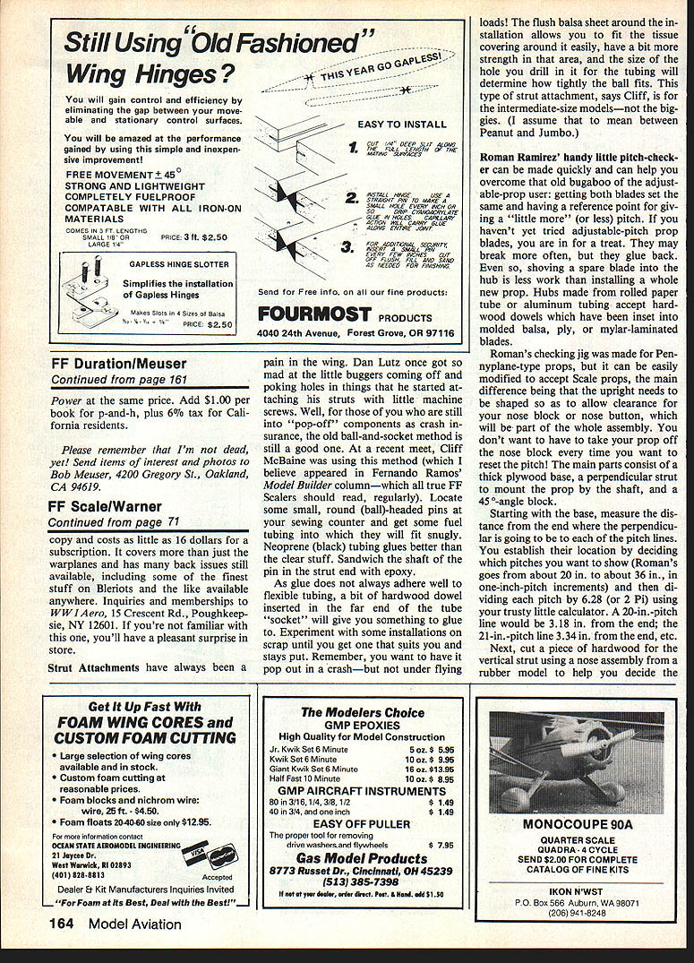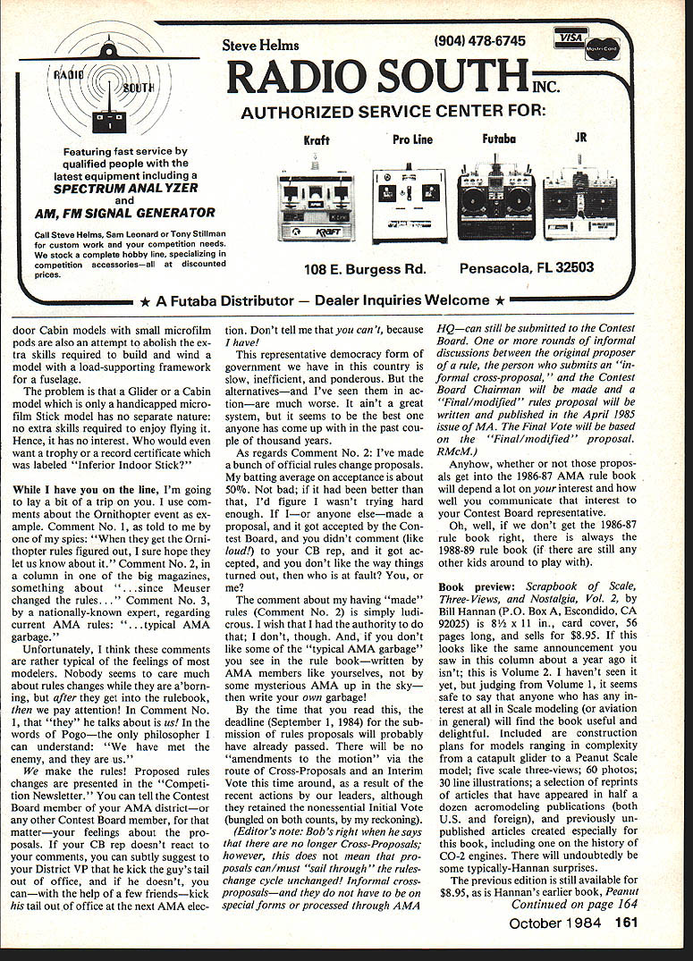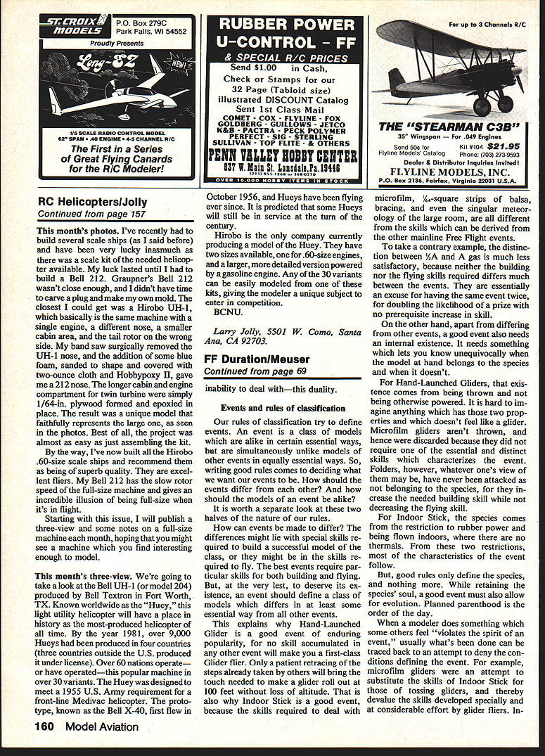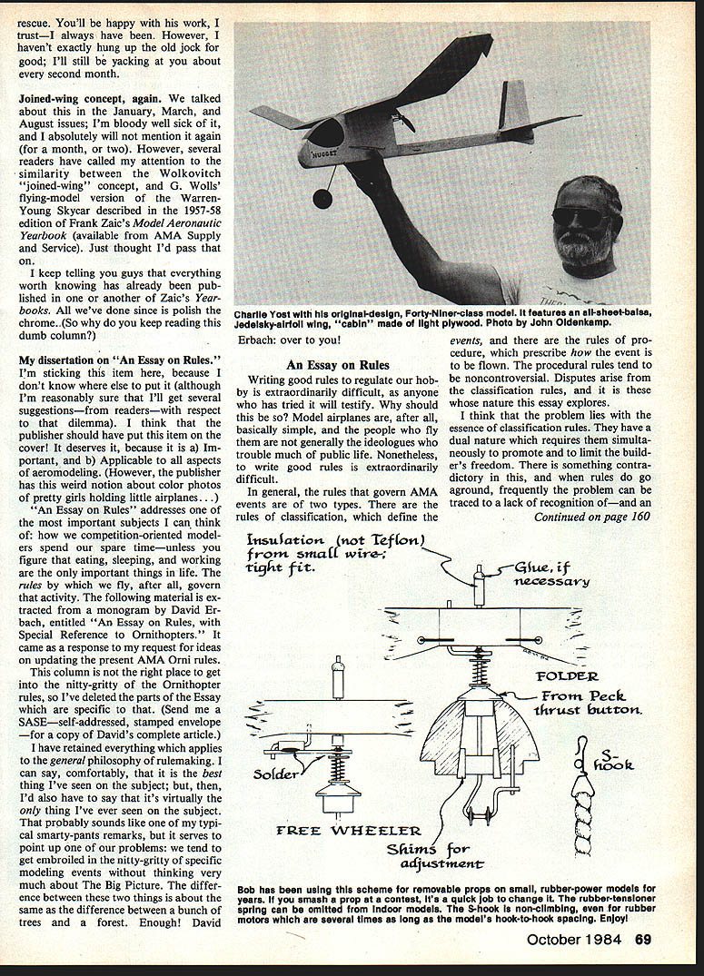 Free Flight Duration Bob Meuser NEW KID block Hey have new man Free Flight Duration team namely Harry Murphy CIA Yes reasons Ill get minute Im going take life little easier starting next month youll reading Harrys thoughts regular basis Harry Murphy has editor newsletter CIA Informer several yearsand its top two such publications country think hes done bang-up job Im con fident hell very well new assignment Model Aviation hope realize CIA Harry member real CIA Central Indiana Aeromodelers said bit earlier going tell Ive decided ease off bit have always written about things liked write about wont cant write about anything else Im pro writer can write innocuous gar bage about assigned topic Fortunate ly has great mismatch between what have written Model Aviation what editors have wanted write However find creasingly difficult find time write stuff like write about dont like fill column lengthy quotes newsletters personal correspondence simply fill up space month space devoted Free Flight modeling maga zines precious stuff deserves well-spent So became time holler Help Harry Murphy came 68 Model Aviation Tom Alden Vancouver DC flew Old-Timer Stick rubber-power ship Orbiteers Annual 84 Taft CA Tail design betrays Its age Photo John Oldenkamp Martyn Cowisy holding plane has Just set new A-i Towline Glider National Record 45 mm 37 sec lithe Mx Men Annual held Taft CA Martyn being congratulated Mike McKeever almost set record Martyn tied 35 mm lost model 8-mm-max flight winding up l 43 mm enough break Martyns year-old record 40 mm 22 eec However Martyn put up 8-mm max tooand didnt lose plane lOt him make still another flight2 mm 37 sec new record Timers Mike Fantham visiting England-L Lee Hines R rescue Youll happy work trustI always have However havent exactly hung up old jock good Ill still yacking about second month Joined-wing concept again talked about January March August issues Im bloody well sick absolutely will mention again month two However several readers have called attention similarity between Wolkovitch joined-wing concept G Wolls flying-model version WarrenYoung Skycar described 1957-58 edition Frank Zaics ModelAeronautic Yearbook available AMA Supply Service Just thought Id pass keep telling guys everything worth knowing has already pub lished another Zaics Yearbooks weve done since polish chrome So keep reading dumb column dissertation An Essay Rules Im sticking item because dont know else put although Im reasonably sure Ill get several suggestionsfrom readerswith respect dilemma think publisher should have put item cover deserves because Im portant b Applicable aspects aeromodeling However publisher has weird notion about color photos pretty girls holding little airplanes. An Essay Rules addresses important subjects can think competition-oriented model ers spend spare timeunless figure eating sleeping working important things life rules fly after govern activity following material ex tracted monogram David Erbach entitled An Essay Rules Special Reference Ornithopters came response request ideas updating present AMA Orni rules column right place get nitty-gritty Ornithopter rules Ive deleted parts Essay specific Send SASEself-addressed stamped envelope copy Davids complete article have retained everything applies general philosophy rulemaking can say comfortably best thing Ive seen subject Id also have say its virtually thing Ive ever seen subject probably sounds like typi cal smarty-pants remarks serves point up problems tend get embroiled nitty-gritty specific modeling events thinking very much about Big Picture differ ence between two things about same difference between bunch trees forest Enough David An Essay Rules Writing good rules regulate hob extraordinarily difficult anyone has tried will testify should Model airplanes after basically simple people fly generally ideologues trouble much public life Nonetheless write good rules extraordinarily difficult general rules govern AMA events two types rules classification define events rules pro cedure prescribe event flown procedural rules tend noncontroversial Disputes arise classification rules nature essay explores think problem lies essence classification rules have dual nature requires simulta neously promote limit build ers freedom something contra dictory rules go aground frequently problem can traced lack recognition ofand Continued page 160 tnsu%ation trot Tef 5ntaU wire ti5ht fitGAue necessciry n x FREE WHEELETk Peck. / thrust iutvon ///5 //ftcok Saim5 afJu5tmenv Bob has using scheme removable props email rubber-power models years smash prop contest its quick job change rubber-tensioner spring can omitted Indoor models S-hook non-ciimbing rubber motors several times iong modeis hook-to-hook spacing Enjoy October1984 69 Charlie Yost original-design Forty-N iner-ciass model features all-sheet-baisa Jedeisky-airfoii wing cabin made iight piywood Photo John Oidenkamp Erbach over PO Box 27903 Park Falls WI 54552 3 -Proud/v PresentsI RC HelicopterslJolly Continued page 157 months photos Ive recently build several scale ships said before have very lucky inasmuch scale kit needed helicop ter available luck lasted until build Bell 212 Graupners Bell 212 wasnt close enough didnt have time carve plug make own mold closest could get Hirobo UH-l basically same machine single engine different nose smaller cabin area tail rotor wrong side band saw surgically removed UH-1 nose addition some blue foam sanded shape covered No-ounce cloth Hobbypoxy U gave 212 nose longer cabin engine compartment twin turbine simply 1/64-in plywood formed epoxied place result unique model faithfully represents large seen photos Best project almost easy just assembling kit way Ive now built Hirobo 60-size scale ships recommend being superb quality excel lent fliers Bell 212 has slow rotor speed full-size machine gives incredible illusion being full-size its flight Starting issue will publish three-view some notes full-size machine month hoping might se