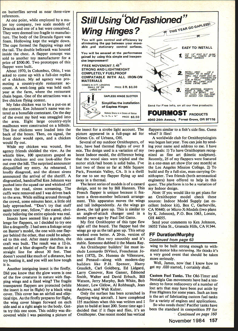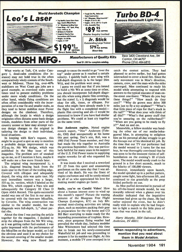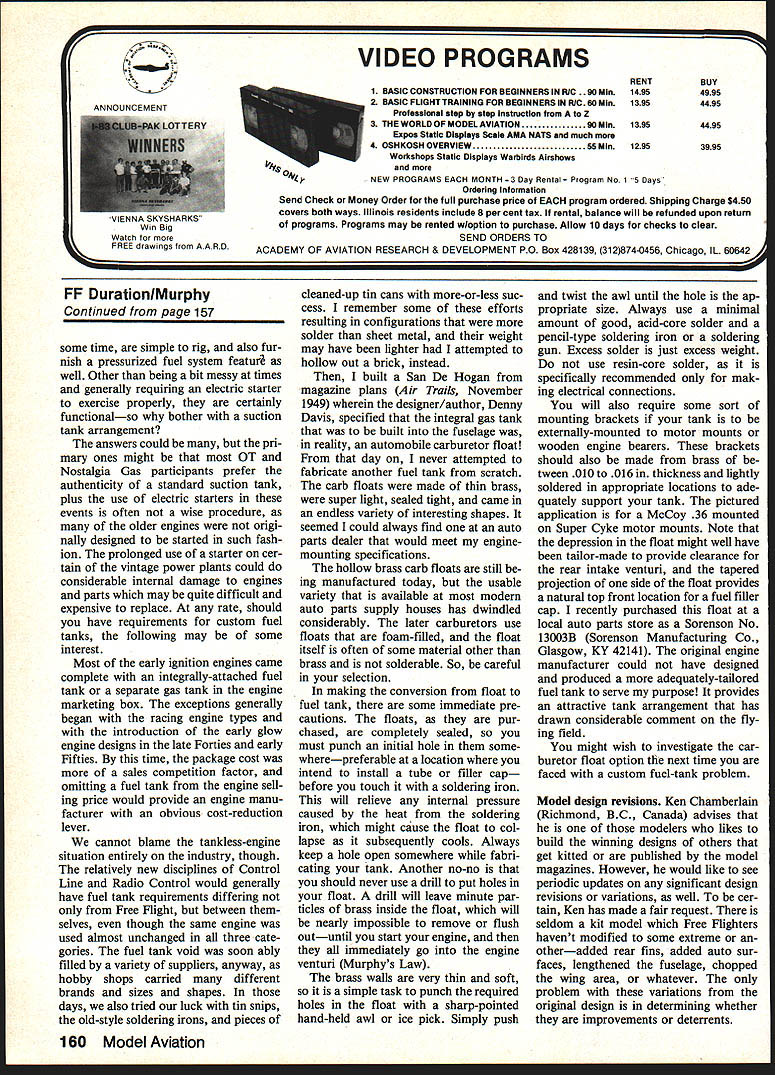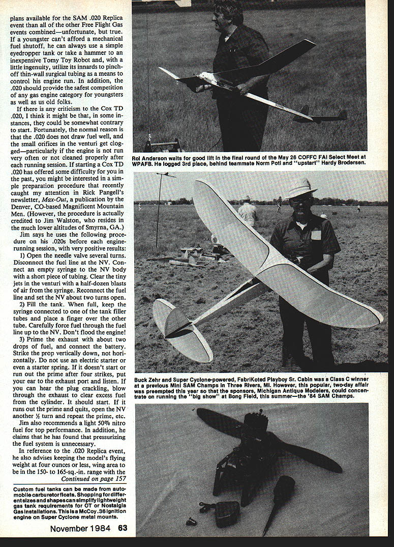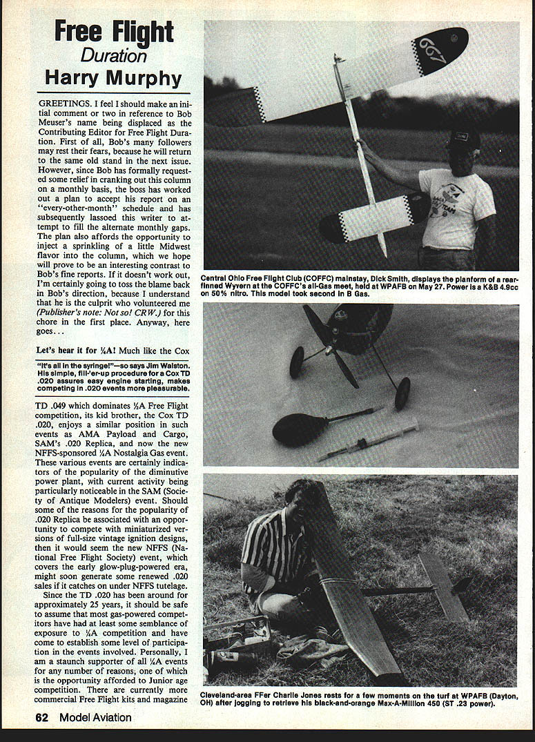 Free Flight Duration Harry Murphy GREETINGS feel should make ini tial comment two reference Bob Meusers name being displaced Contributing Editor Free Flight Dura tion First Bobs followers may rest fears because will return same old stand next issue However since Bob has formally request ed some relief cranking out column monthly basis boss has worked out plan accept report every-other-month schedule has subsequently lassoed writer tempt fill alternate monthly gaps plan also affords opportunity inject sprinkling little Midwest flavor column hope will prove interesting contrast Bobs fine reports doesnt work out Im certainly going toss blame back Bobs direction because understand culprit volunteered Publishers note CR W chore first place Anyway goes. Lets hear Y4A Much like Cox ifs syrlngeso says Jim Waiston simple flii-er-up procedure tori Cox TD 020 assures easy engine stifling makes competing 020 events pleasurable TD 049 dominates AA Free Flight competition its kid brother Cox TD 020 enjoys similar position such events AMA Payload Cargo SAMs 020 Replica now new NFFS-sponsored AA Nostalgia Gas event various events certainly indica tors popularity diminutive power plant current activity being particularly noticeable SAM Socie ty Antique Modelers event Should some reasons popularity 020 Replica associated oppor tunity compete miniaturized ver sions full-size vintage ignition designs would seem new NFFS Na tional Free Flight Society event covers early glow-plug-powered era might soon generate some renewed 020 sales catches under NFFS tutelage Since TD 020 has around approximately 25 years should safe assume gas-powered compet itors have least some semblance exposure AA competition have come establish some level participa tion events involved Personally am staunch supporter events number reasons opportunity afforded Junior age competition currently commercial Free Flight kits magazine 62 Model Aviation Central Ohio Free Flight Club COFFC mainstay Dick Smith displays pianform rear finned Wyvern COFFCs ill-Gas meet held WPAFB Miy 27 Power K&B 49cc 50% nitro model took second B Gas Cleveland-area FFer Charlie Jones rests few moments turf WPAFB Dayton OH after Jogging retrieve black-and-orange Max-A-Million 450 ST 23 power plans available SAM 020 Replica event other Free Flight Gas events combinedunfortunate true youngster cant afford mechanical fuel shutoff can always use simple eyedropper tank take hammer inexpensive Tomy Toy Robot little ingenuity utilize its innards pinchoff thin-wall surgical tubing means control engine run addition 020 should provide safest competition gas engine category youngsters weli us old folks criticism Cox TD 020 think might some stances could somewhat contrary start Fortunately normal reason 020 does draw fuel well small orifices venturi get clog gedparticularly engine run very often cleaned properly after running session starting Cox TD 020 has offered some difficulty past might interested sim ple preparation procedure recently caught attention Rick Pangells newsletter Max-Out publication Denver CO-based Magnificent Mountain Men However procedure actually credited Jim Walston resides much lower altitudes Smyrna GA Jim says uses following proce dure 020s before enginerunning session very positive results 1 Open needle valve several turns Disconnect fuel line NV Con nect empty syringe NV body short piece tubing Clear tiny jets venturi half-dozen blasts air syringe Reconnect fuel line set NV about two turns open 2 Fill tank full keep syringe connected tank filler tubes place finger over other tube Carefully force fuel through fuel line up NV Dont flood engine 3 Prime exhaust about two drops fuel connect battery Strike prop vertically down hori zontally use electric starter starter spring doesnt start run out prime after four strikes put ear exhaust port listen can hear plug crackling blow through exhaust clear excess fuel cylinder should start runs out prime quits open NV another 1A turn repeat prime etc Jim also recommends light 50% nitro fuel top performance addition claims has found pressurizing fuel system unnecessary reference 020 Replica event also advises keeping models flying weight four ounces less wing area 150- 165-sq-in range Continued page 157 Custom fuel tanks can made auto mobile carburetorfiosts Shopping fordiffer entaizesand shapescanslmpilfyiightwelght gas tank requirements OT Nostalgia Gas instaiiations isa McCoy36 ignition engine Super Cyclone metai mounts Roi Anderson waits good iift final round May 26 COFFC FAI Select Meet WPAFB logged 3rd place behind teammate Norm Poti upstart Hardy Brodersen Buck Zehr Super Cyclone-powered Fabrioted Playboy Sr Cabin Class C winner previous Mini SAM Champs Three Rivers Mi However popular twoday affair preempted year sponsors Michigan Antique Modelers could concen trate running big show Bong Field summerthe 84 SAM Champs butterflies served near three-view references point employed ma jor toy company two scale models Dracula bat conceived deemed too fragile manufac ture body Dracula figure foam Hollowing kept weight down cape formed flapping wings tail double bellcrank housed inside chest flapper concept sold another toy manufacturer price $50000 Two prototypes flapper built About 1970 Columbus Ohio asked come up full-size replica chicken ad agency pro moting country-style restaurant ac count week-long gala held year farm restaurant chain began attractions live chicken flying contest fake chicken put-on contest Ken Johnsons name en tered bonafide contestant day event bird smuggled area Eight large country-style mailboxes constructed hillside live chickens loaded back boxes signal front door would open chicken would fly out chicken wound five agency friends shielded view As whistle blew 100 spectators gasped seven chickens look-alike flew out over hill surprised announcer disqualified entry As rehearsed loudly disagreed distant sirens announced arrival sheriff disgruntled handcuffed Ken Johnson pushed squad car 