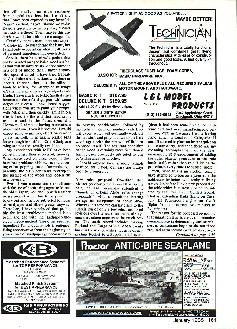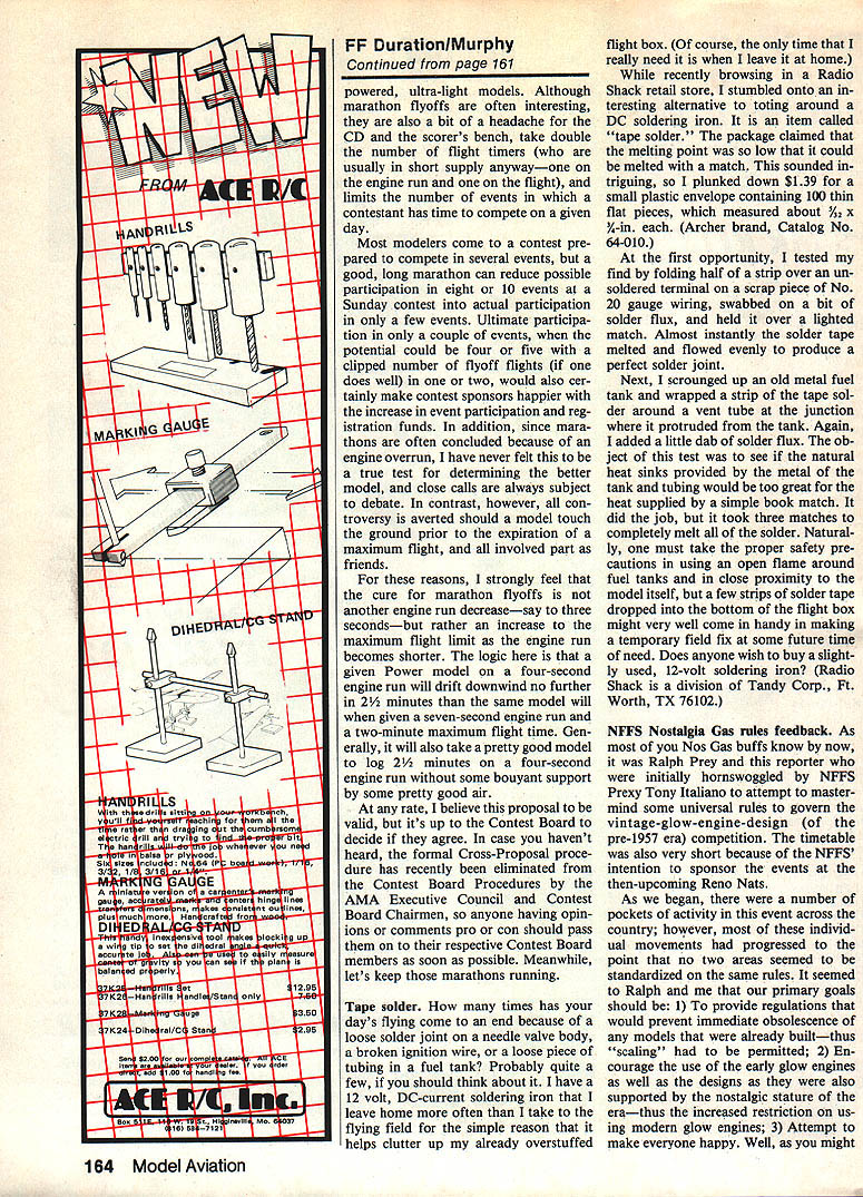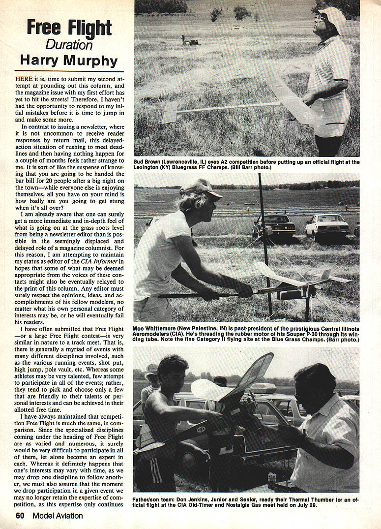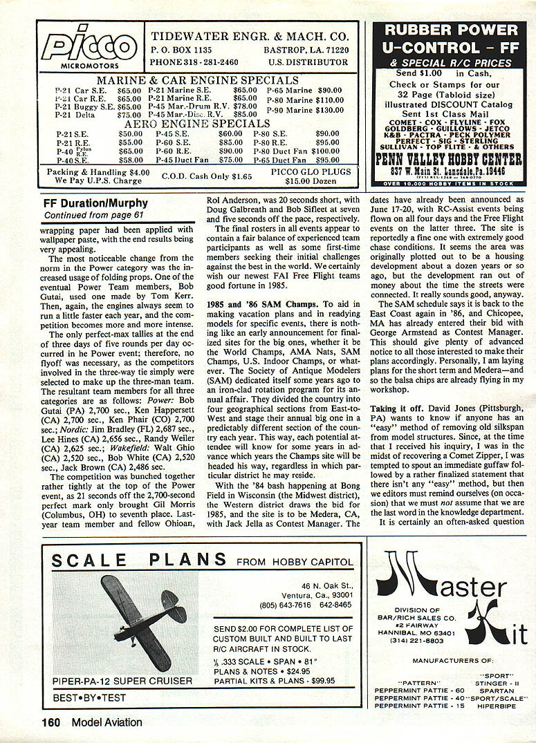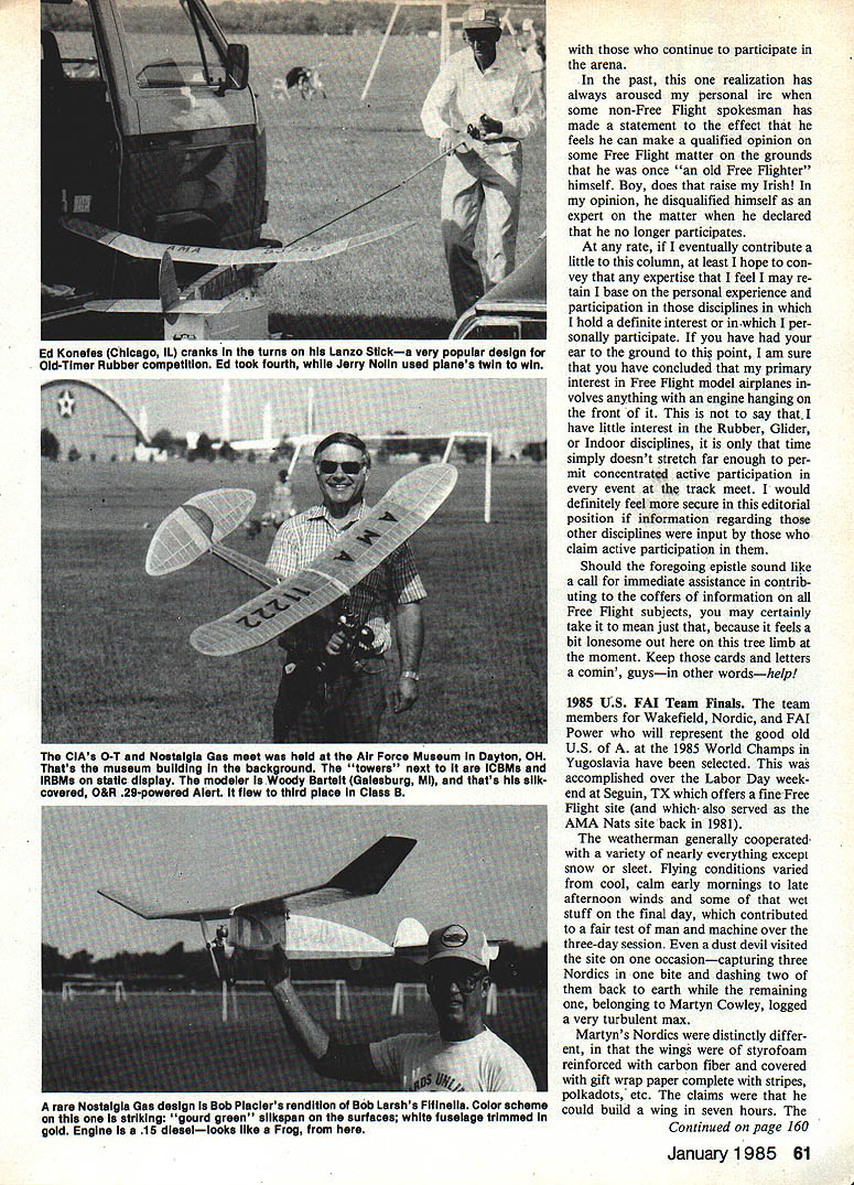 Free Flight Duration Harry Murphy HERE time submit second tempt pounding out column magazine issue first effort has yet hit streets Therefore havent opportunity respond ini tial mistakes before time jump make some contrast issuing newsletter uncommon receive reader responses return mail delayedaction situation rushing meet dead lines having nothing happen couple months feels rather strange sort like suspense know ing going handed bar bill 20 people after big night townwhile everyone else enjoying themselves have mind badly going get stung its over am already aware can surely get immediate in-depth feel what going grass roots level being newsletter editor pos sible seemingly displaced delayed role magazine columnist reason am attempting maintain status editor CIA Informer hopes some what may deemed appropriate voices con tacts might also eventually relayed print column Any editor must surely respect opinions ideas ac complishments fellow modelers no matter what own personal category interests may will eventually fail readers have often submitted Free flight large Free flight contestis very similar nature track meet generally myriad events different disciplines involved such various running events shot put high jump pole vault etc Whereas some athletes may very talented few attempt participate events rather tend pick choose few friendly talents per sonal interests can achieved allotted free time have always maintained competi tion Free Flight much same com parison Since specialized disciplines coming under heading Free Flight varied numerous surely would very difficult participate let alone become expert Whereas definitely happens ones s interests may vary time may drop discipline follow anoth er must also assume moment drop participation given event may no longer retain expertise com petition expertise continues 60 Model Aviation Bud Brown Lawrenceviile IL eyes A2 competition before putting up official flight Lexington KY Bluegrass FF Champs Bill Barr photo Moe Whittemore New Palestine IN pastpresldent prestigious Central Illinois Aeromodelers CIA Hes threading rubber motor Souper P40 through its wIn ding tube Note fine Category II flying site Blue Grass Champs Barr photo Fatherlson team Don Jenkins Junior Senior ready Thermal Thumber ficial flight CIA Old-Timer Nostalgia Gas meet held July 29 continue participate arena past realization has always aroused personal ire some non-Free Flight spokesman has made statement effect feels can make qualified opinion some Free Flight matter grounds once old Free Plighter himself Boy does raise Irish opinion disqualified himself expert matter declared no longer participates rate eventually contribute little column least hope con vey expertise feel may re tain base personal experience participation disciplines hold definite interest inwhich per sonally participate have ear ground thi point am sure have concluded primary interest Free Flight model airplanes volves anything engine hanging front say have little interest Rubber Glider Indoor disciplines time simply doesnt stretch far enough per mit concentratd active participation event track meet would definitely feel secure editorial position information regarding other disciplines input claim active participation Should foregoing epistle sound like call immediate assistance contrib uting coffers information Free Flight subjects may certainly take mean just because feels bit lonesome out tree limb moment Keep cards letters comm guysin other wordshelp 1985 US FAI Team Finals team members Wakefield Nordic FAT Power will represent good old US 1985 World Champs Yugoslavia have selected accomplished over Labor Day week end Seguin TX offers fineFree Flight site also served AMA Nats site back 1981 weatherman generally cooperated variety nearly everything except snow sleet Flying conditions varied cool calm early mornings late afternoon winds some wet stuff final day contributed fair test man machine over three-day session dust devil visited site occasioncapturing three Nordics bite dashing two back earth remaining belonging Martyn Cowley logged very turbulent max Martyns Nordics distinctly differ ent wings styrofoam reinforced carbon fiber covered gift wrap paper complete stripes polkadots etc claims could build wing seven hours Continued page 160 January 1985 61 Ed Konefes Chicago IL cranks turns Lanzo Sticka very popular design Old-Timer Rubber competition Ed took fourth Jerry Noun used planes twin win CIAs O-T Nostalgia Gas meet held Air Force Museum Dayton OH Thats museum building background towers next iCBMs IRBMs static dispisy modeier Woody Barteit Gaiesburg Mi thats siik covered O&R 29-powered Alert flew third piace Ciass B rare Nostalgia Gas design Bob Piaclers rendition Bob Larshs Fifinelia Color scheme striking gourd green slikapan surfaces white fuselage trimmed gold Engine 15 dIesellooks like Frog L7~ TIDEWATER ENGR & MACH CO PO BOX 1135BASTROP LA 71220 MICROMOTORSPHONE 318-281-2460US DISTRIBUTOR MARINE &CAR ENGINE SPECIALS P-21Car SE $6500 P21 Marine SE$6500 P-65 Marine $9000 t-1 Car RE $6500 P-21 Marine RE$6500 P-SO Marine $11000 P-21 Buggy SE $6500 P-45 Mar-Drum RV $7800 P-90 Marine $13000 P21Delta$7500 P-45Mar-Di RV $8500 AERO ENGINE SPECIALS $5000P45 SF$6000P-SO SE $5500P-60 SF$8500P80 RE $6500P-60 RE$9000P-80 Duct Fan $5800P-45 Iuct Fan$7500P-65 Duct Fan Packing & Handling $400 COD Cash Only $165PICCO GLO PLUGS Pay UPS Charge$1500 Dozen FF DurationlMurphy Continued page 61 wrapping paper applied wallpaper paste end results being very appealing noticeable change norm Power category creased usage folding props eventual Power Team members Bob Gutai used made Tom Kerr again engines always seem run little faster year com petition becomes more intense perfect-max tallies end three days five rounds per day oc curred Power event therefore no flyoff necessary competitors involved three-way tie simply selected make up three-man team resultant team members three categories follows Power Bob Gutai PA 27