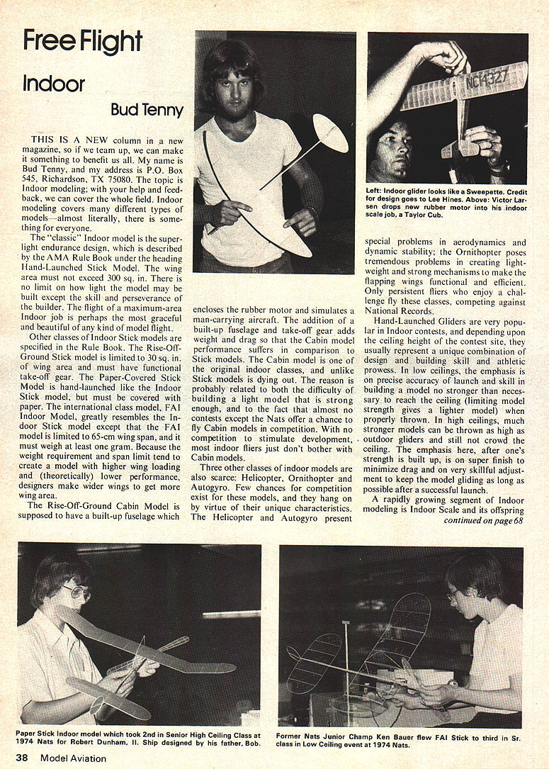 Free Flight Indoor Bud Tenny THIS IS NEW column new magazine team up can make something benefit us name Bud Tenny address PO Box 545 Richardson TX 75080 topic Indoor modeling help feed back can cover whole field Indoor modeling covers different types models-almost literally some thing everyone classic Indoor model superlight endurance design described AMA Rule Book under heading Hand-Launched Stick Model wing area must exceed 300 sq no limit light model may built except skill perseverance builder flight maximum-area Indoor job perhaps graceful beautiful kind model flight Other classes Indoor Stick models specified Rule Book Rise-OffGround Stick model limited 30 sq wing area must have functional take-off gear Paper-Covered Stick Model hand-launched like Indoor Stick model must covered paper international class model FAT Indoor Model greatly resembles door Stick model except FAT model limited 65-cm wing span must weigh least gram Because weight requirement span limit tend create model higher wing loading theoretically lower performance designers make wider wings get wing area Rise-Off-Ground Cabin Model supposed have built-up fuselage encloses rubber motor simulates man-carrying aircraft addition built-up fuselage take-off gear adds weight drag Cabin model performance suffers comparison Stick models Cabin model original indoor classes unlike Stick models dying out reason probably related both difficulty building light model strong enough fact almost no contests except Nats offer chance fly Cabin models competition no competition stimulate development indoor fliers just dont bother Cabin models Three other classes indoor models also scarce Helicopter Ornithopter Autogyro Few chances competition exist models hang virtue unique characteristics Helicopter Autogyro present special problems aerodynamics dynamic stability Ornithopter pes tremendous problems creating light weight strong mechanisms make flapping wings functional efficient Only persistent fliers enjoy zhal lenge fly classes competing against National Records Hand-Launched Gliders very popu lar Indoor contests depending upon ceiling height contest site usually represent unique combination design building skill athletic prowess low ceilings emphasis precise accuracy launch skill building model no stronger neces sary reach ceiling limiting model strength gives lighter model properly thrown high ceilings much stronger models can thrown high outdoor gliders still crowd ceiling emphasis after ones strength built up super finish minimize drag very skillful adjust ment keep model gliding long possible after successful launch rapidly growing segment Indoor modeling Indoor Scale its offspring continued page 68 38 Model Aviation Left Indoor glider looks like Sweepette Credit design goes Lee Hines Above Victor Lar sen drops new rubber motor indoor scale job Taylor Cub Paper Stick Indoor model took 2nd Senior High Ceiling Class 1974 Nats Robert Dunham II Ship designed fether Bob Former Nats Junior Champ Ken Bauer flew FAI Stick third Sr class Low Ceiling event 1974 Nats RC Scale continued page 21 operations essence saying J-3 Cub like airplane could allowed believe aircraft should permitted Scale Stand-off AMA no re strictions can prove something done should allowed think thats what makes Stand-off Scale popular event also think what hurting AMA Scale rules less lean simple J-3 type airplane think AMA Scale needs completely overhauled attract people its going down drain first thing think name should changed FAI Scale Stand-off Scale should called AMA Scale Well much soap boxing month much going way competition build ing time year us picture column FR-I Fire ball year back has round egg-shaped fuselage have asked several times interested modelers what best way build type fuselage next month will give run down easily some other tips building next scale model Let hear you have unique idea construction insulation what have Thats what its about Lets talk about scale see coming contest information several WW-ll Stand-off type contests year great seems no end scale prospects WW-ll era something about military bird making fast fly P-SI Spitfire ME-109 winter Nats Tucson great example 26 Scale entries believe about 75 percent WW II airplanes best array stand-off birds have seen Most ex pertly built flying something behold First fifth place 4Y2 points apart think could have placed pattern about B-24 P-38 P-82 Corsair P-SI P-40 P-39 Hawker Sea Fury ME-109 Focke WuIf 190 T-28 PT-17 several post war military birds several WW type things three wings size might think Confederate Air Force reasons Stand off gaining popularity because variety aircraft possibilities think what hurting AMA Scale wraps up time Lets keep cards letters coming out RC Scale Land Send Bud kinson 734 N 6th St Terr Blue Springs Mo 64015 FF Indoor continued page 38 Peanut Scale models miniature replicas full-scale aircarft judged both fidelity scale flight time Scale models usually have high wing lad ings because scale detail adds weight thus flight duration reduced difficult make fly properly Peanut Scale models small re duced emphasis scale fidelity creased emphasis flying ability flying fun Two very popular Indoor model types Easy B PennyPlane classes Both began beginner models rules somewhat restrictiveand have highly developed ex perienced fliers models have high performance somewhat touchy fly Right now intensive Indoor activity building up FAL Models year 1975 US will select its team compete 1976 Indoor World Championships event cur rently expected held Cardington England former home British air ships alternate site could mas sive underground salt Romania salt location 1970 Indoor Champs 1972 event flown Cardington hangar 1974 contest held Lakehurst NJ Anyone interested FAI Team Selection Program can write AMA HQ 806 Fifteenth St NW Washington DC 20005 specific details latest formation team selection contests around country Indoor fliers have developed own models pretty well team se