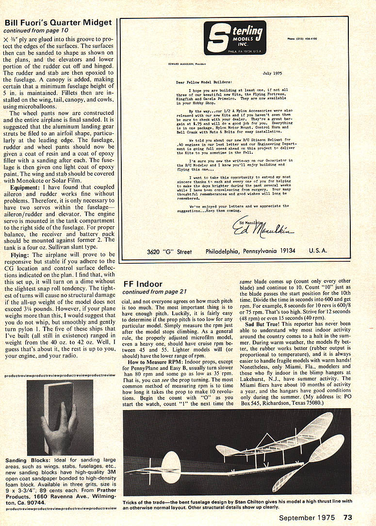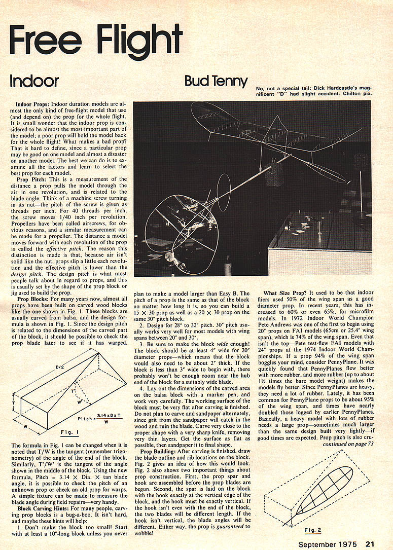 Free Flight Indoor Bud Tenny Na special tail Dick Hardcaatles mag nificent D slight accident Chilton pix Indoor Props Indoor duration models al kind free-flight model use depend prop whole flight small wonder indoor prop con sidered almost important part model poor prop will hold model back whole flight What makes bad prop hard define since particular prop may good model almost disaster another model best can ex amine factors learn select best prop model Prop Pitch measurement distance prop pulls model through air revolution related blade angle Think machine screw turning its nutthe pitch screw given threads per inch 40 threads per inch screw moves 1/40 inch per revolution Propellers have called airscrews ob vious reasons similar measurement can made propeller distance model moves forward revolution prop called effective pitch reason distinction made because air isnt solid like nut props slip little revolu tion effective pitch lower design pitch design pitch what people talk about regard props usually set shape prop block jig used build prop Prop Blocks years now almost props have built carved wood blocks like shown Fig 1 blocks usually carved balsa design mula shown Fig 1 Since design pitch related dimensions carved part block should possible check prop blade later see has warped 314 cOsT w formula Fig can changed noted T/W tangent remember trigo nometry angle end block Similarly T/W tangent angle shown middle block Using new formula Pitch X Dia X tan blade angle possible check pitch unknown prop check old prop warps simple fixture can made measure blade angle during field repairsvery handy Block Carving Hints people carv ing prop blocks bug-a-boo isnt hard maybe hints will help I Dont make block too small Start least l0-long block unless never plan make model larger Easy B pitch prop same block no matter long can build 15 X 30 prop well 20 X 30 prop same 30 pitch block 2 Design 28 32 pitch 30 pitch usu ally works very well models wing spans between 20 30 3 sure make block wide enough block should least 4 wide 20 diameter propswhich means block would also need about 2 thick block less 3 wide begin probably wont enough room near hub end block suitably wide blade 4 Lay Out dimensions carved area balsa block marker pen work very carefully working surface block must very flat after carving finished plan carve sandpaper alternately since grit sandpaper will catch wood ruin blade Carve very close proper shape very sharp knife removing very thin layers Get surface flat possible sandpaper final shape Prop Building After carving finished draw blade outline rib locations block Fig 2 gives idea would look Fig 2 also shows two important things about prop construction First prop spar hook assembled before prop blades begun Second spar laid block hook exactly vertical edge block hook must exactly vertical hook isnt end block two blades will different length hook isnt vertical blade angles will different Either way prop guaranteed wobble What Size Prop used indoor fliers used 50% wing span good diameter prop recent years has creased 60% 65% microfilm models 1972 Indoor World Champion Pete Andrews first begin using 20 props FAI models 65cm 254 wing span 74% wing span csn t topPete test-flew FAI models 24 props 1974 Indoor World Cham pionships prop 94% wing span boggles mind consider PennyPlane quickly found PennyPlanes flew better rubber rubber up about 1 s bare model weight makes models fly better Since PennyPlanes heavy need lot rubber Lately has common PennyPlane props about 95% wing span times have nearly doubled logged earlier PennyPlanes Basically heavy model lots rubber needs large propsometimes much larger same design built very lightlyif good times expected Prop pitch also cru continued page 73 UI Fig 2 September 1975 21 Bill Fuoris Quarter Midget continued page 10 X ply glued groove pro tect edges surfaces surfaces can sanded shape shown plans elevators lower portion rudder cut off hinged rudder stab epoxied fuselage canopy added making certain minimum fuselage height S maintained Fillets stalled wing tail canopy cowls using microballoons wheel pants now constructed entire airplane final sanded suggested aluminum landing gear struts filed airfoil shape particu larly leading edge fuselage rudder wheel pants should now given coat resin coat epoxy filler sanding after fuse lage given light coat epoxy paint wing stab should covered Monokote Solar Film Equipment I have found coupled aileron rudder works fine problems Therefore necessary have two servos within fuselage aileron/rudder elevator engine servo mounted tank compartment right side fuselage proper balance receiver battery pack should mounted against former 2 tank four oz Sullivan slant type Flying The airplane will prove responsive stable adhere CG location control surface deflec tions indicated plan find set up will turn dime slightest snap roll tendency tight est turns will cause no structural damage all-up weight model does exceed 3 pounds However plane weighs would suggest whip smoothly gently turn pylon five ships Ive built still existence ranged weight 40 oz 42 oz Well guess thats about rest up engine radio FF Indoor continued page 21 cial everyone agrees much pitch too much important thing have enough pitch Luckily fairly easy determine prop pitch too low particular model Simply measure rpm just after model stops climbing As general rule properly adjusted microfilm model heavy should have cruise rpm tween 45 55 Lighter models will should have lower range rpm Measure RPM Indoor props except PennyPlane Easy B usually turn slower han 80 rpm some go low 35 rpm rhat can see prop turning common method measuring rpm time long takes prop make 10 revolu tions 9egin count 0 start watch count next time same blade comes up count other blade continue 10 Count 10 just blade passes start position 10th time Divide time seconds 600 get rpm example 8 seconds 10 revs 600/8 75 rpm Thats too high Strive 12 seconds 48 rpm 15 seconds 40 rpm Sad True repor